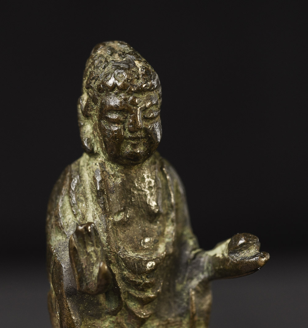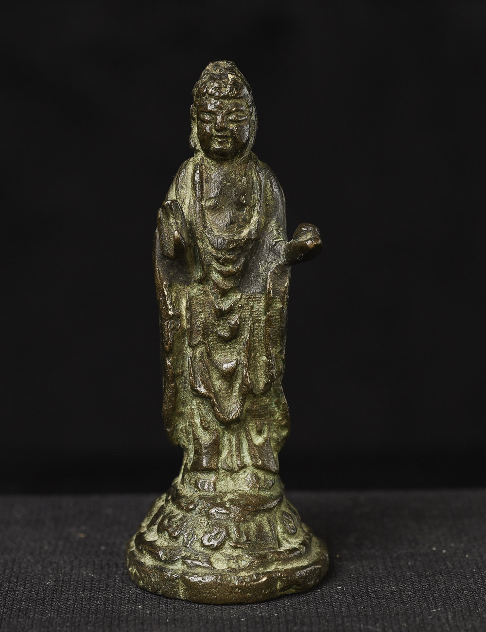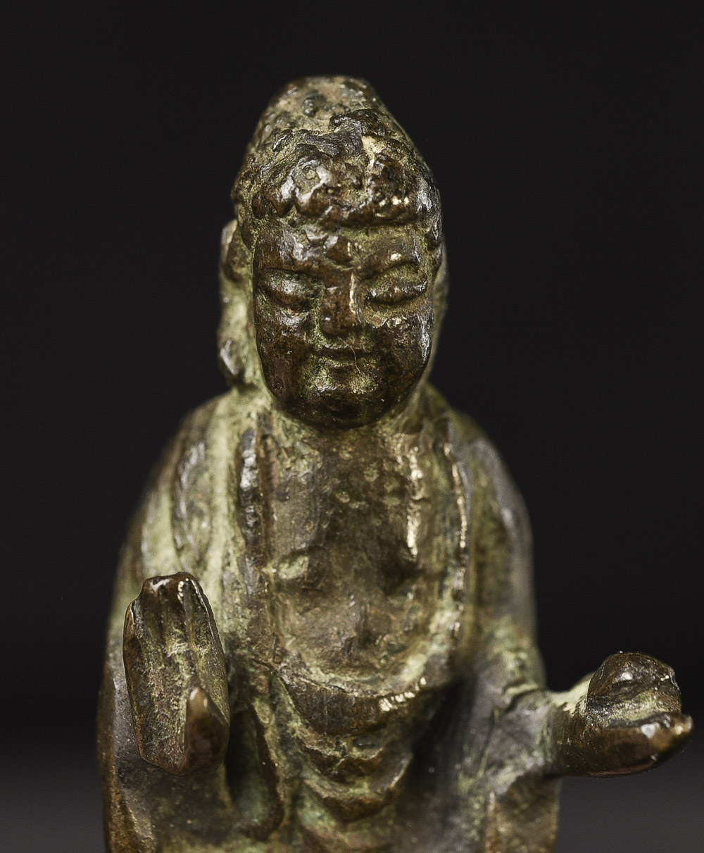 15thC or earlier Japanese bronze Buddha. Rare to find this type in bronze, especially in this small size. Wonderful deeply spiritual face. This piece measures 2.5" tall. Domestic shipping is included on this item, and international shipping is $50, including packing and insurance. ( 2.5"H x 1"W x .875"D) - 65g