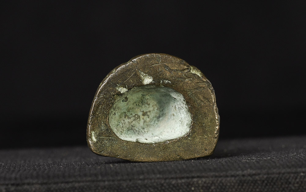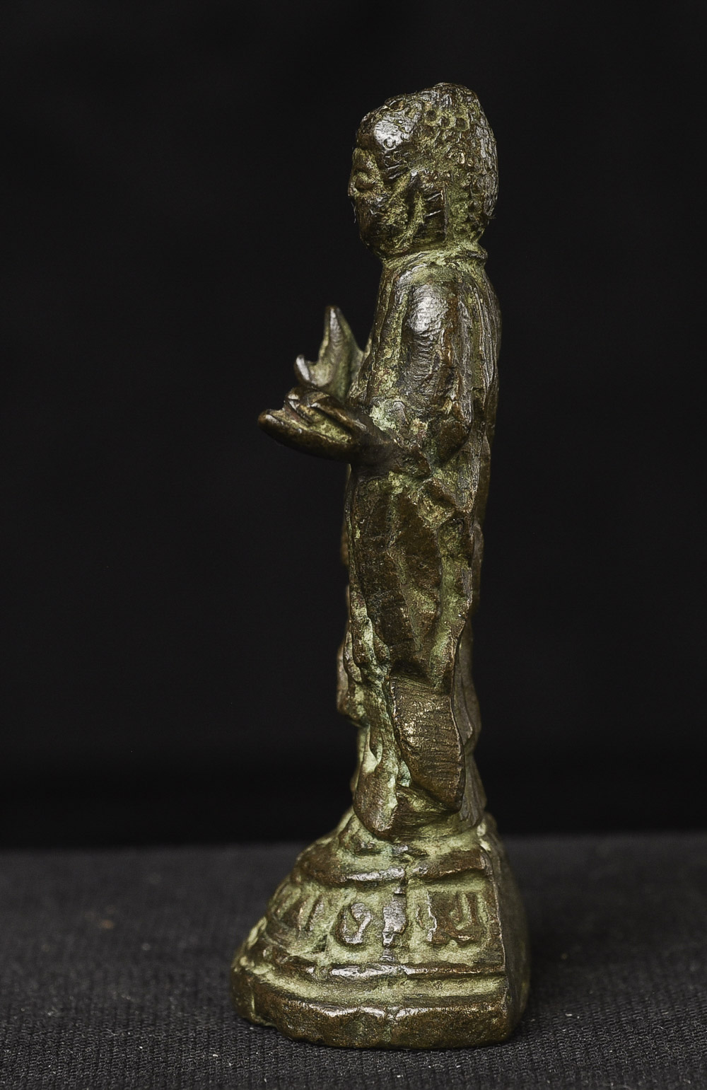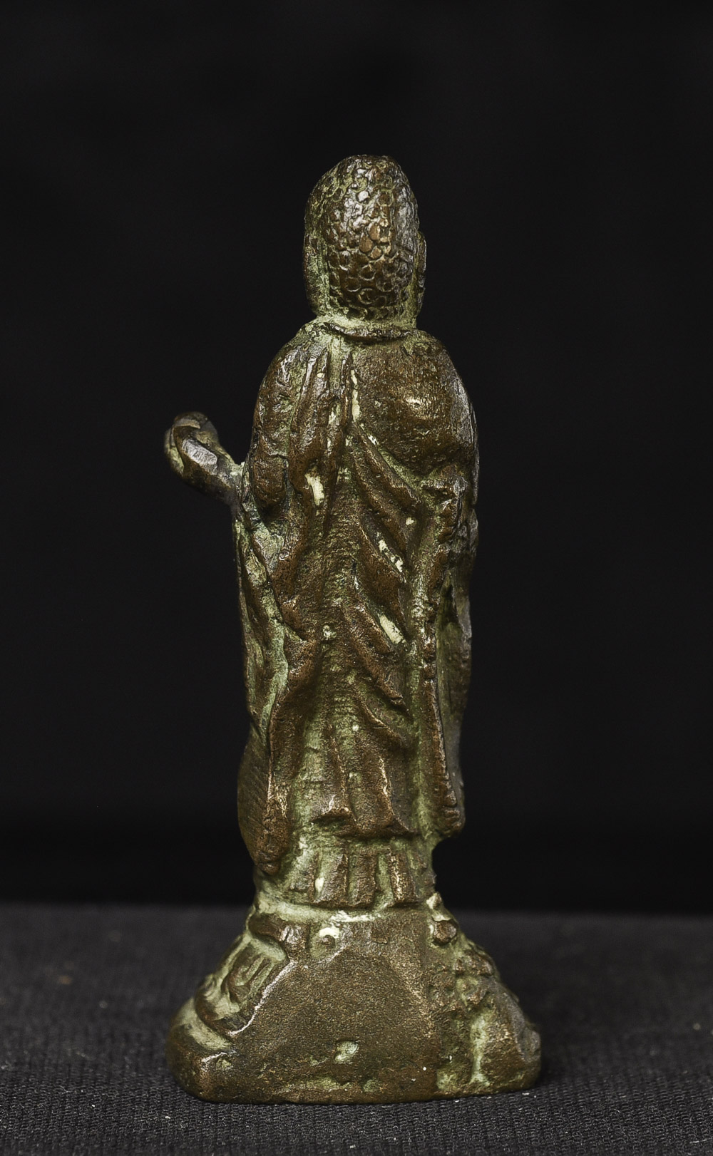 15thC or earlier Japanese bronze Buddha. Rare to find this type in bronze, especially in this small size. Wonderful deeply spiritual face. This piece measures 2.5" tall. Domestic shipping is included on this item, and international shipping is $50, including packing and insurance. ( 2.5"H x 1"W x .875"D) - 65g