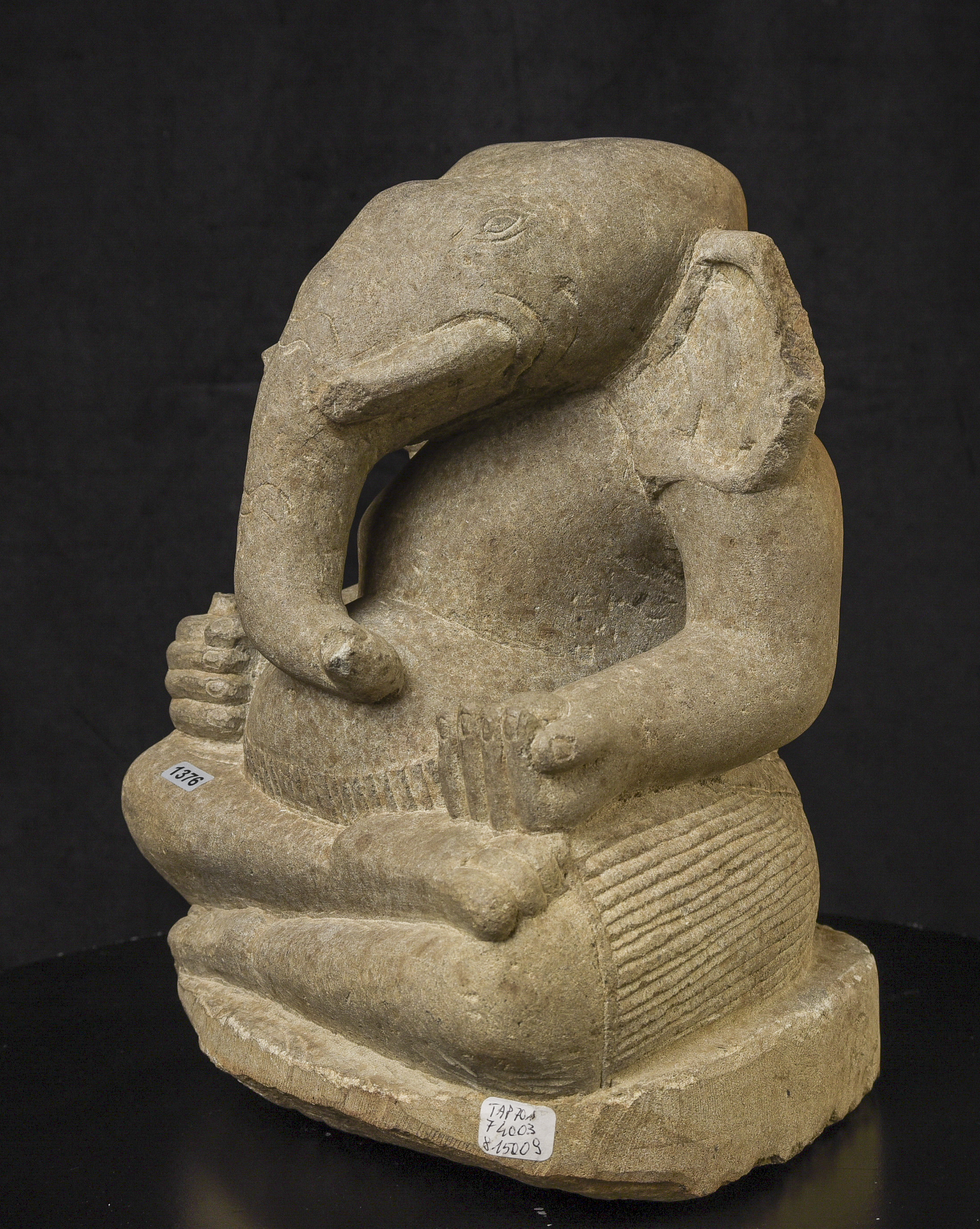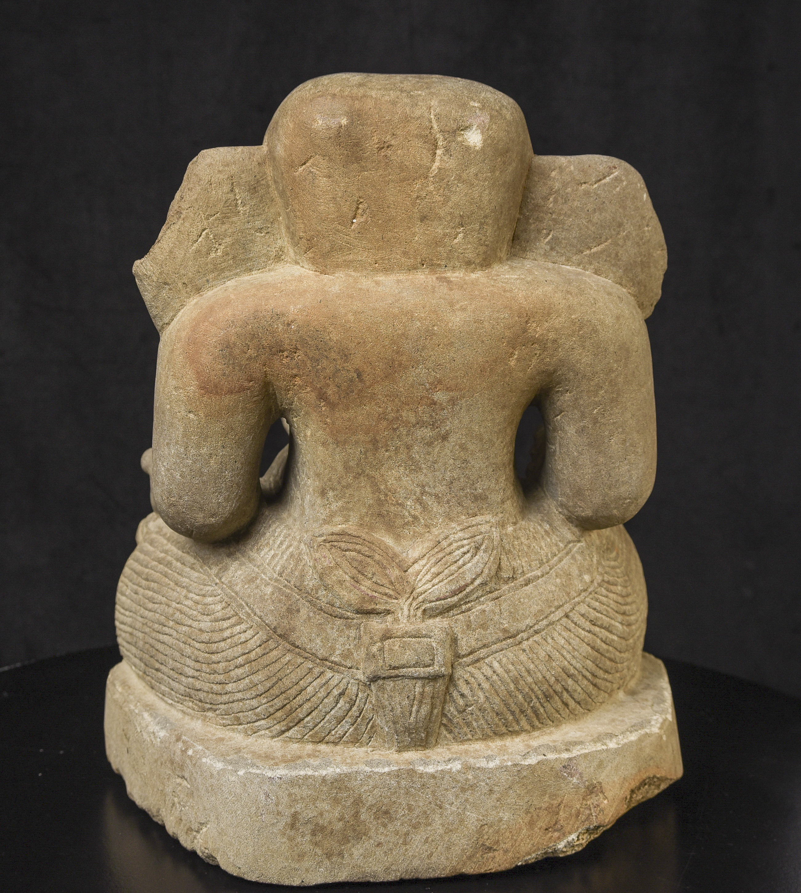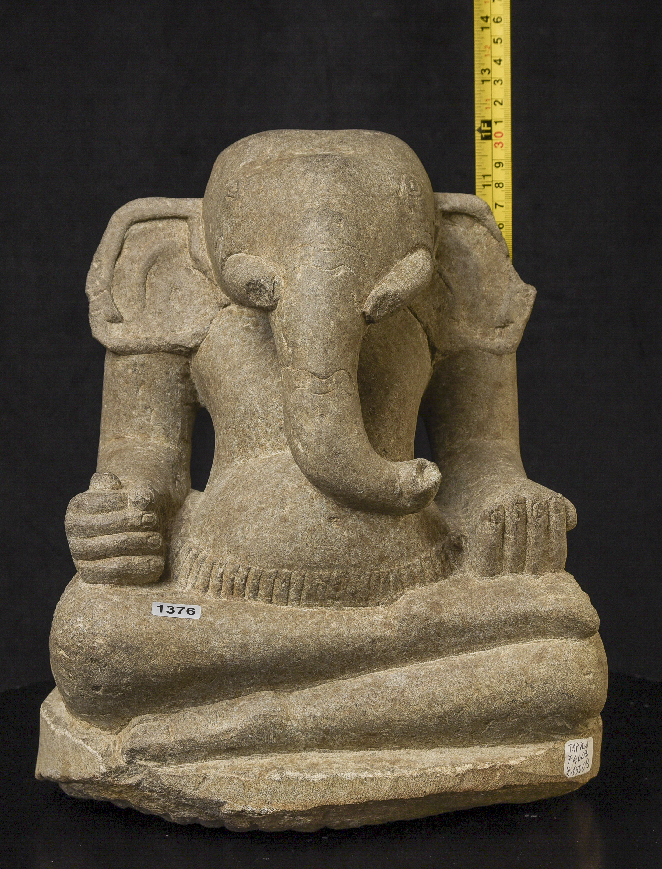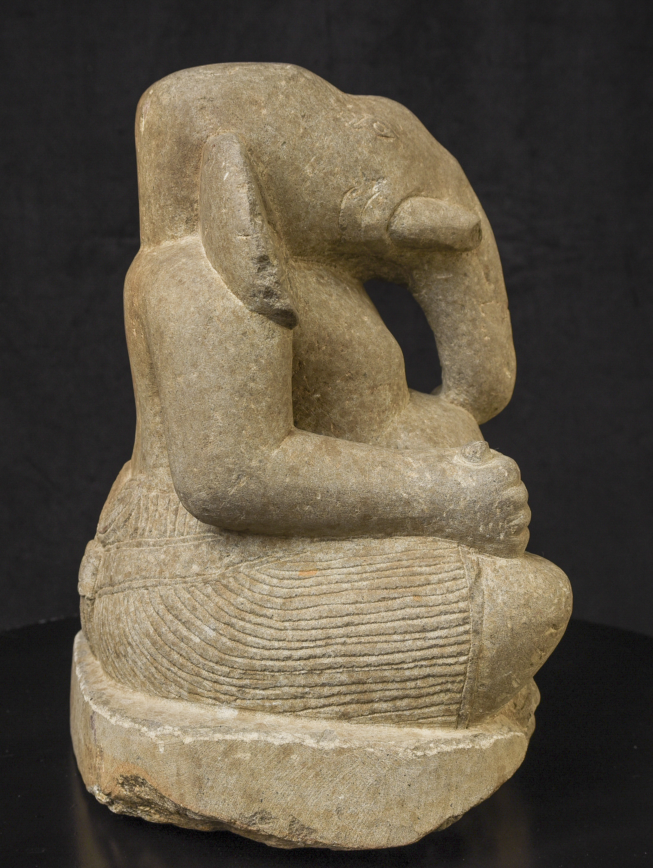 Early Cambodian Ganesh. Beautiful form.Appears Pre-Khmer, which, if period, would make it over 1000 years old. The patina is soft and smooth all over. It looks like it inserted precisely into a base. It is sculpted from a very hard stone. 12"H x 9.75"W x 7.5"D - 38.85lbs / 17.6 kilo.