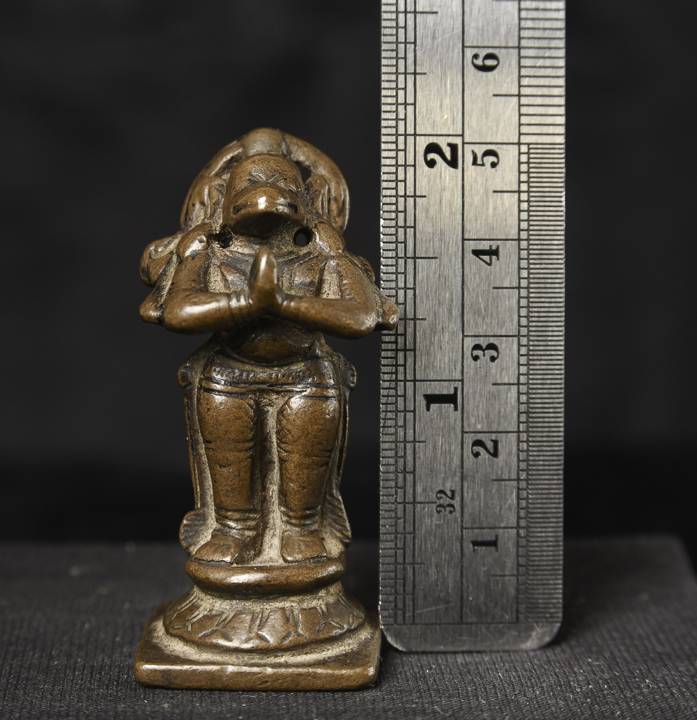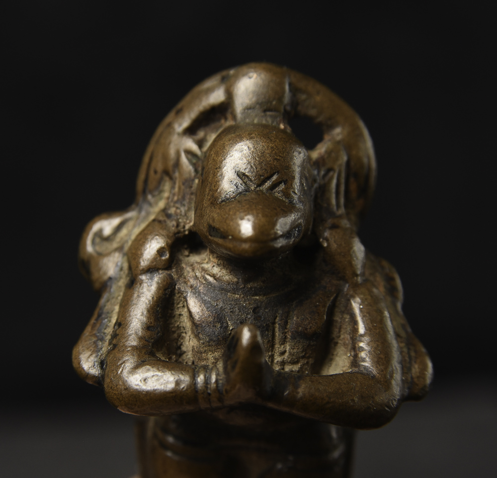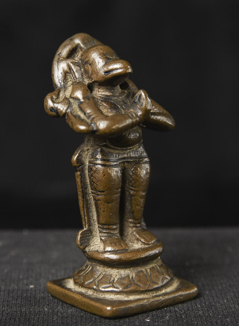 Miniature in size, but resolute in stance, this 17thC solid cast bronze Hanuman stands with an open heart, in devotion. Hard to find this nice in such a diminutive size. Bronze ( 2.125"H x 1"W x .75"D ) - 65g