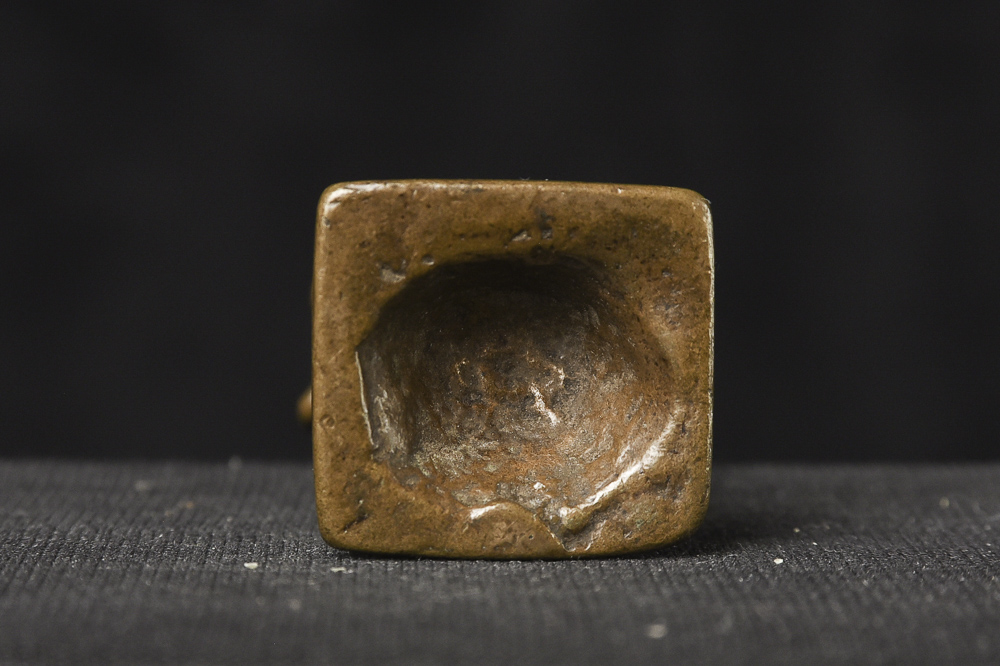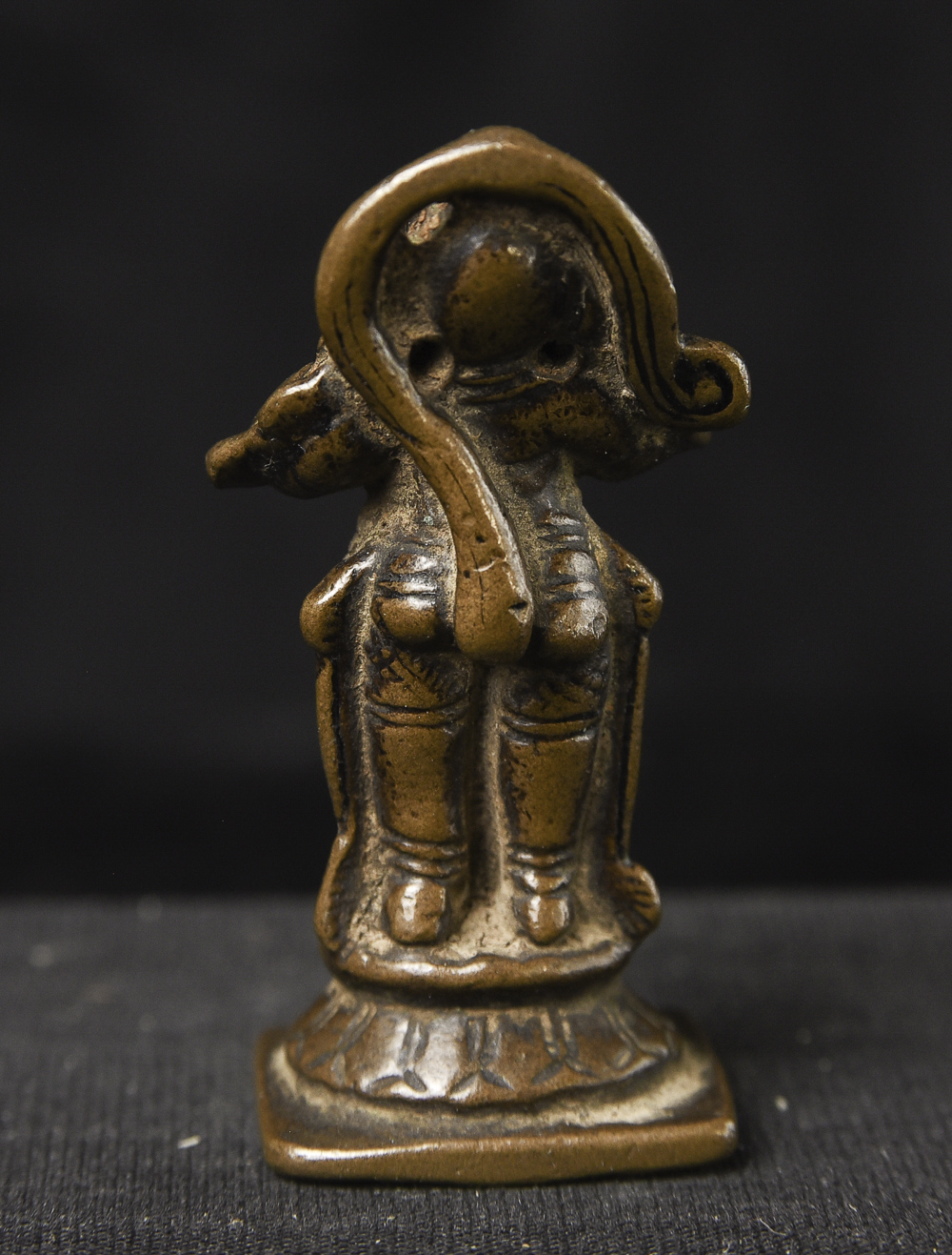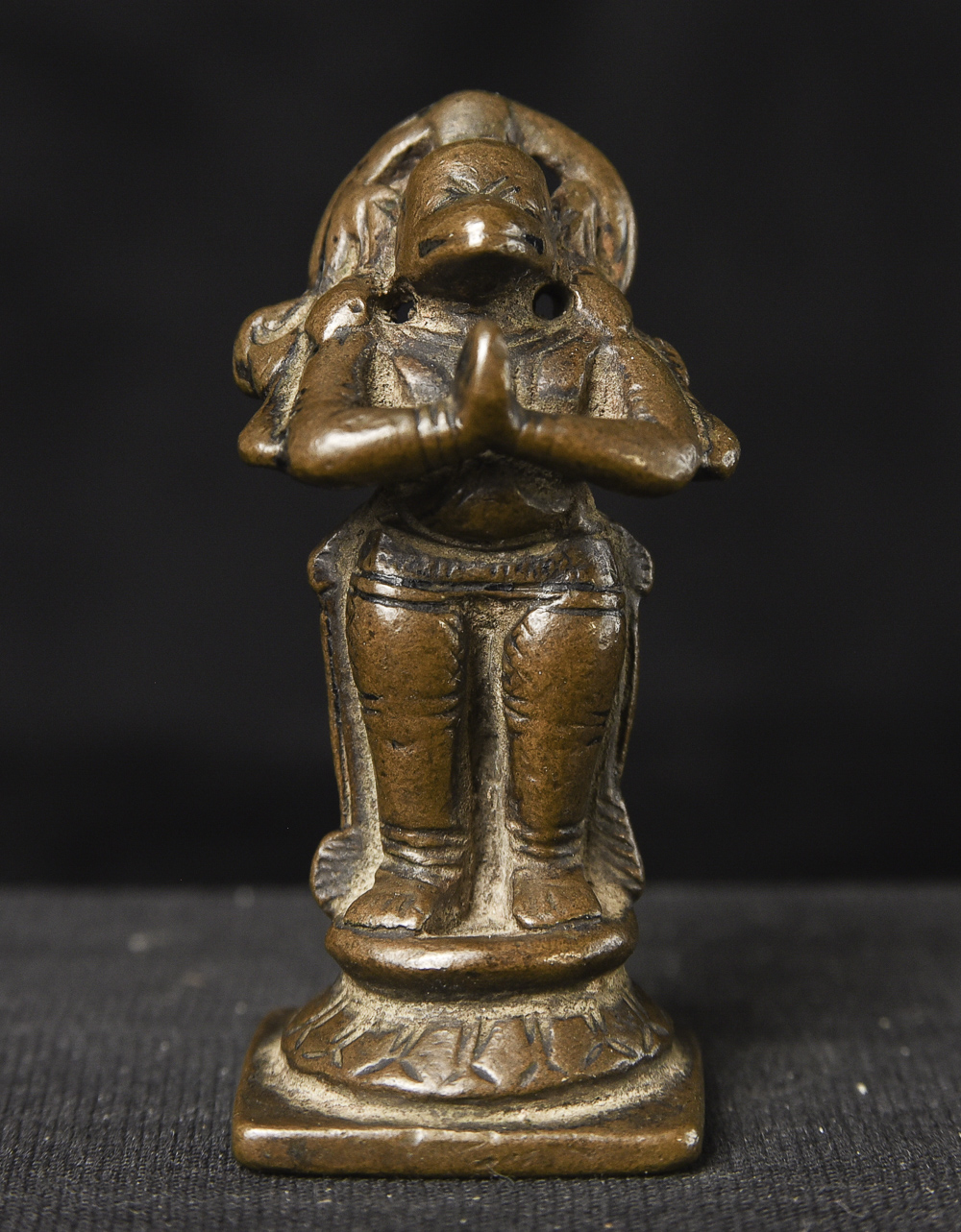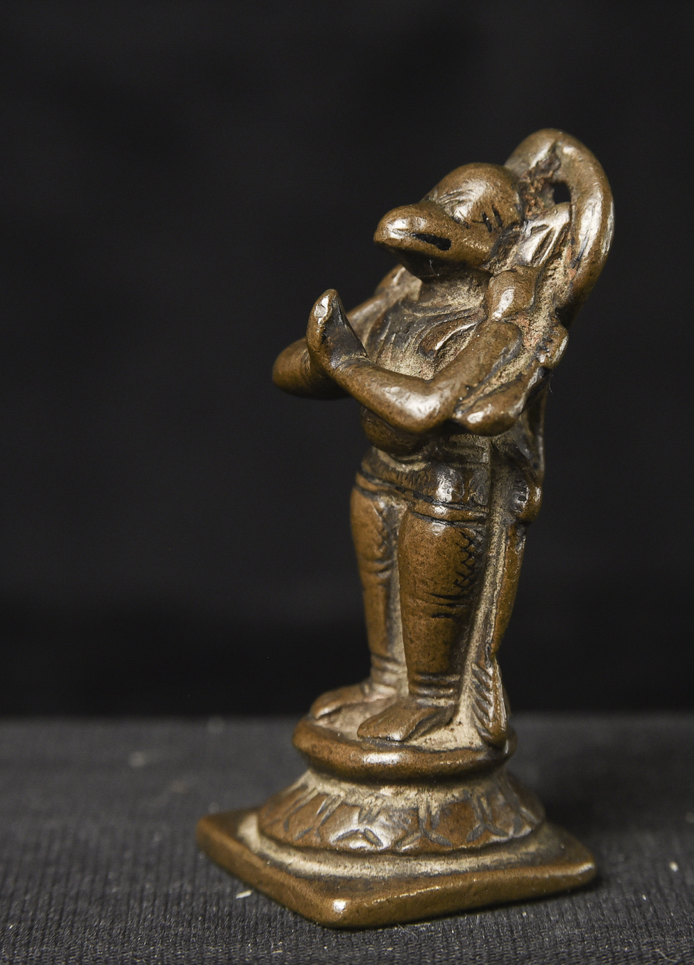 Miniature in size, but resolute in stance, this 17thC solid cast bronze Hanuman stands with an open heart, in devotion. Hard to find this nice in such a diminutive size. Bronze ( 2.125"H x 1"W x .75"D ) - 65g