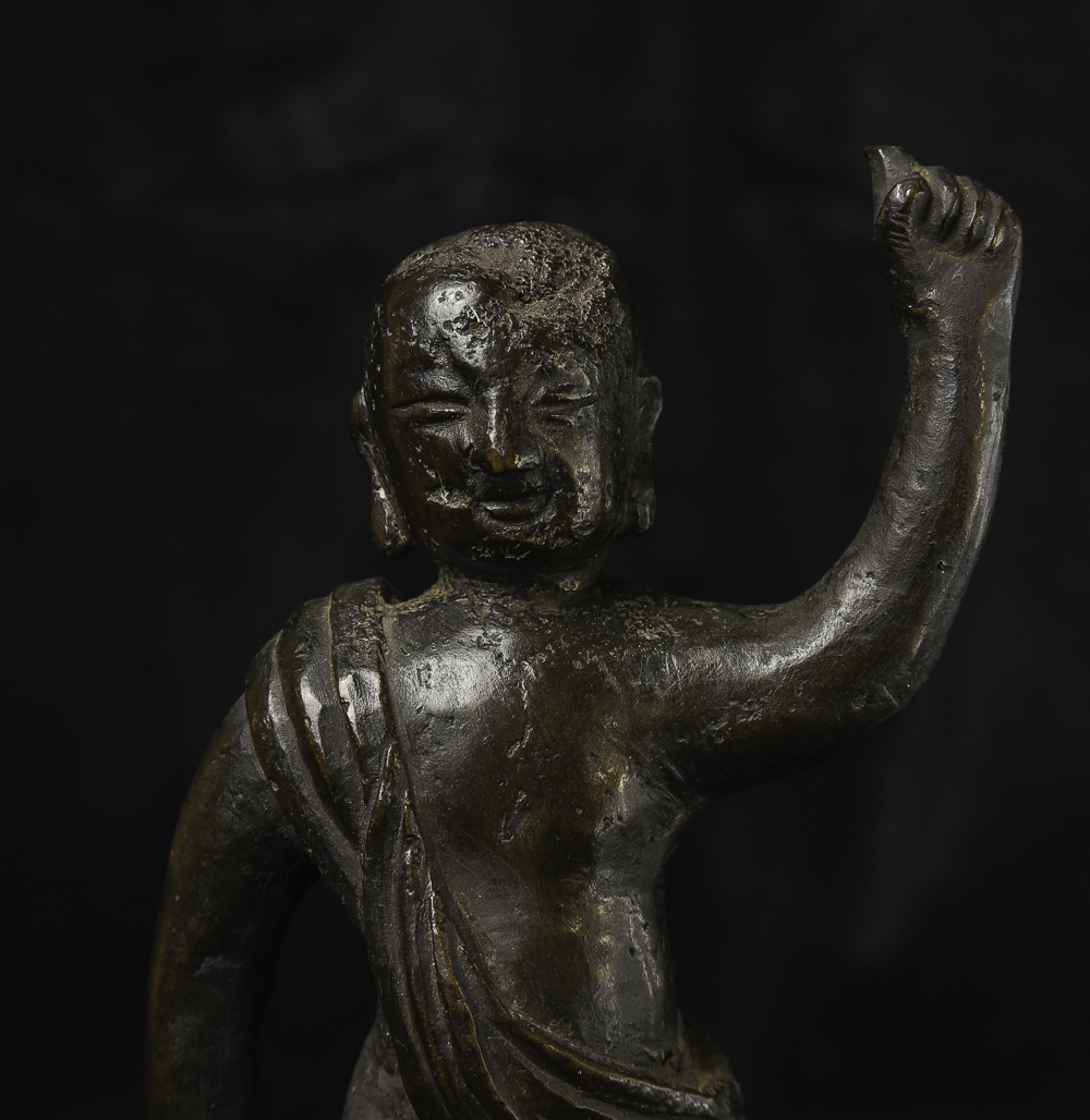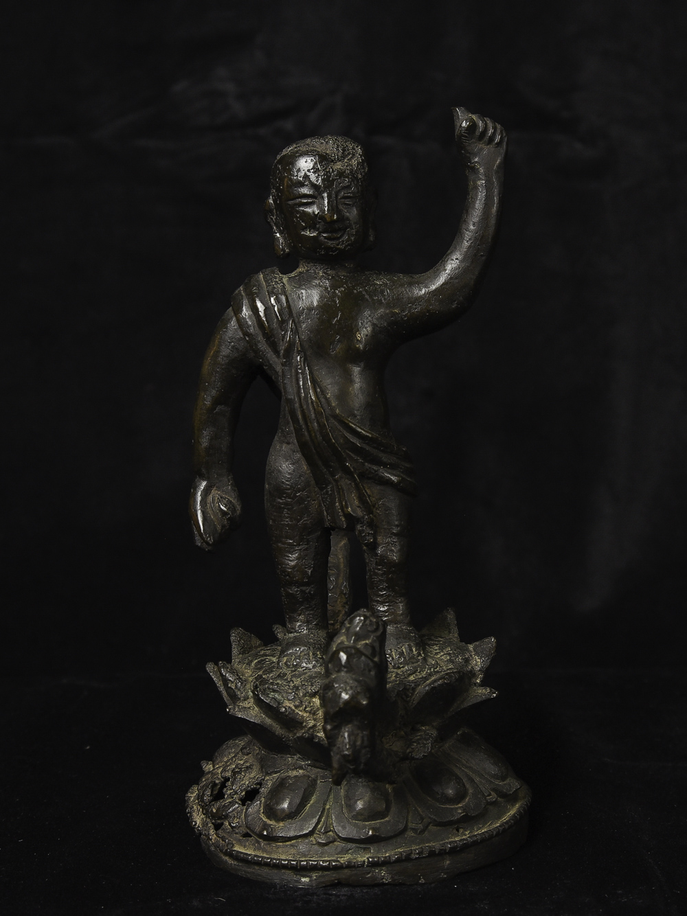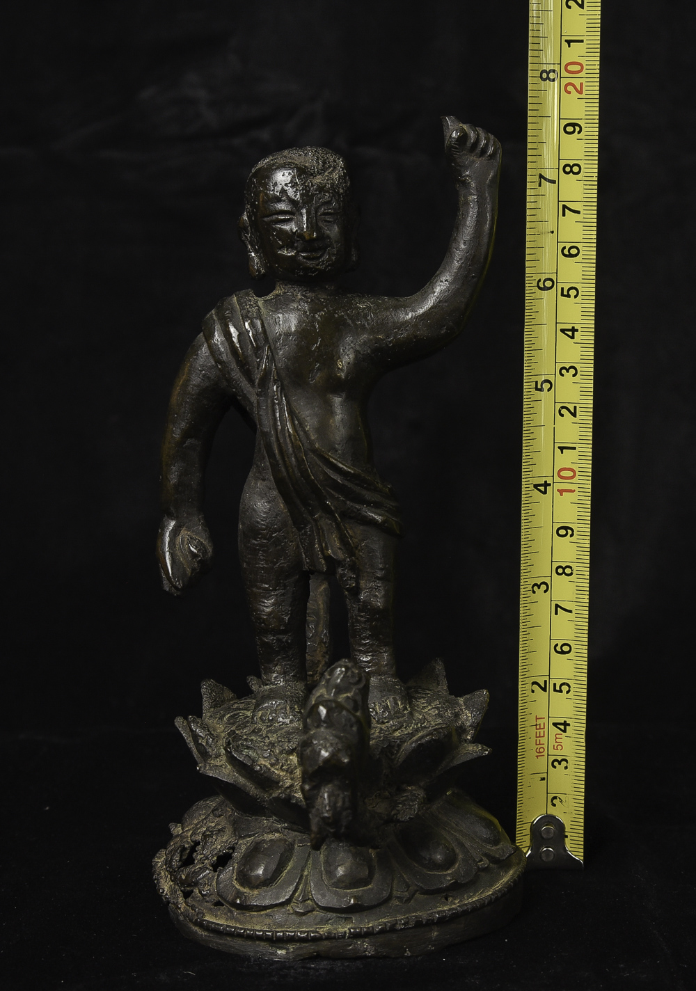 15/16thC Ming Baby Buddha pointing toward heaven and earth. The lotus form base embodies a dragon-something I have only been twice before in 30 years. Baby Buddha raises his hand to a height of 7.5 inches, including the integral base. The casting flaws appear to be original to the initial casting process. ( 7.5"H x 3.5"W x 5"D ) 2.81lbs/ 1.275kg