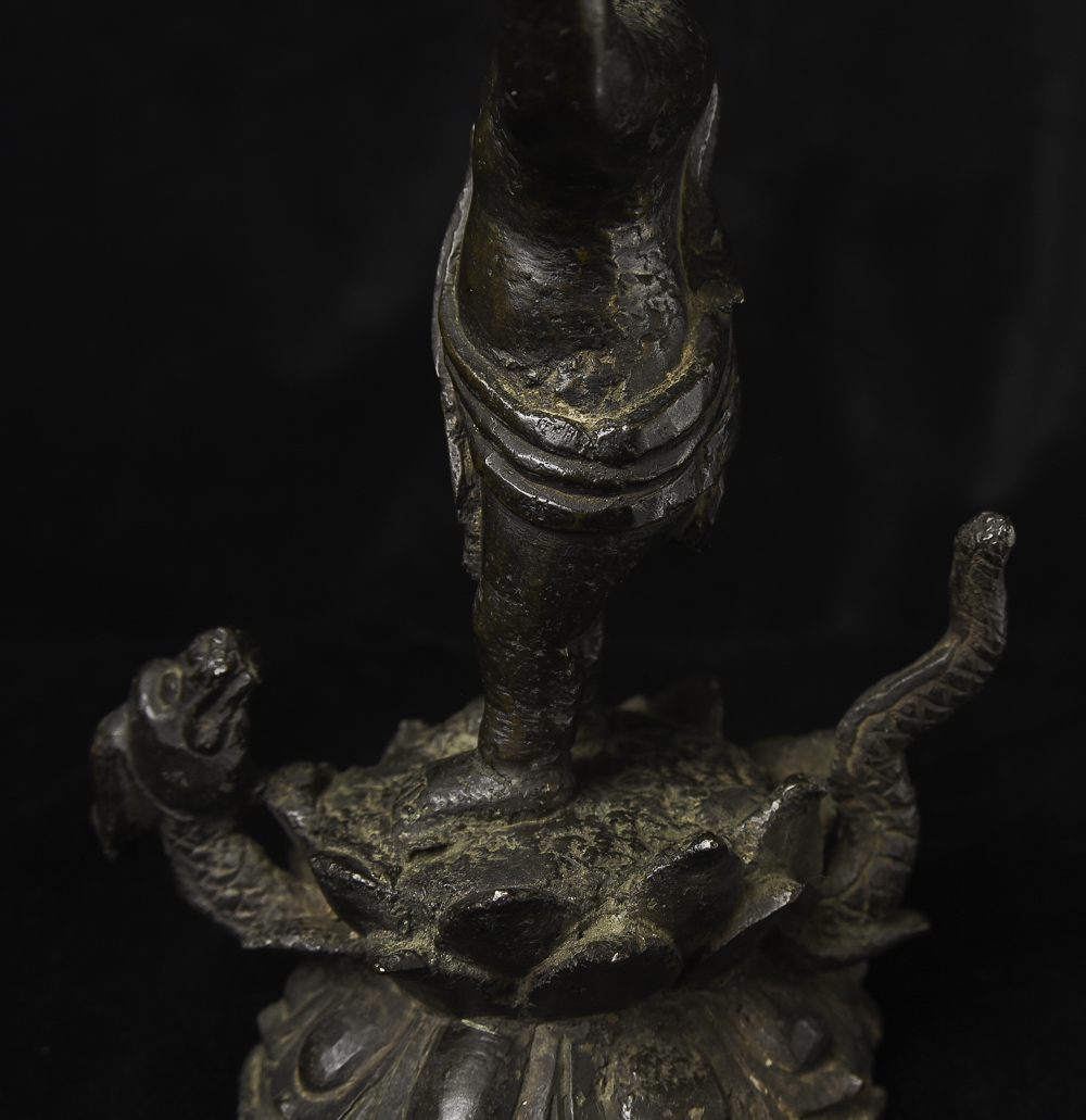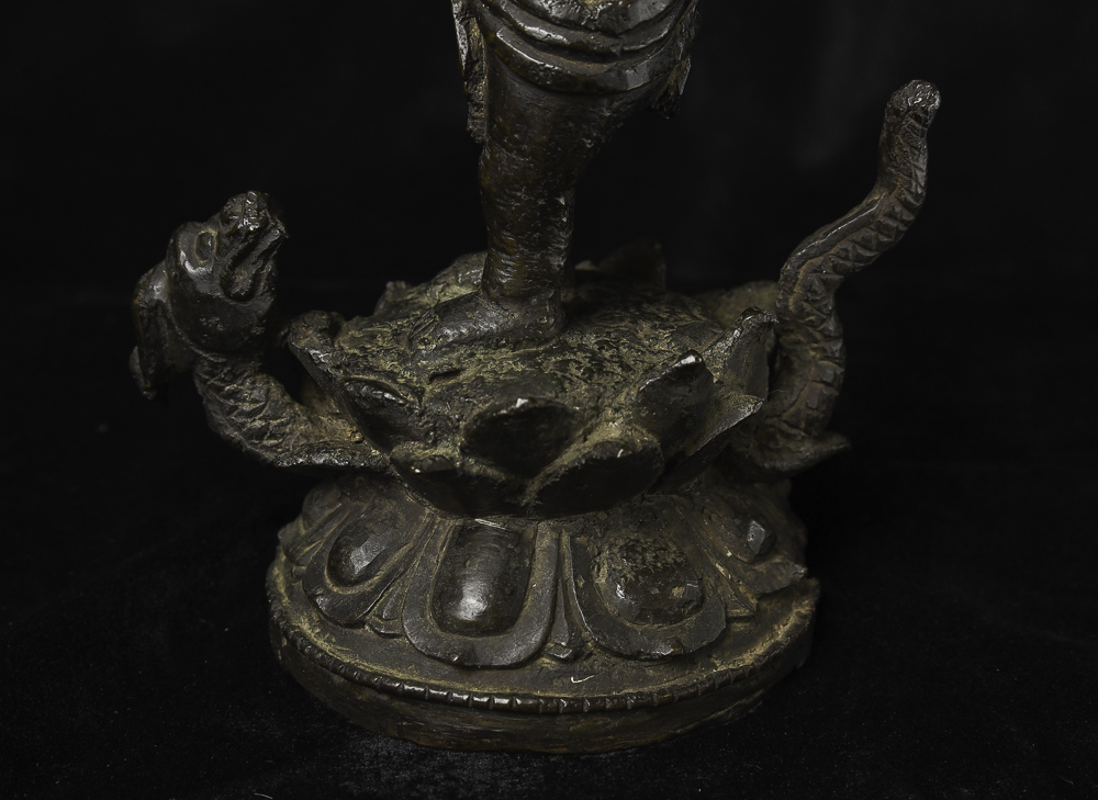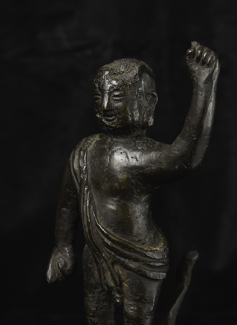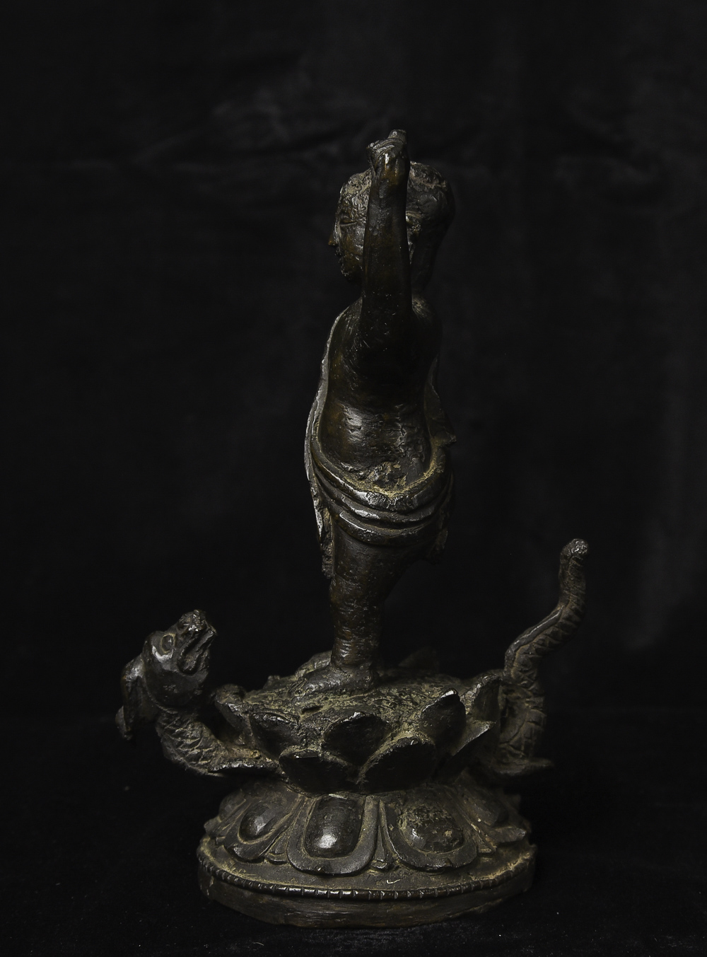 15/16thC Ming Baby Buddha pointing toward heaven and earth. The lotus form base embodies a dragon-something I have only been twice before in 30 years. Baby Buddha raises his hand to a height of 7.5 inches, including the integral base. The casting flaws appear to be original to the initial casting process. ( 7.5"H x 3.5"W x 5"D ) 2.81lbs/ 1.275kg