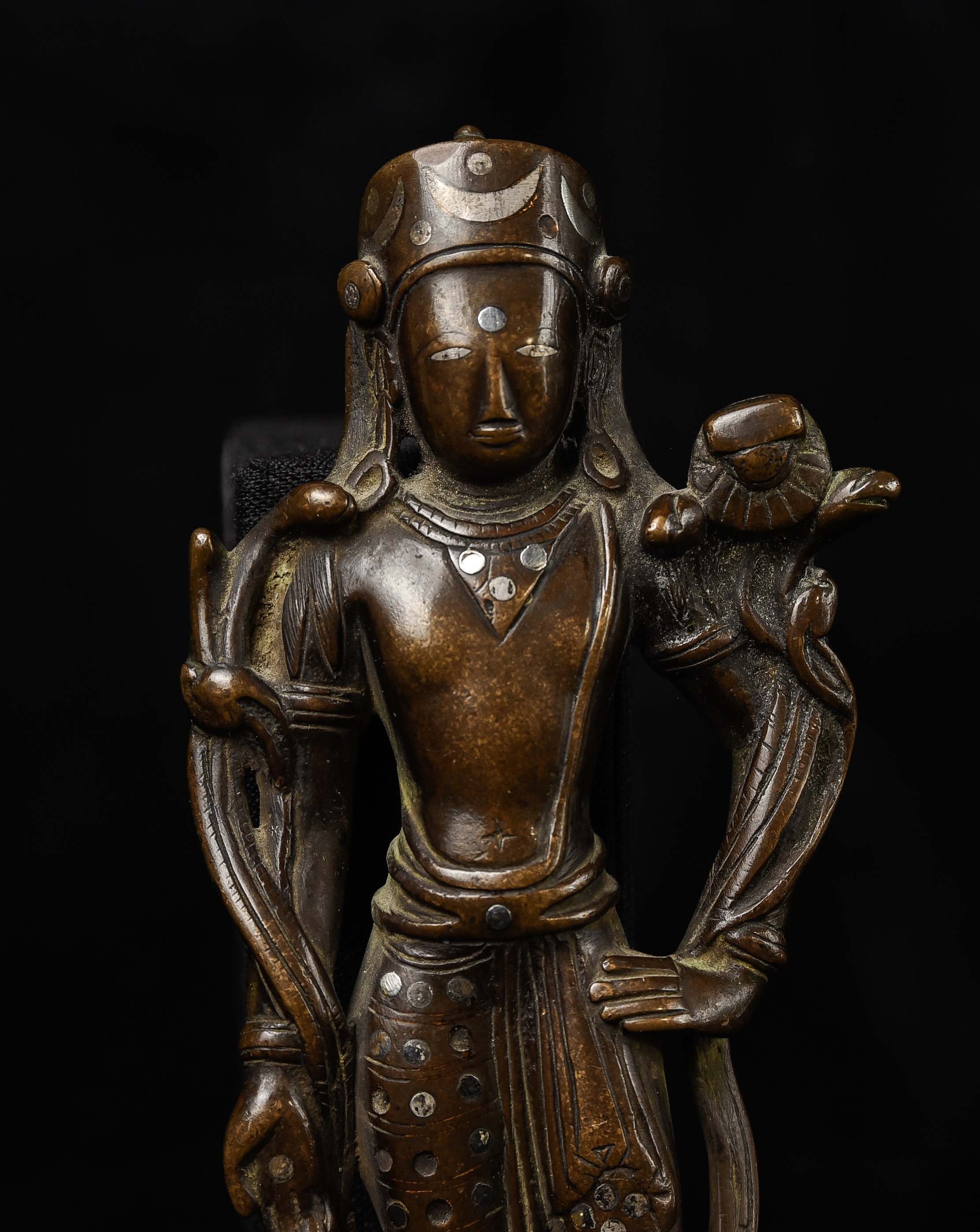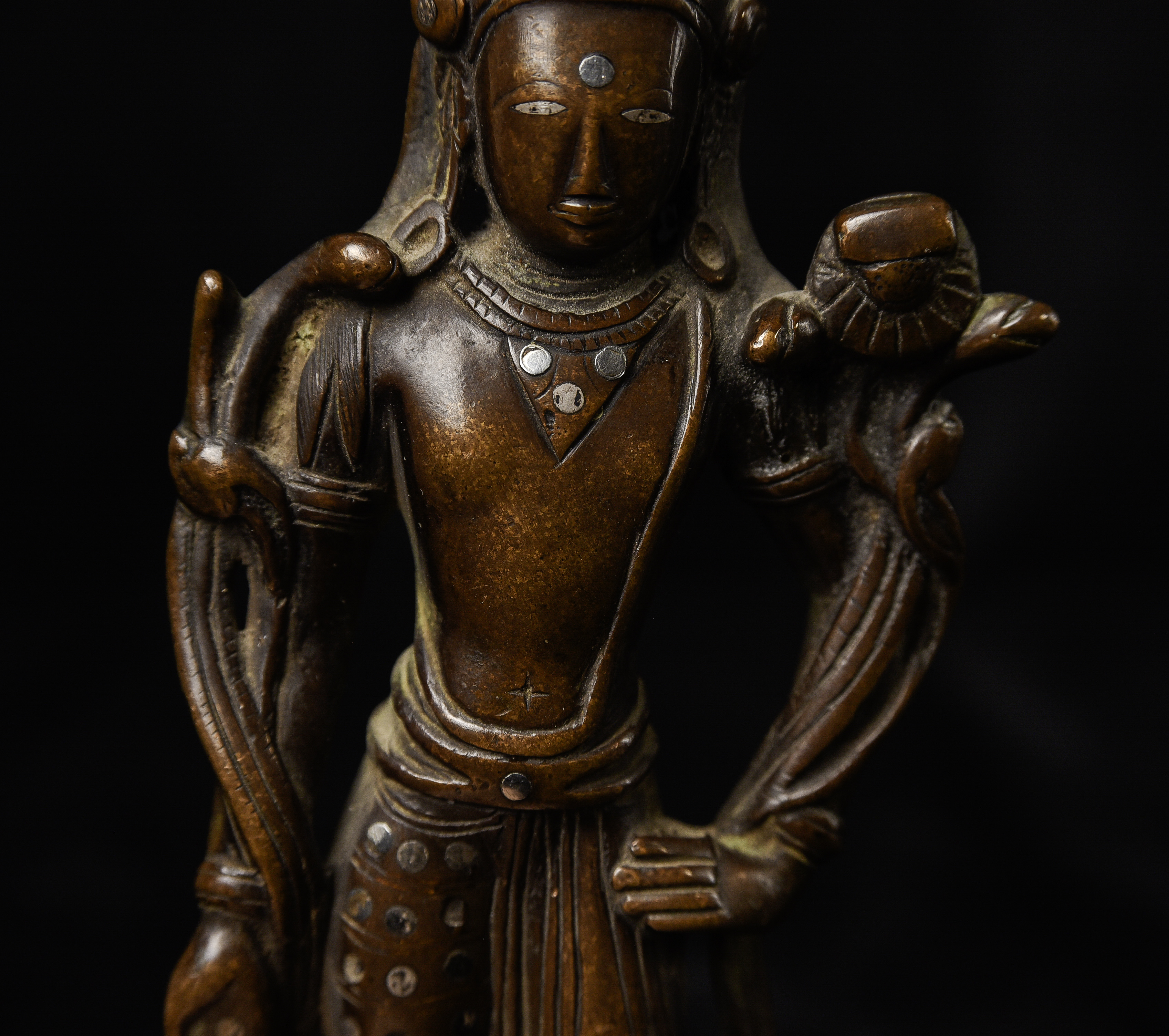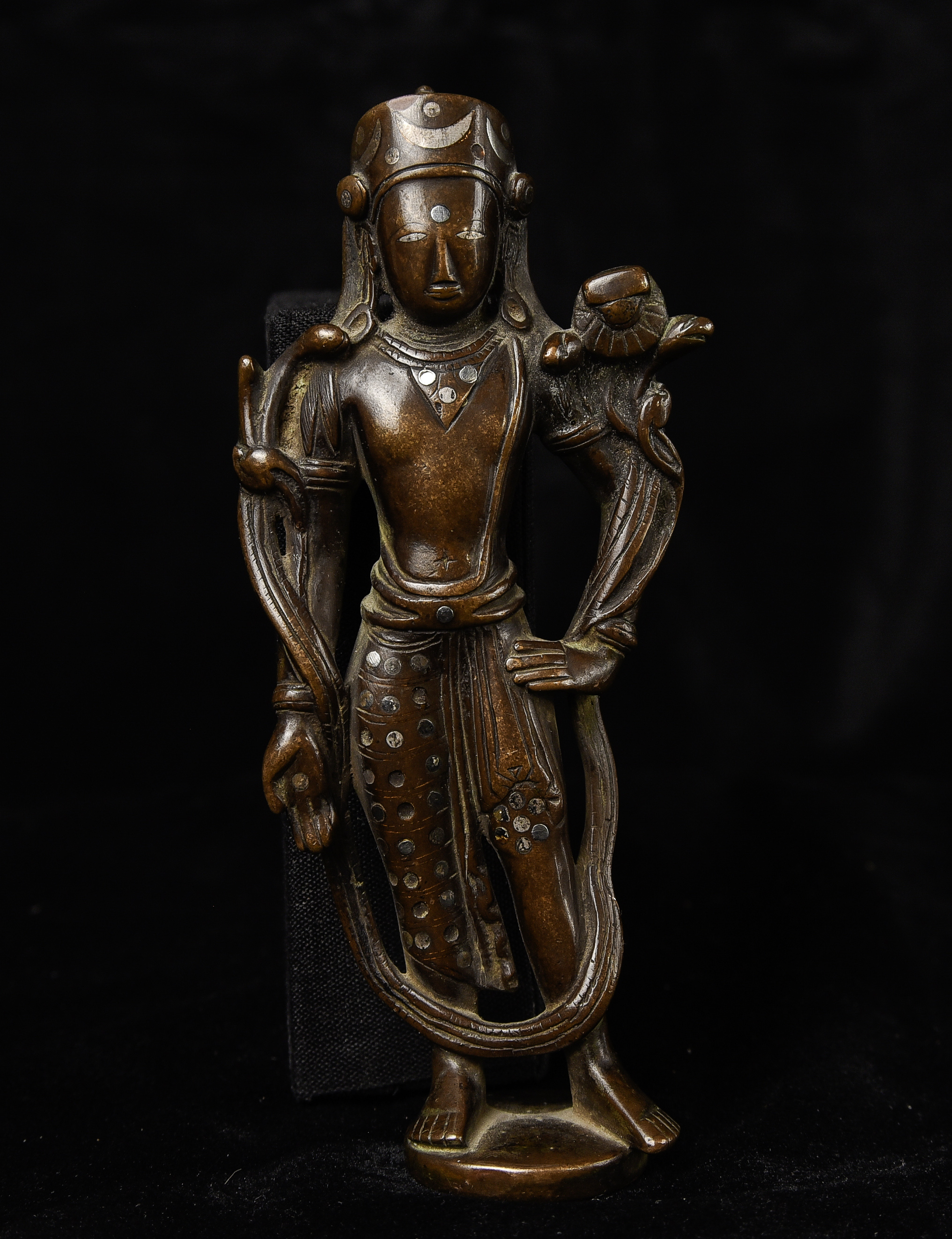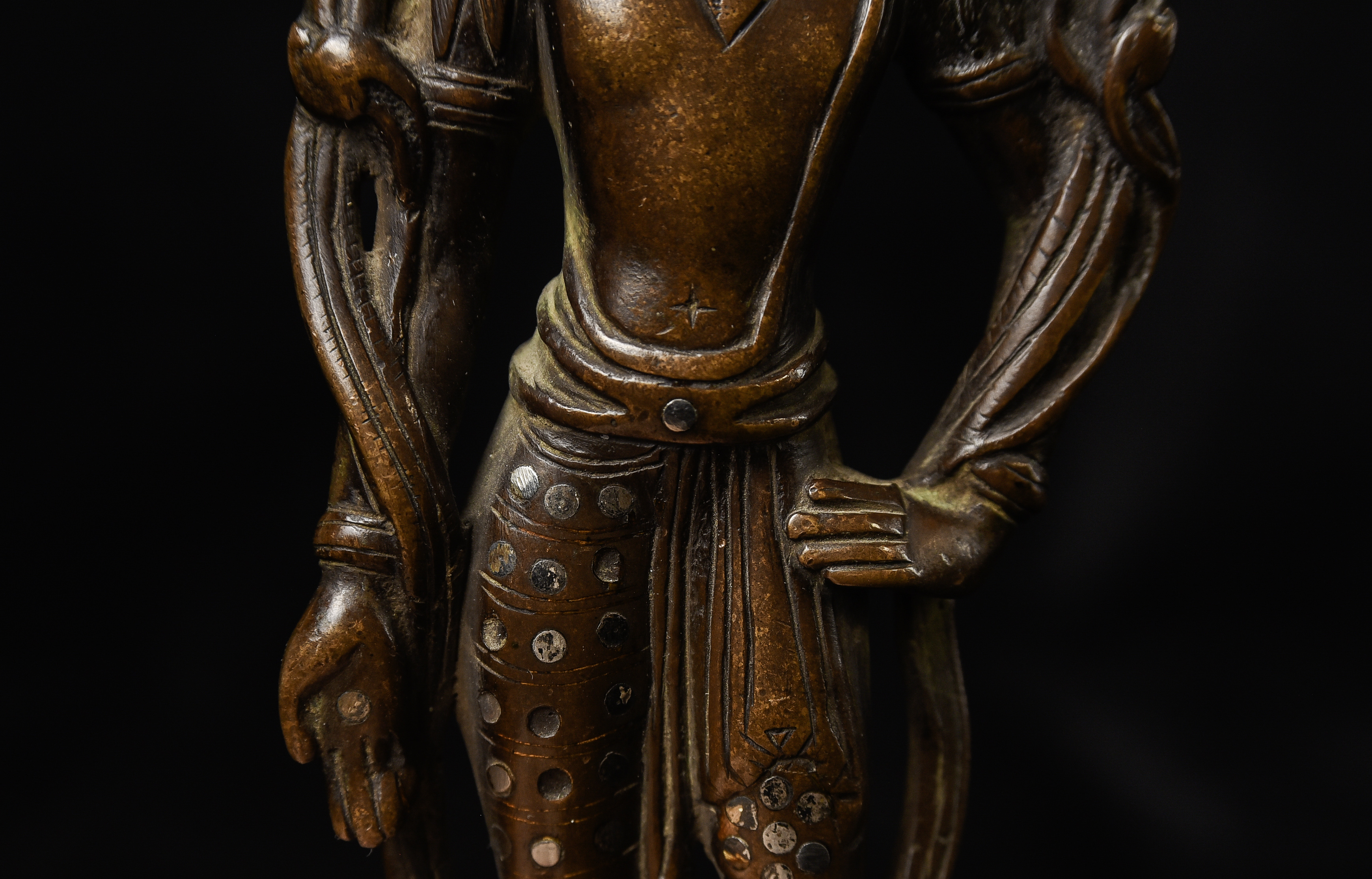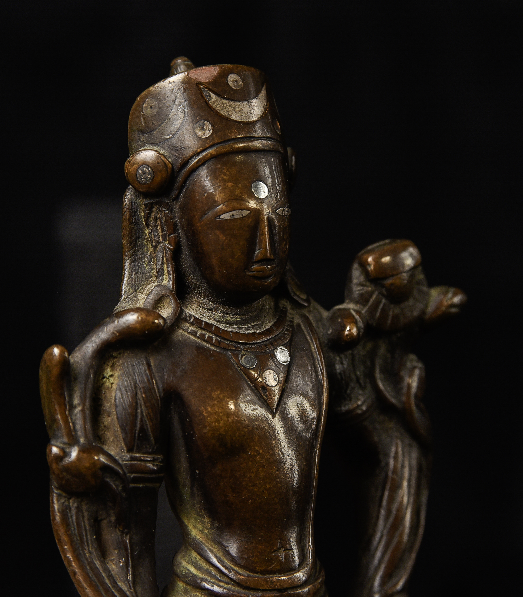 Early Style Himalayan Bronze Bodhisattva, From Kashmir or other nearby Kingdom. It has a significant amount of inlay, most of which remains (see photos). It is a solid cast. Has what appears to be extensive wear and a beautiful dark patina. I bought it because some years ago, I was fortunate enough to purchase Item 9087 on my website and recognized it when I saw it. If you look at that item, you will see that the two are remarkably close. They are almost certainly from the same workshop. This one is more detailed and much less worn, with a better patina. It has also retained more of its. Inlay. A feature that stands out is the effect of its fantastic in-laid eyes-they bring him to life. It would benefit from a base, as it does not stand alone. The chocolate-colored surface practically glows because of the Gold and silver in the mix. Very special!! - ( 5.25"H x 2.375"W x 1.125"D ) 310g. I have gotten feedback from a knowledgeable collector that he believes this and 9087 are 20th-century emulations of a piece in the Harvard Museum collection. Due to this, I've decided to slash the price and sell it on its merit as a quality sculpture and not as an early piece. Zacke, the well-known Austrian Auction House, recently listed a very closely related piece with similar casting, inlays, and face but with an integral base. They attribute theirs to 17/18thC Tibet.