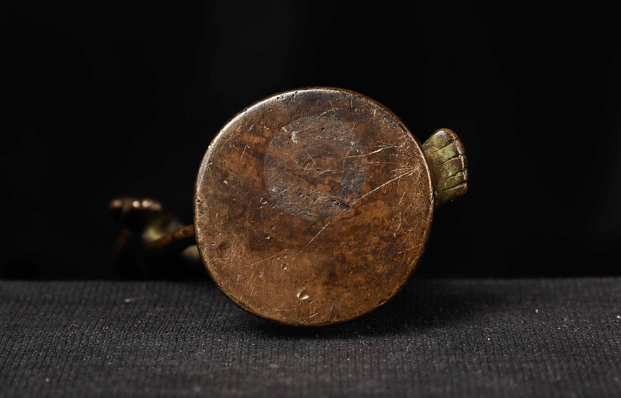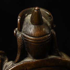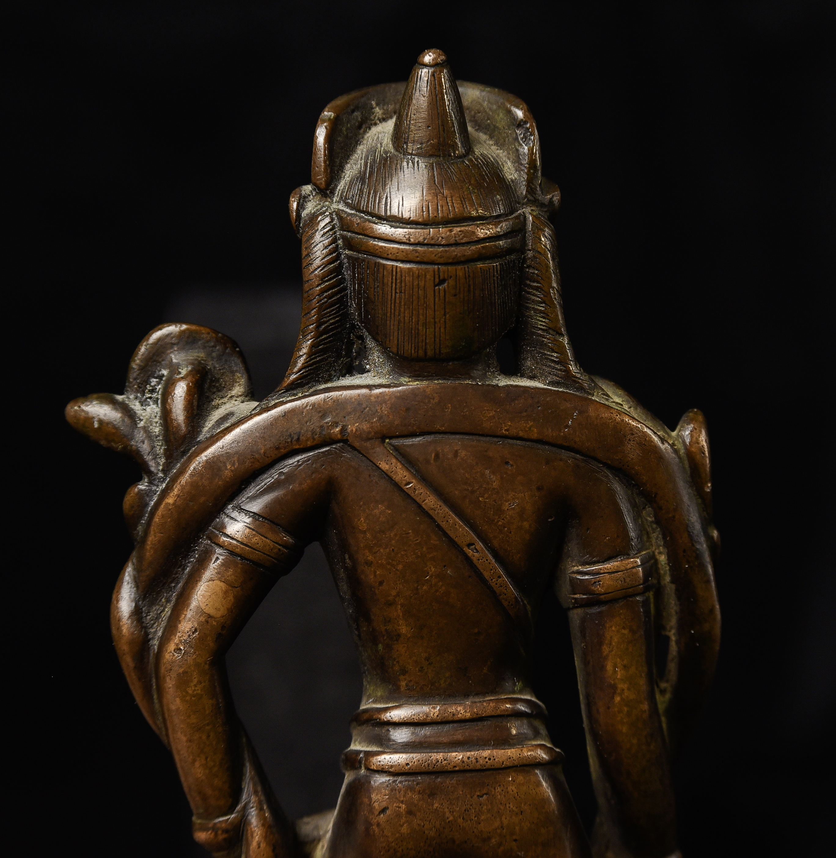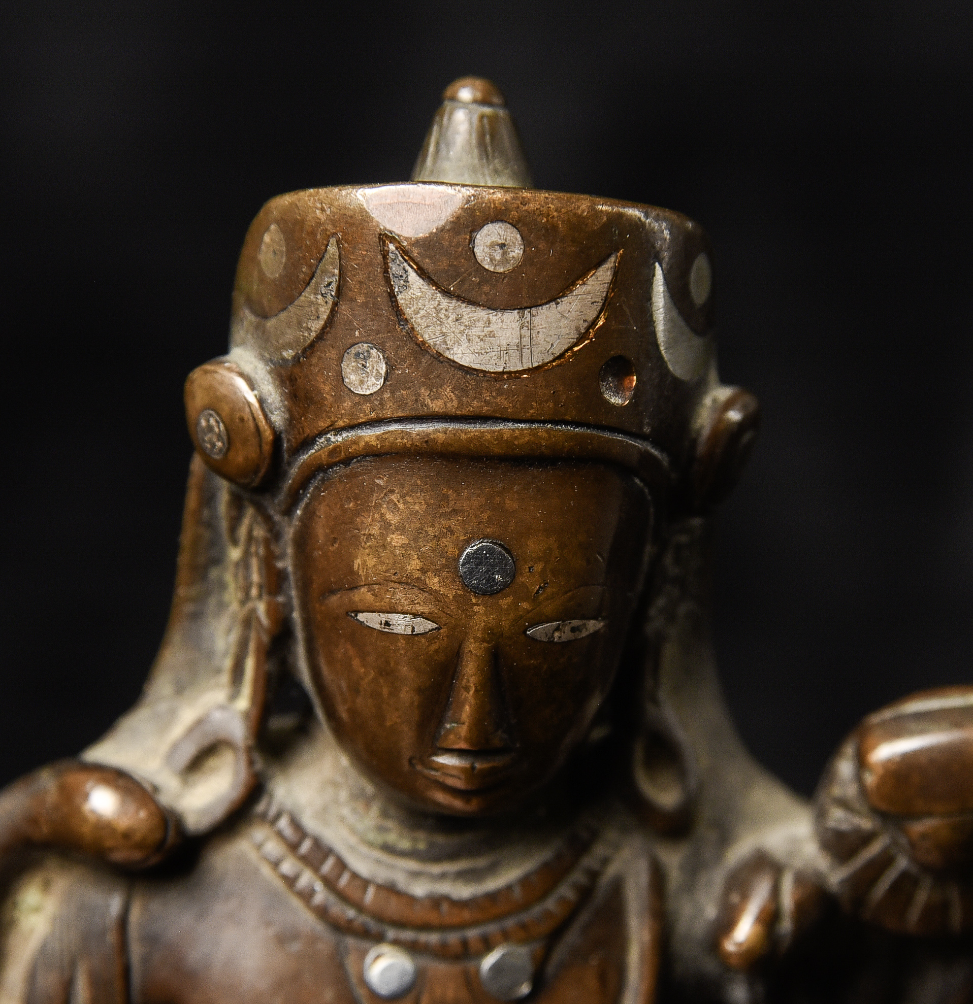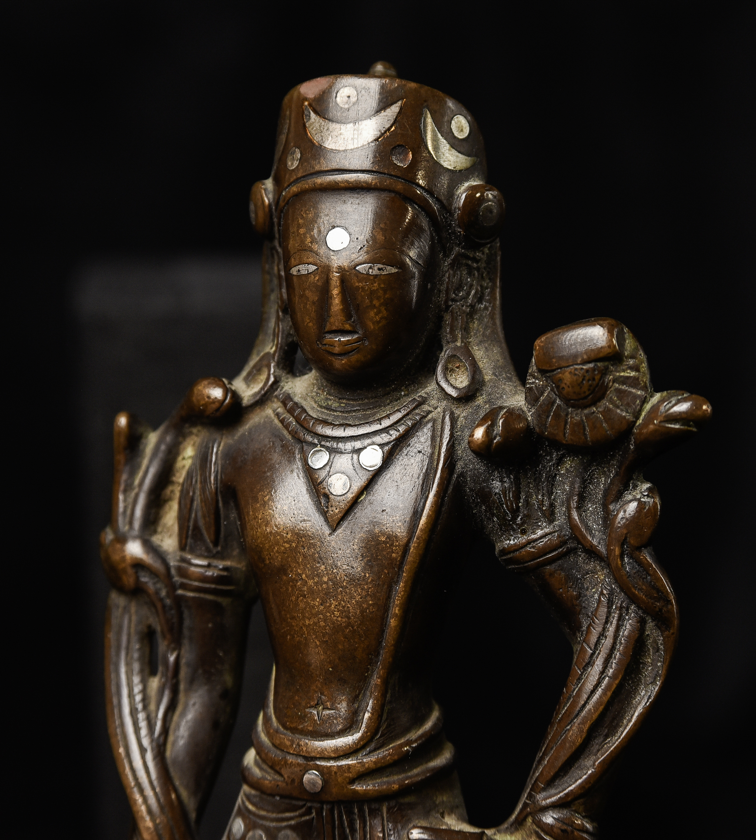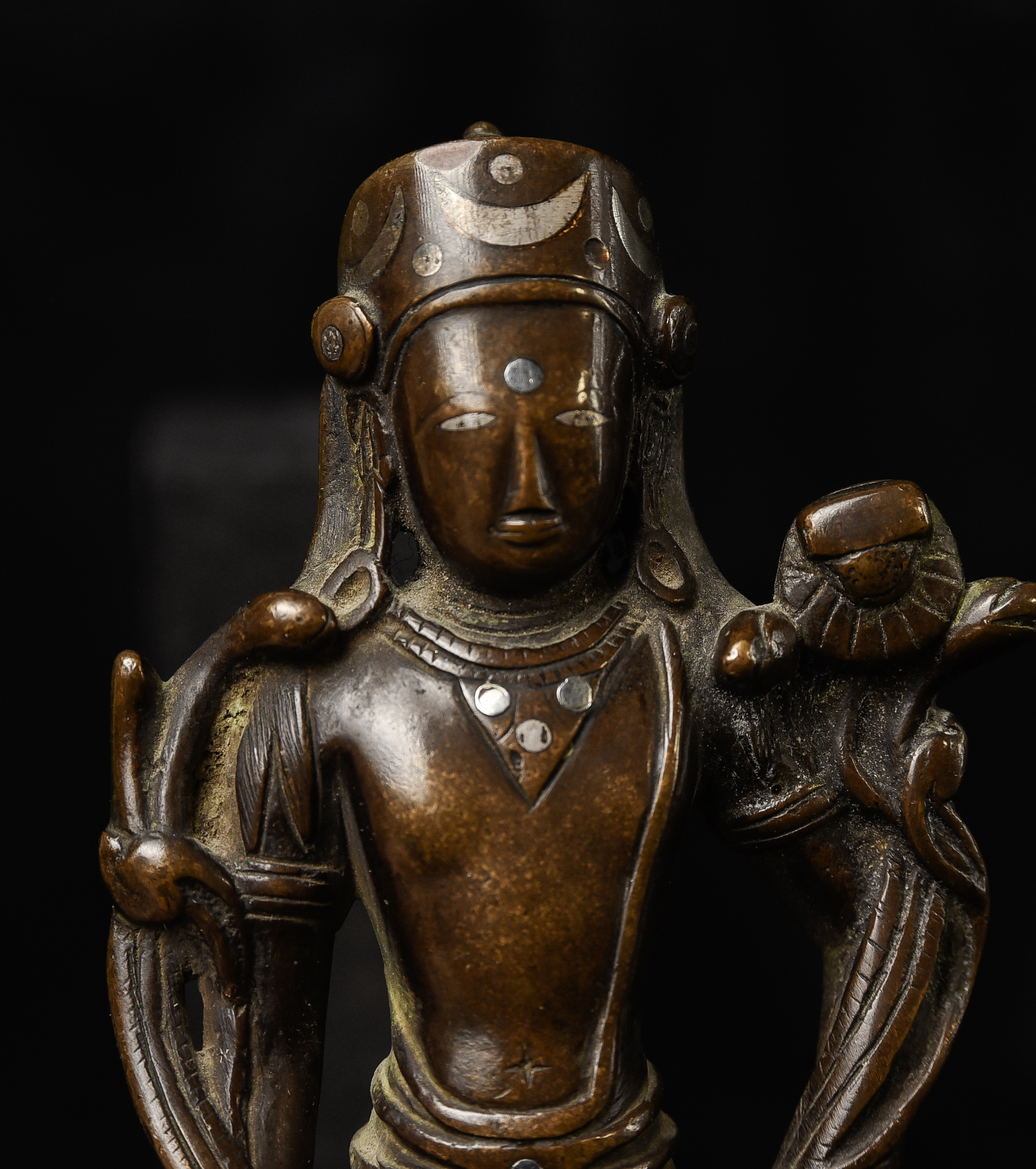 Early Style Himalayan Bronze Bodhisattva, From Kashmir or other nearby Kingdom. It has a significant amount of inlay, most of which remains (see photos). It is a solid cast. Has what appears to be extensive wear and a beautiful dark patina. I bought it because some years ago, I was fortunate enough to purchase Item 9087 on my website and recognized it when I saw it. If you look at that item, you will see that the two are remarkably close. They are almost certainly from the same workshop. This one is more detailed and much less worn, with a better patina. It has also retained more of its. Inlay. A feature that stands out is the effect of its fantastic in-laid eyes-they bring him to life. It would benefit from a base, as it does not stand alone. The chocolate-colored surface practically glows because of the Gold and silver in the mix. Very special!! - ( 5.25"H x 2.375"W x 1.125"D ) 310g. I have gotten feedback from a knowledgeable collector that he believes this and 9087 are 20th-century emulations of a piece in the Harvard Museum collection. Due to this, I've decided to slash the price and sell it on its merit as a quality sculpture and not as an early piece. Zacke, the well-known Austrian Auction House, recently listed a very closely related piece with similar casting, inlays, and face but with an integral base. They attribute theirs to 17/18thC Tibet.