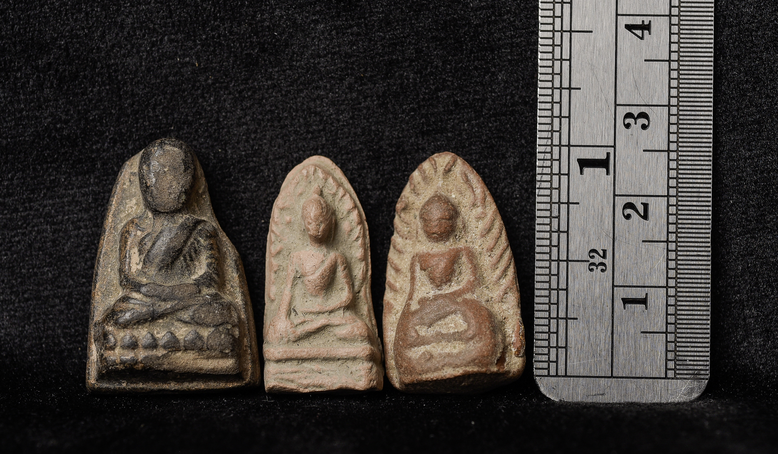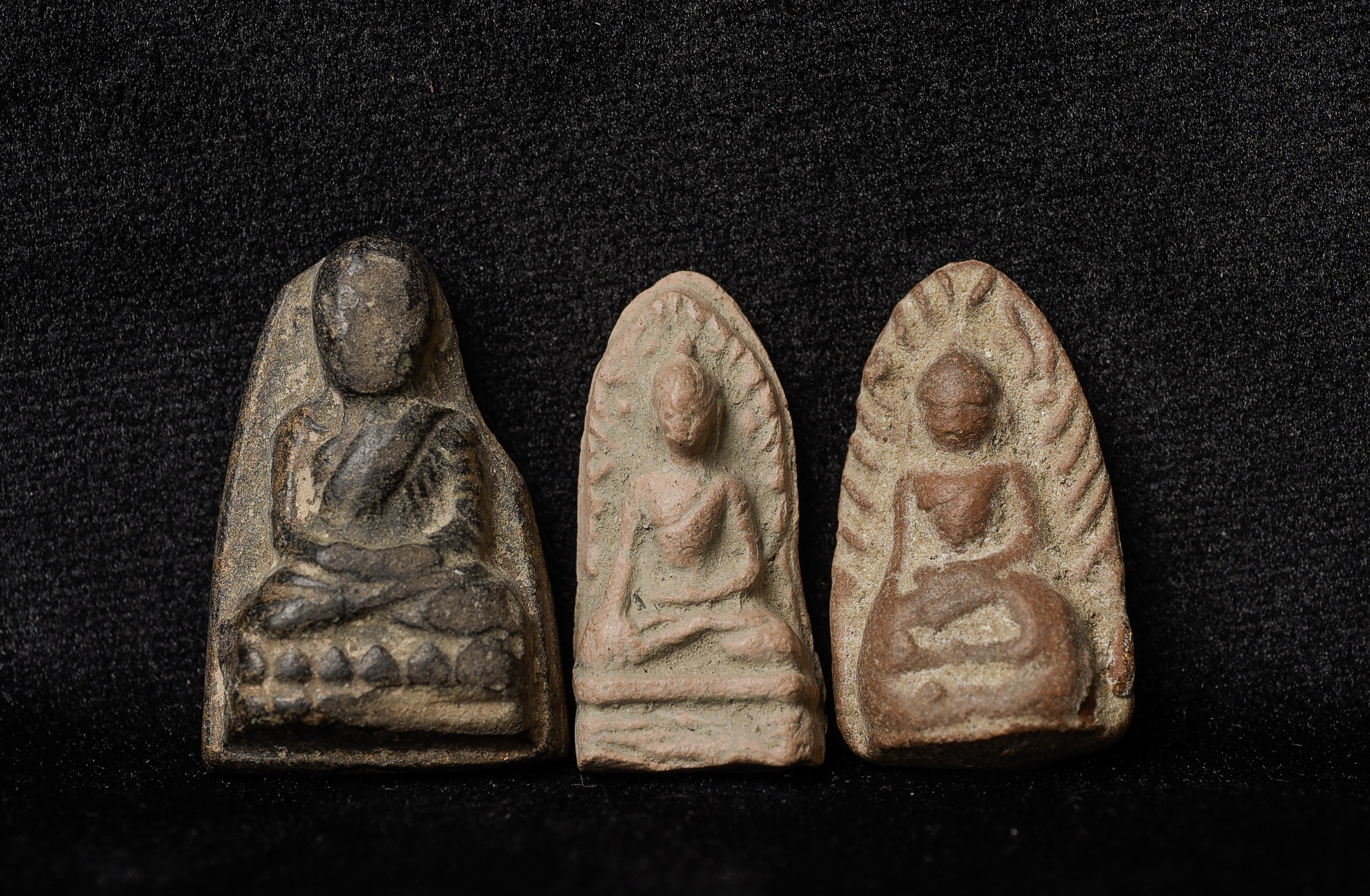 THREE antique Thai amulets from the major collection of a lifelong collector of Buddhist amulets and tablets and other small items, primarily from southeast Asia. Out of all of the collections I have purchased or considered purchasing in the past 35 years, this one is probably the most consistently authentic and very high quality overall. I will be listing them over the next six months. These look to be a few hundred years old. There were many of these types made in different temples -they were extremely similar, but they were each distinctive in the kind of clay, the thickness of the Buddha, etc. I am not an expert on these kinds of amulets but some collectors can examine these and tell you precisely which Temple and which years they come from. This auction is for THREE authentic old ones. Domestic packing and shipping are included. International packing and shipping included for an additional $25 10g (all 3 )