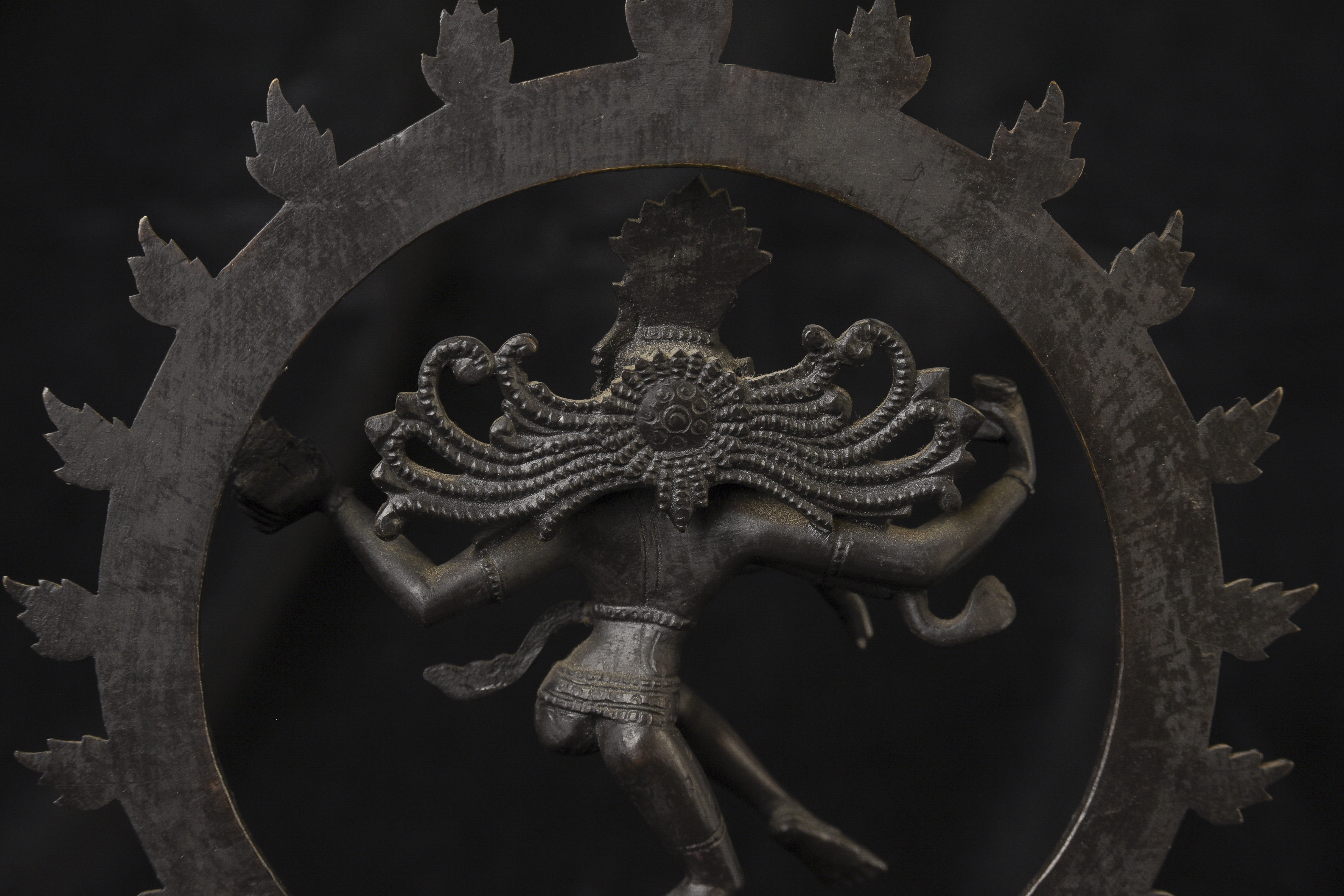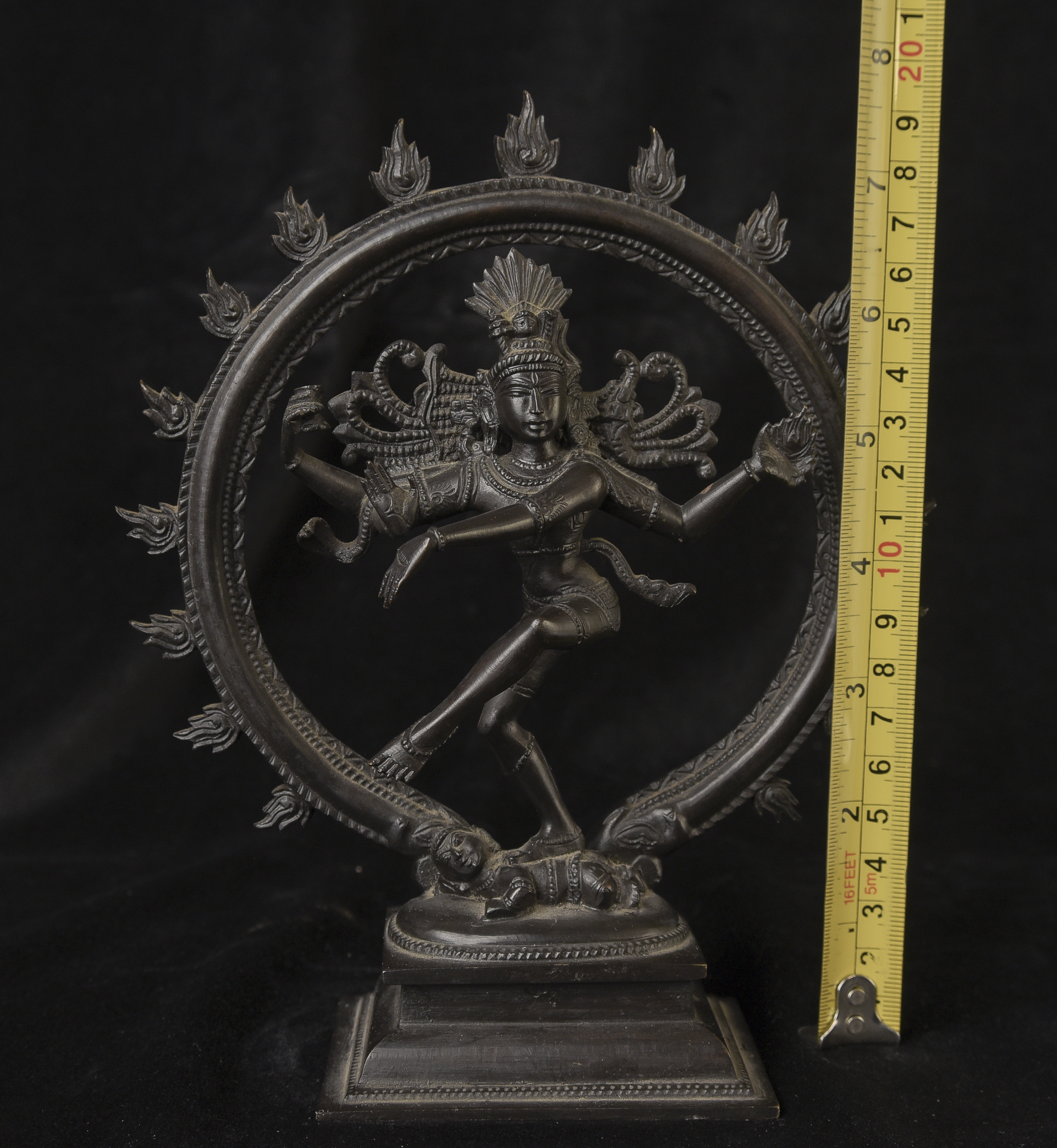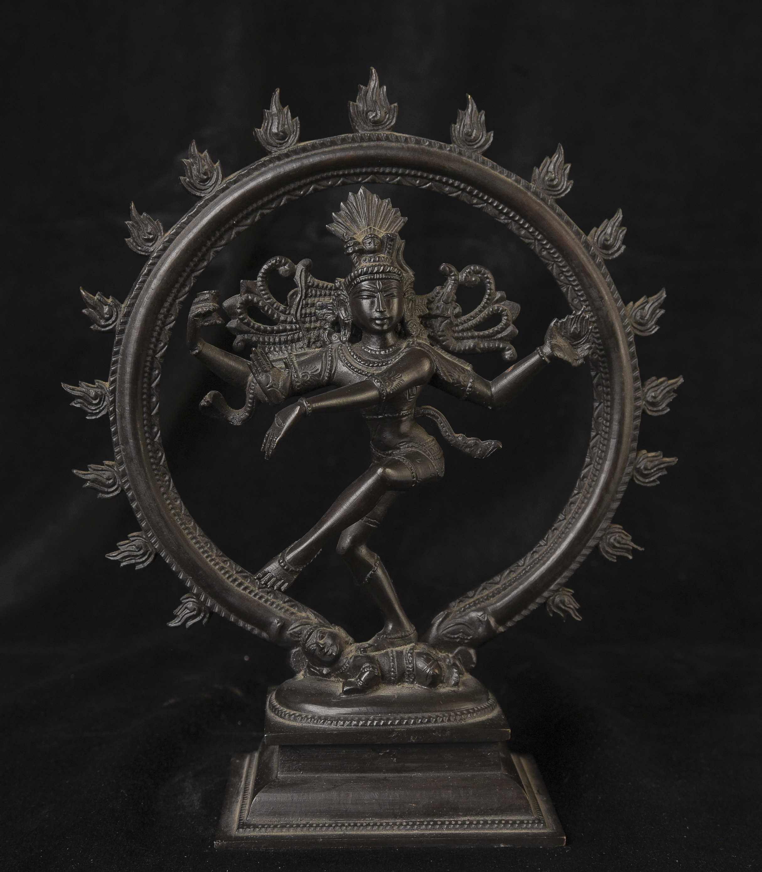 This is a Shiva Nataraj, dancing the cosmic dance of simultaneous creation and destruction. It is one of the greatest images in all of Eastern sculpture. It's very hard to find hi quality examples of this image in three-dimensional art as it is so challenging to do it well. Also, so many people are looking for one of these that when one comes along it sells very quickly. This example is 20th century and not large, but the face is exceptionally nice and the price is reasonable. Take a look and see if it speaks to you. Almost 9 inches tall to the top of the highest flame.