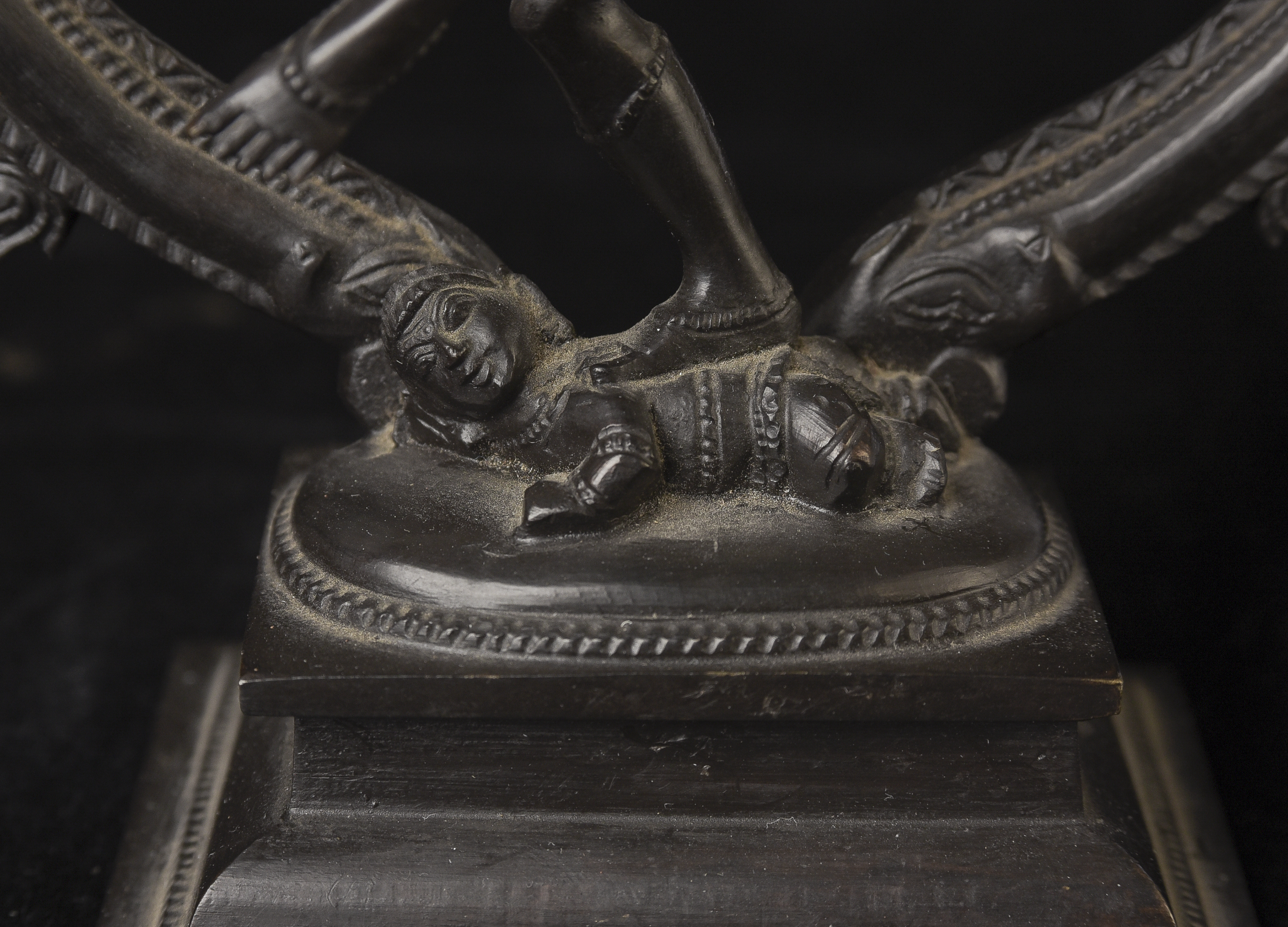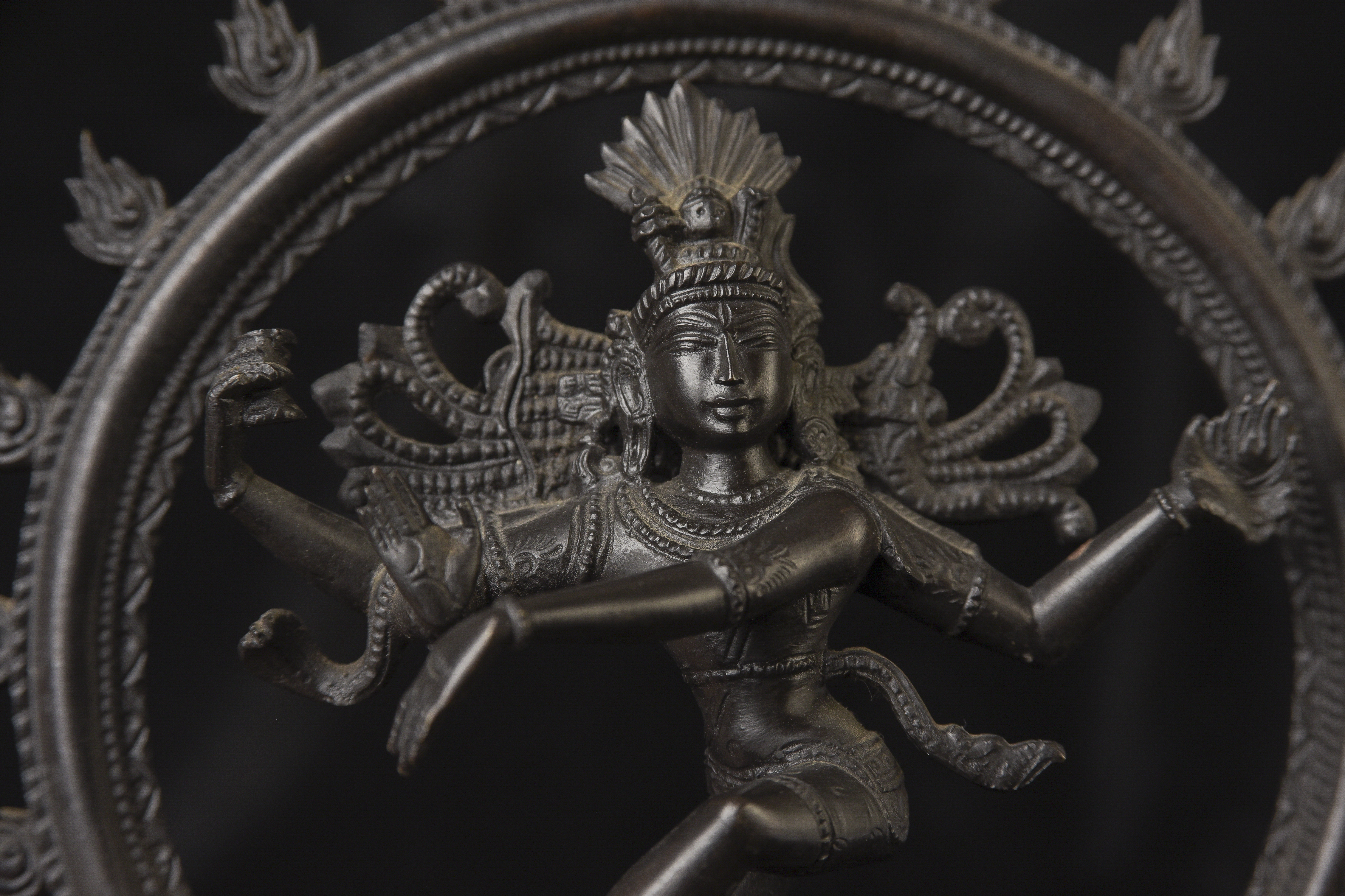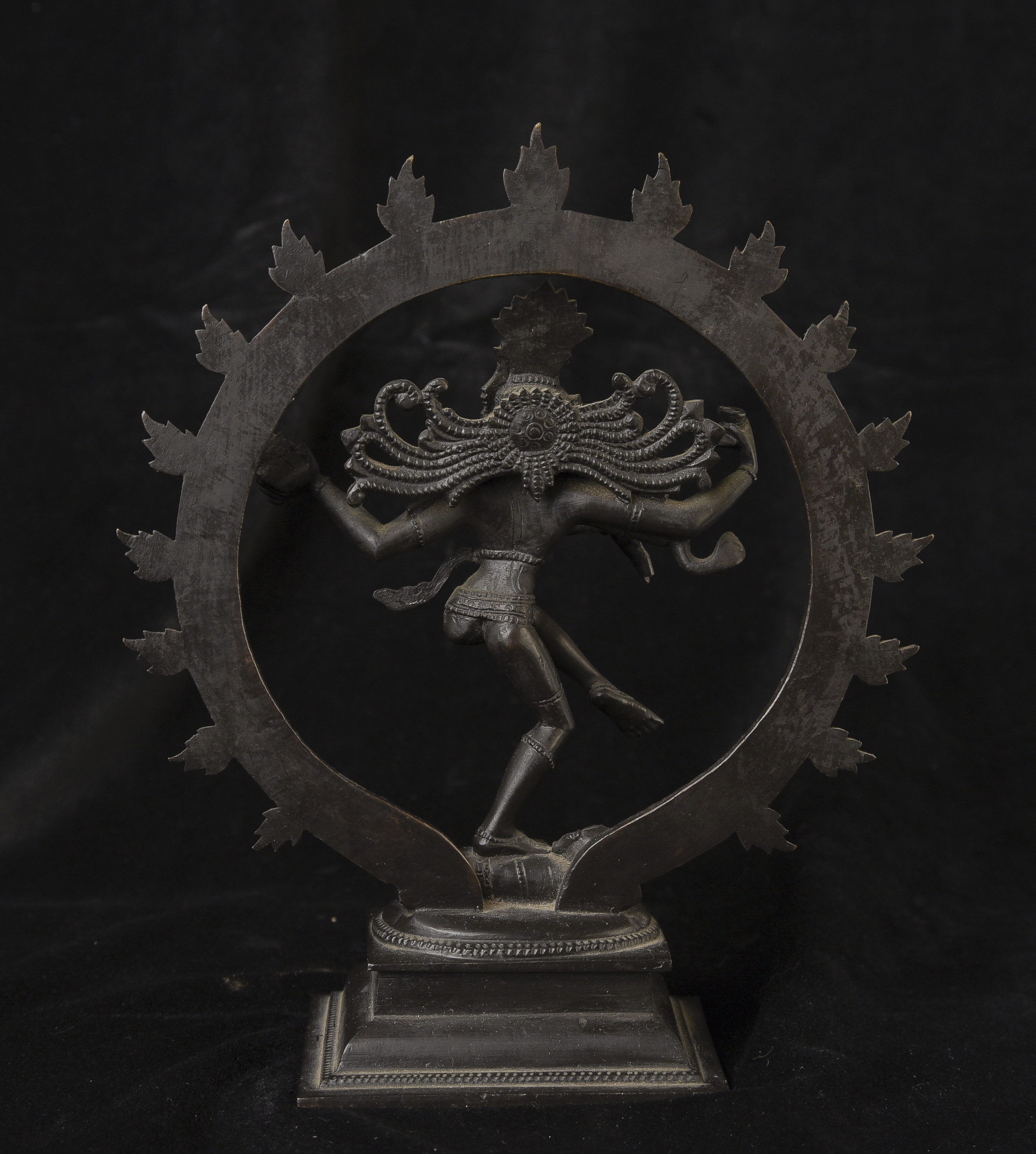 This is a Shiva Nataraj, dancing the cosmic dance of simultaneous creation and destruction. It is one of the greatest images in all of Eastern sculpture. It's very hard to find hi quality examples of this image in three-dimensional art as it is so challenging to do it well. Also, so many people are looking for one of these that when one comes along it sells very quickly. This example is 20th century and not large, but the face is exceptionally nice and the price is reasonable. Take a look and see if it speaks to you. Almost 9 inches tall to the top of the highest flame.