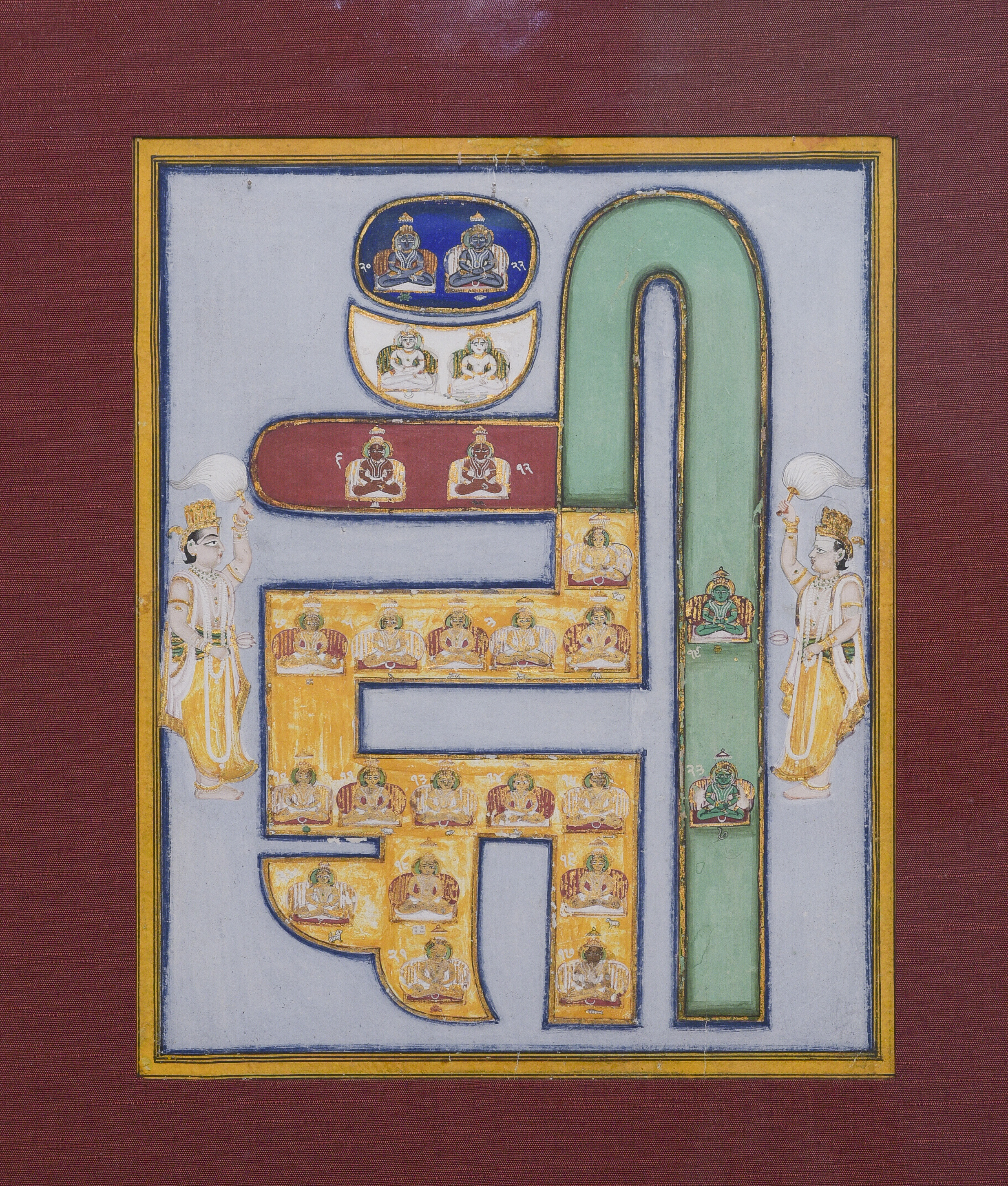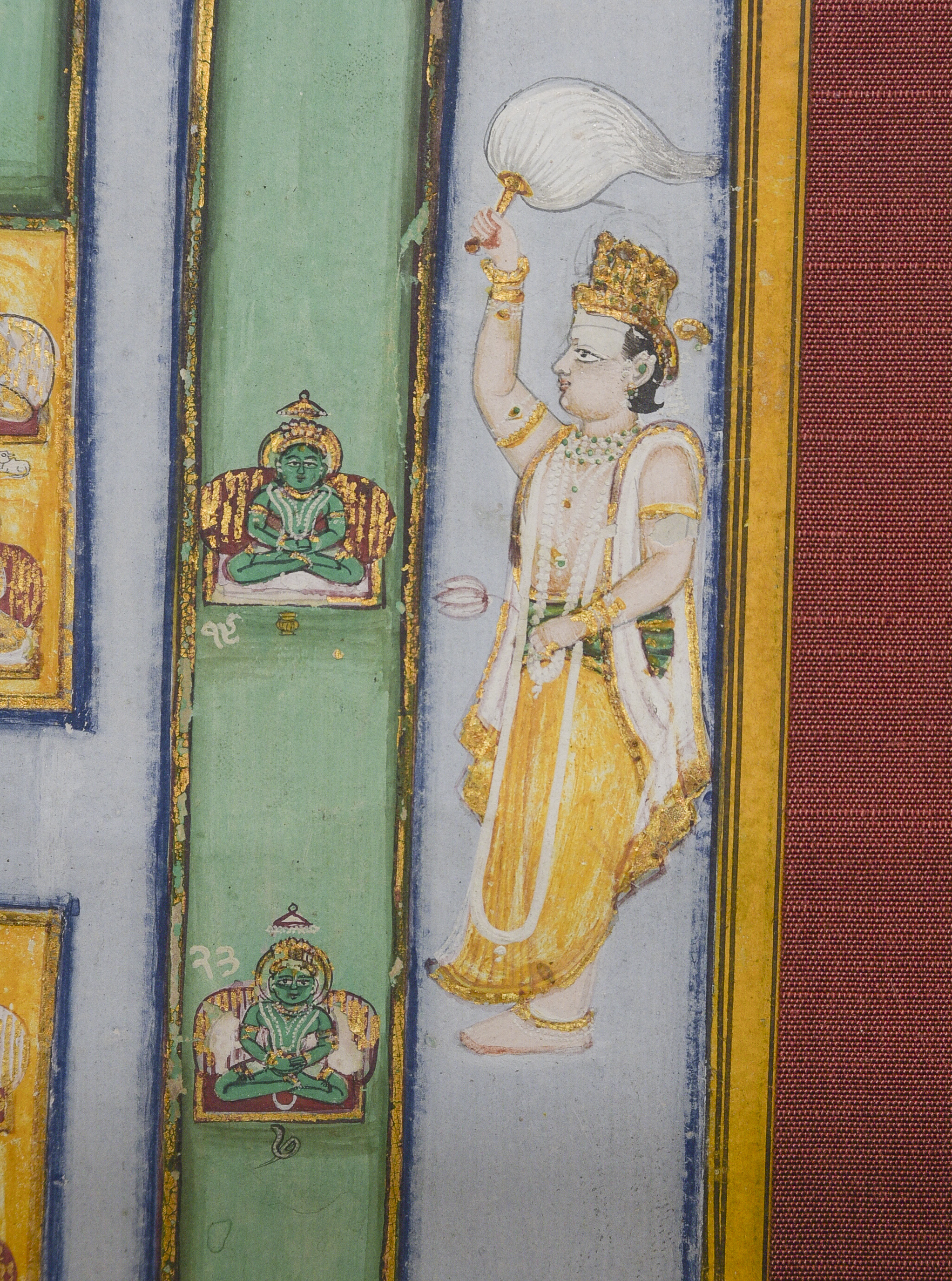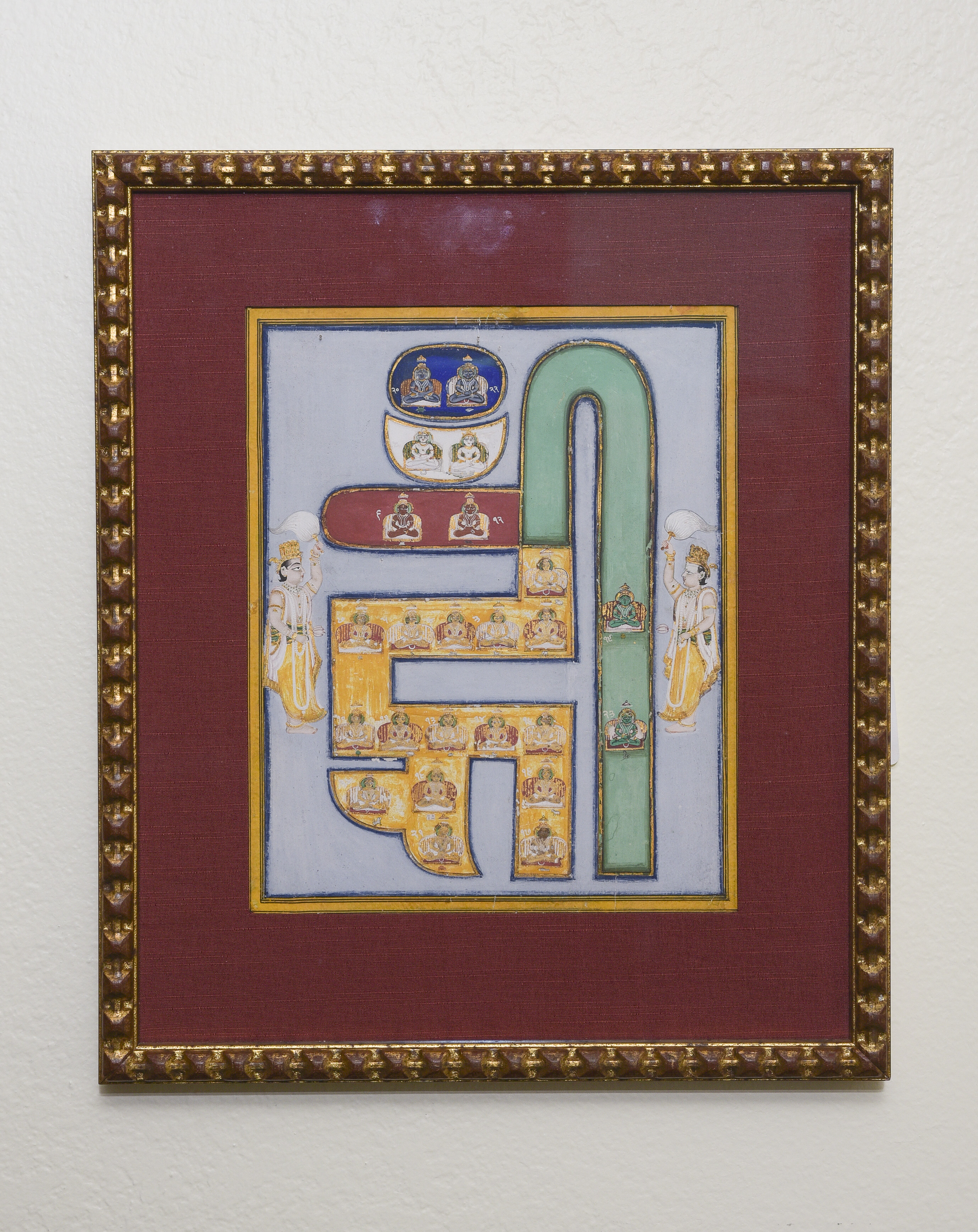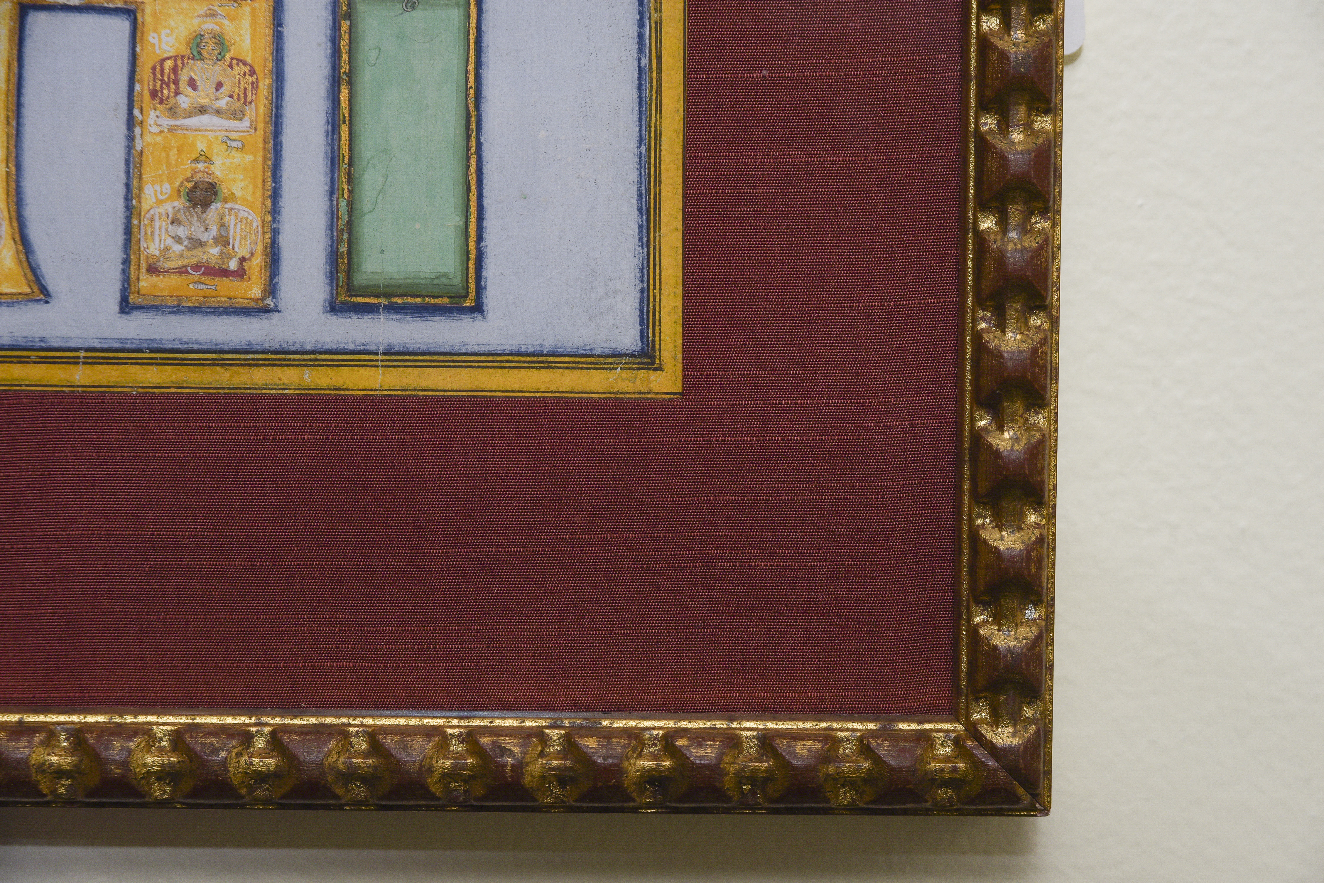 Distinctive 19thC Jain Painting. 12" x 14". Exquisite detail! Expensively framed, using museum glass and hand wrapped silk matting.