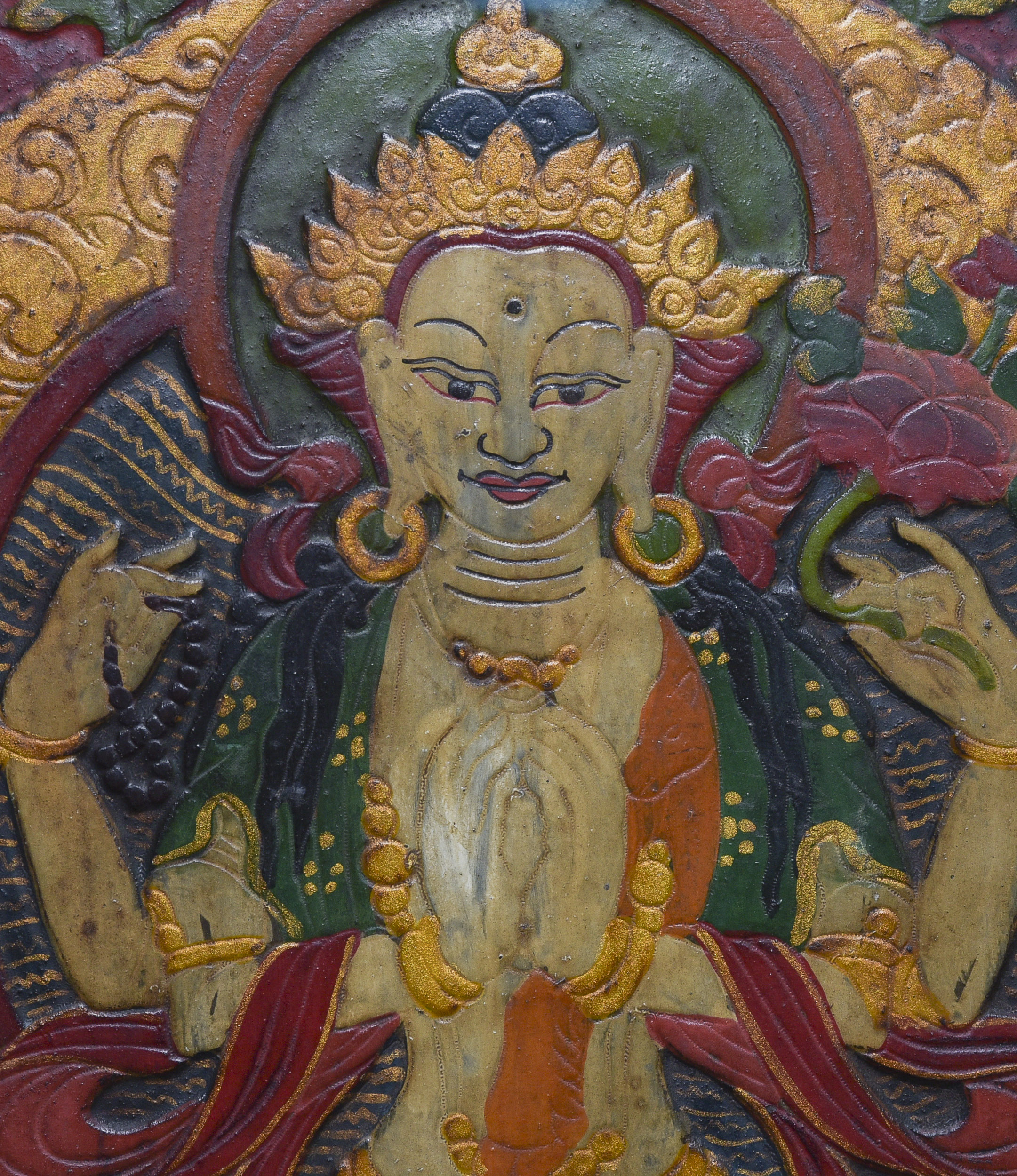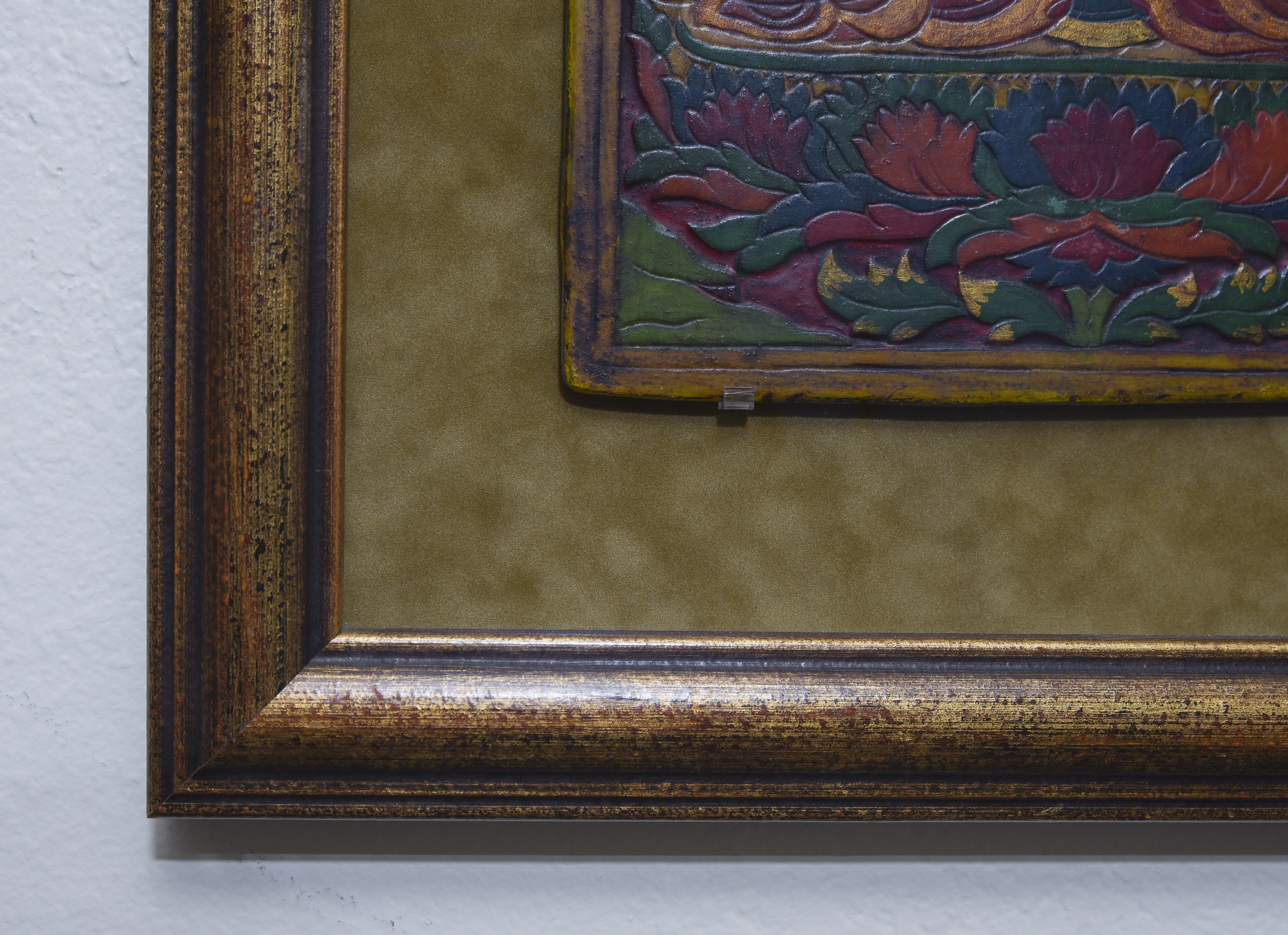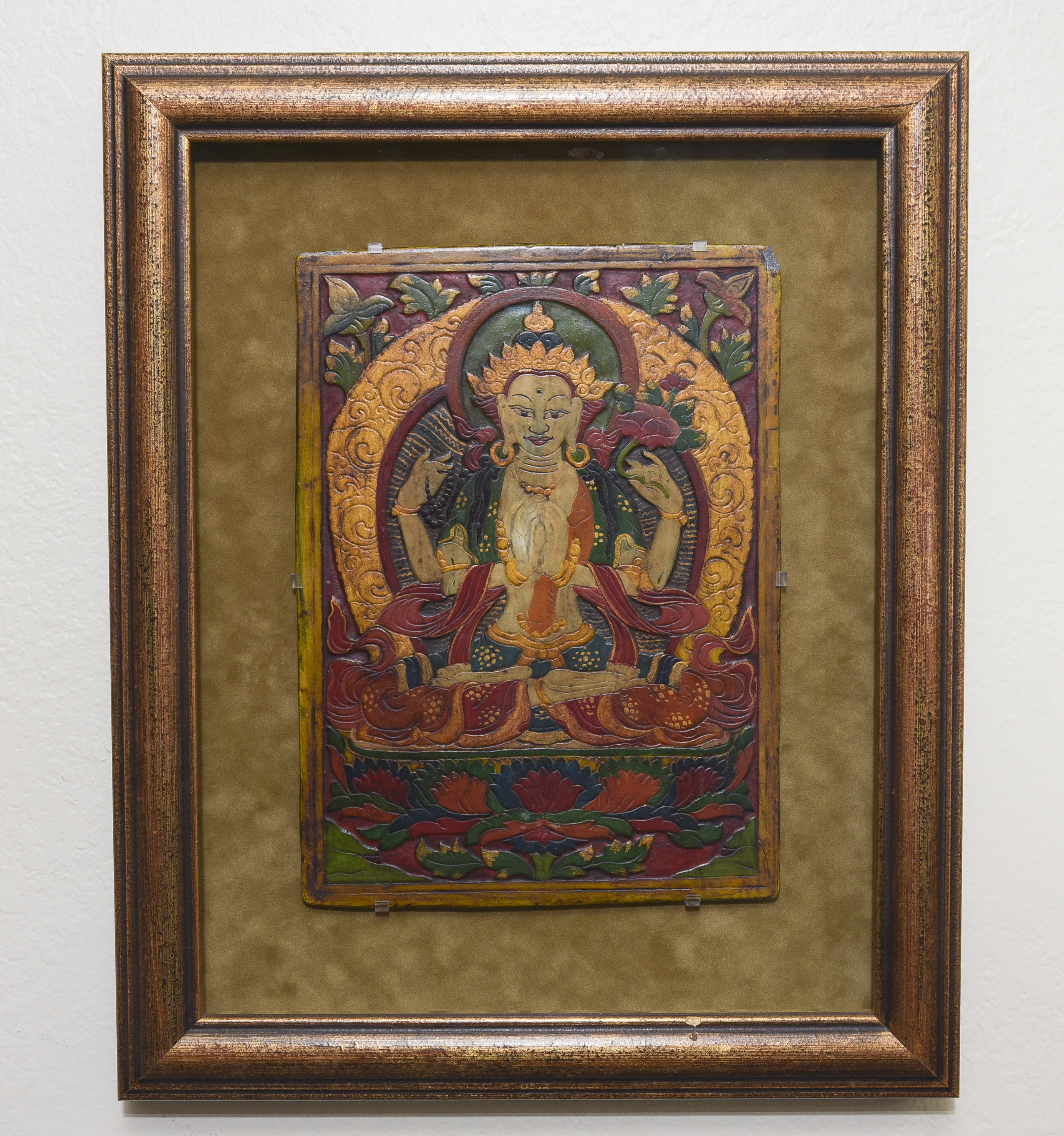 Very uncommon old/antique Tibetan stone Thangka. I've not seen othe like this- a beautifully and carefully carved and painted thin slab of shale or other stone. Expensively custom framed and glazed with museum glass. A square of stone is exposed on the back side. 8.5" x 12" piece is beautifully framed with an outer measurement of 15.5" x 19". This will be a little scary to ship due to the weight of the stone slab, though it is solidly mounted. Probably early to mid 20th century.