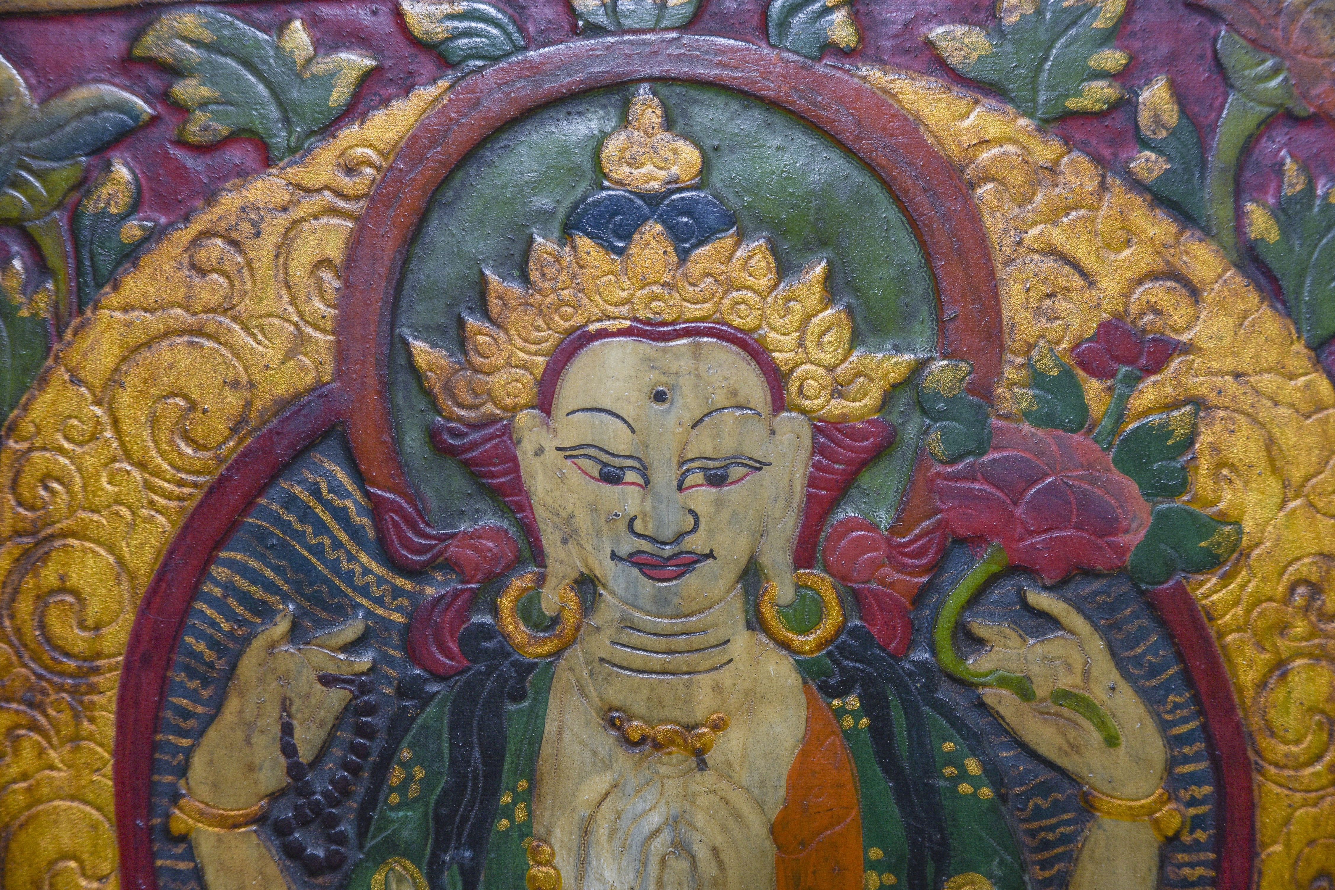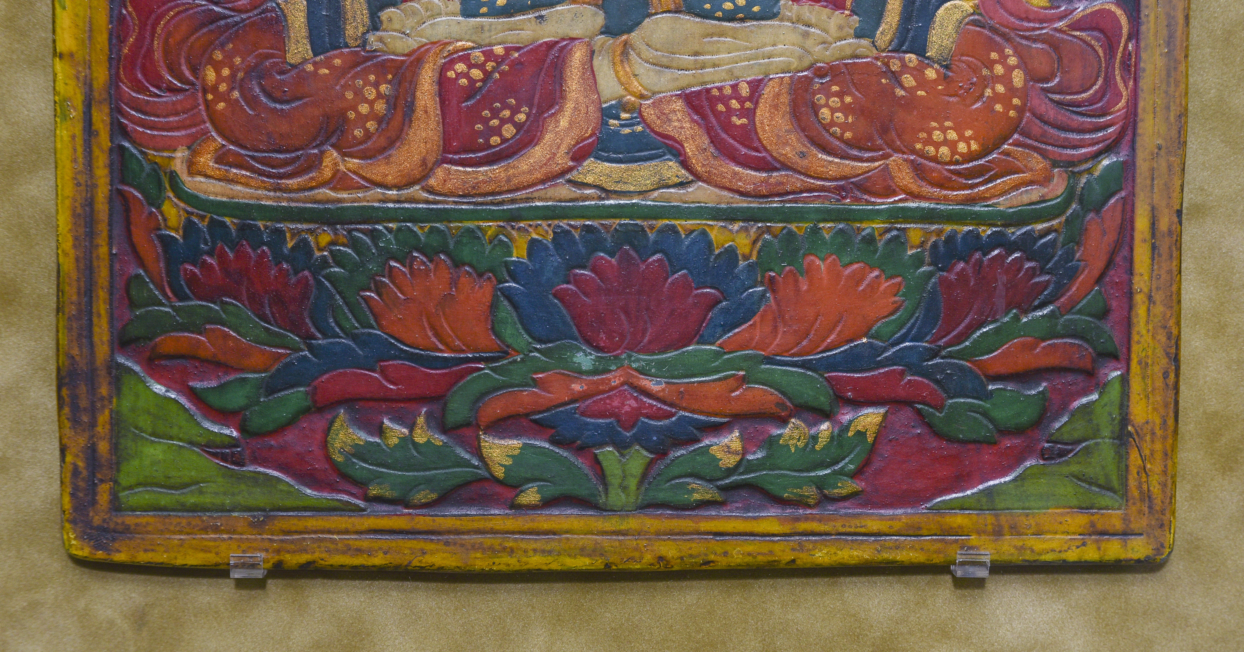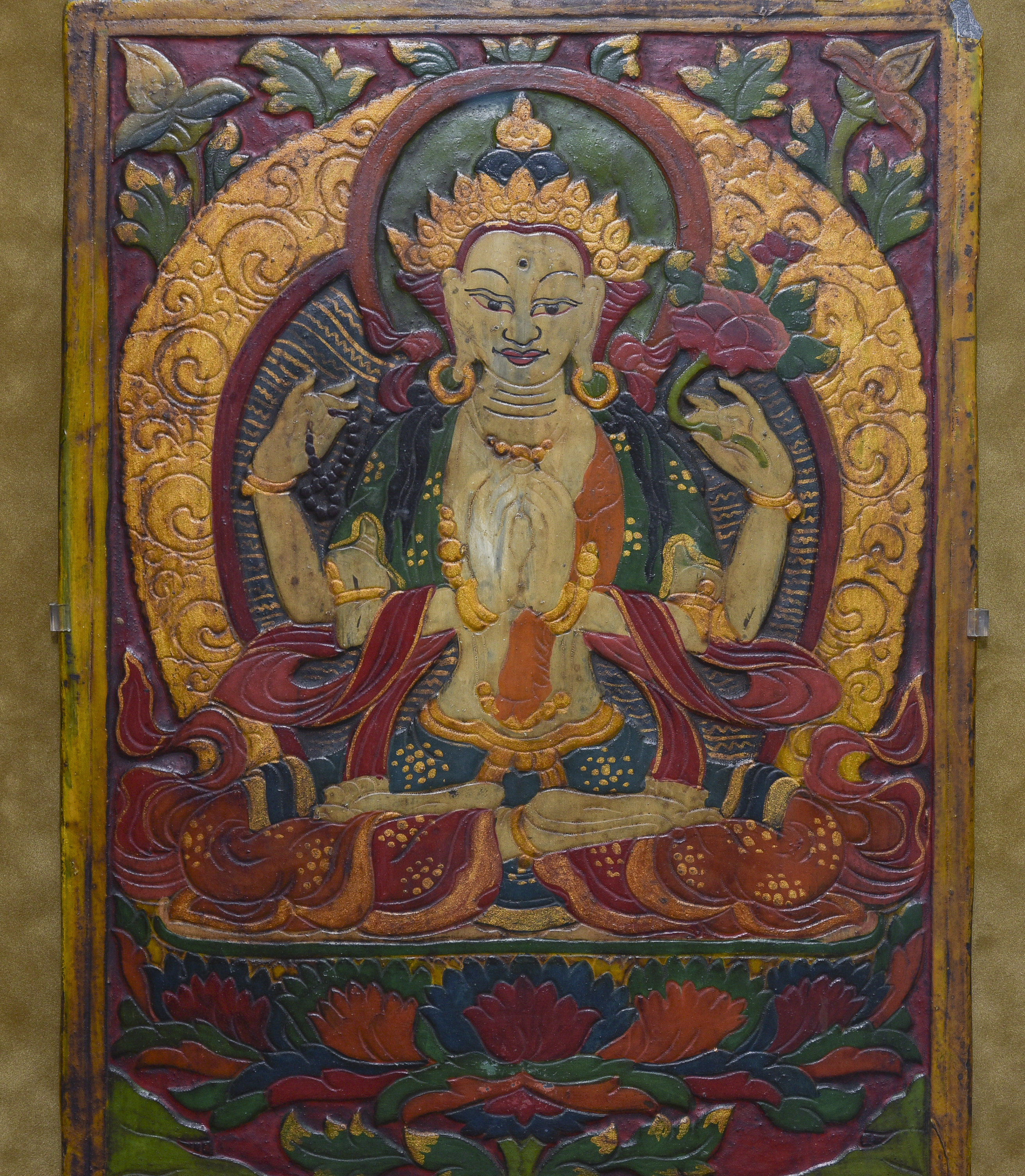 Very uncommon old/antique Tibetan stone Thangka. I've not seen othe like this- a beautifully and carefully carved and painted thin slab of shale or other stone. Expensively custom framed and glazed with museum glass. A square of stone is exposed on the back side. 8.5" x 12" piece is beautifully framed with an outer measurement of 15.5" x 19". This will be a little scary to ship due to the weight of the stone slab, though it is solidly mounted. Probably early to mid 20th century.