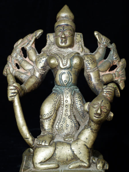 Nice Tantric Indian bronze. Eight arms, and standing on a figure with an animal body and a human head. Nice faces on both the deity and the human head. Nice patina with traces of Puja powder remaining. Stands 5.25 inches tall by 3.5 inches wide, and heavy for its size. Appears to have originally had a back-plate. Nice designs on the base.