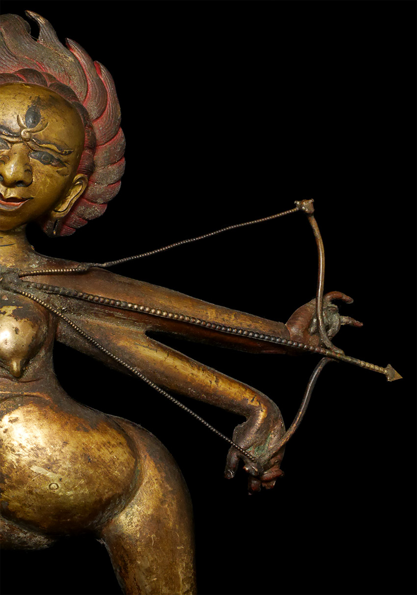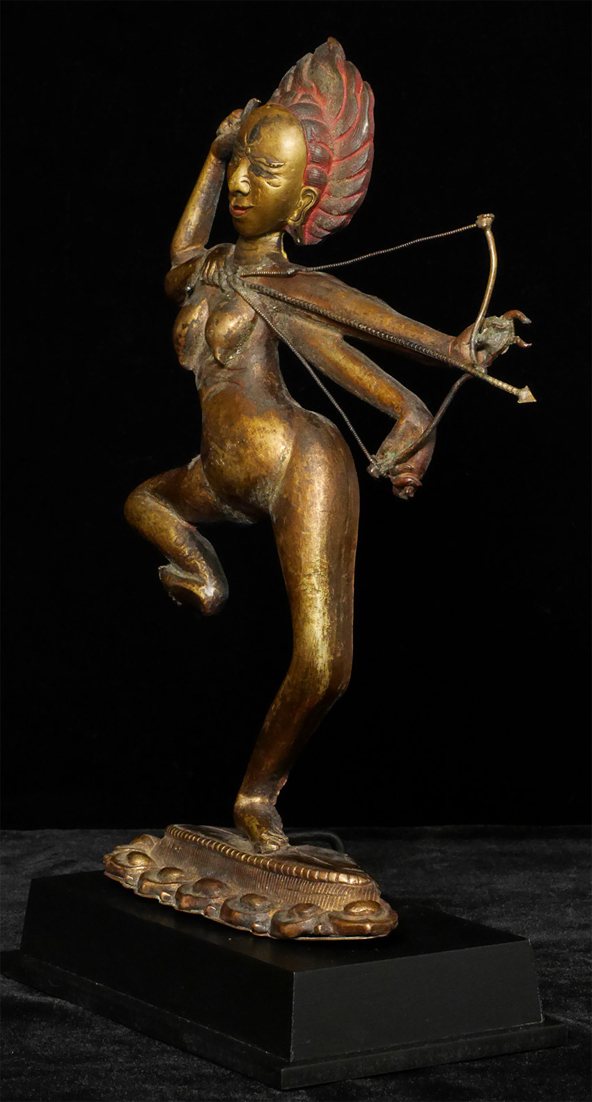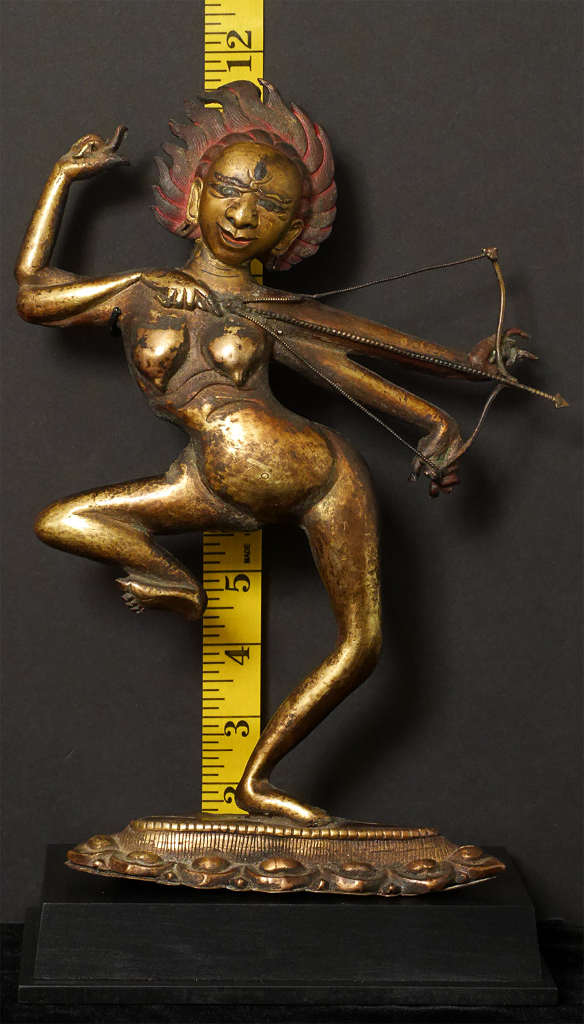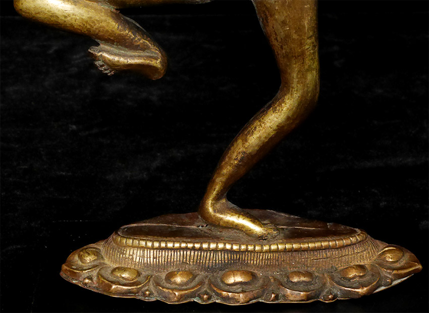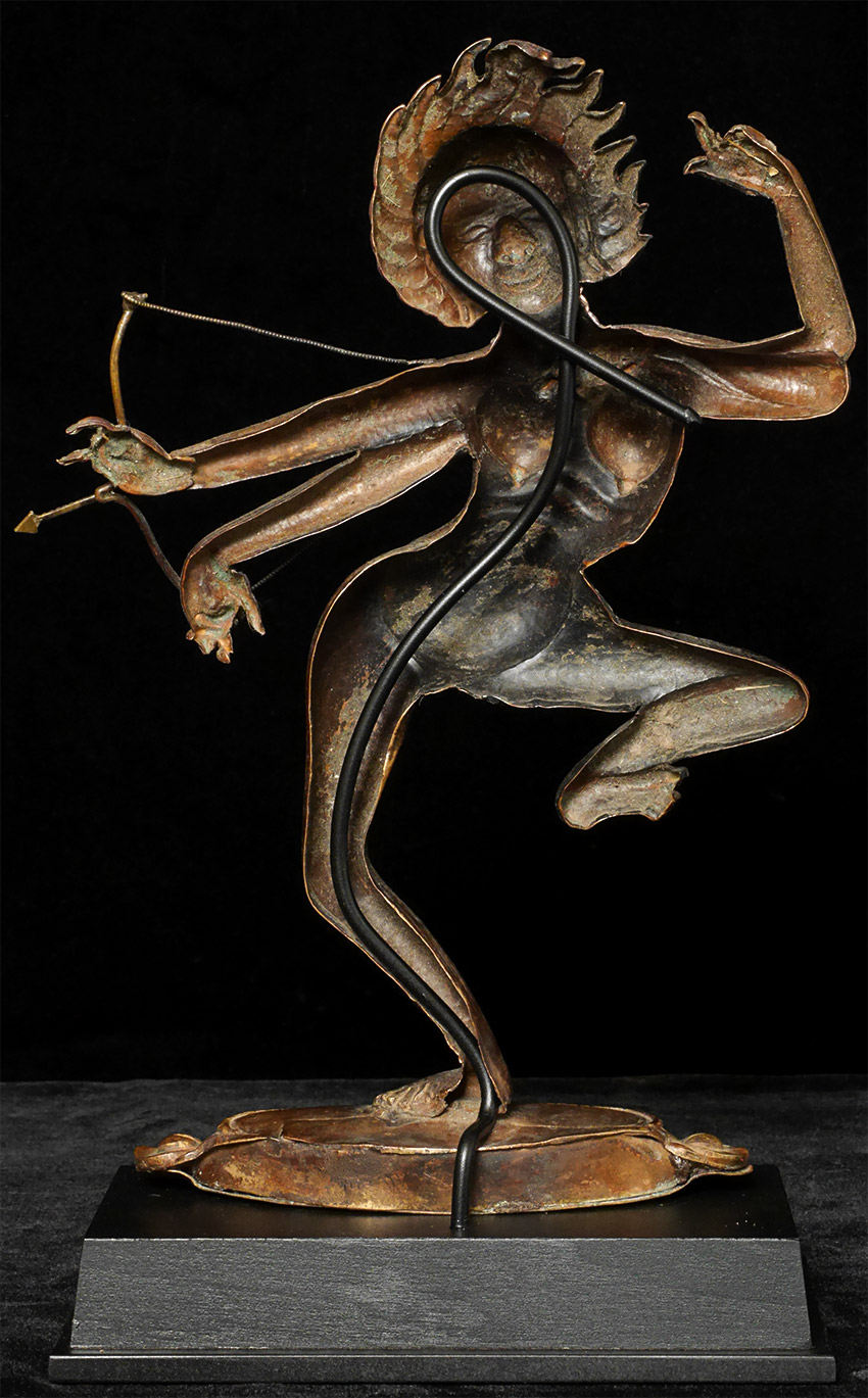 18/19thC Very special Dancing Dakini-Unique style and construction, along with skillful execution, create a true one-of-a-kind masterpiece. Sculpted in a repoussé method to perfect perfection of nearly pure copper with an open back, it has the spiritual force and demonstrates a very high level of artistic skill. Until very close examination, it is nearly impossible to tell it has an Until very close examination, it is nearly impossible to tell it has an open back or that it is created in this copper repousse method. Unique example of its type as far as I am aware. Stands a nice size at 10.25 inches tall, 11 5/8 inches on a custom stand. In remarkable condition--near mint--no damage, repair, or patina issues. Stand-out item. In nearly 40 years of collecting and selling,this is one of my all-time favorites.