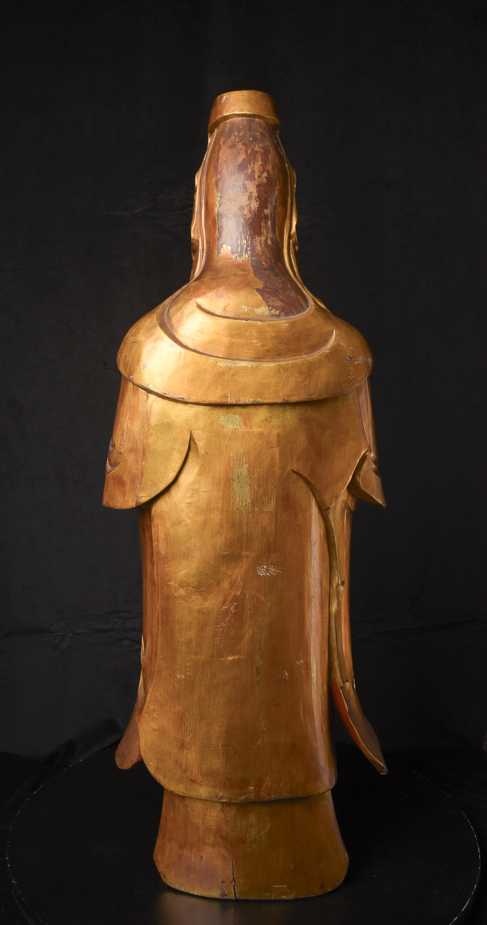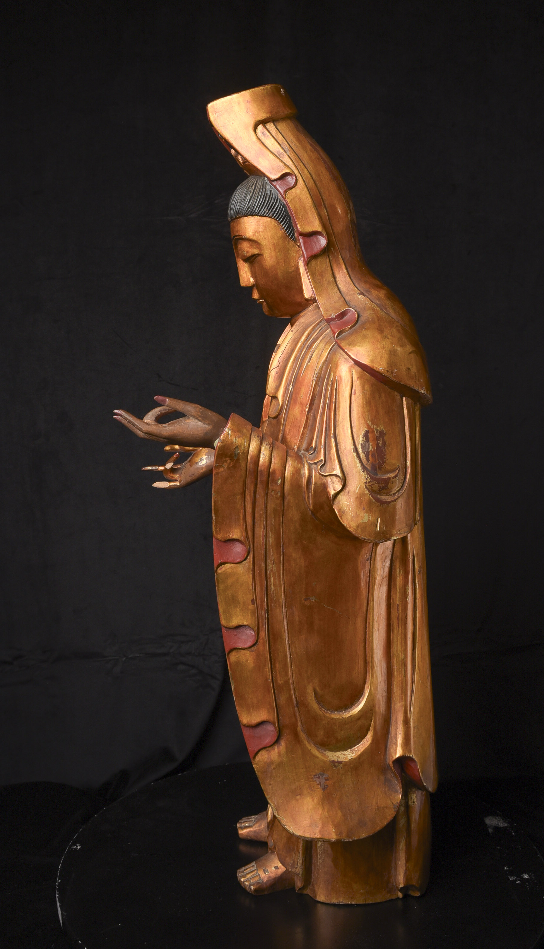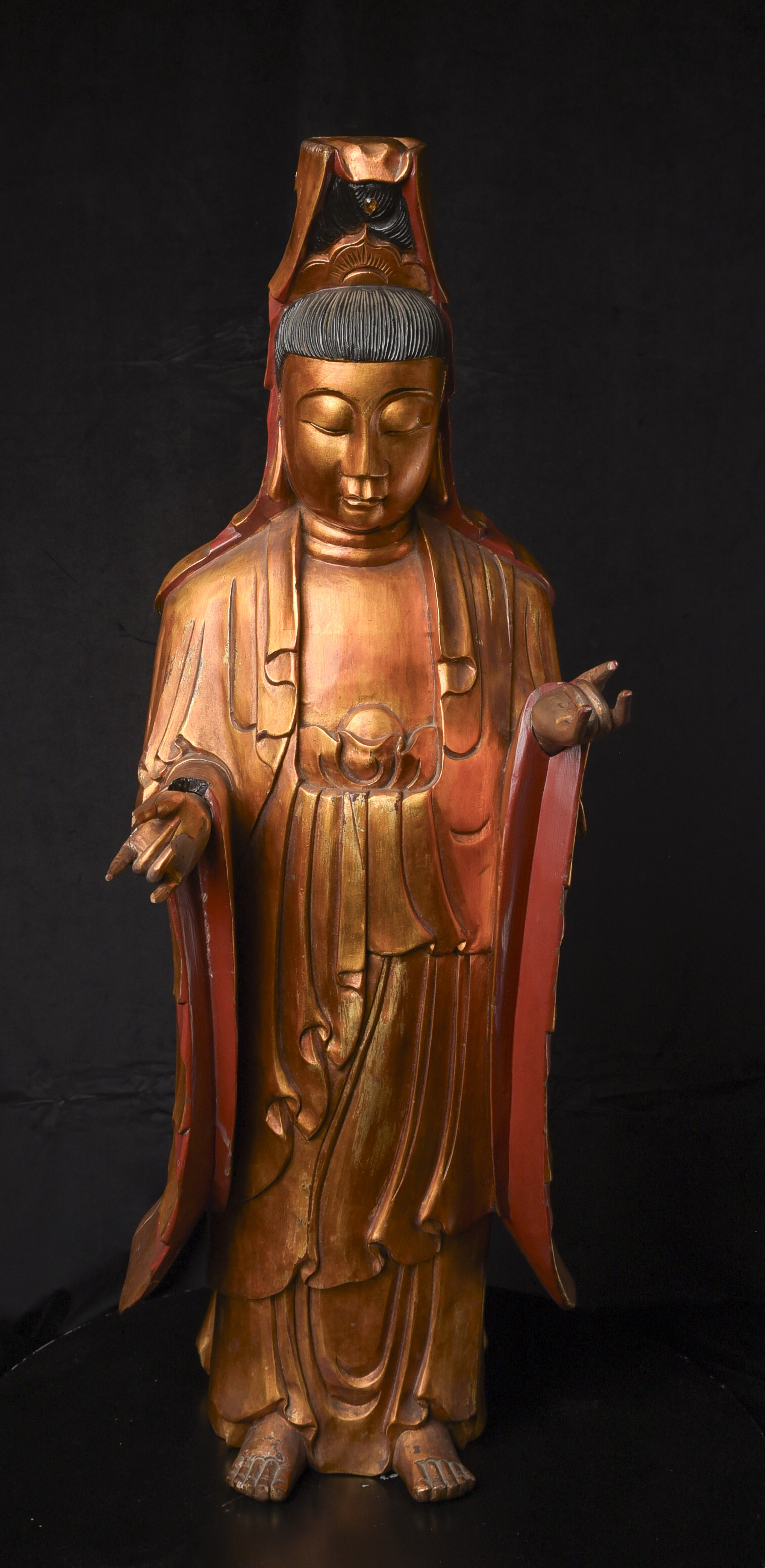 Large 18/19thC Chinese Quanyin carved out of wood and lacquered. ( 31.5"H x 11"W x 11"D ) - 18lbs. Few dings and minor losses as seen in photos, but overall in excellent condition- vibrant and clean. Exceptionally large for its type. Great face. Usually a fraction of this size.