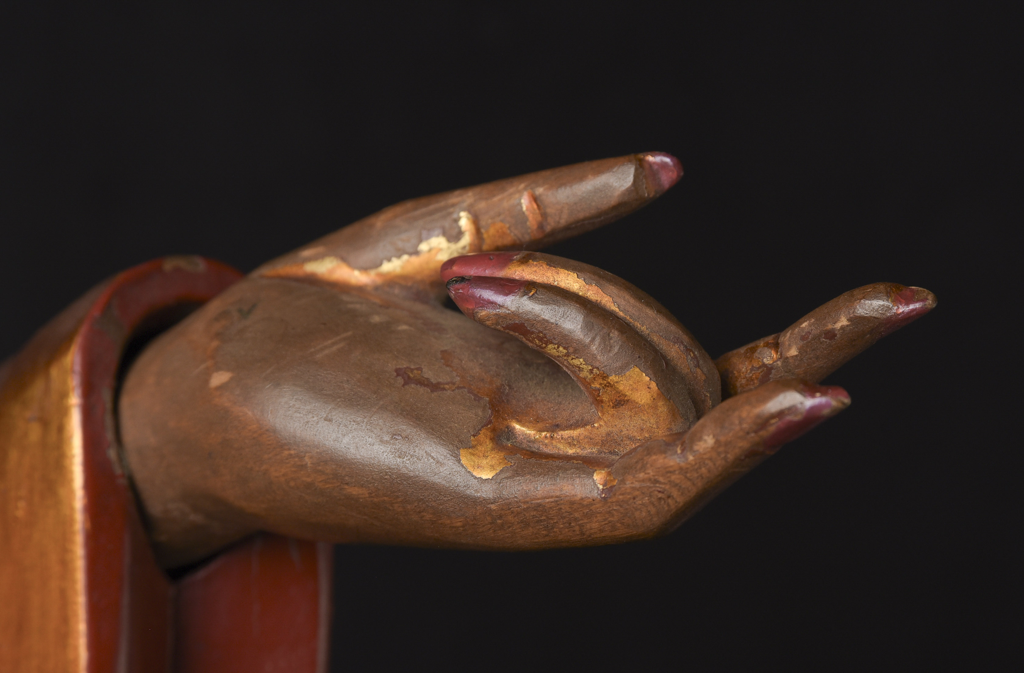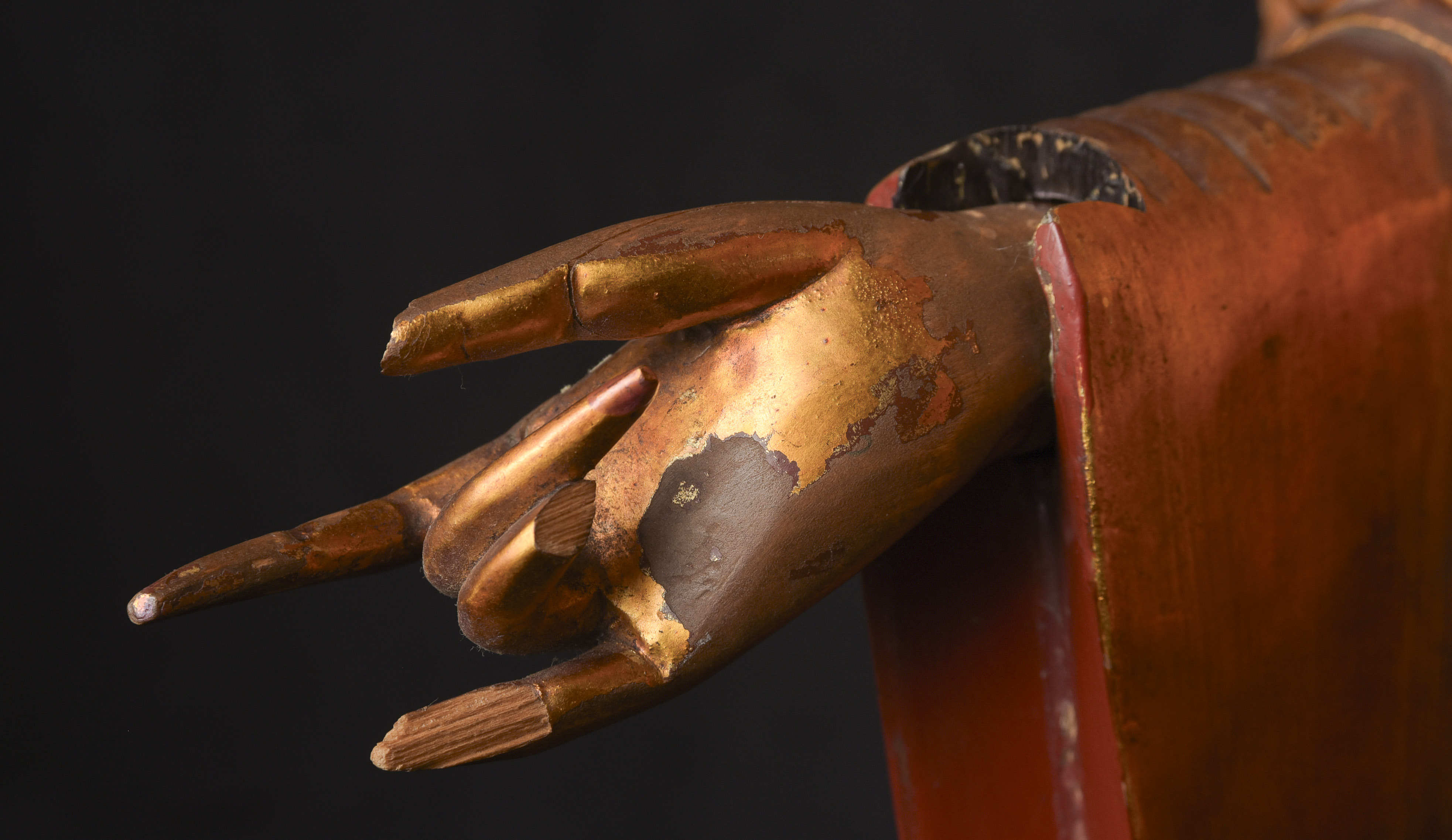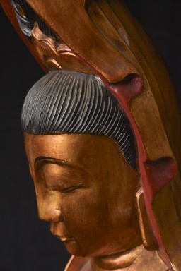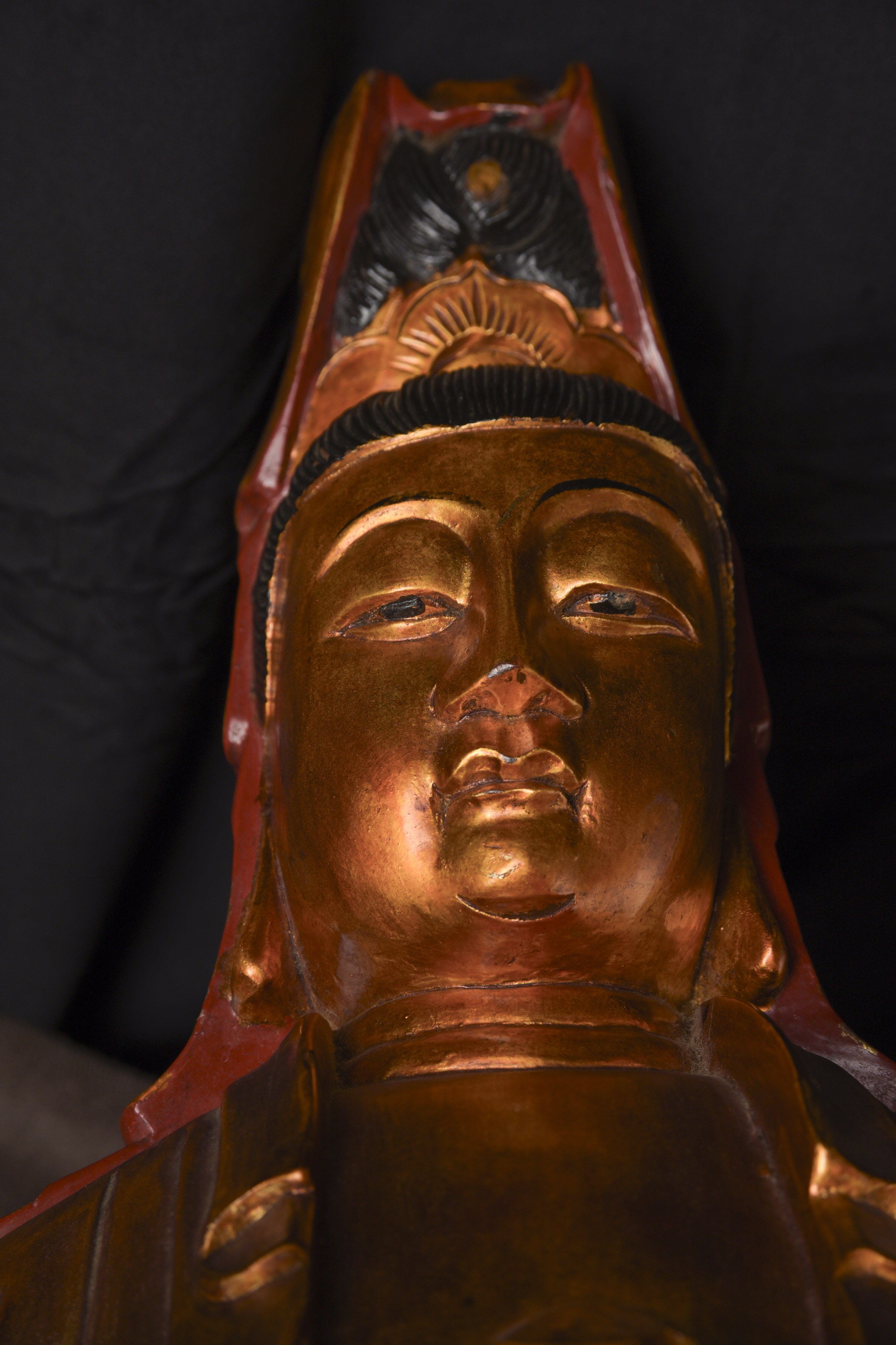 Large 18/19thC Chinese Quanyin carved out of wood and lacquered. ( 31.5"H x 11"W x 11"D ) - 18lbs. Few dings and minor losses as seen in photos, but overall in excellent condition- vibrant and clean. Exceptionally large for its type. Great face. Usually a fraction of this size.
