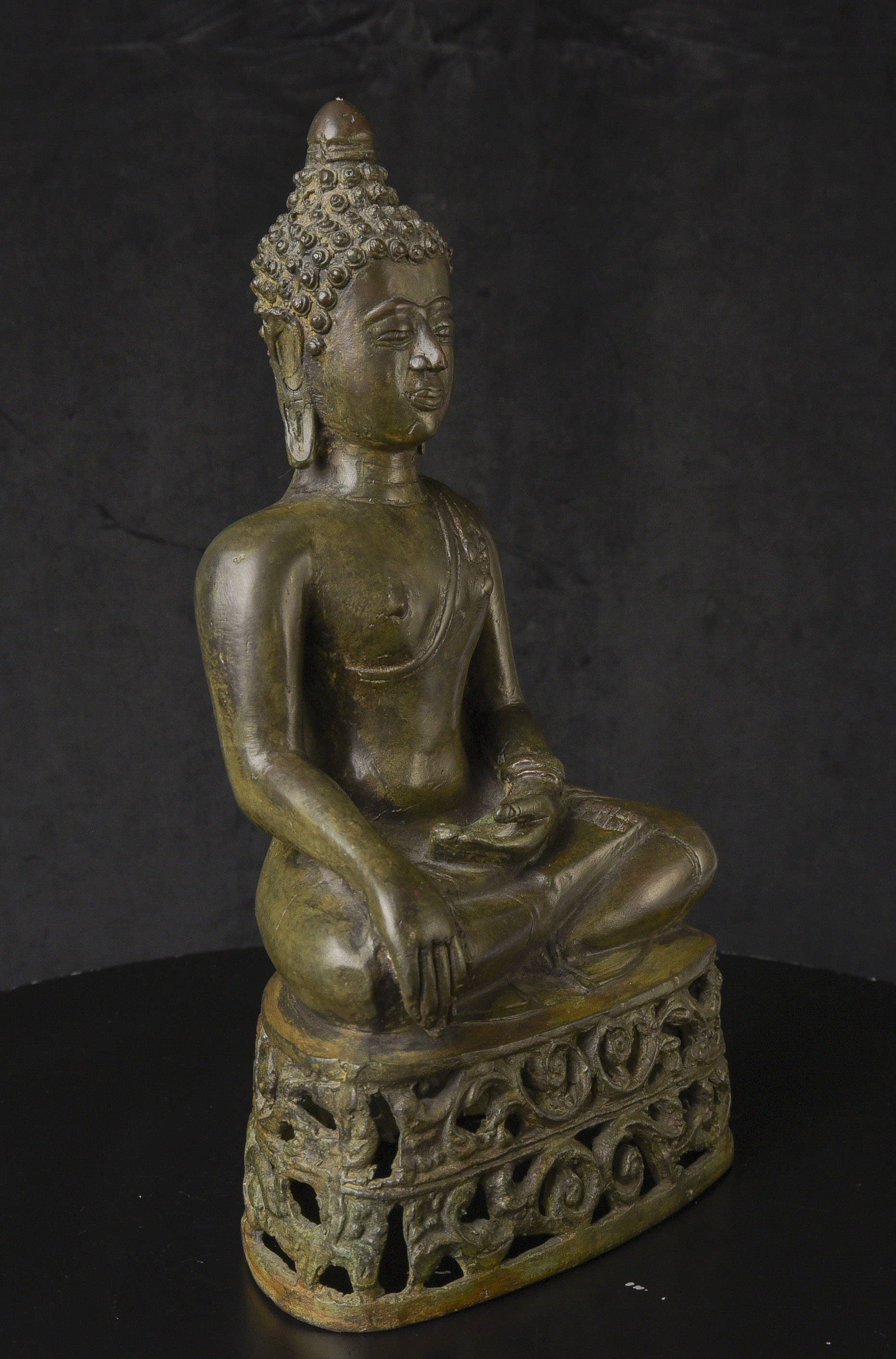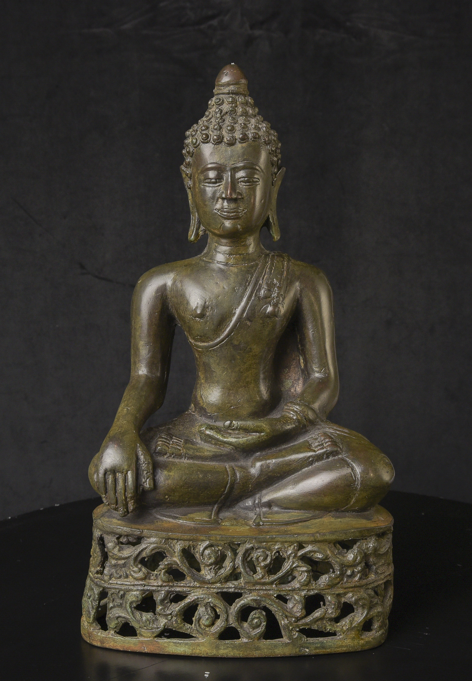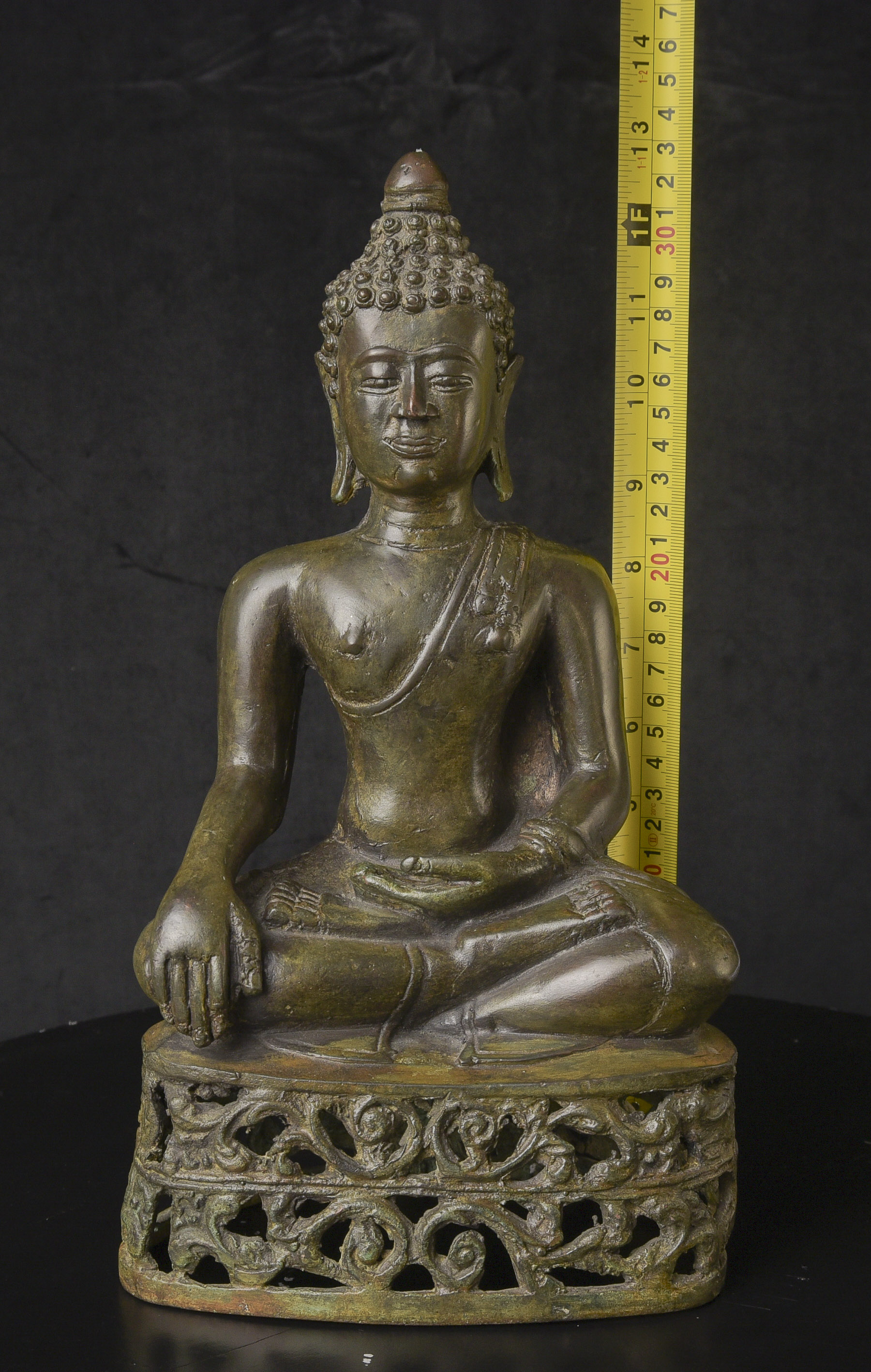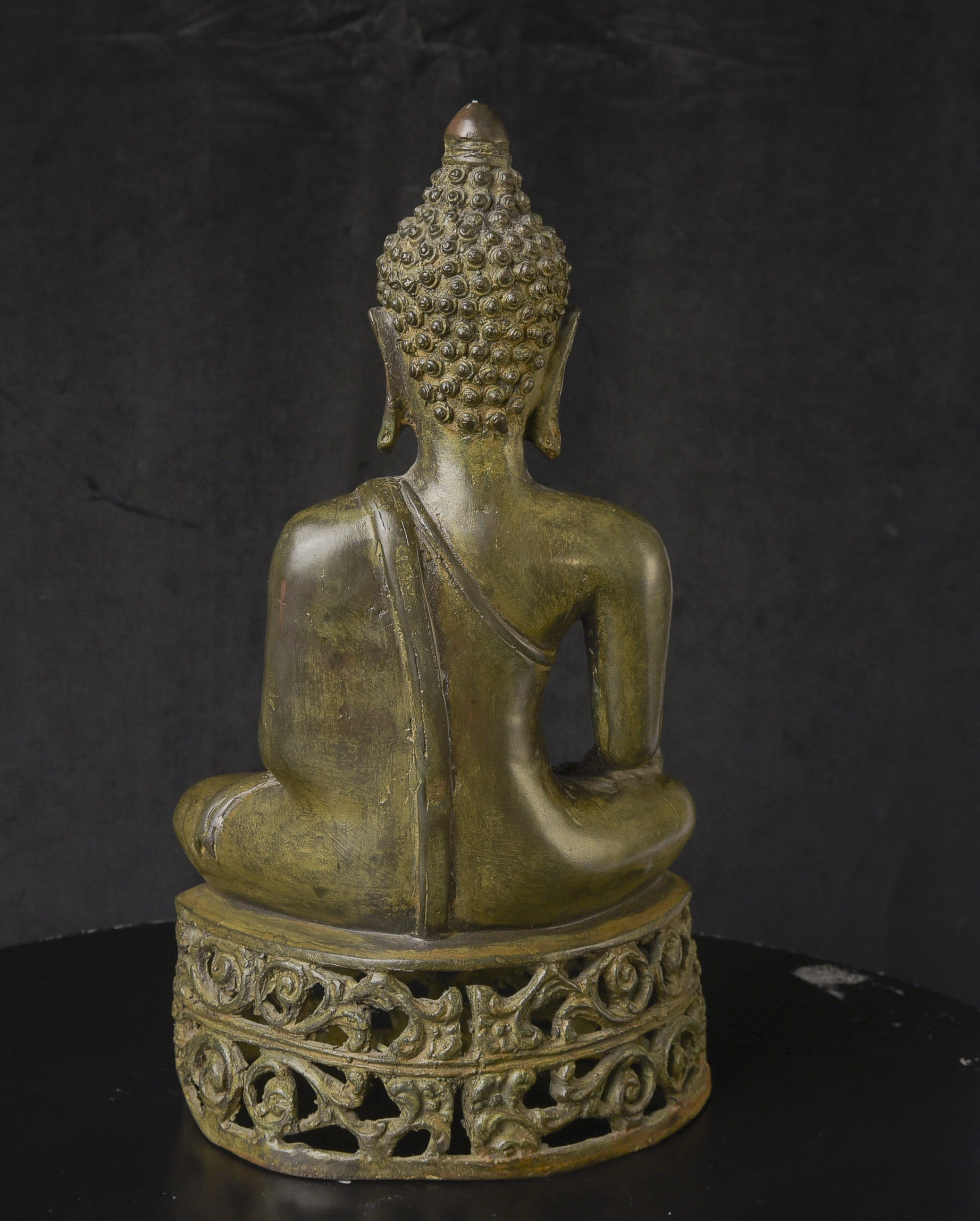 Circa 1900 Buddha with a pleasing face and an outstanding base. It is hard to find an authentic older Buddha of this size, and this is nice at this price. - ( 13"H x 7"W x 4.5"D ) - 8.30lbs