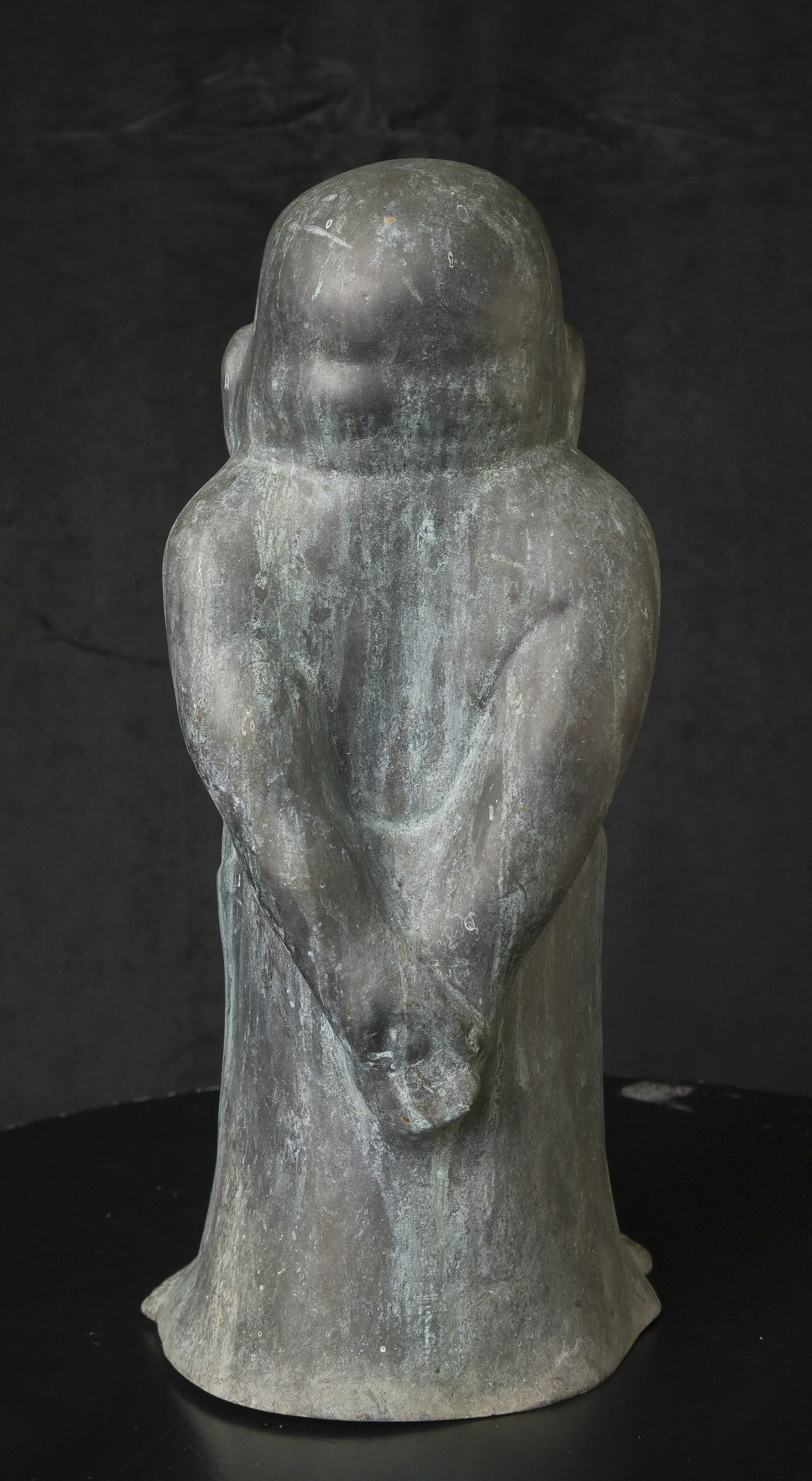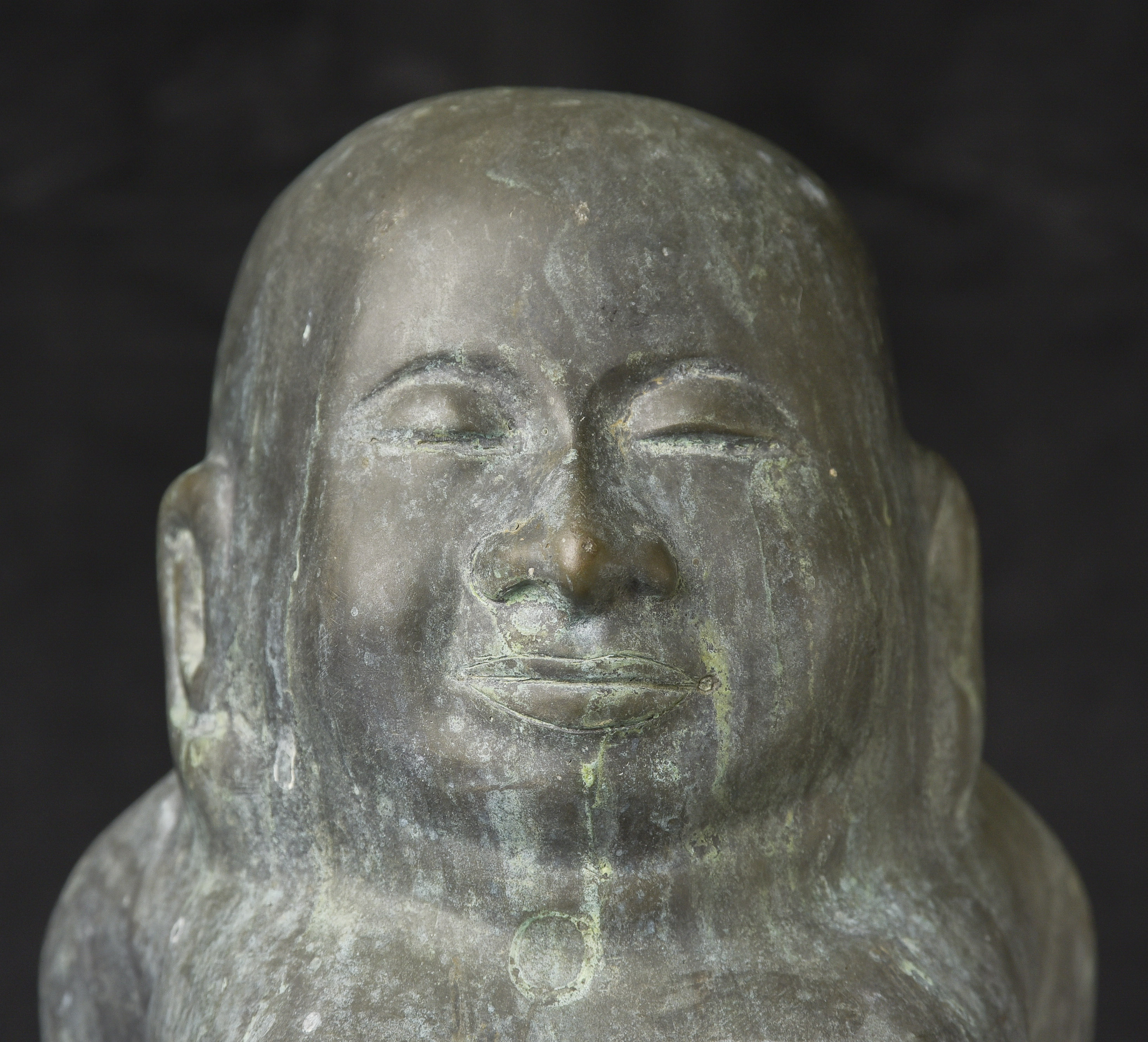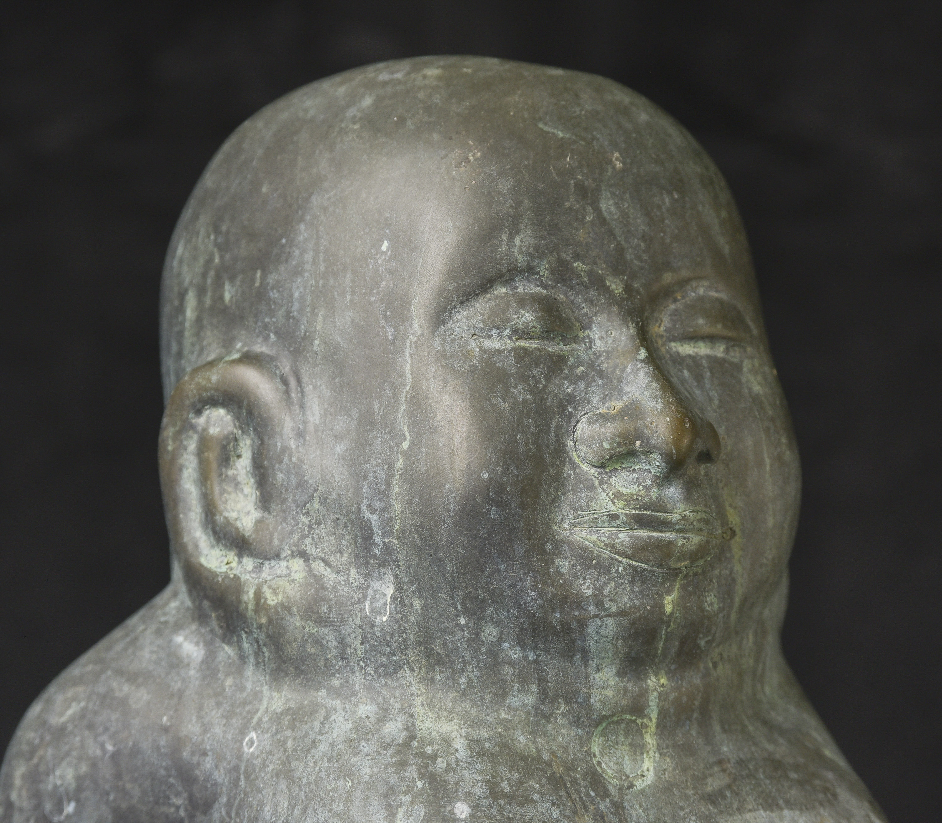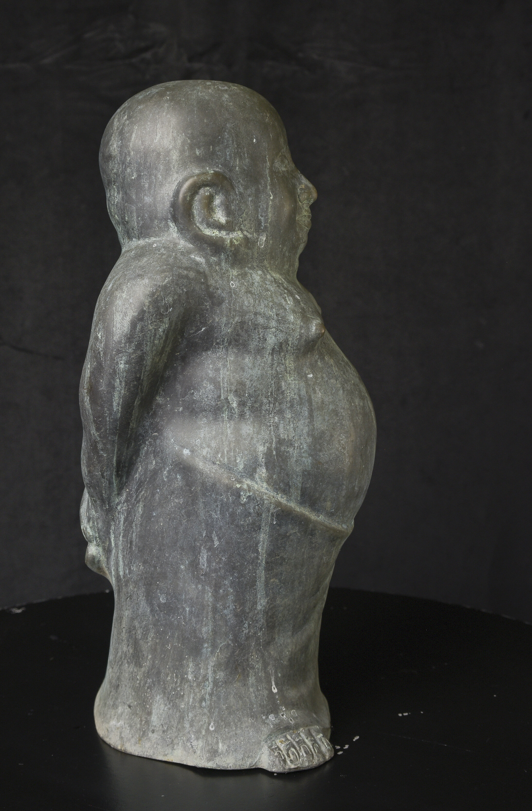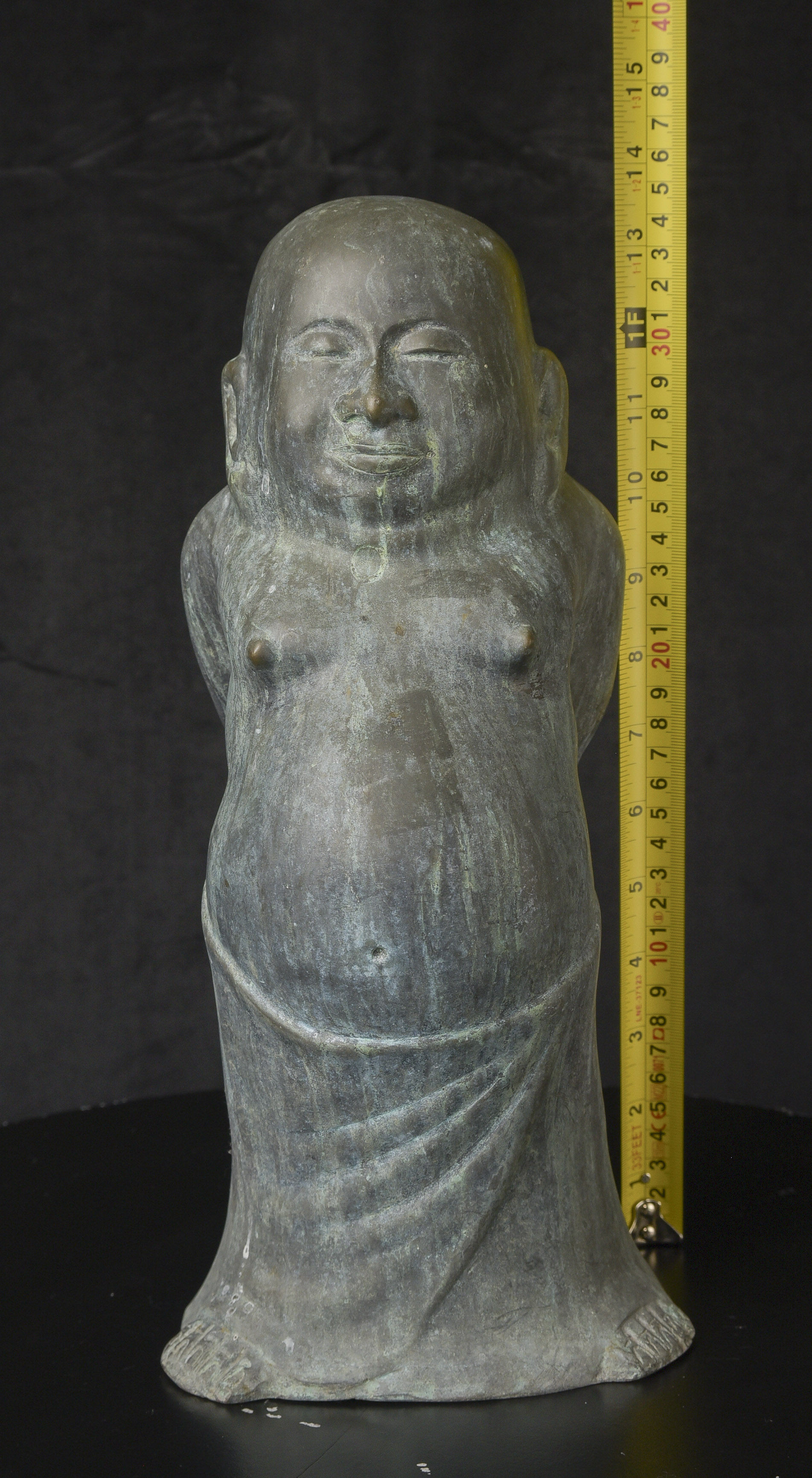 Large Vintage/Antique Standing Chinese Bronze Hotai/Buddha- It was likely in a covered garden or other protected outside area for a long time, as it appears to show significant effects of the elements, with the condition remaining very good. It looks to be early to mid-20thC. Deeply expressive. ( 13.25"H x 6.25"W x 6"D ) - 6.45lbs