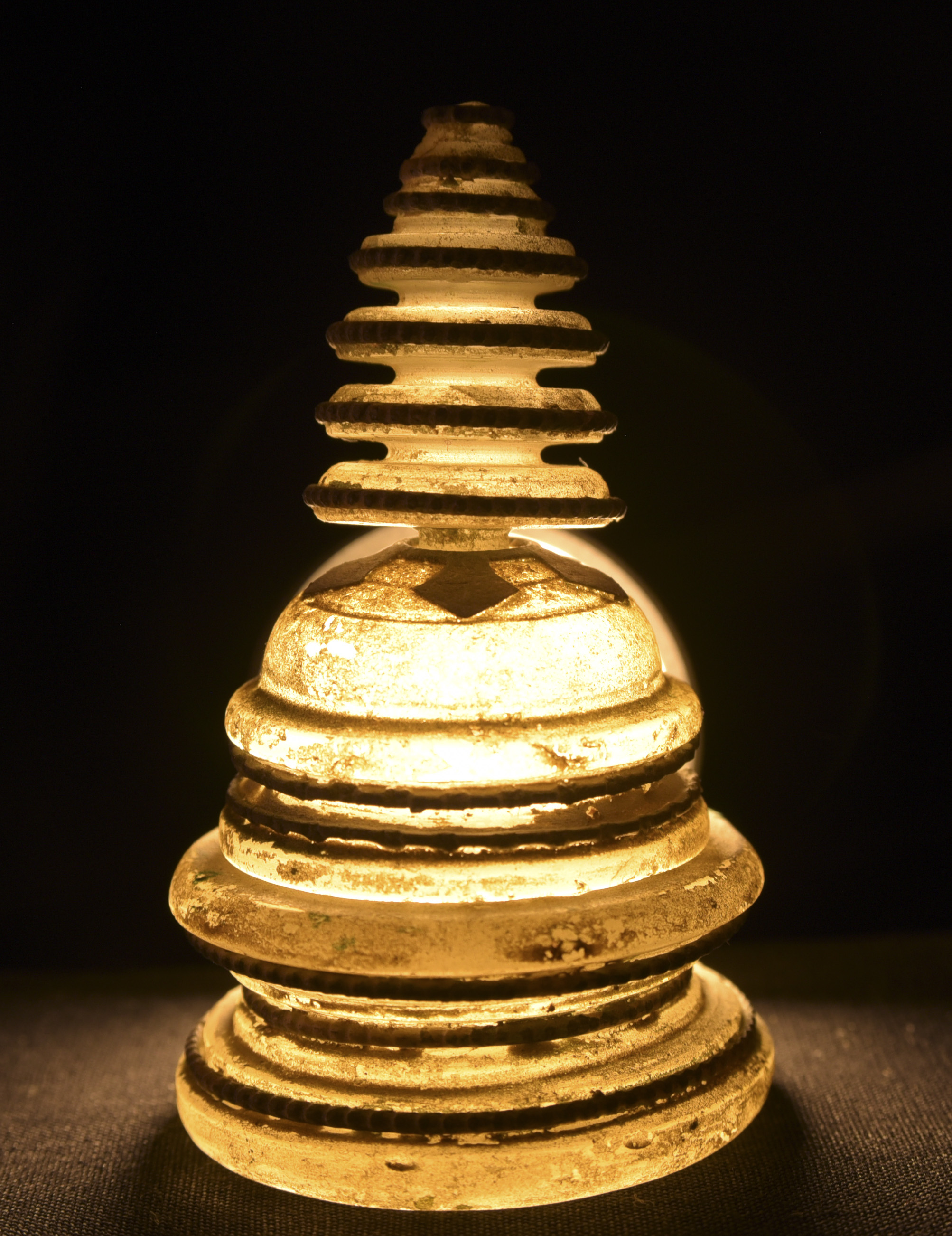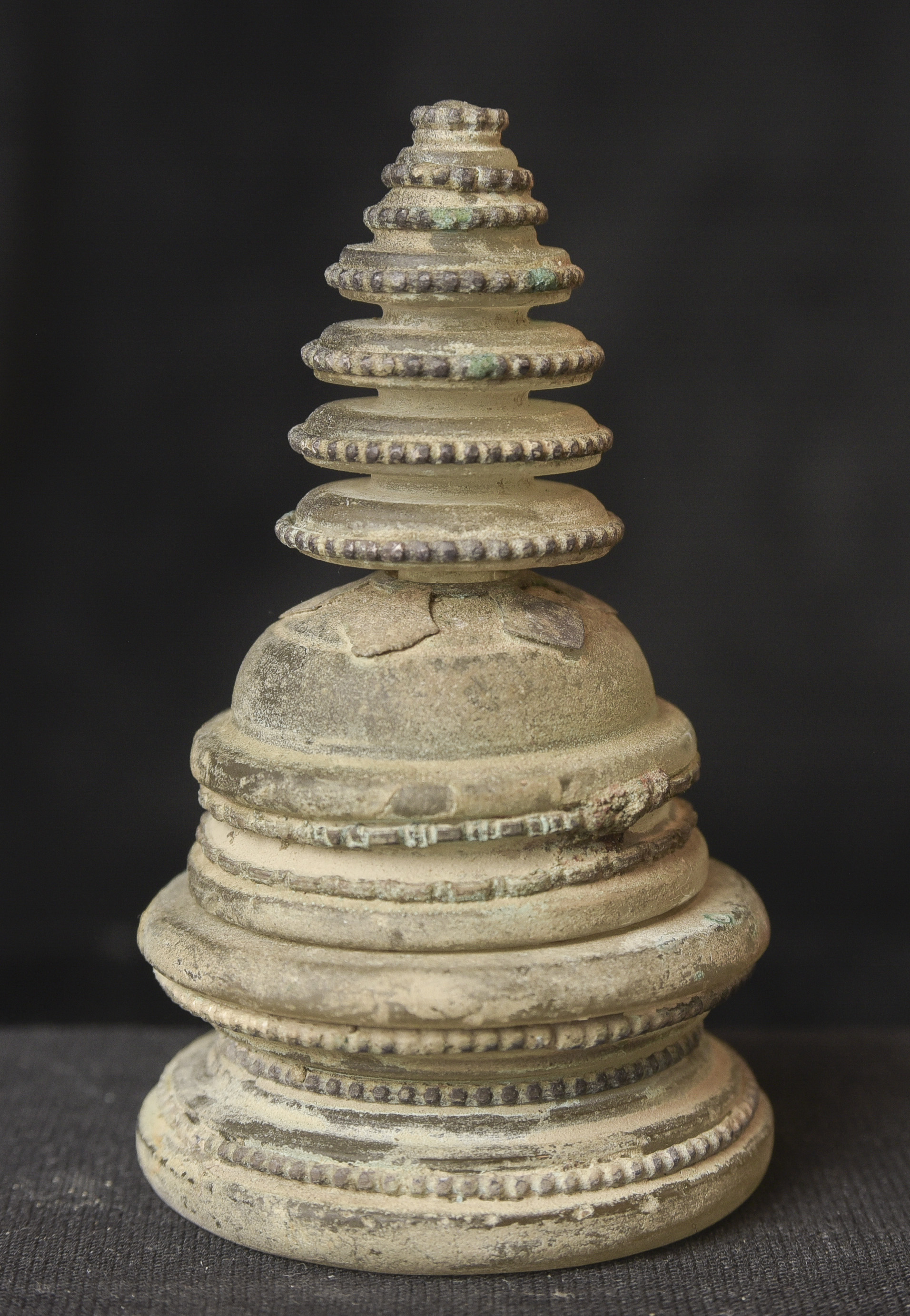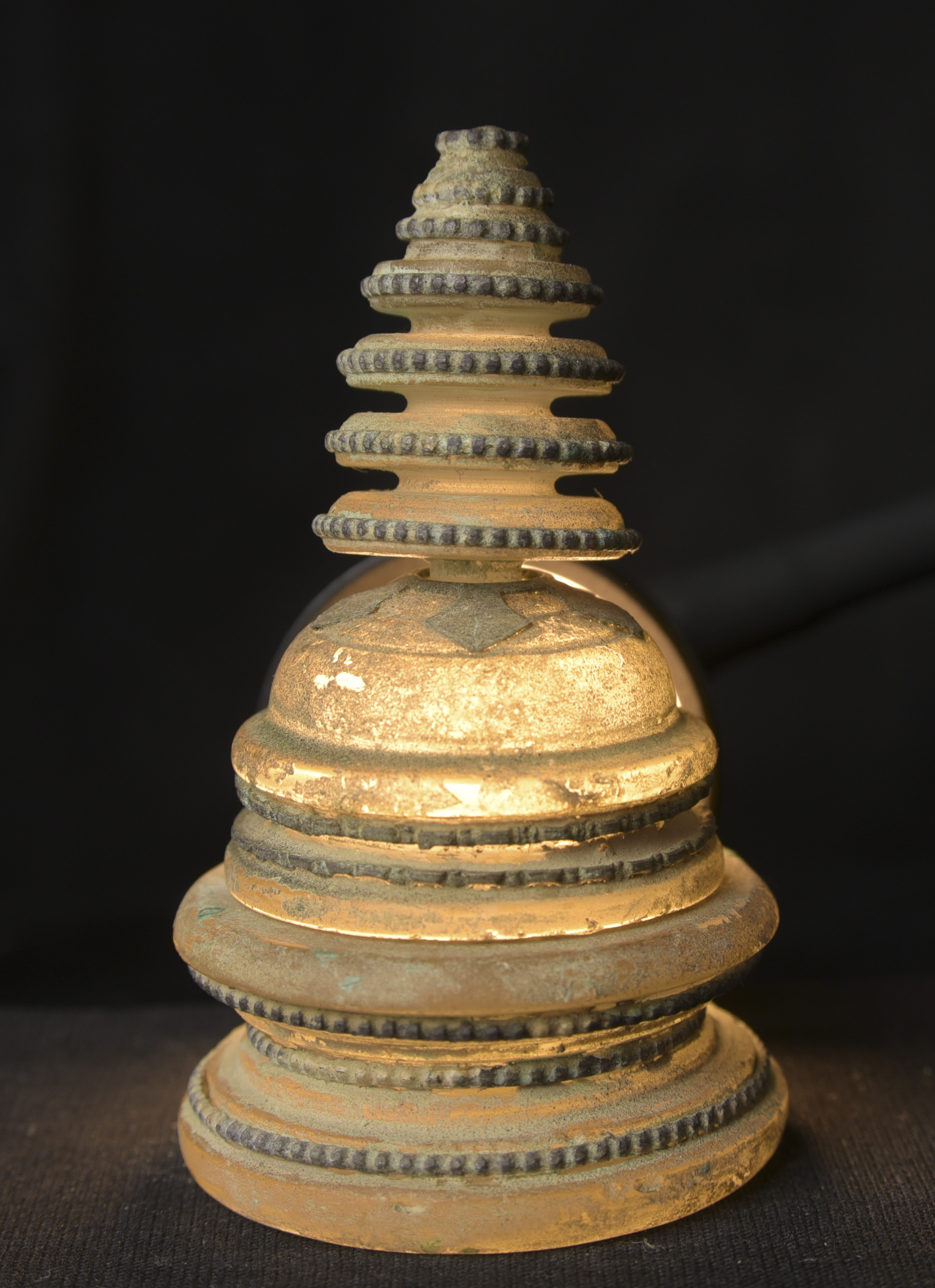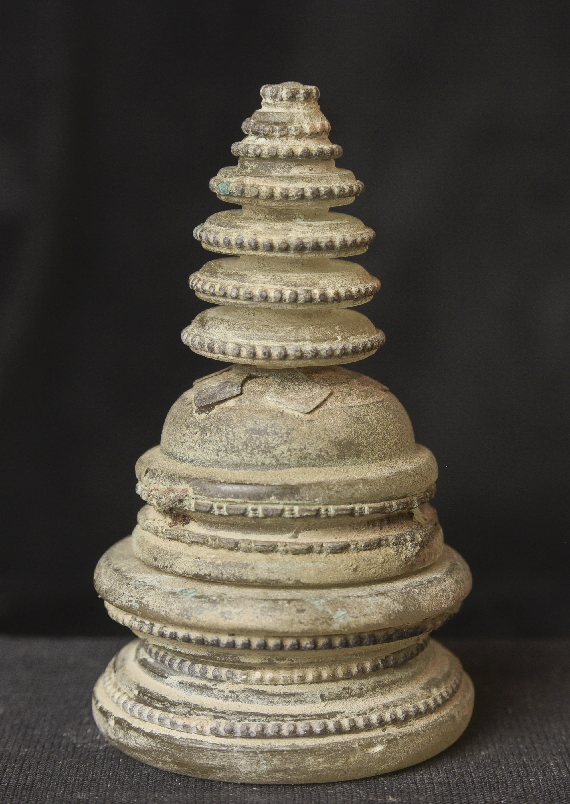 Bronze and ancient glass Buddhist Stupa, possibly Gandharan. The sections stack loosely together. I’ve never seen another of this type other than one group of eight of them that were reportedly found along with a group of bronze Stupas, most of which had ancient class in them, which looked related to most of the Stupas I will be posting in the near future. The quality on all of the pieces is very good. The tiny Buddhas on the others are well sculpted and the small animals on ones with animals are also all well-sculpted cast, and finished. Domestic Insurance included. International shipping will be an additional $25 ( 3"H x 1.75"W ) - 140g.
