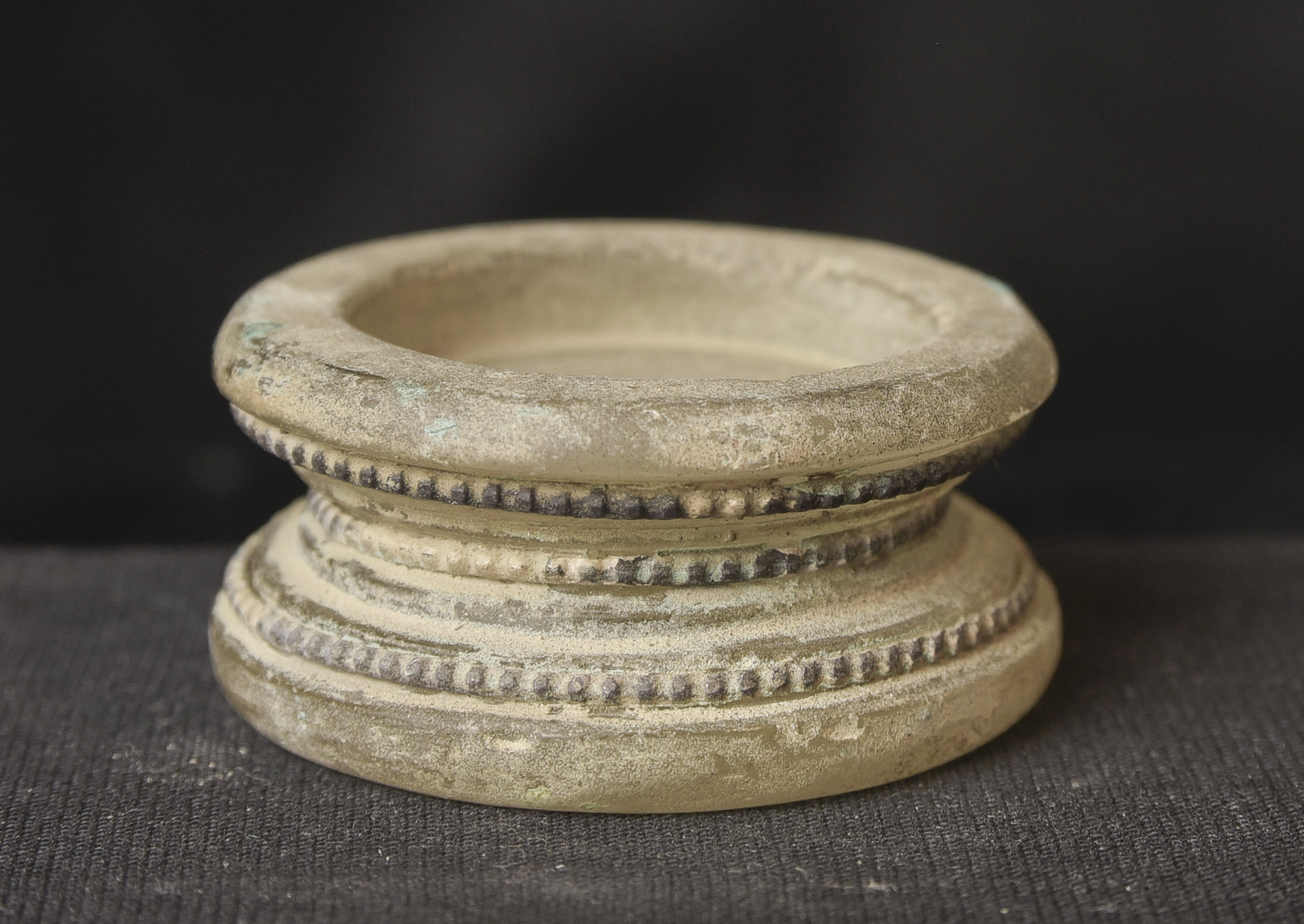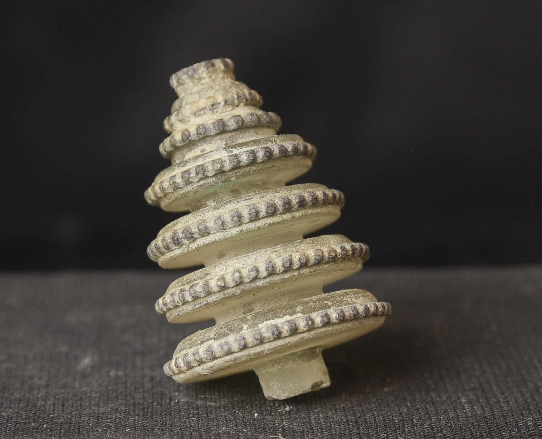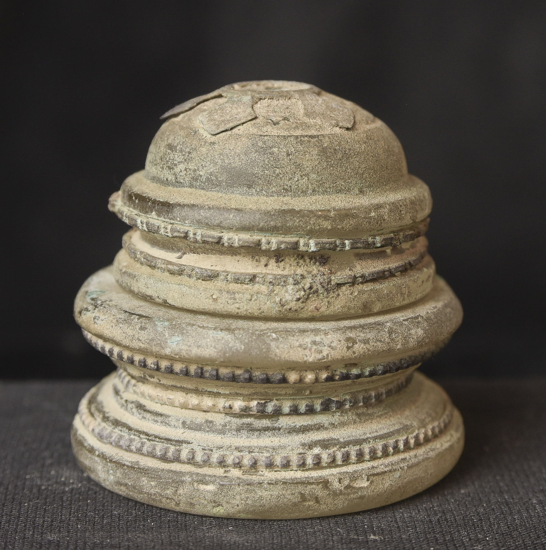 Bronze and ancient glass Buddhist Stupa, possibly Gandharan. The sections stack loosely together. I’ve never seen another of this type other than one group of eight of them that were reportedly found along with a group of bronze Stupas, most of which had ancient class in them, which looked related to most of the Stupas I will be posting in the near future. The quality on all of the pieces is very good. The tiny Buddhas on the others are well sculpted and the small animals on ones with animals are also all well-sculpted cast, and finished. Domestic Insurance included. International shipping will be an additional $25 ( 3"H x 1.75"W ) - 140g.