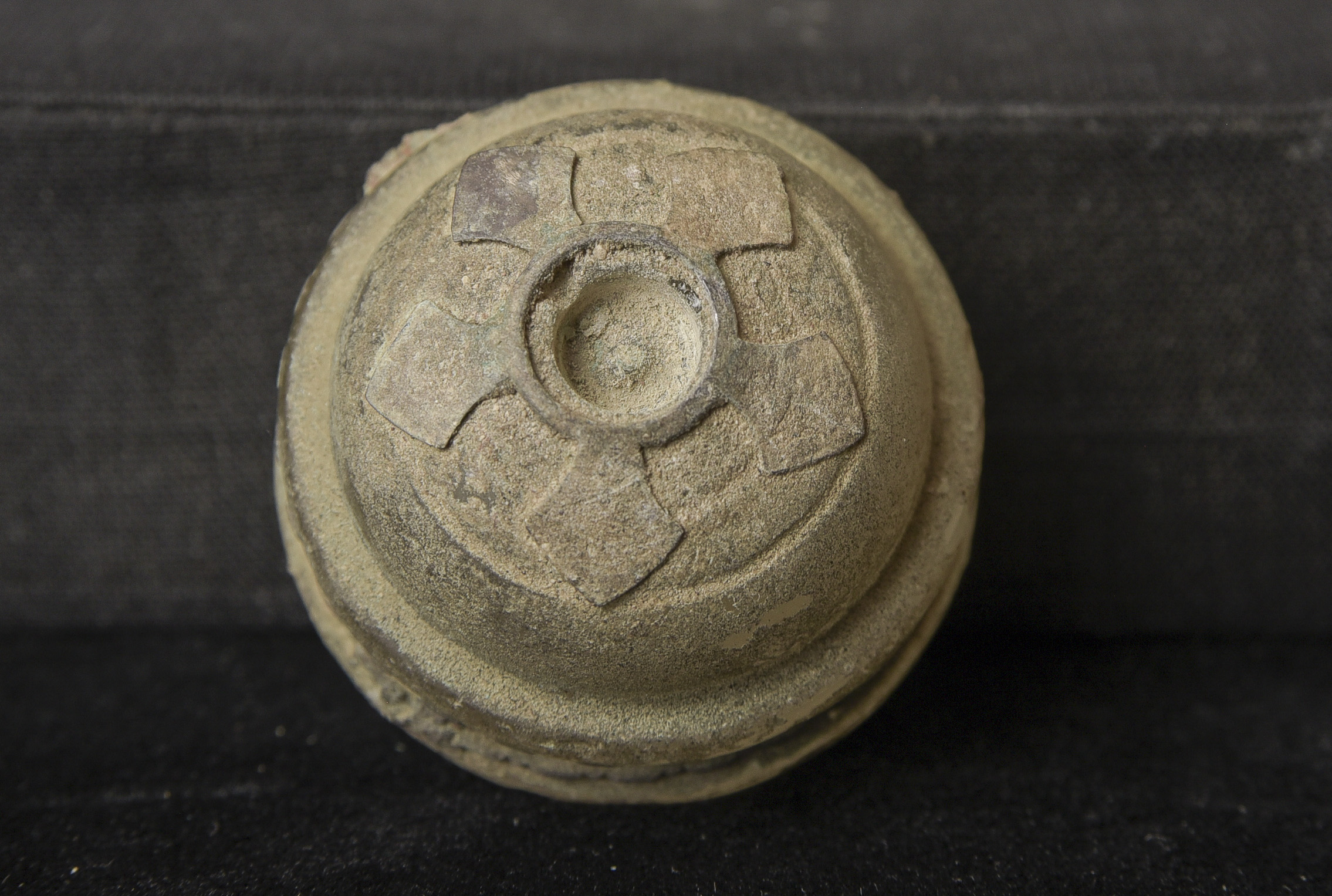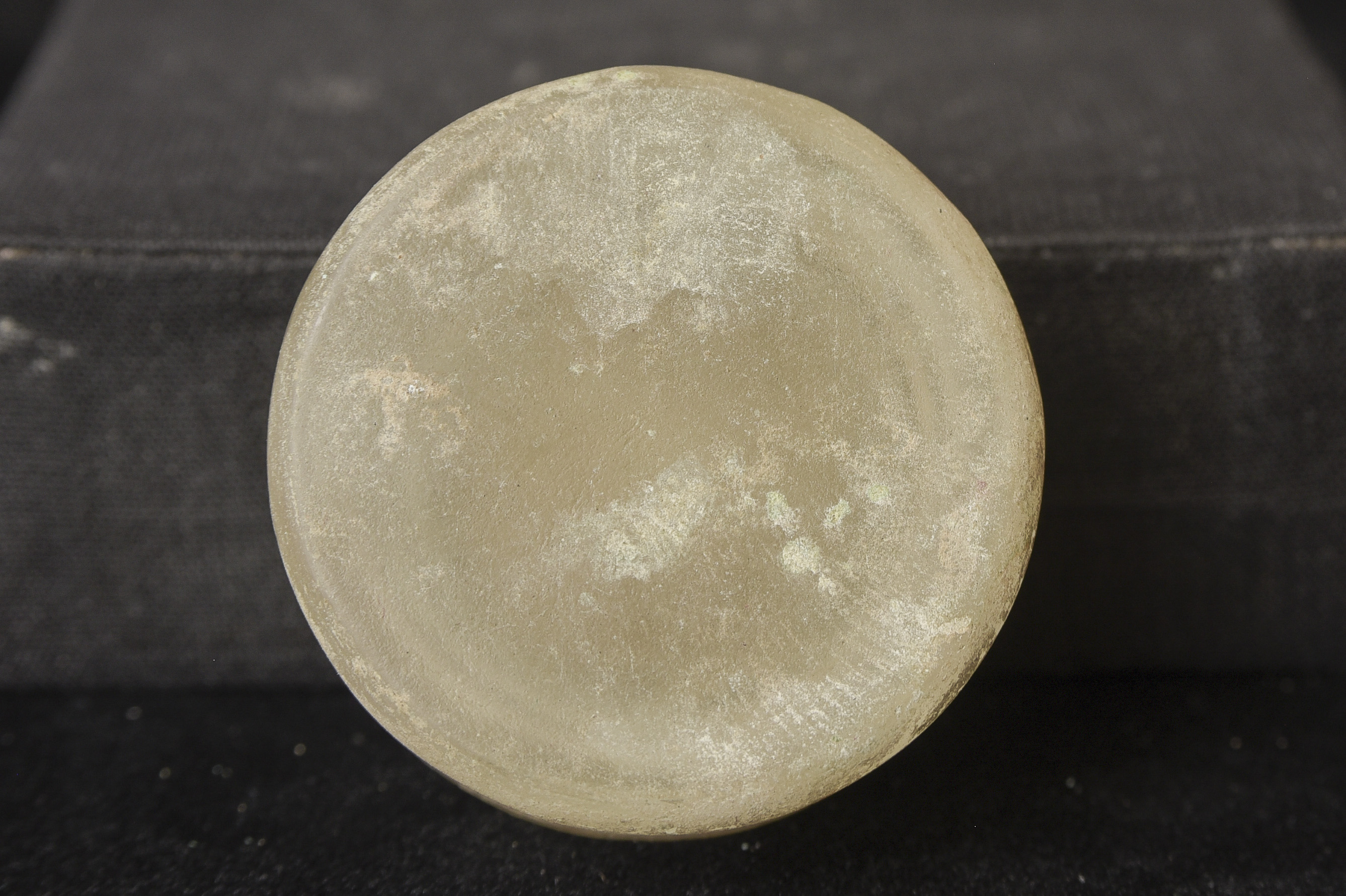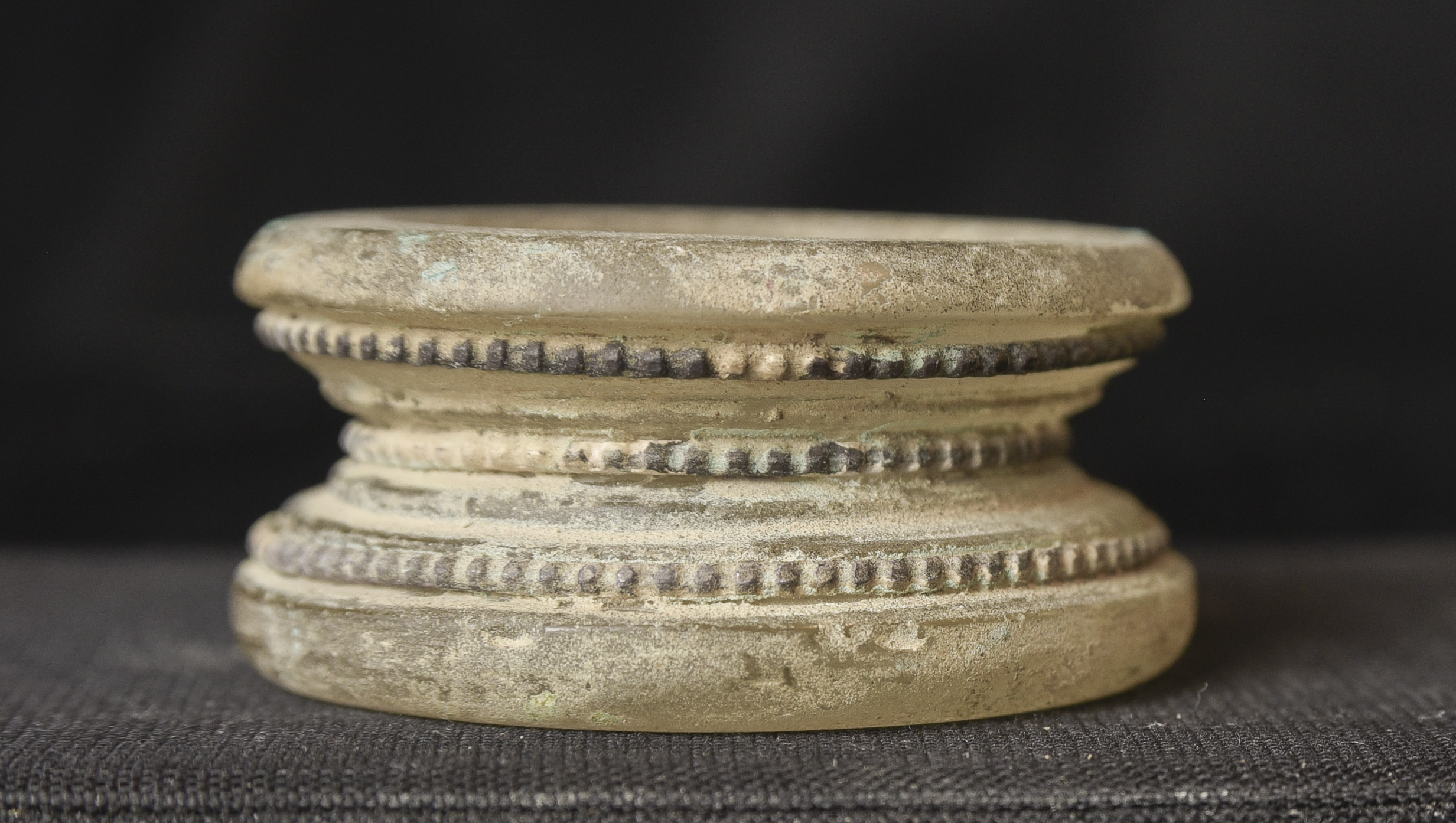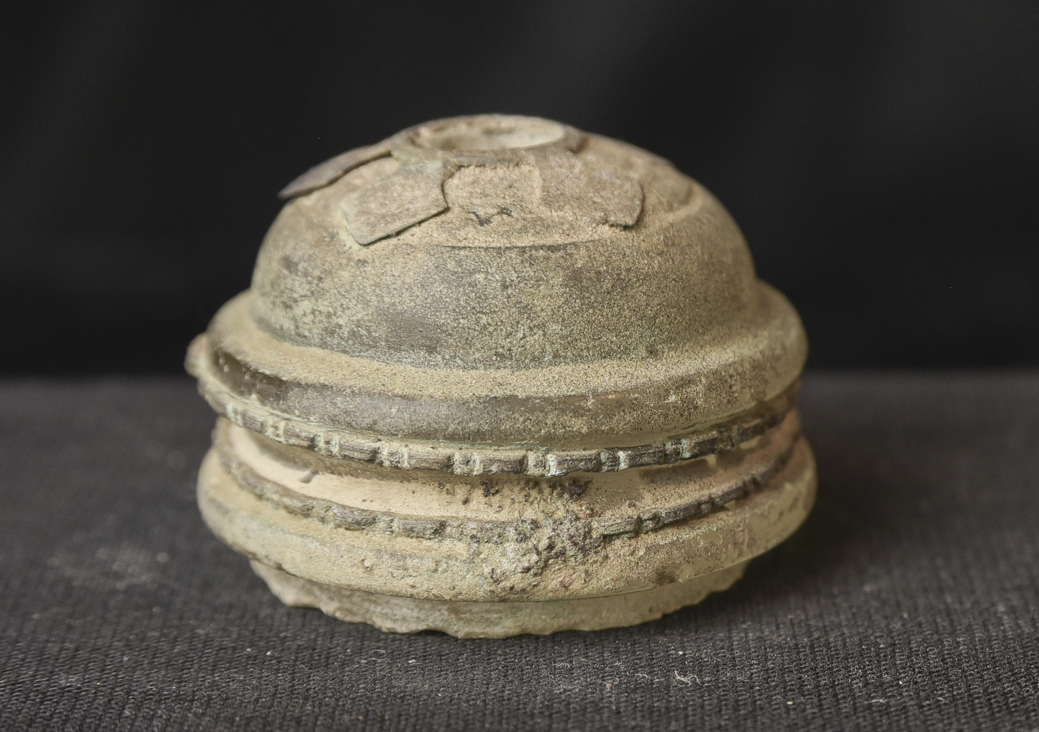Bronze and ancient glass Buddhist Stupa, possibly Gandharan. The sections stack loosely together. I’ve never seen another of this type other than one group of eight of them that were reportedly found along with a group of bronze Stupas, most of which had ancient class in them, which looked related to most of the Stupas I will be posting in the near future. The quality on all of the pieces is very good. The tiny Buddhas on the others are well sculpted and the small animals on ones with animals are also all well-sculpted cast, and finished. Domestic Insurance included. International shipping will be an additional $25 ( 3"H x 1.75"W ) - 140g.