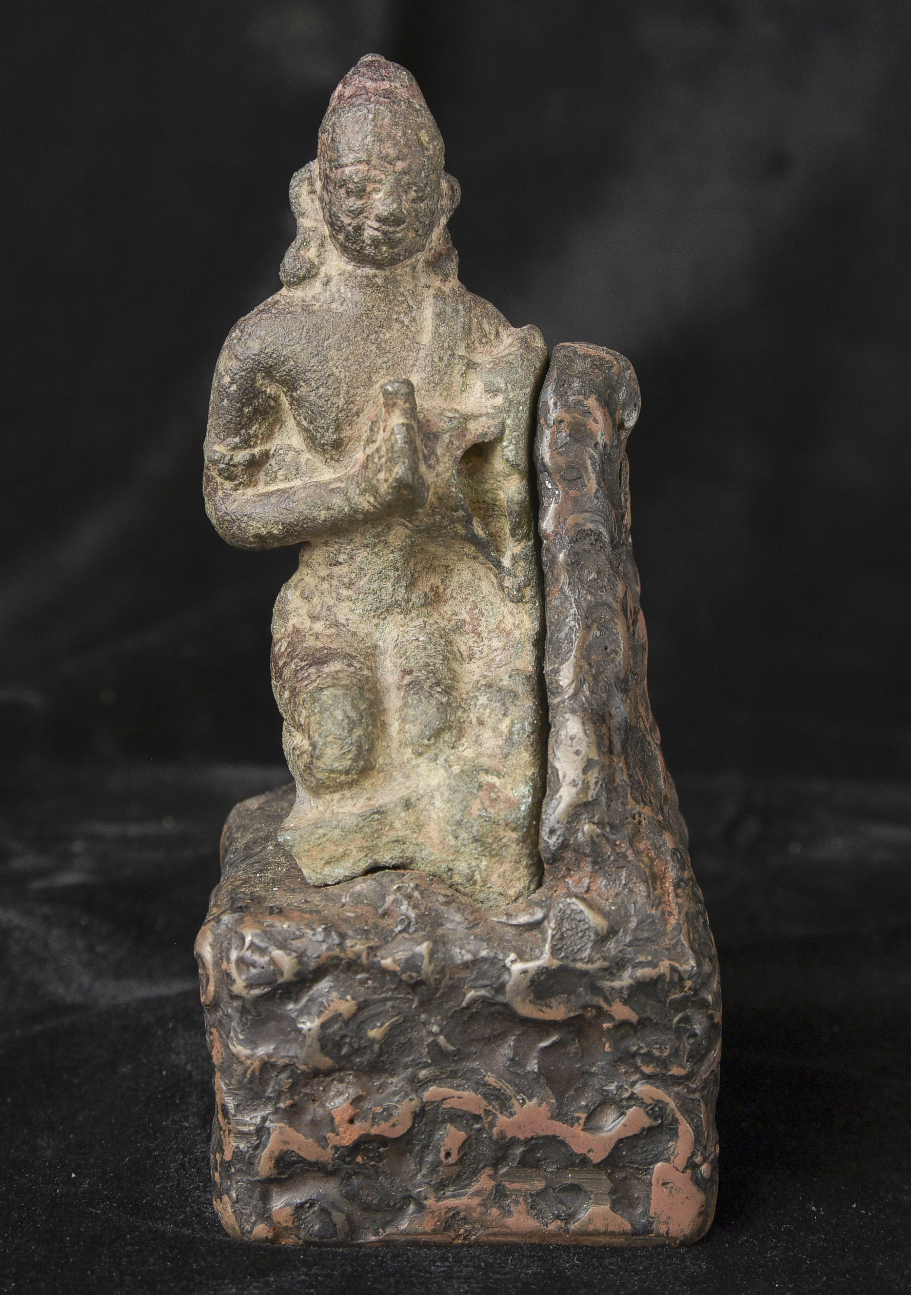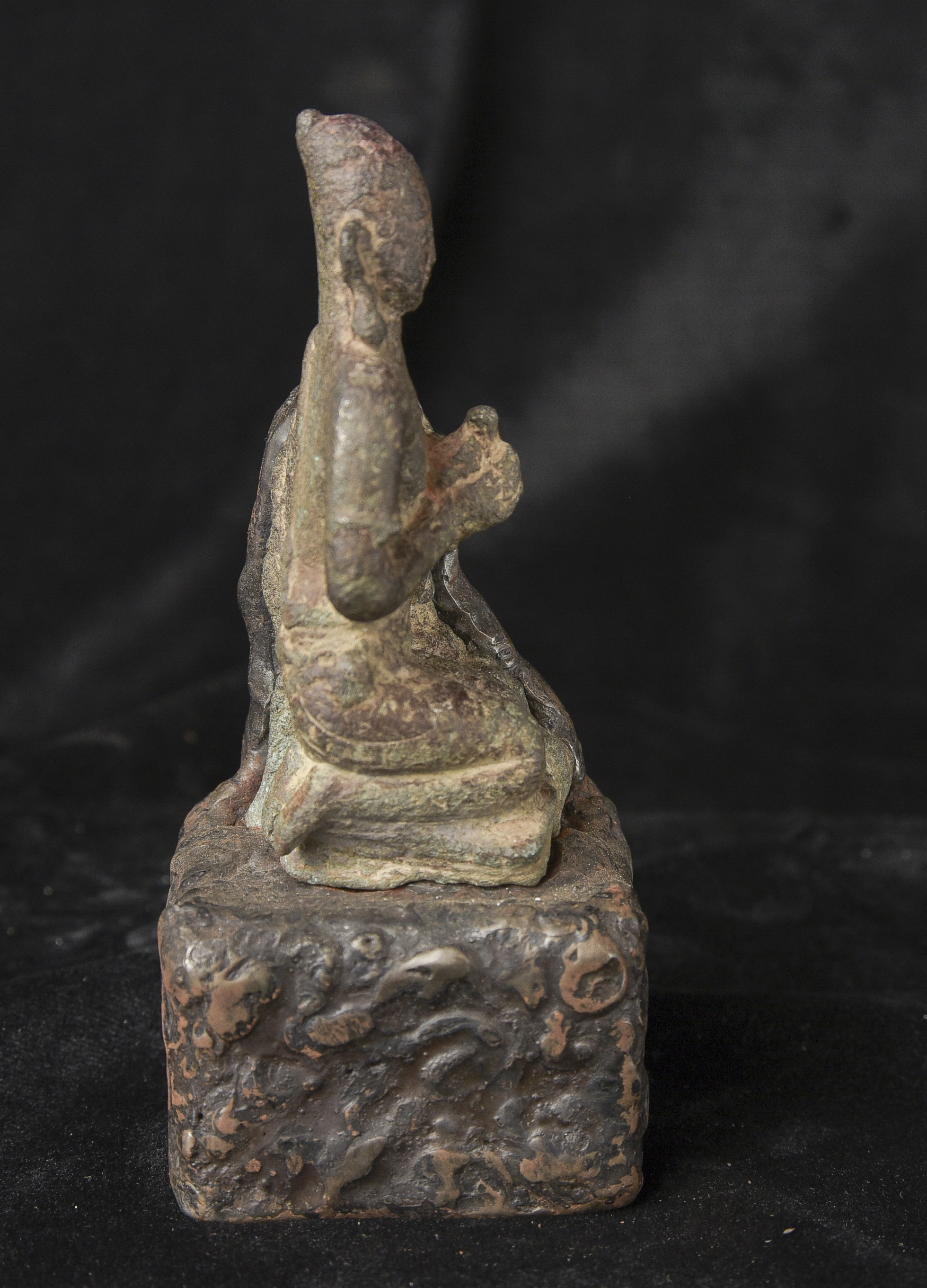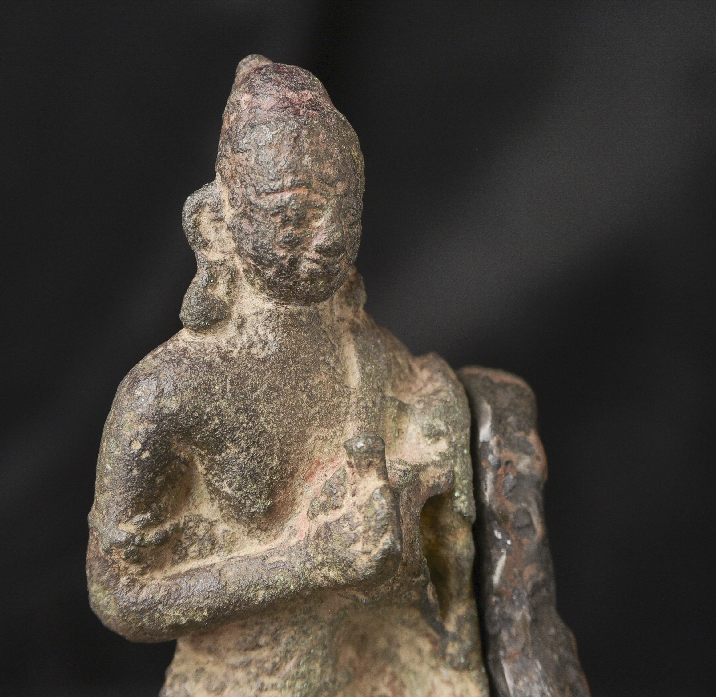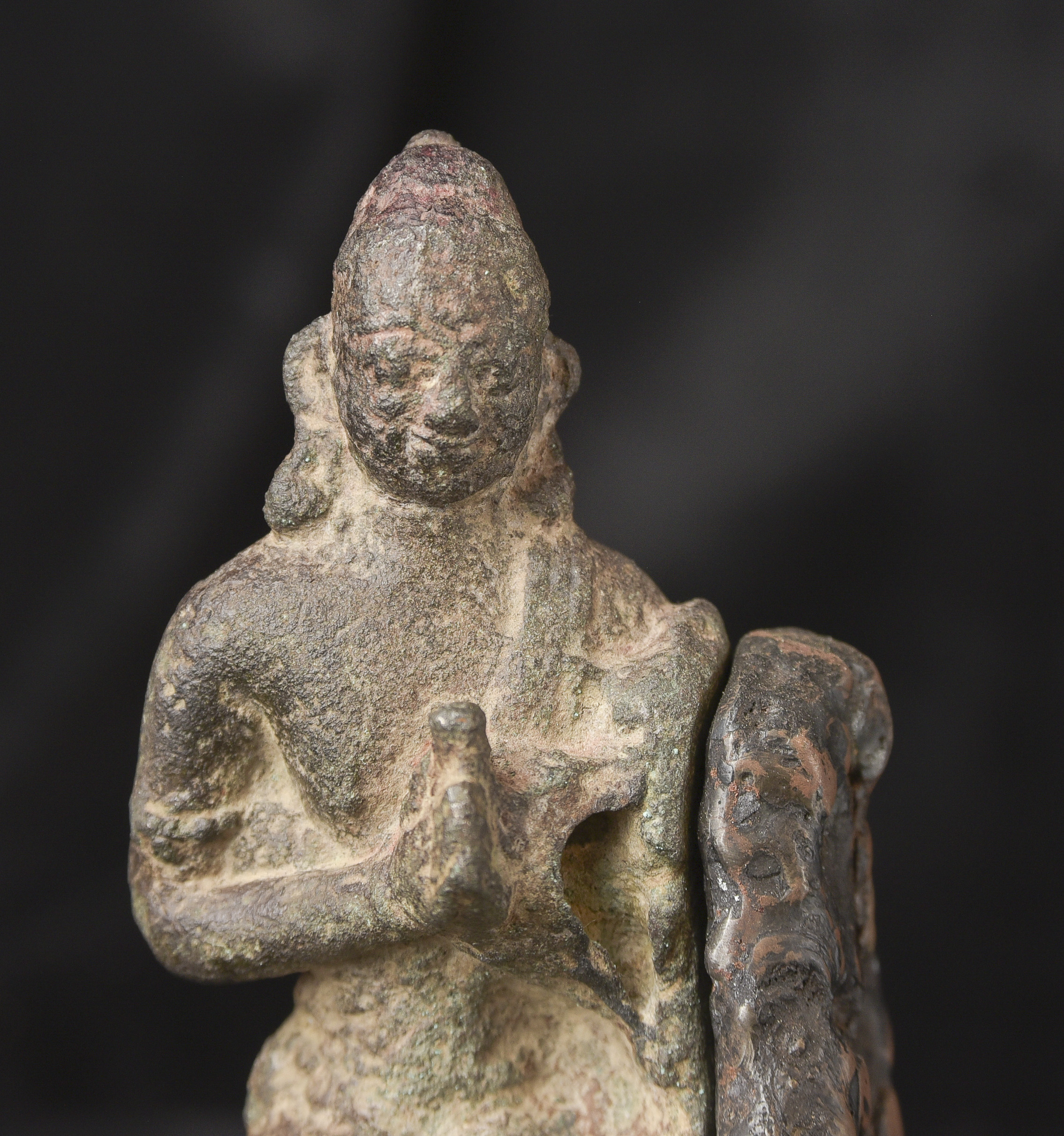 9-11thC Pala Era, but from Bangladesh. The previous owner purchased it in Bangladesh in the 1970s while working with an international non-profit. I had the base custom-made by a well-regarded metal sculptor, specifically for this piece in the 1990s to complement the shape and patina. I've never seen another like it, though it is similar in many ways to the Northern Indian and Early Southern Himalayan Sculpture of the same period. The great face has the radiance found in the great bronzes of this period. It's a true collector's piece and extremely rare. ( 5.25"H x 2.25"W x 2.25"D ) - 2lbs.