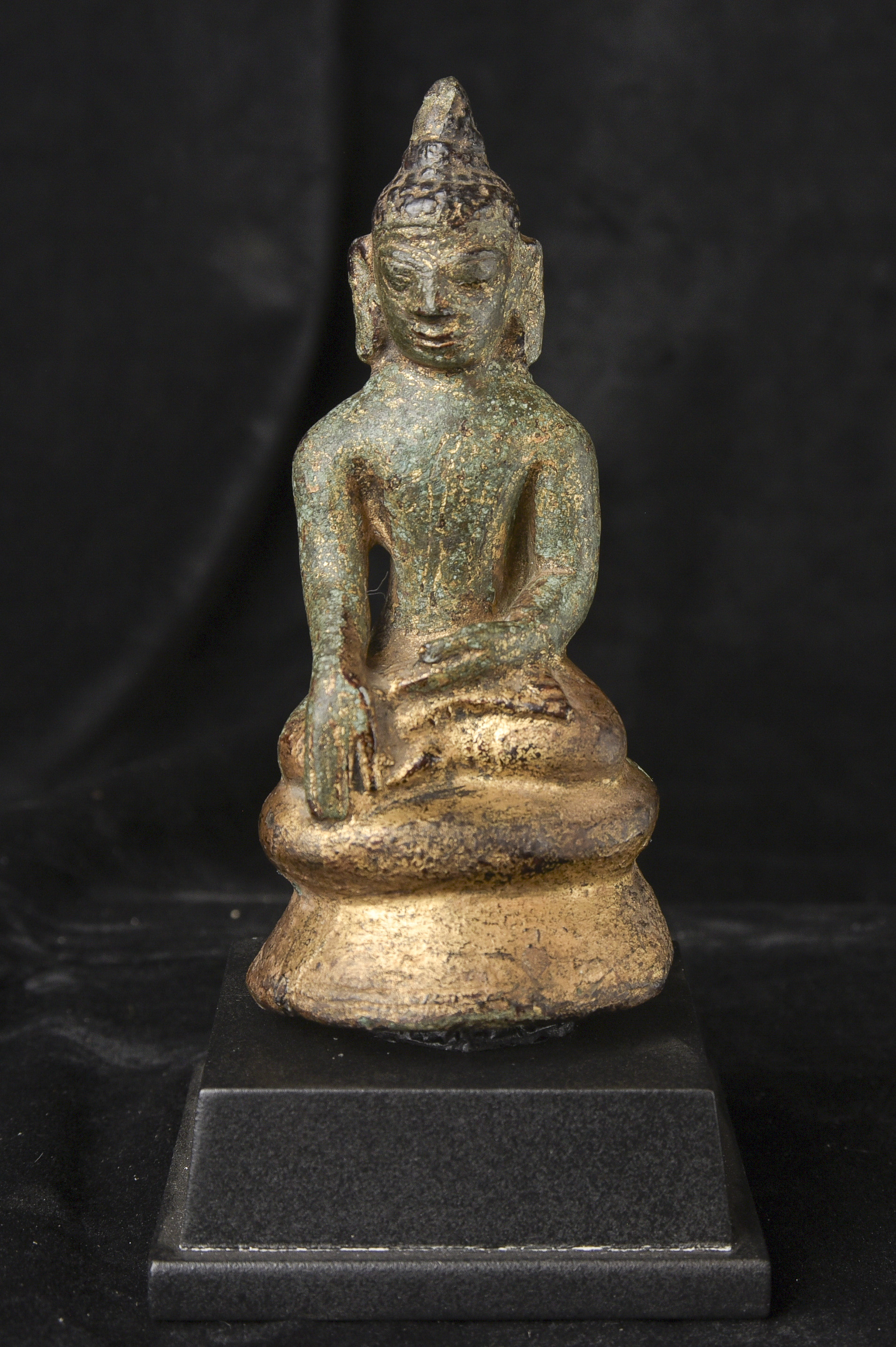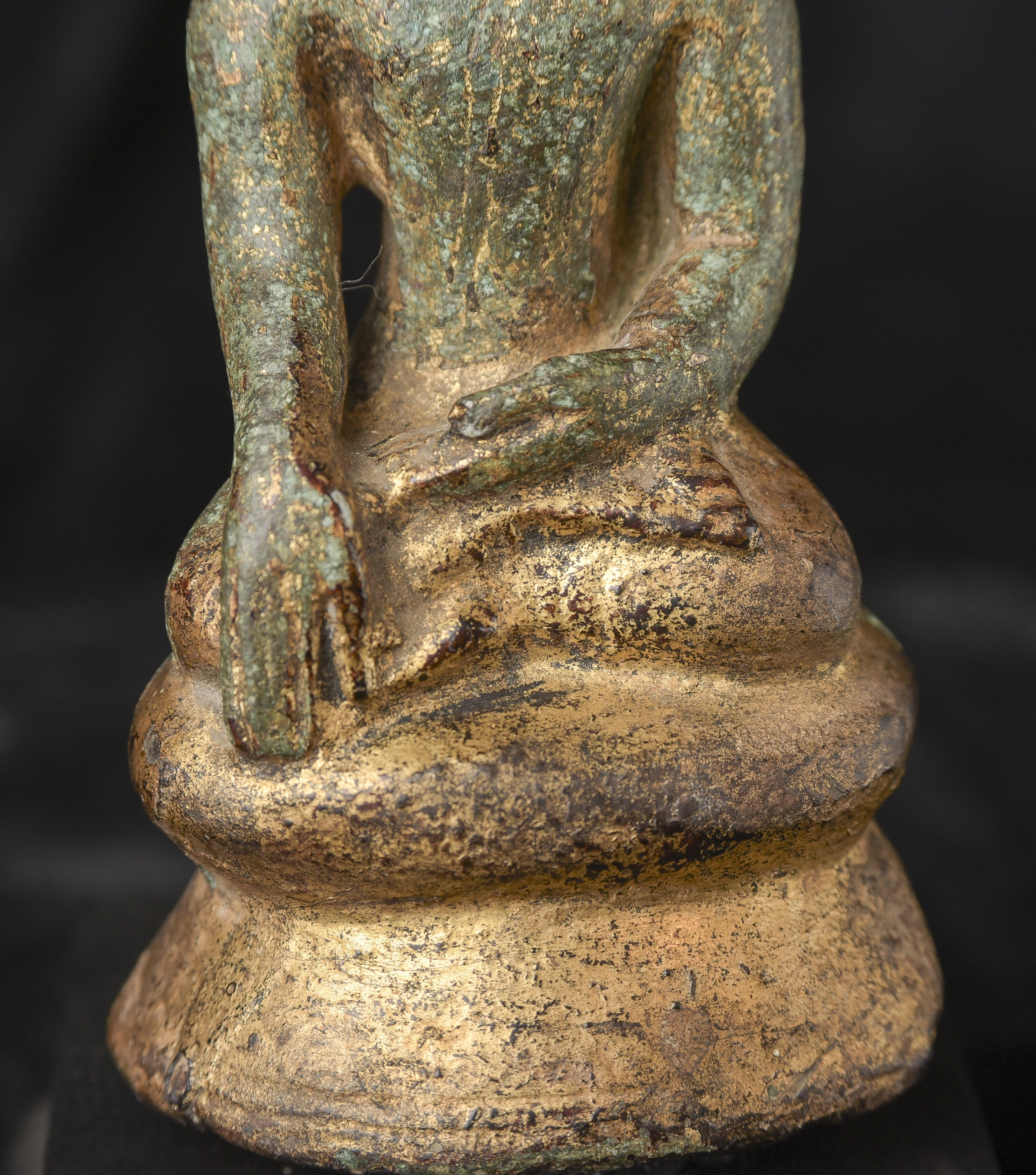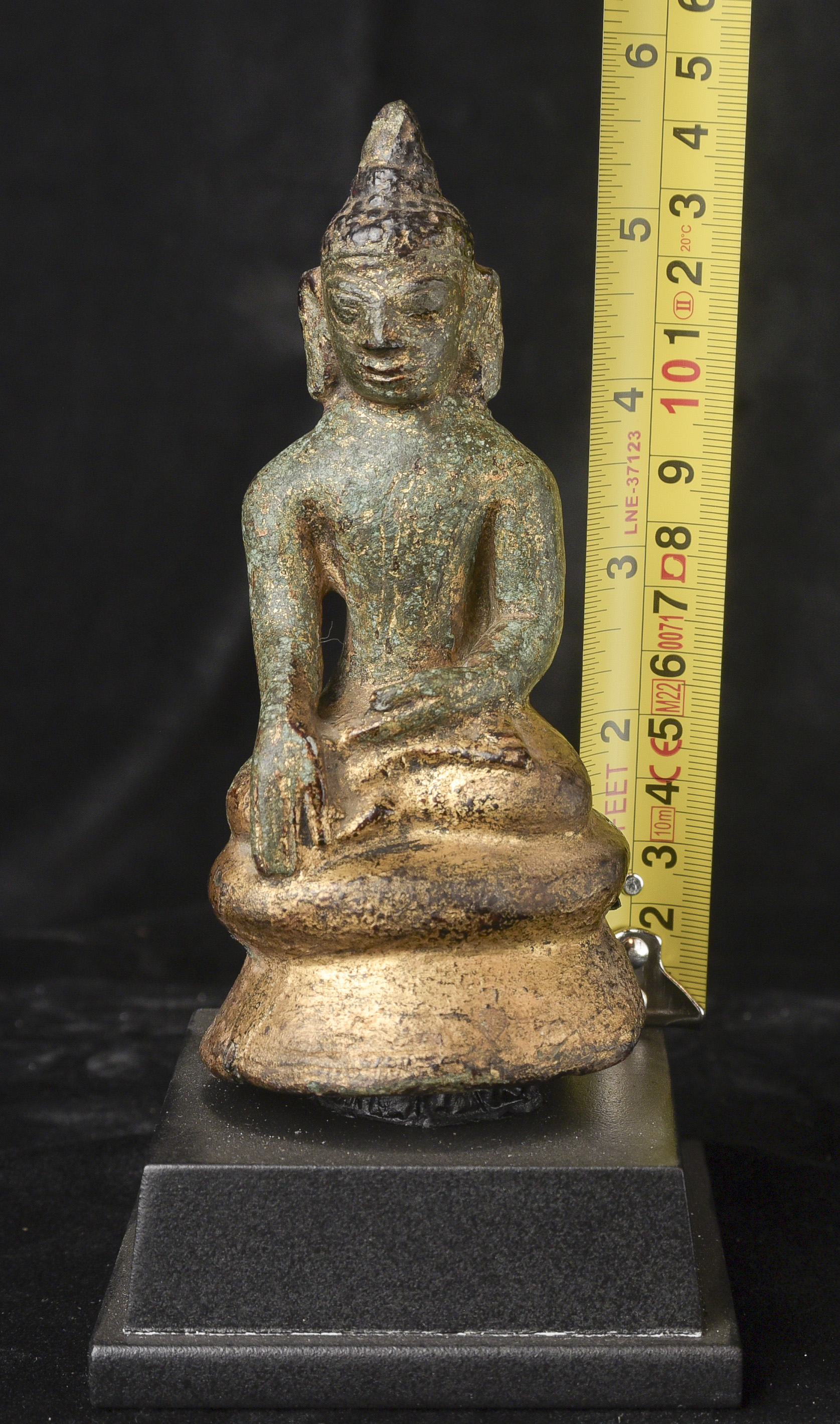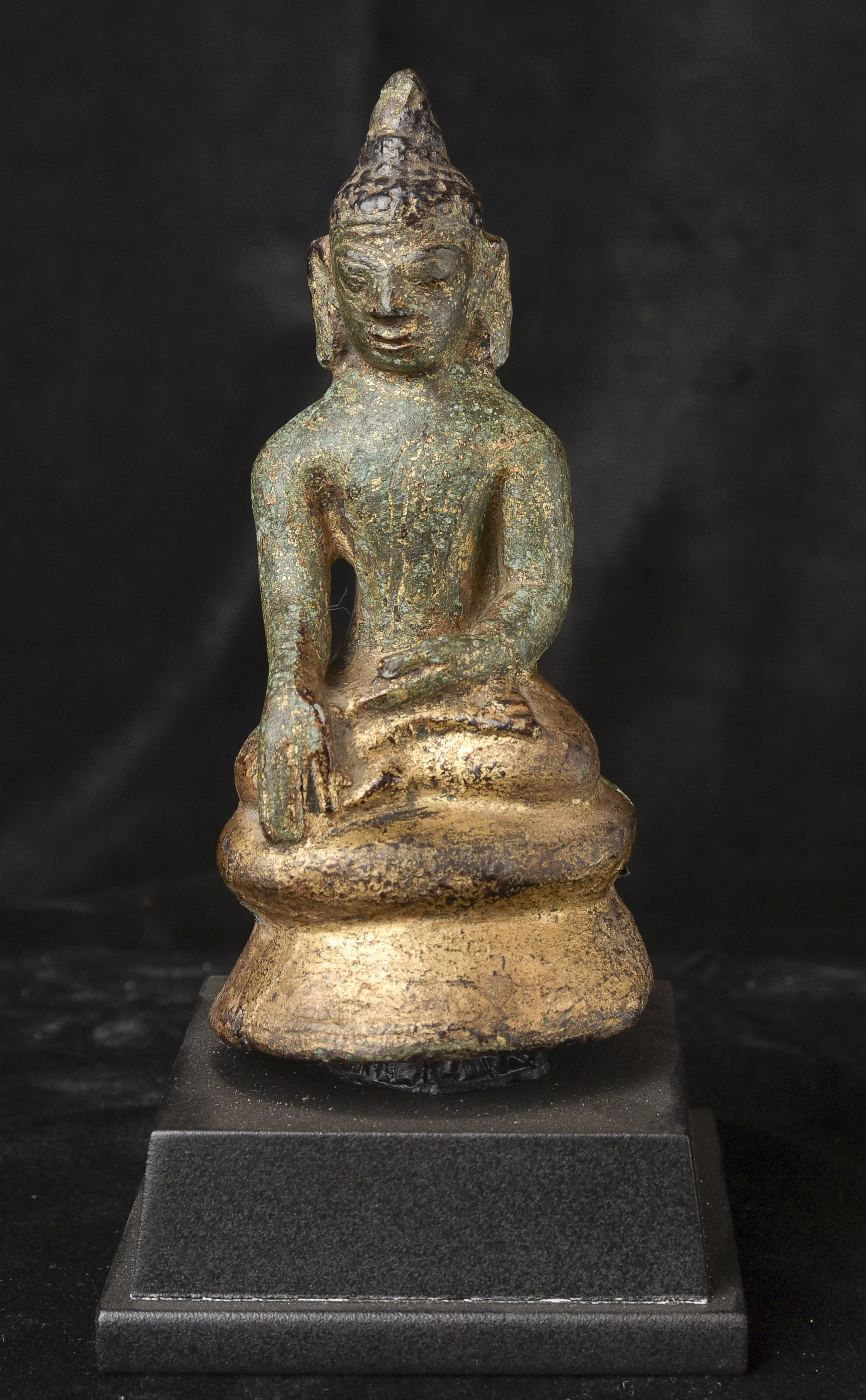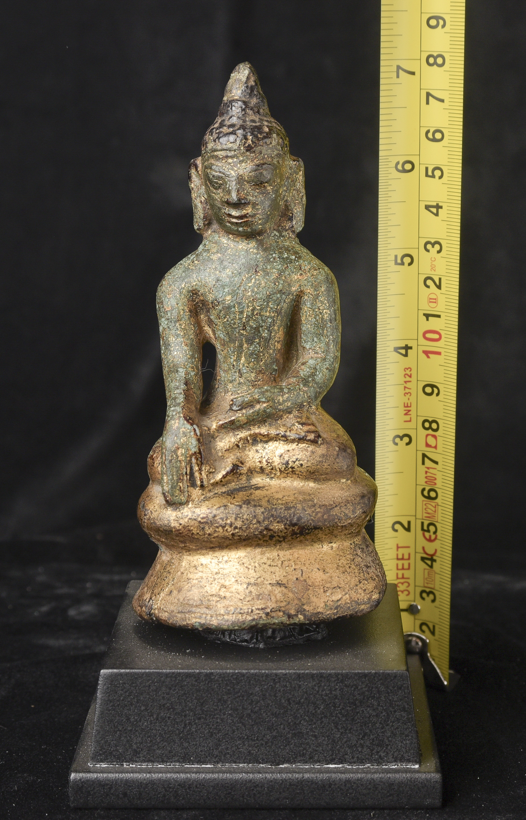 Extremely beautiful 14/15thC Mon style Burmese Buddha. Retains echoes of the Pagan period of a few centuries earlier. Remarkable jade green patina showing through the rich gilding is as beautiful as any you will ever see. Domestic shipping is included, and international shipping is $50, including packing and insurance to anywhere in the world. ( 5.5"H x 2.5"W x 2.5"D ) - 1lbs. Base: ( 1.25"H x 3.5"W ) - 1.42lbs.