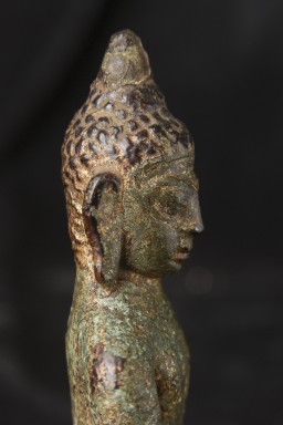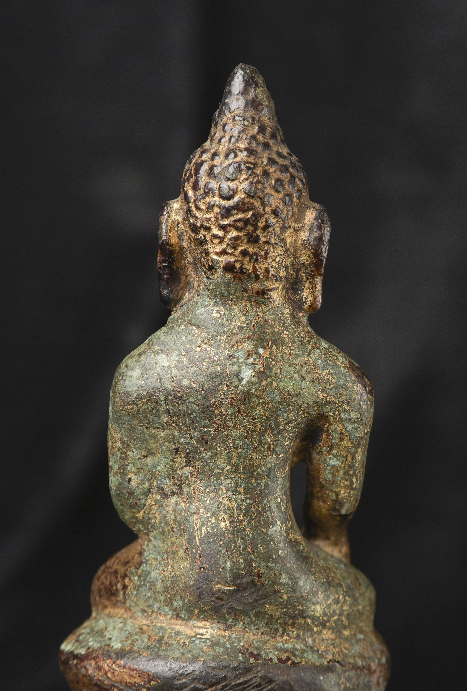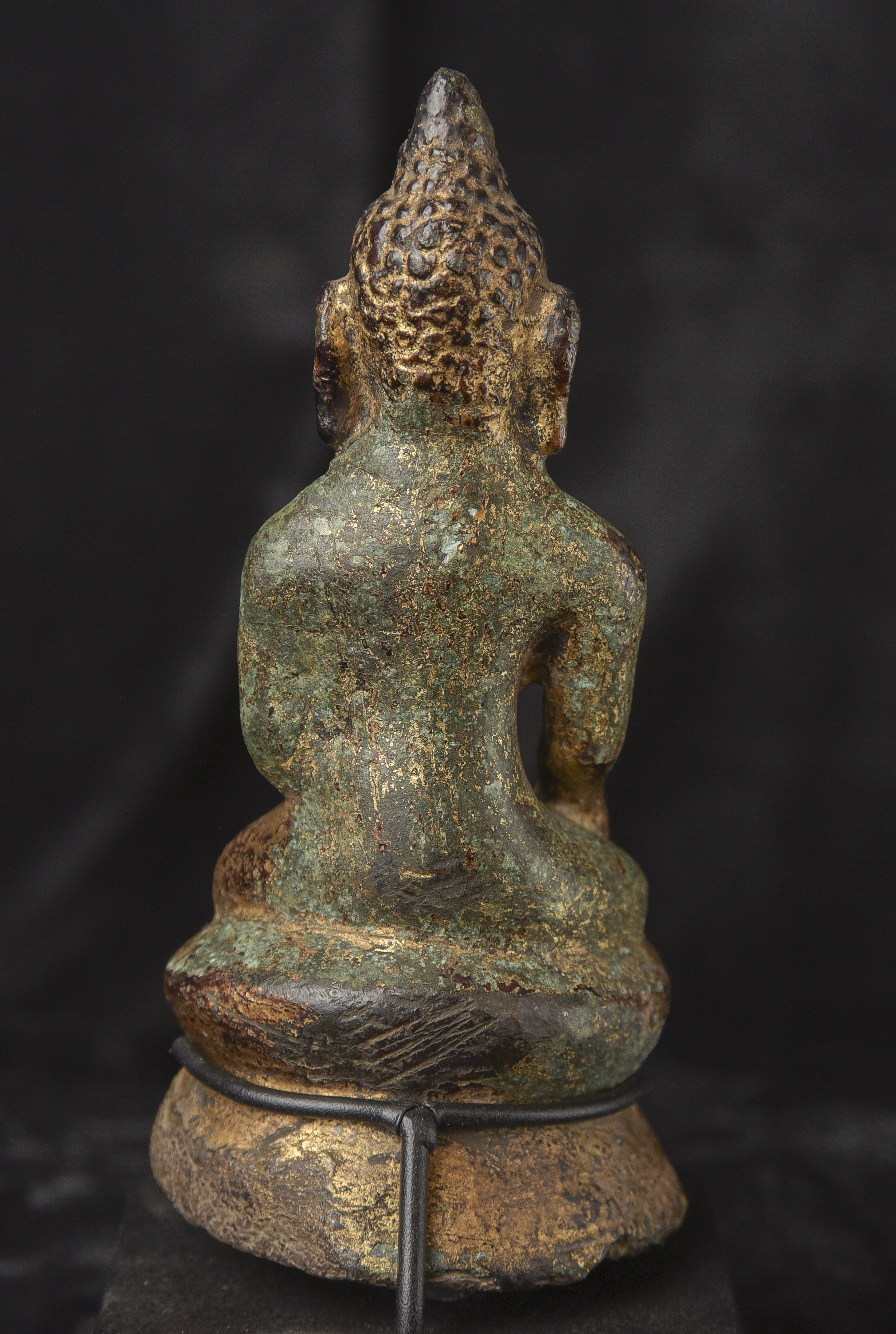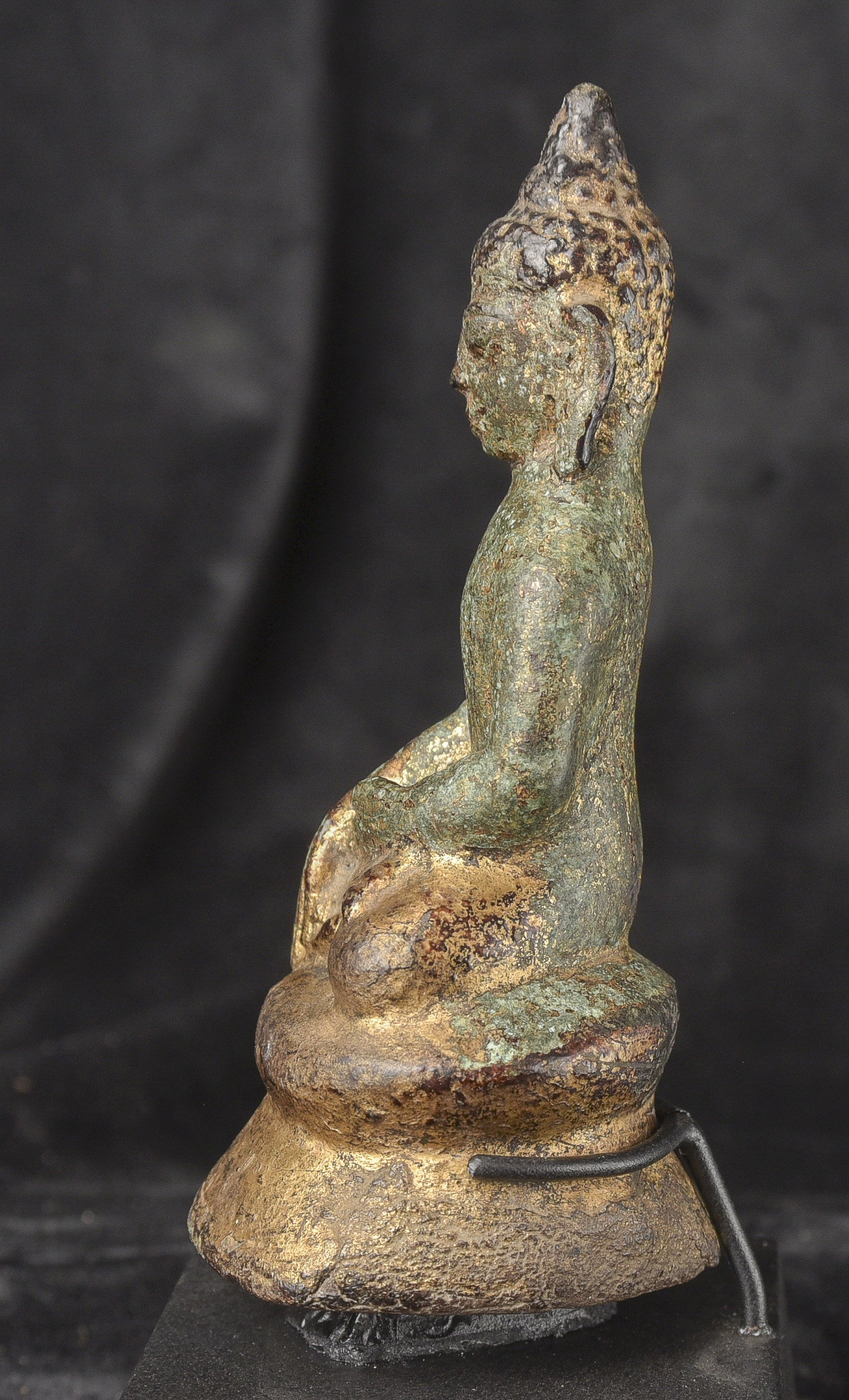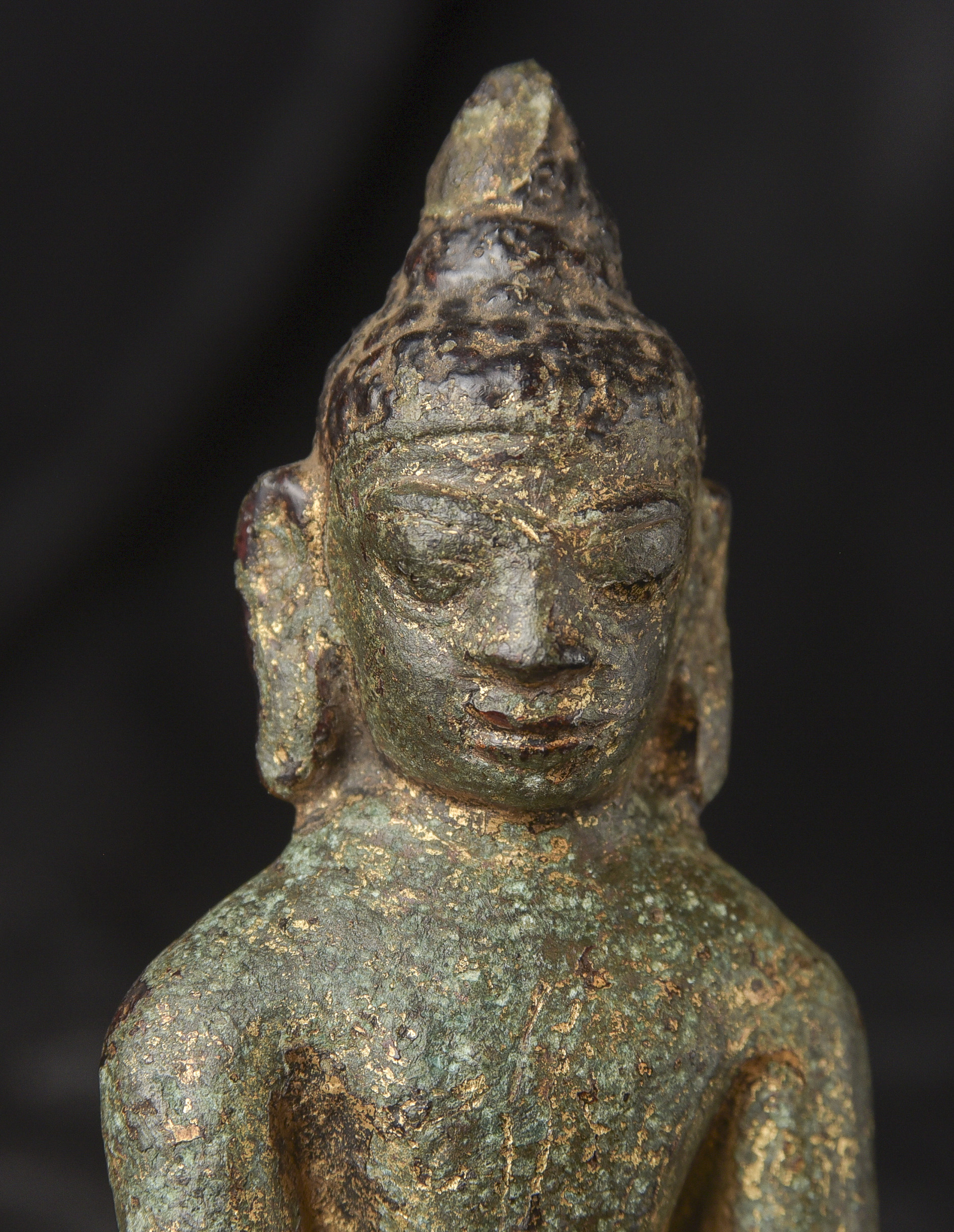 Extremely beautiful 14/15thC Mon style Burmese Buddha. Retains echoes of the Pagan period of a few centuries earlier. Remarkable jade green patina showing through the rich gilding is as beautiful as any you will ever see. Domestic shipping is included, and international shipping is $50, including packing and insurance to anywhere in the world. ( 5.5"H x 2.5"W x 2.5"D ) - 1lbs. Base: ( 1.25"H x 3.5"W ) - 1.42lbs.