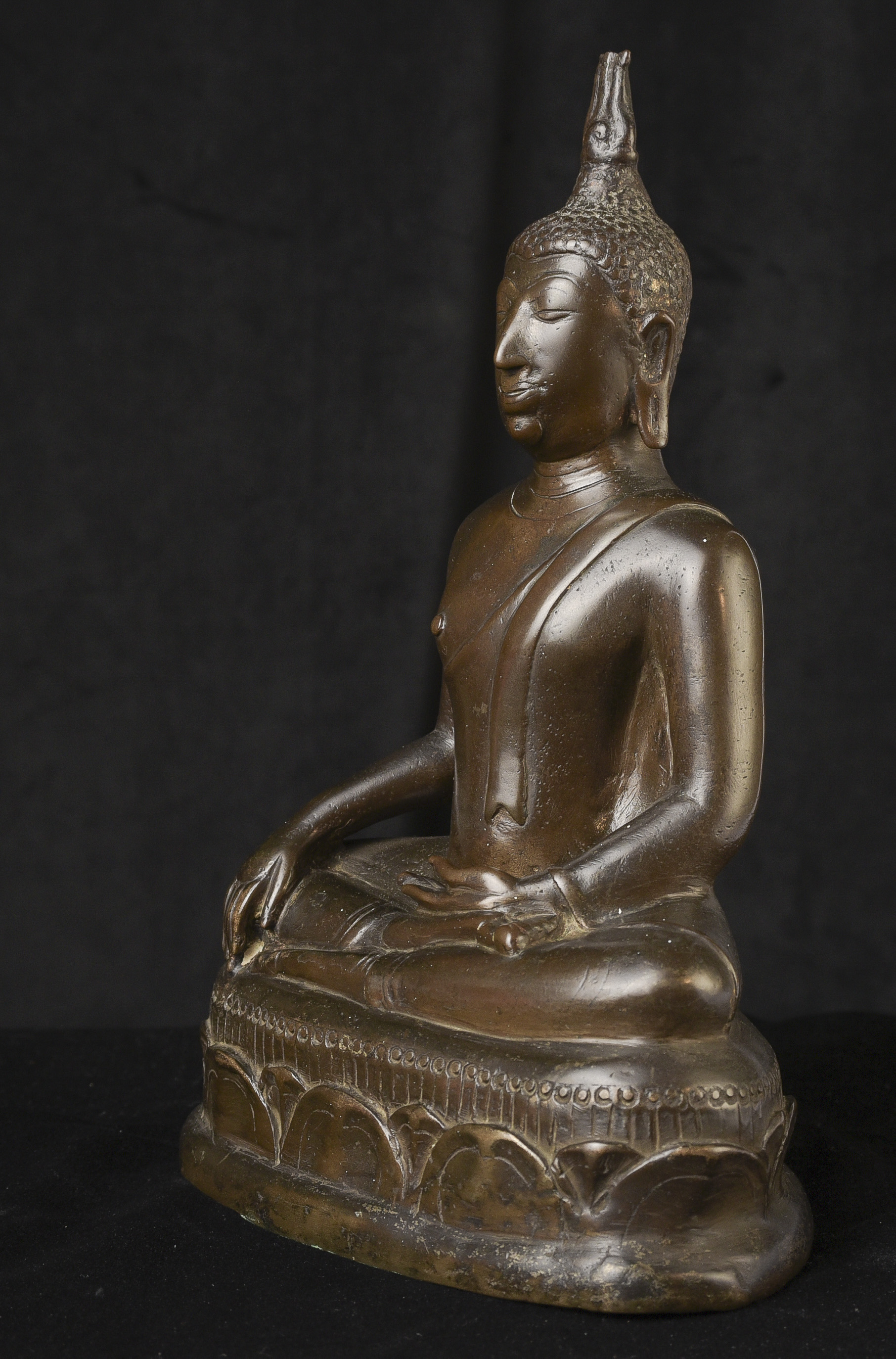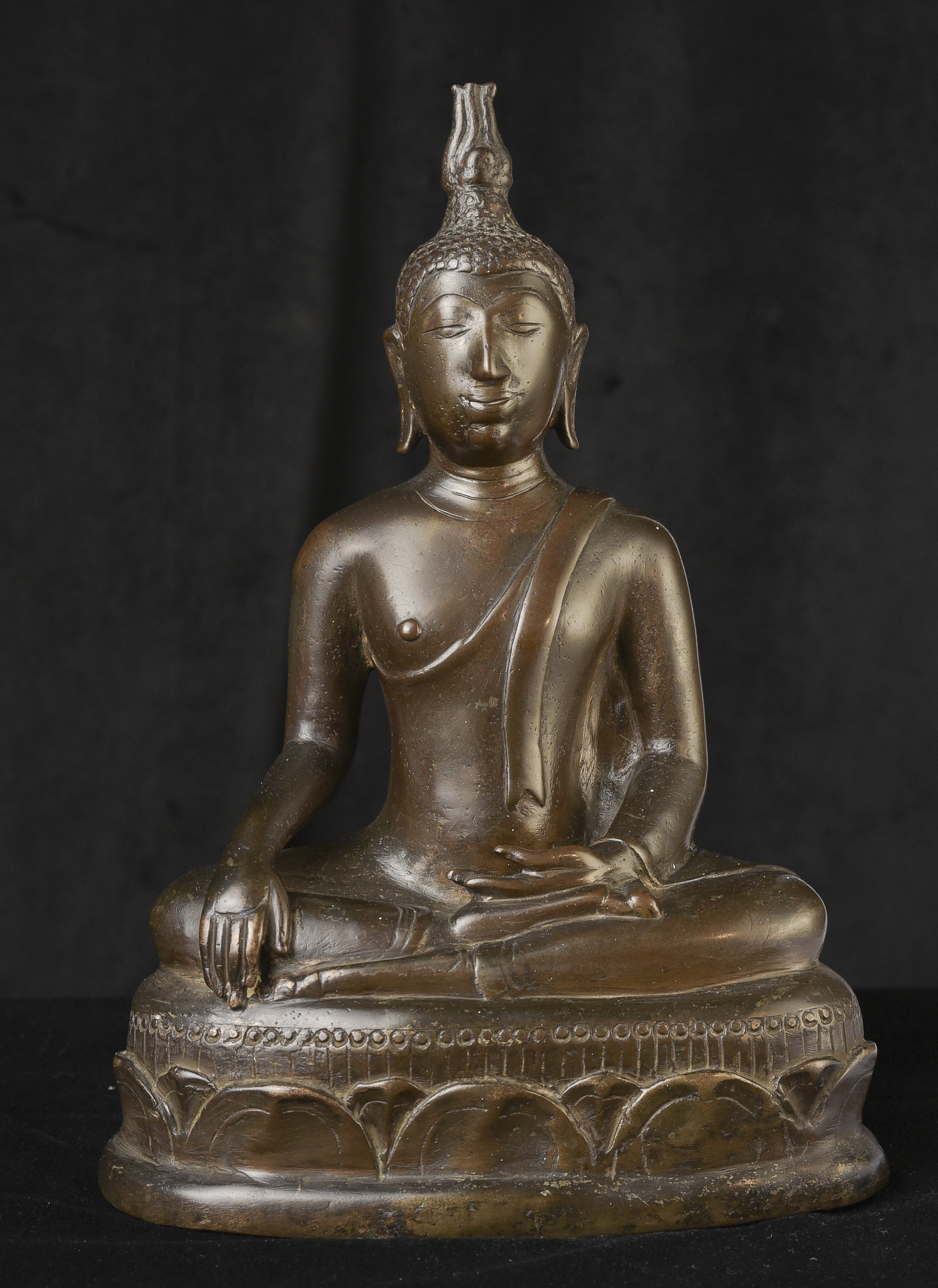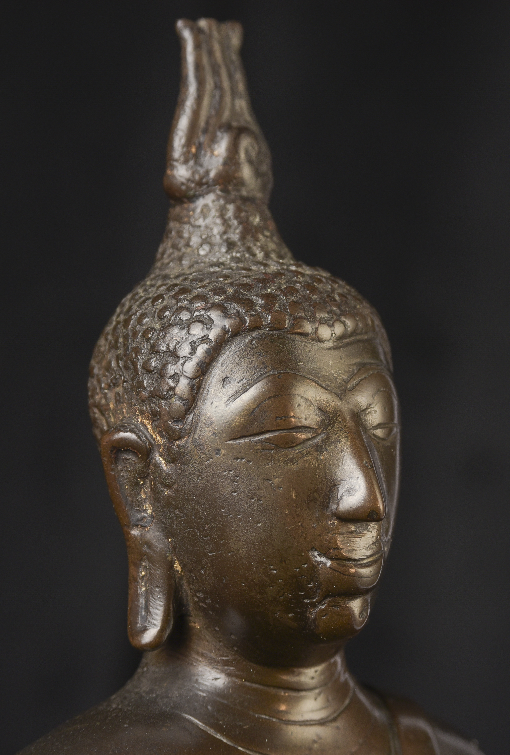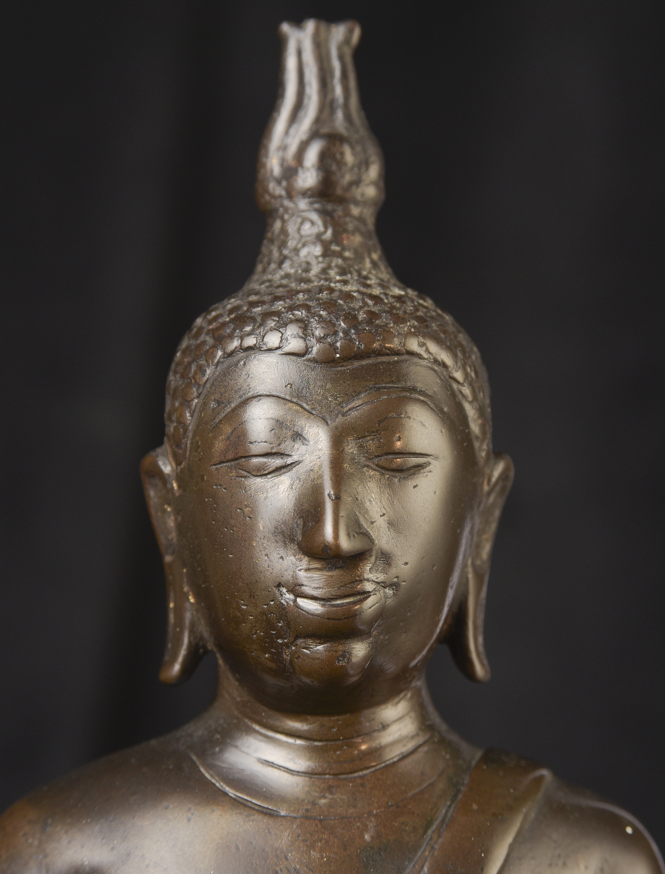 14/15thC Northern Sukhothai Buddha. This is one of my favorite styles- the joy that radiates from the expressive face is strong and inspirational. The way this one has worn makes it much more special. Nice simple lotus form base. In 30 years I've run across only 2 or 3 of this type that were of comparable quality, age, size, and that had worn in such an exquisite way. The last one was more than 10 years ago. (9.5"H x 7"W x 4"D) - 5.48lbs