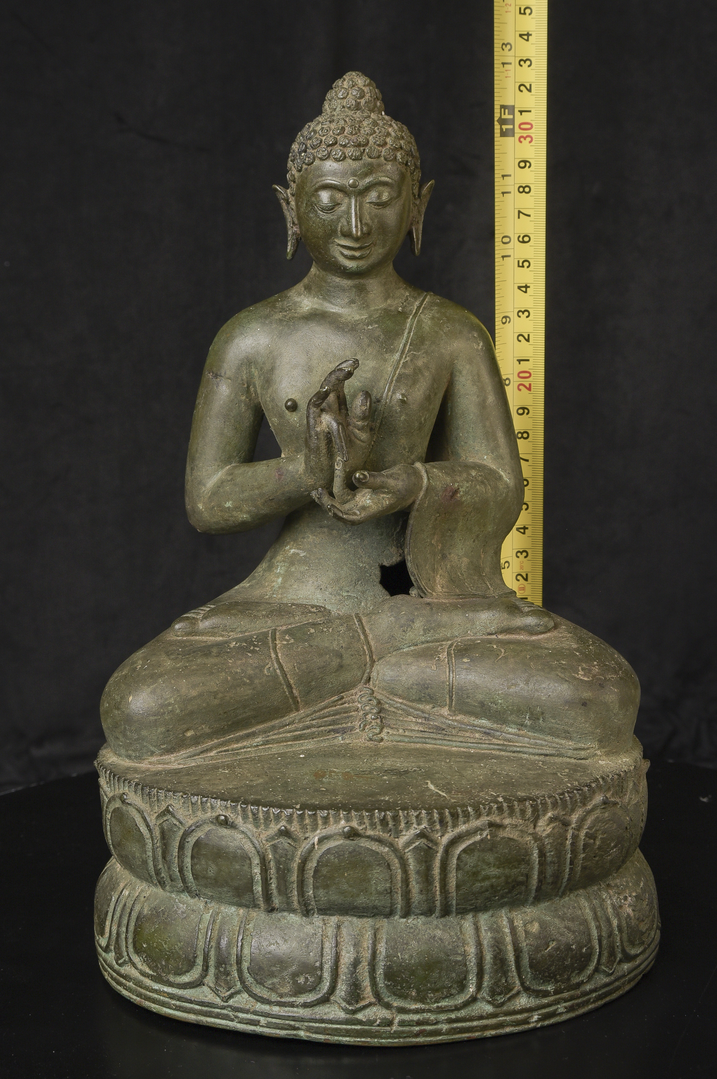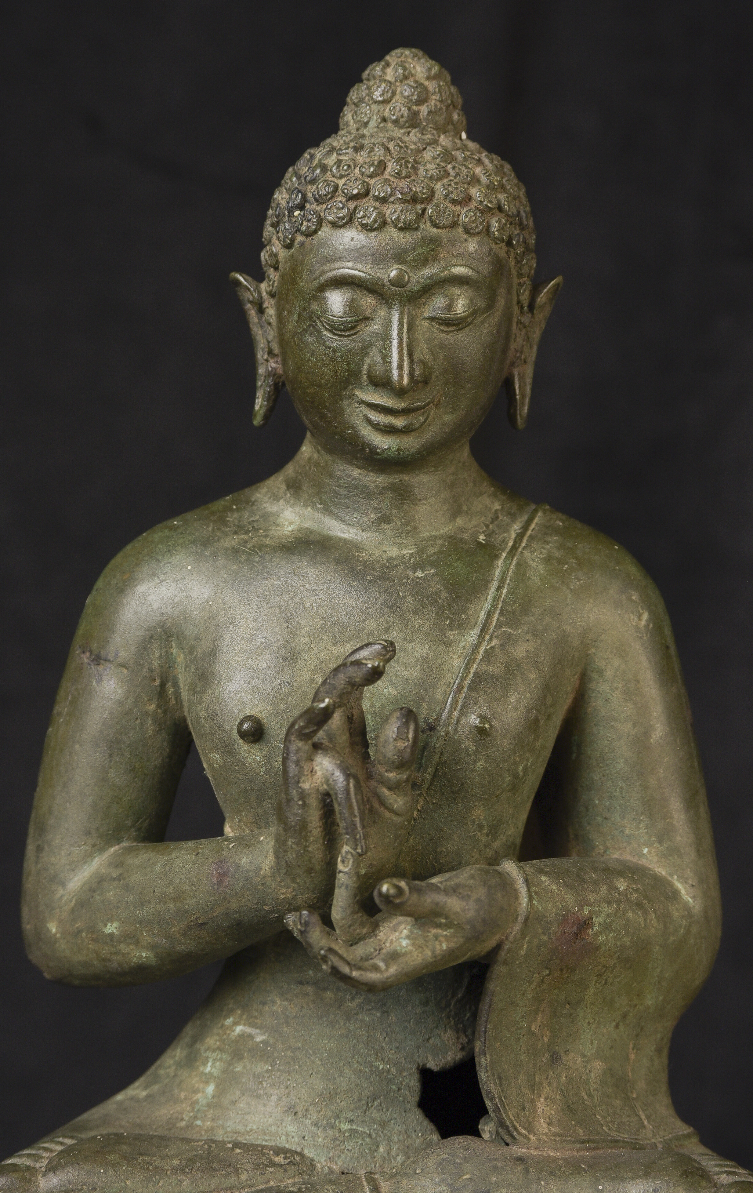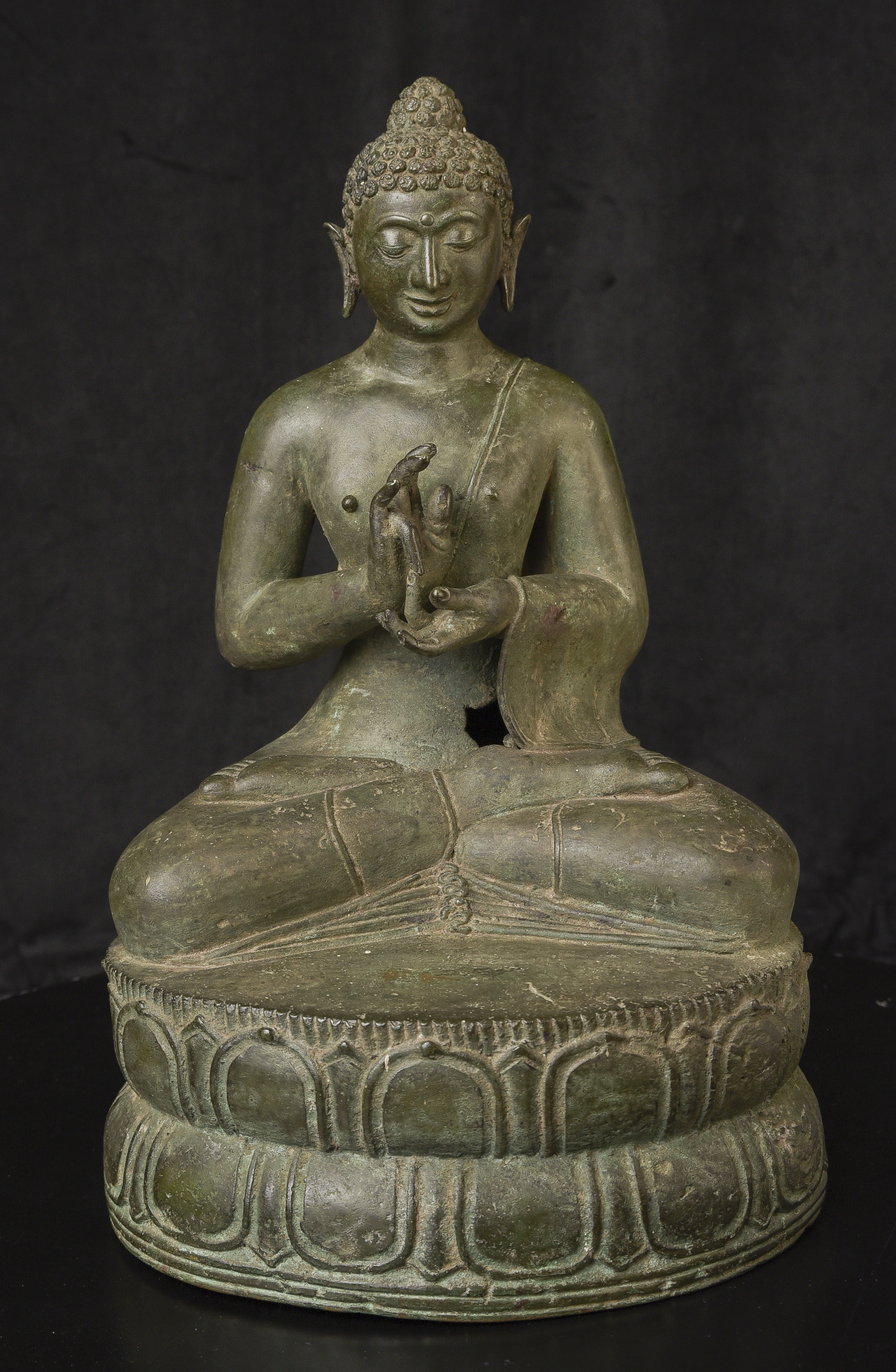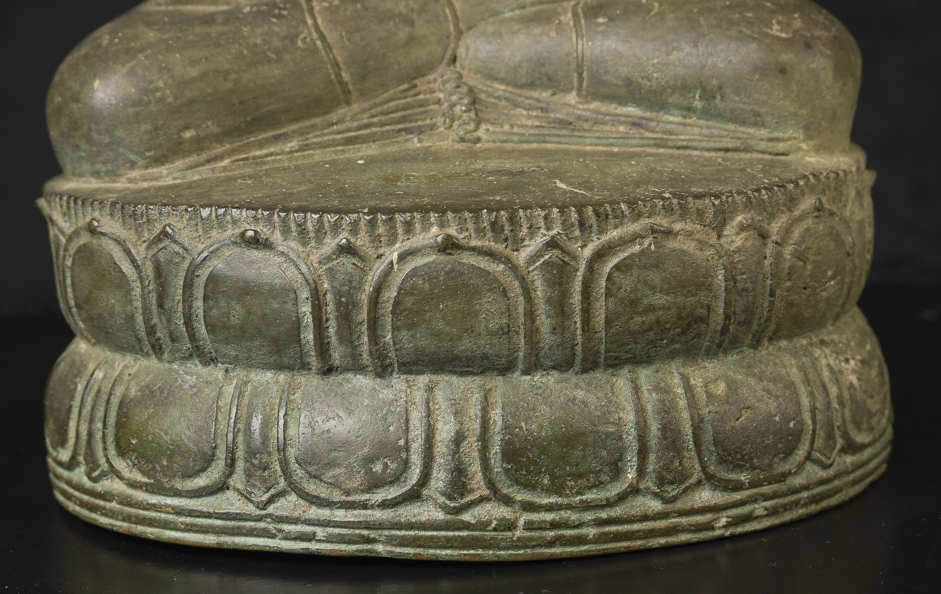 Superb large 13thC or later Javanese bronze Buddha. The previous owner purchased it from a reputable Australian auction house. They dated it to the 13th century- possibly later, but definitely has significant age. It has the animated, charismatic quality that great Buddhas possess. The bottom edge looks correct- smooth as glass, with high points worn with time. It is extremely large and in exceptional condition for its type. There is an original casting flaw in the lap behind the robe. It is in outstanding condition, with an excellent patina. Note the finesse in the fingers and toes, a sign of a quality sculpture. It has a wonderful face and a great overall feel. Unique Mudra.(12.25"H x 8"W x 7.5"D) - 9.12lbs