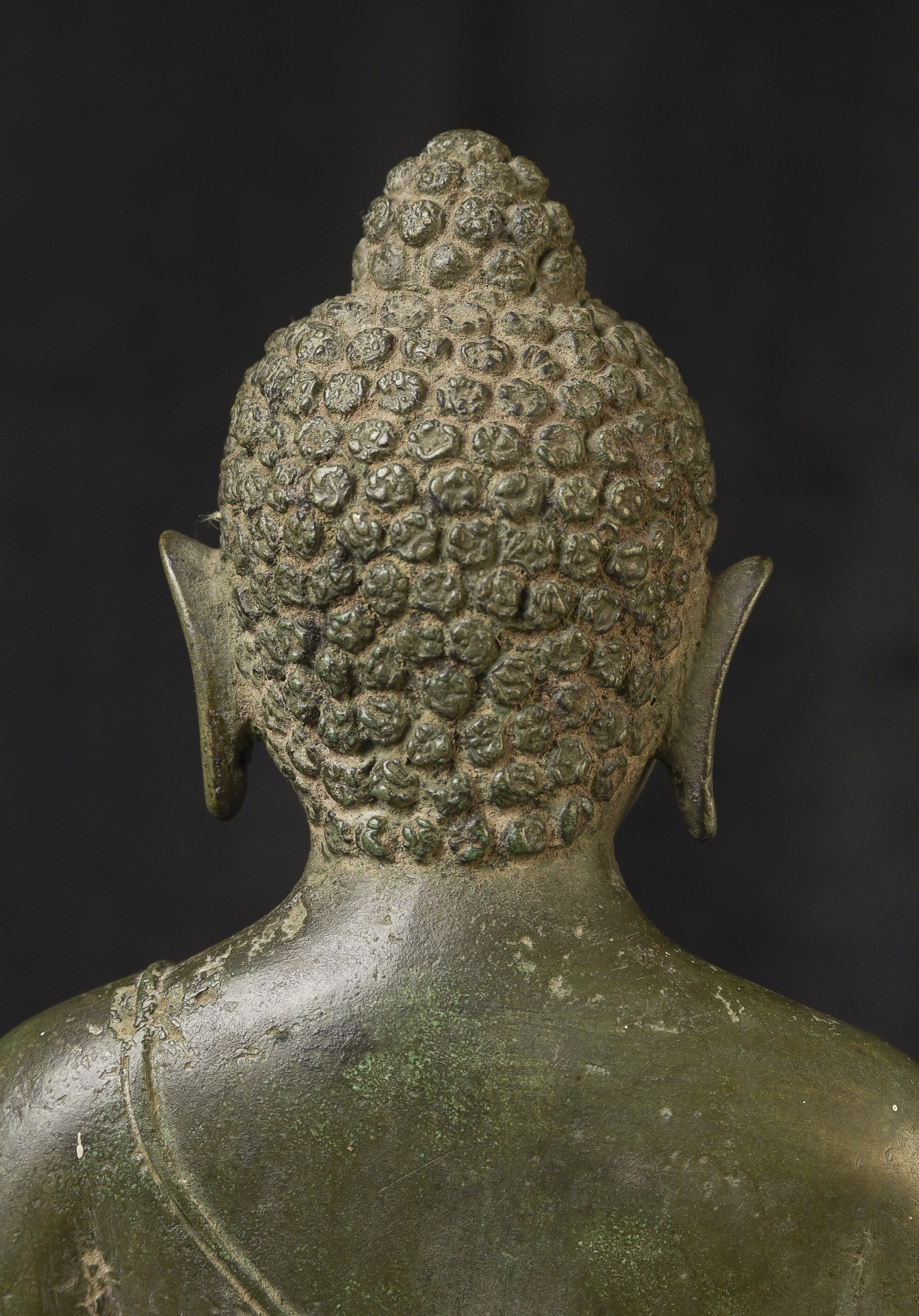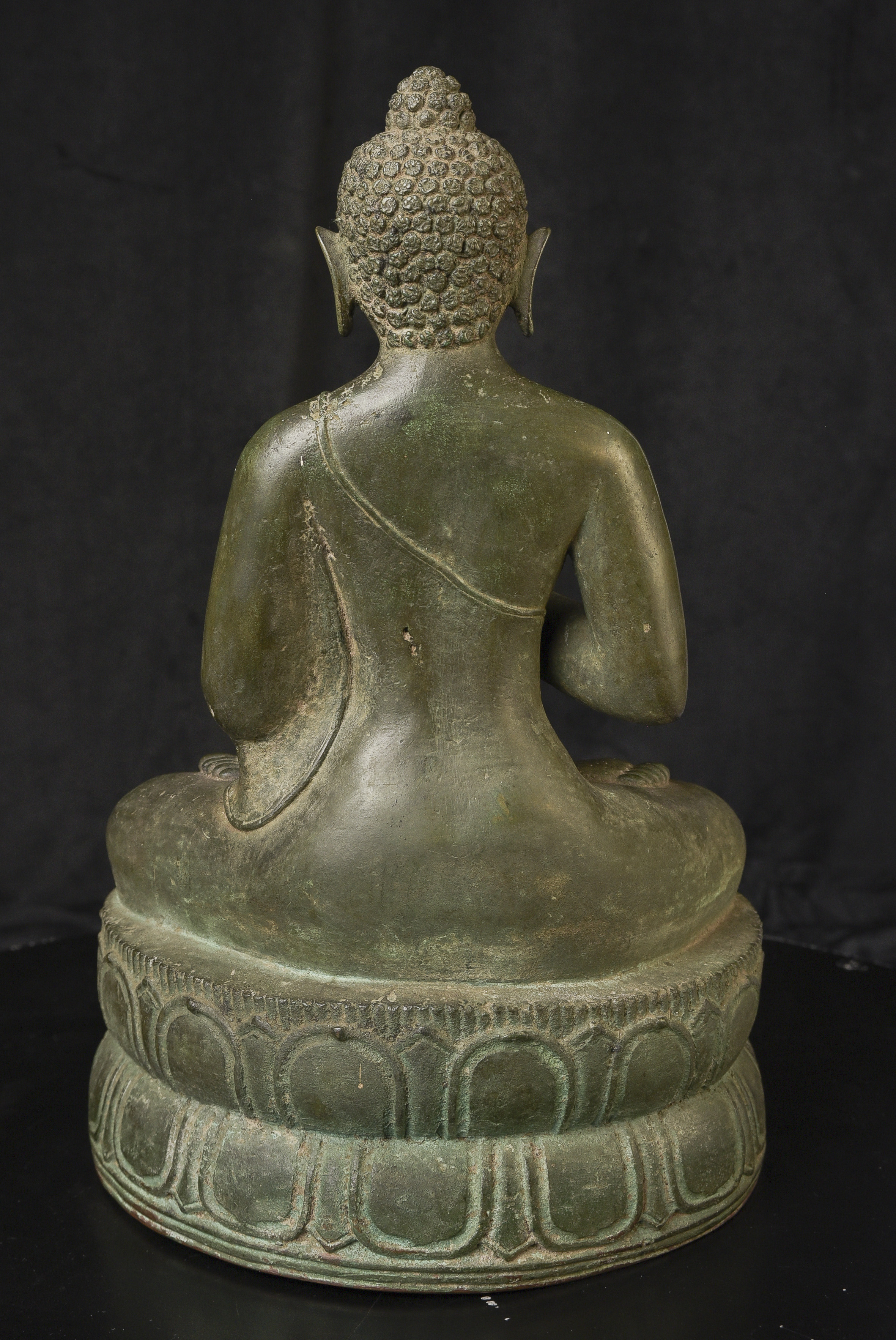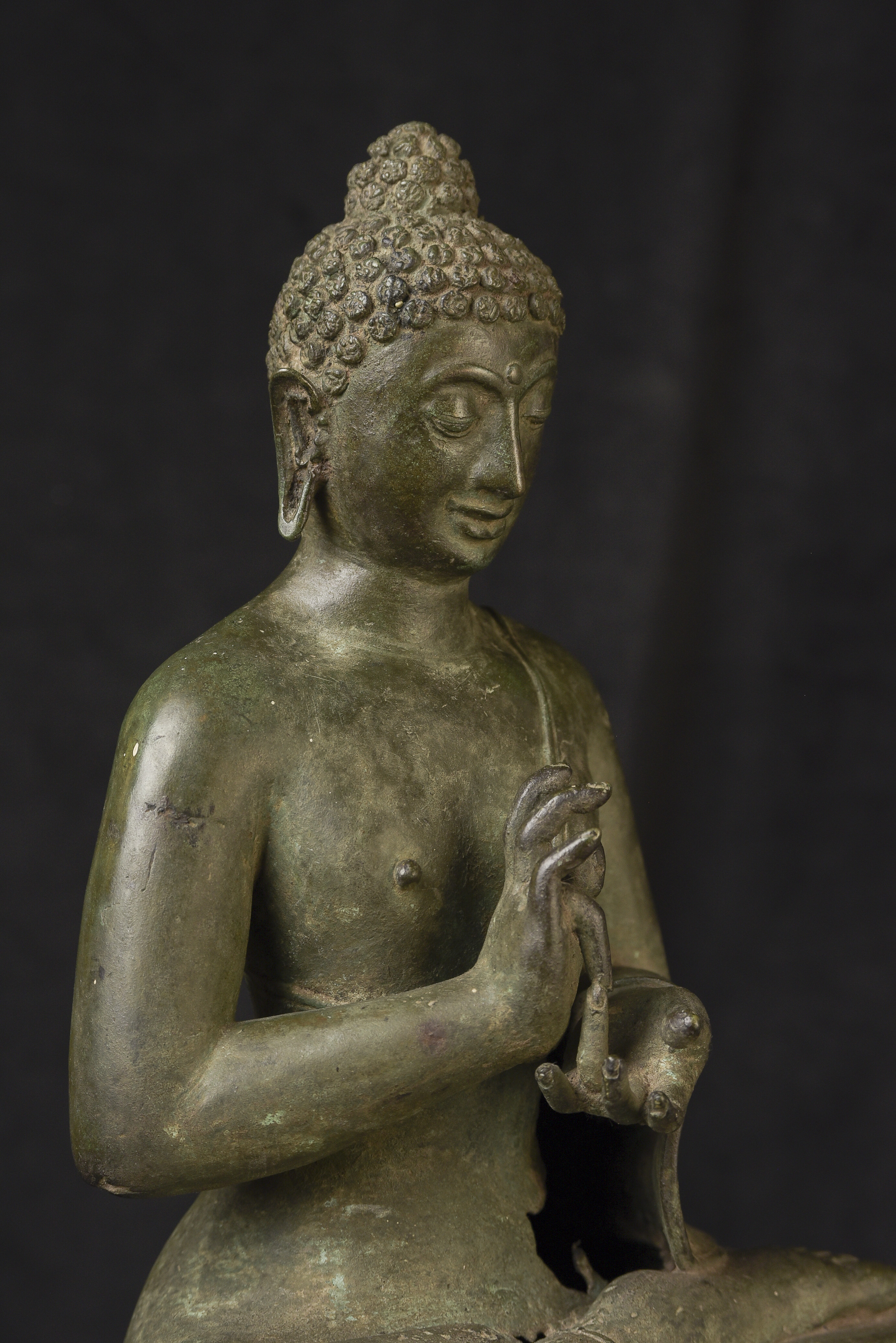 Superb large 13thC or later Javanese bronze Buddha. The previous owner purchased it from a reputable Australian auction house. They dated it to the 13th century- possibly later, but definitely has significant age. It has the animated, charismatic quality that great Buddhas possess. The bottom edge looks correct- smooth as glass, with high points worn with time. It is extremely large and in exceptional condition for its type. There is an original casting flaw in the lap behind the robe. It is in outstanding condition, with an excellent patina. Note the finesse in the fingers and toes, a sign of a quality sculpture. It has a wonderful face and a great overall feel. Unique Mudra.(12.25"H x 8"W x 7.5"D) - 9.12lbs
