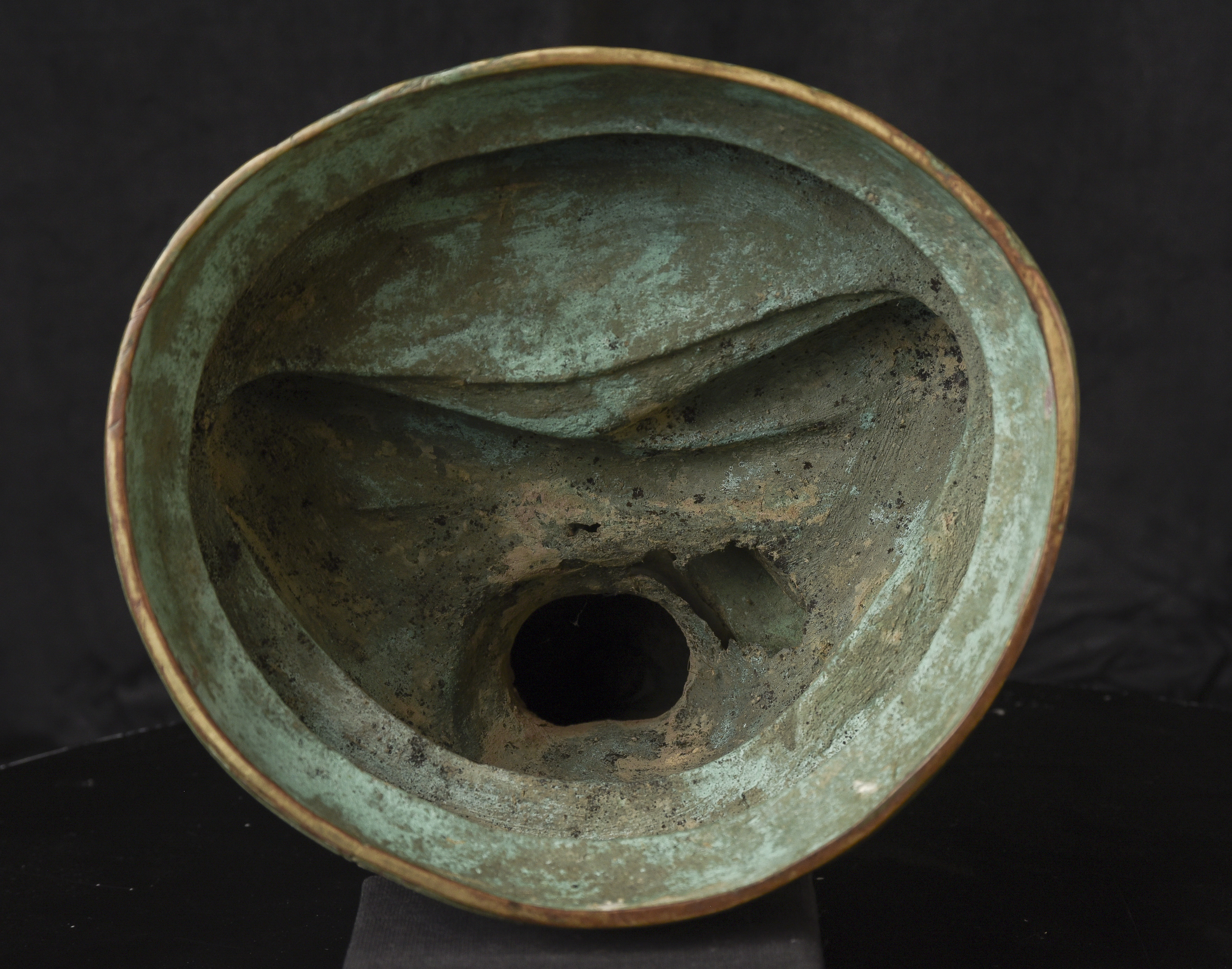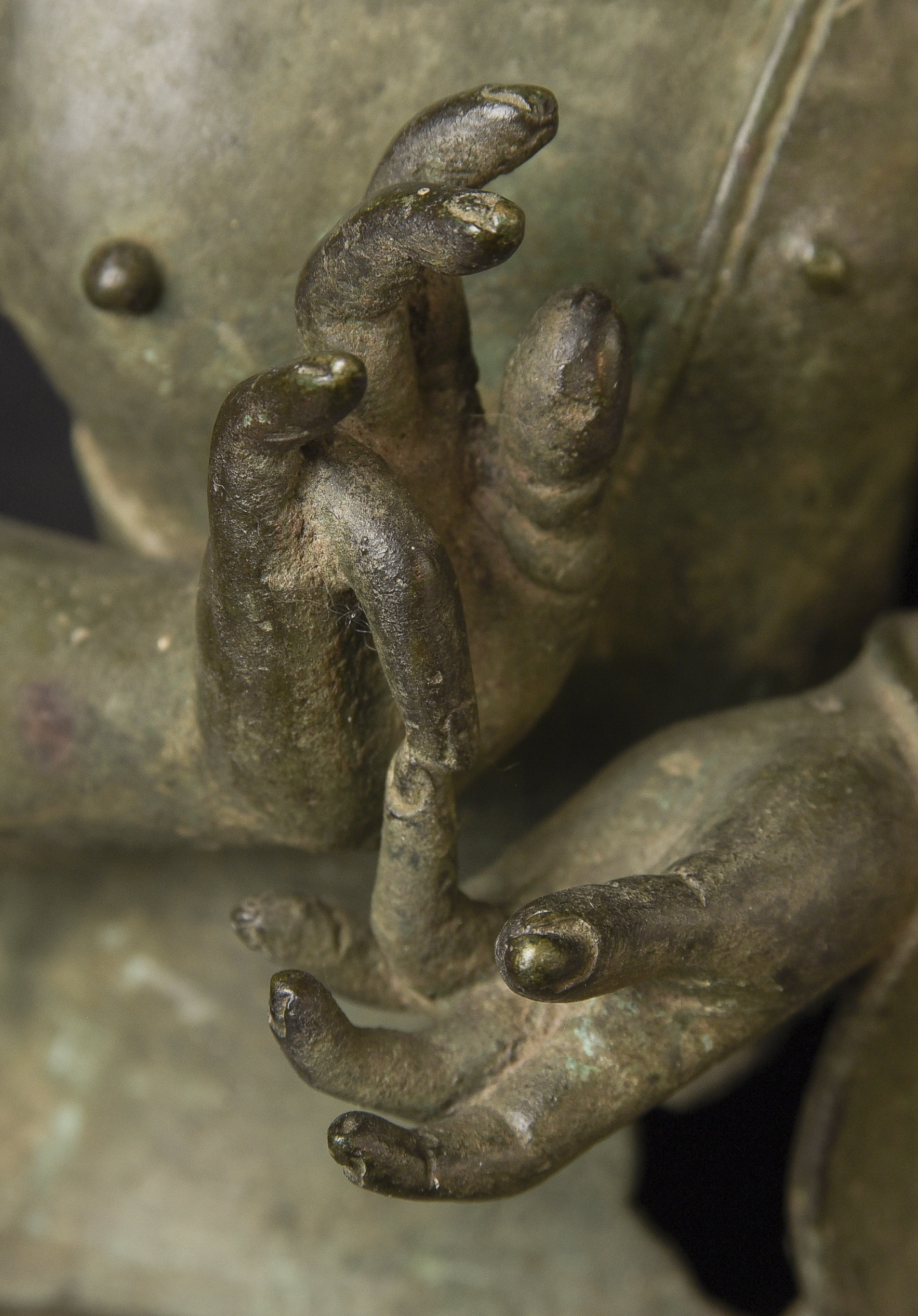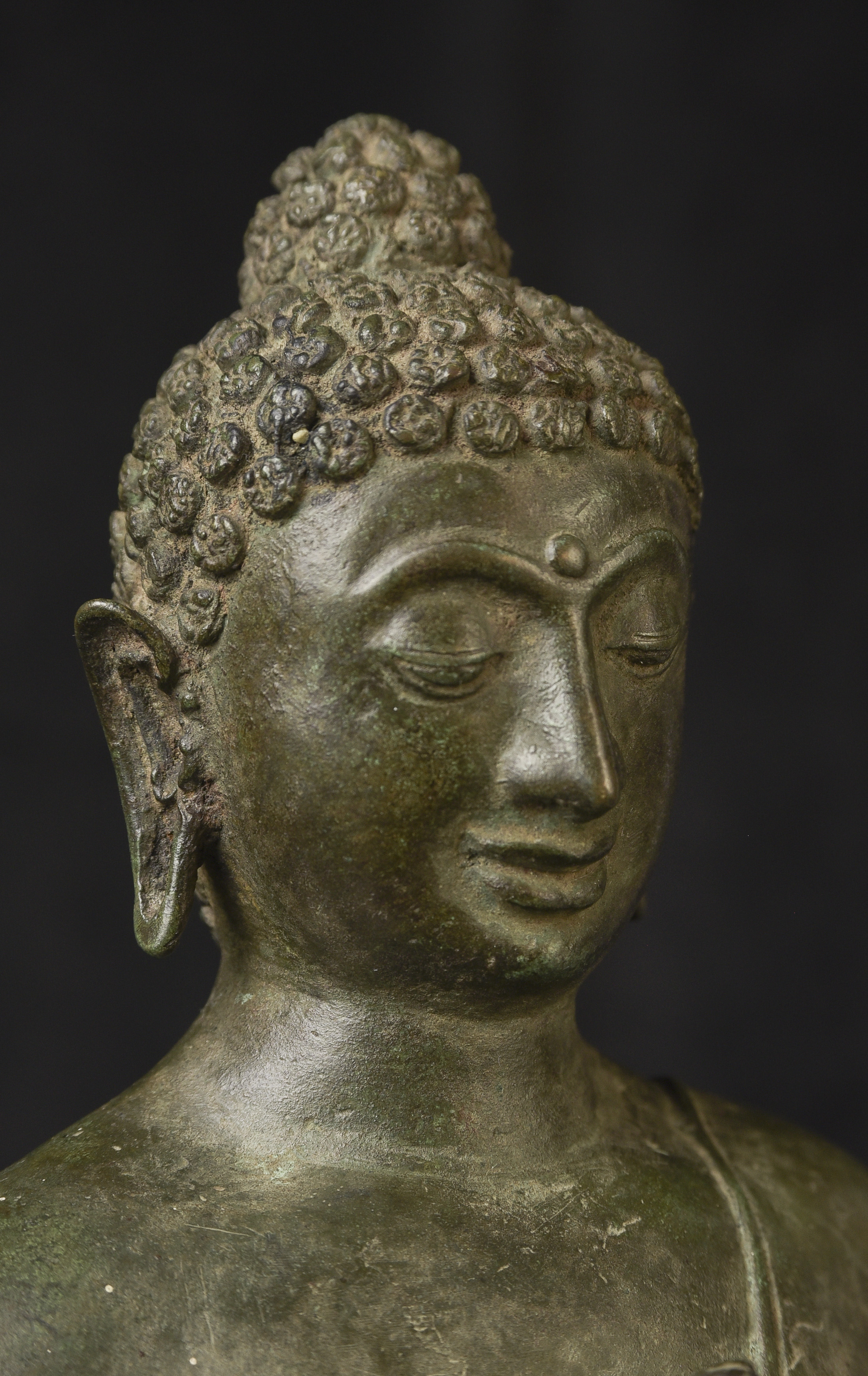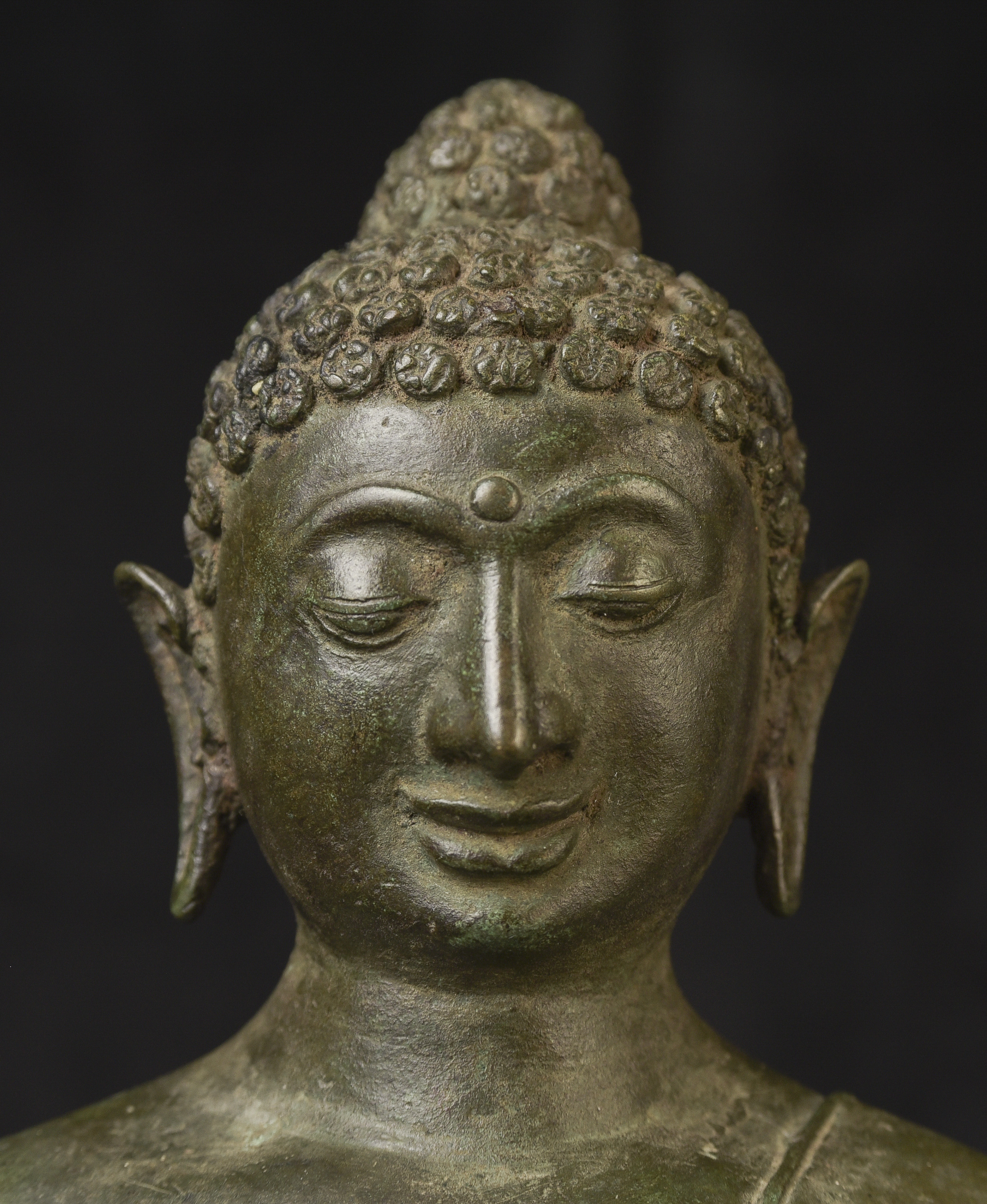 Superb large 13thC or later Javanese bronze Buddha. The previous owner purchased it from a reputable Australian auction house. They dated it to the 13th century- possibly later, but definitely has significant age. It has the animated, charismatic quality that great Buddhas possess. The bottom edge looks correct- smooth as glass, with high points worn with time. It is extremely large and in exceptional condition for its type. There is an original casting flaw in the lap behind the robe. It is in outstanding condition, with an excellent patina. Note the finesse in the fingers and toes, a sign of a quality sculpture. It has a wonderful face and a great overall feel. Unique Mudra.(12.25"H x 8"W x 7.5"D) - 9.12lbs