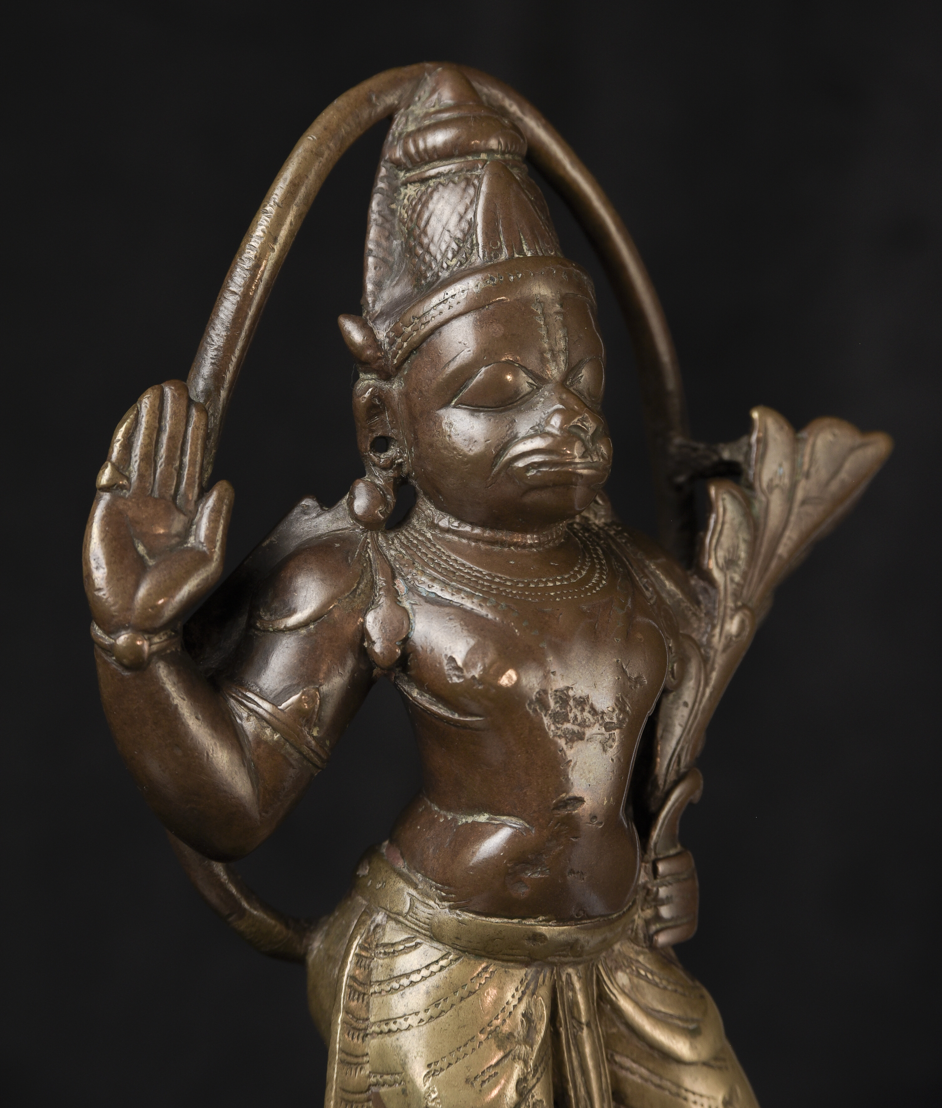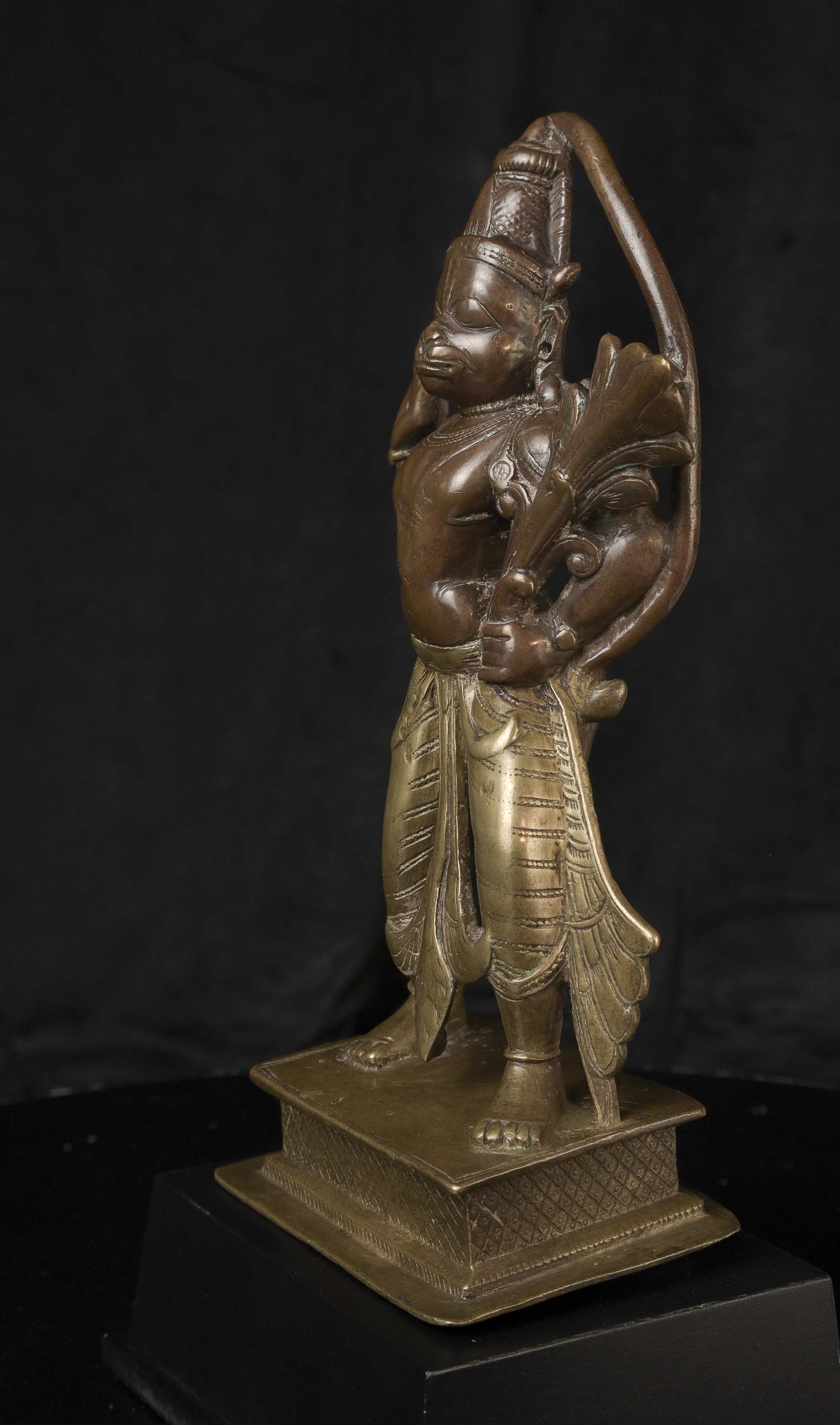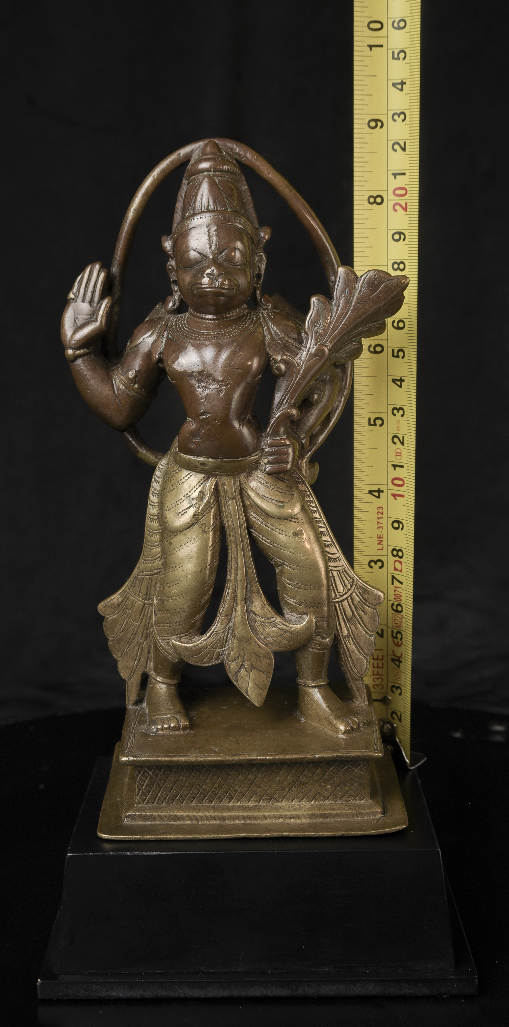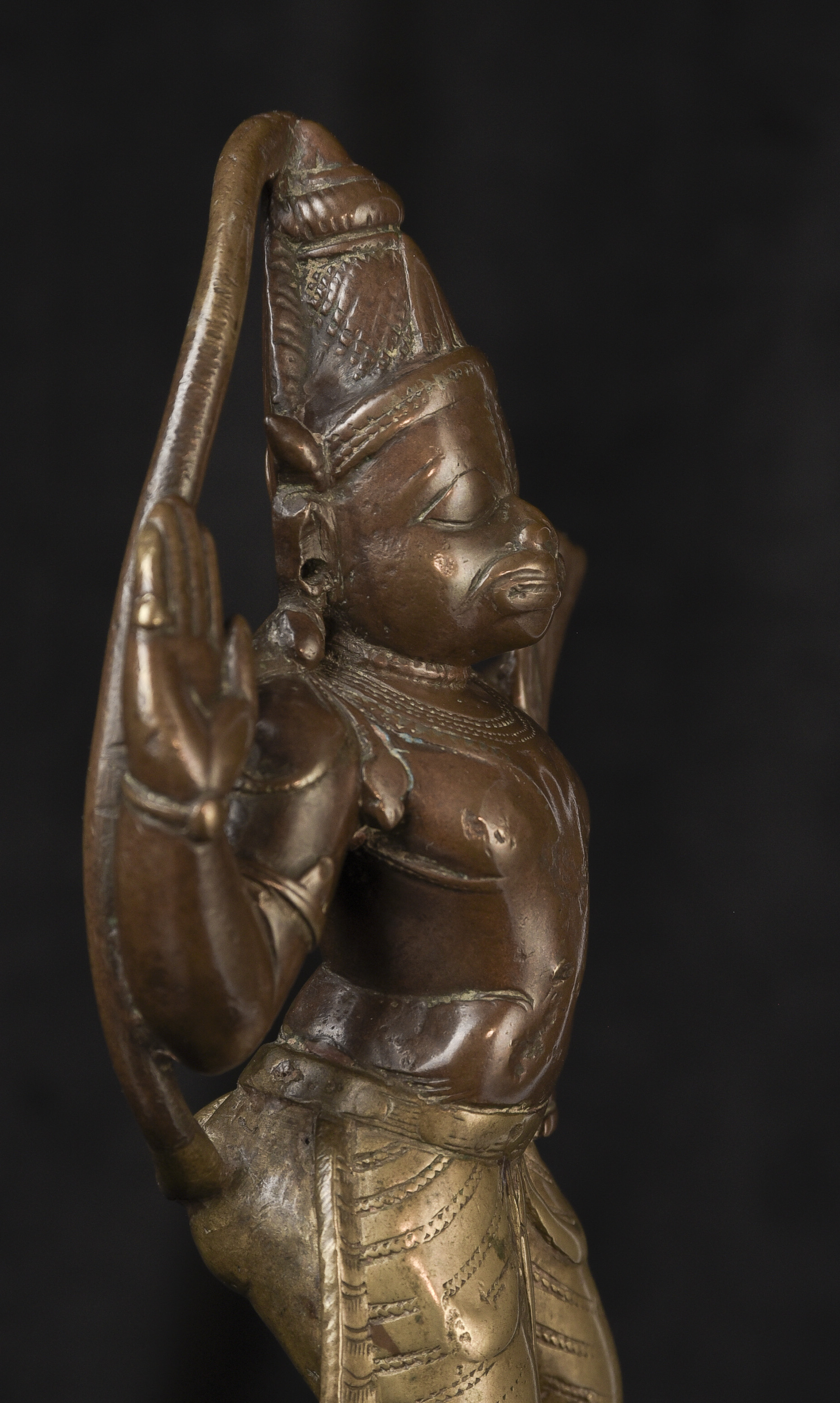 Best Hanuman I have found in 20+years 18thC, and from the estate of an "British titled gentleman". Bi-metal technique. ( 8.5"H x 4.5"W x 2.75"D ) - 3.64lbs. // Base: ( 1.75"H x 5.5"W ) 1lbs. He has an elegance to him that elevates him to a category of the very best of type. The only Hanuman sculptures that I have seen that were finer were made for temple use.
