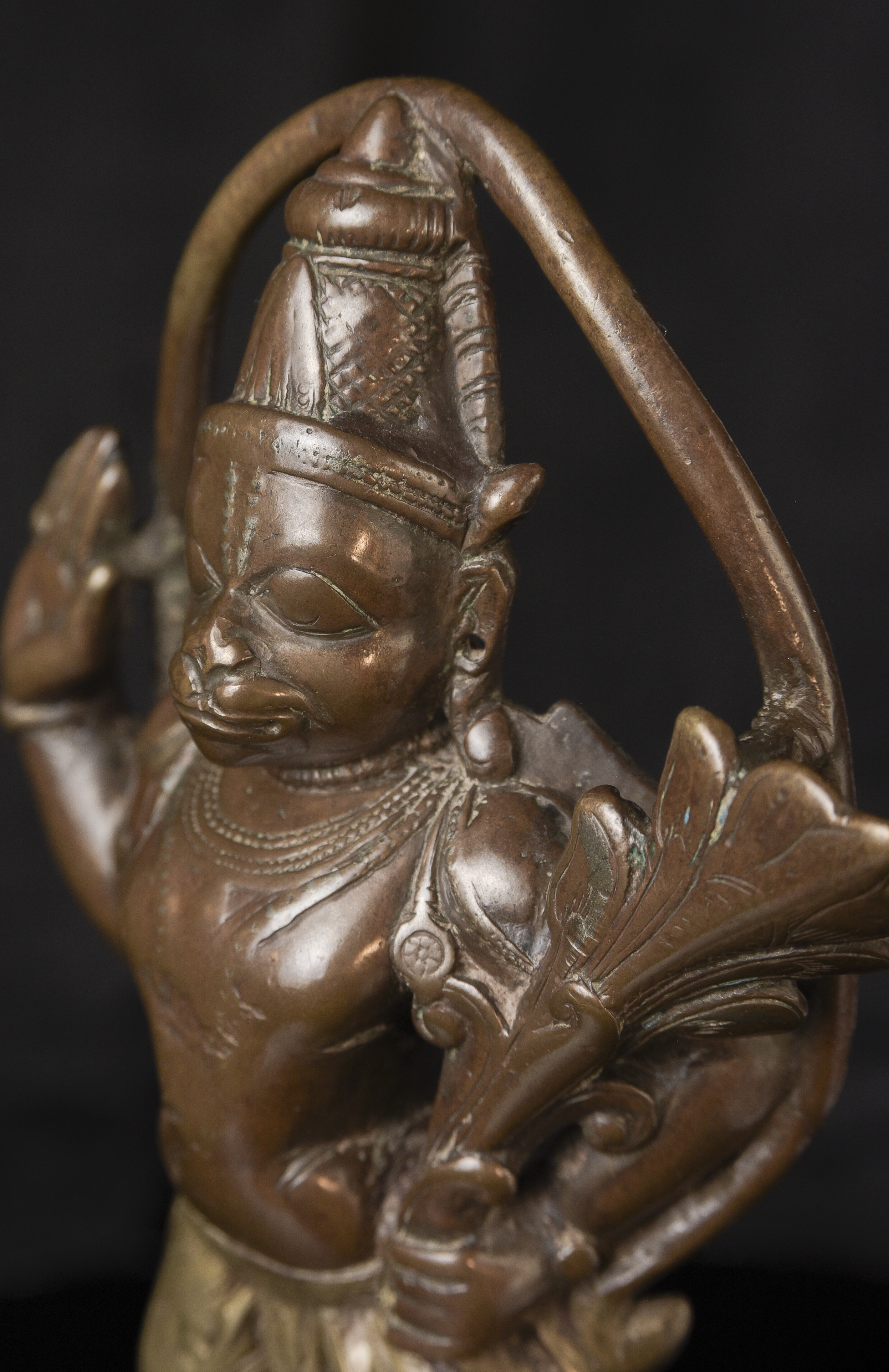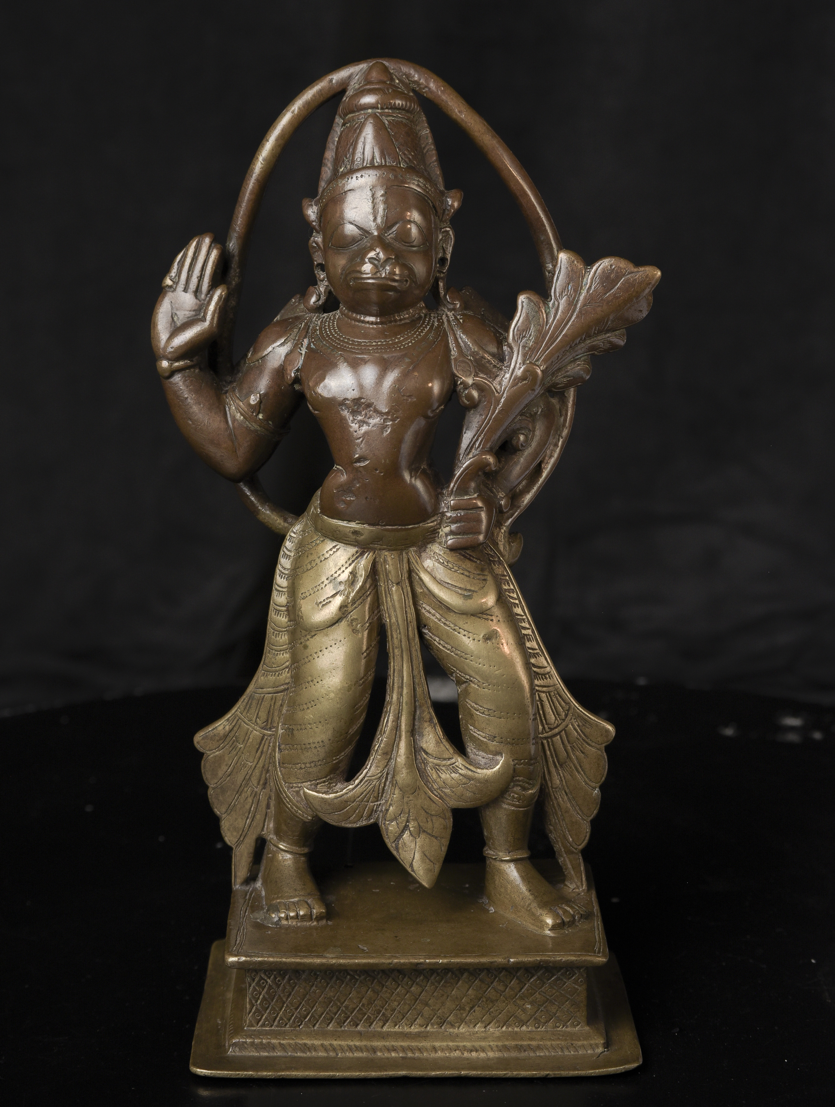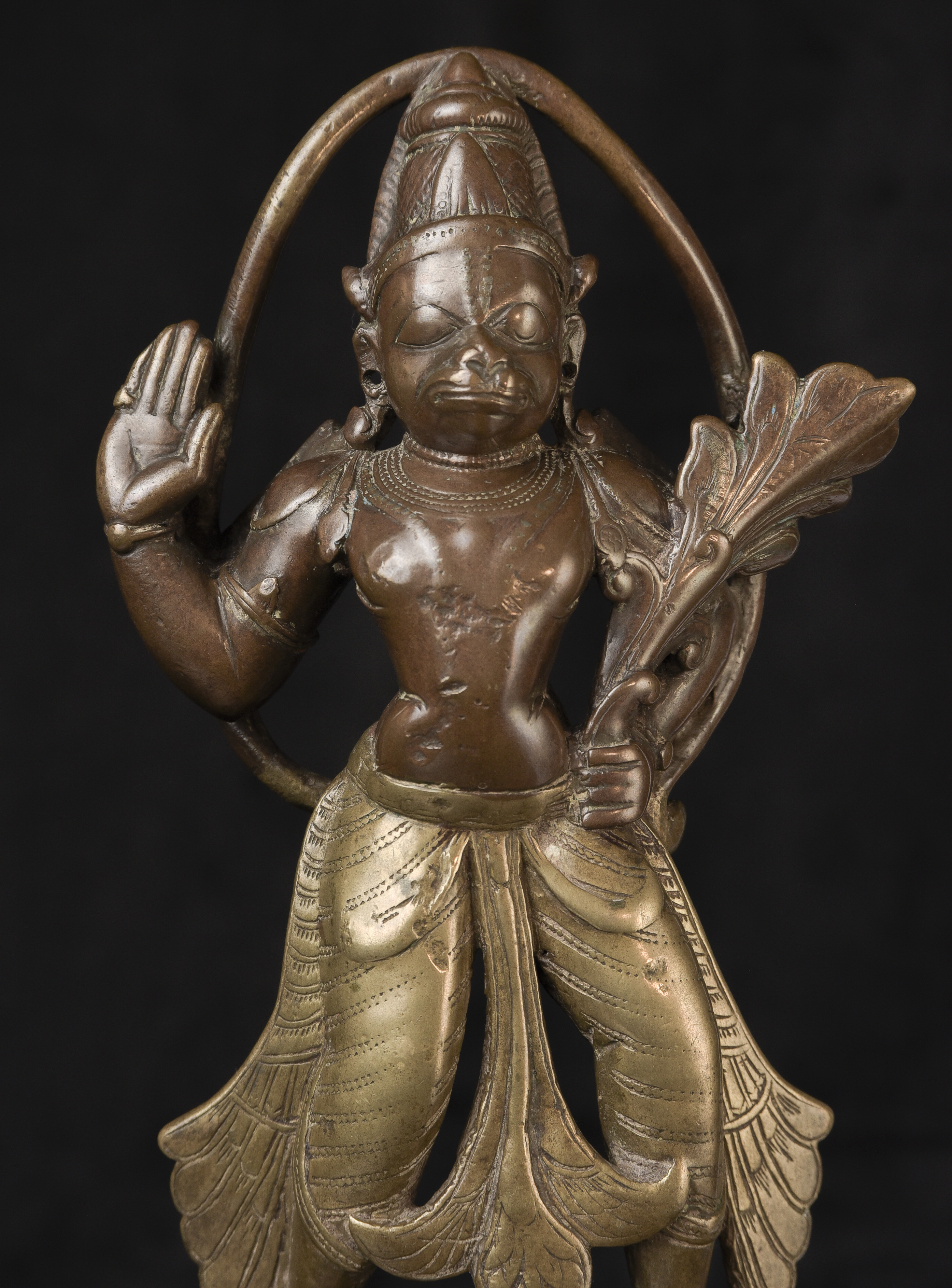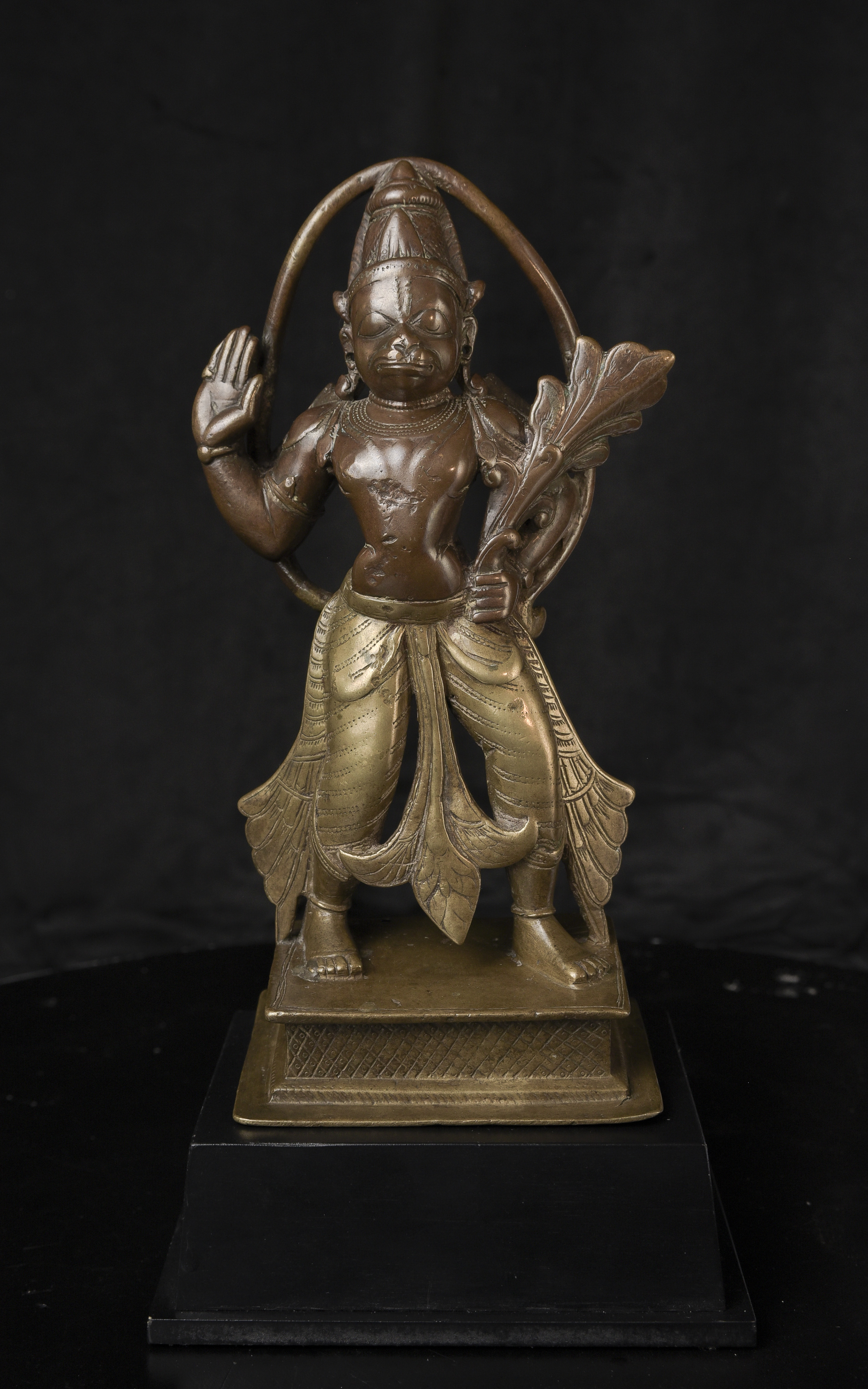 Best Hanuman I have found in 20+years 18thC, and from the estate of an "British titled gentleman". Bi-metal technique. ( 8.5"H x 4.5"W x 2.75"D ) - 3.64lbs. // Base: ( 1.75"H x 5.5"W ) 1lbs. He has an elegance to him that elevates him to a category of the very best of type. The only Hanuman sculptures that I have seen that were finer were made for temple use.