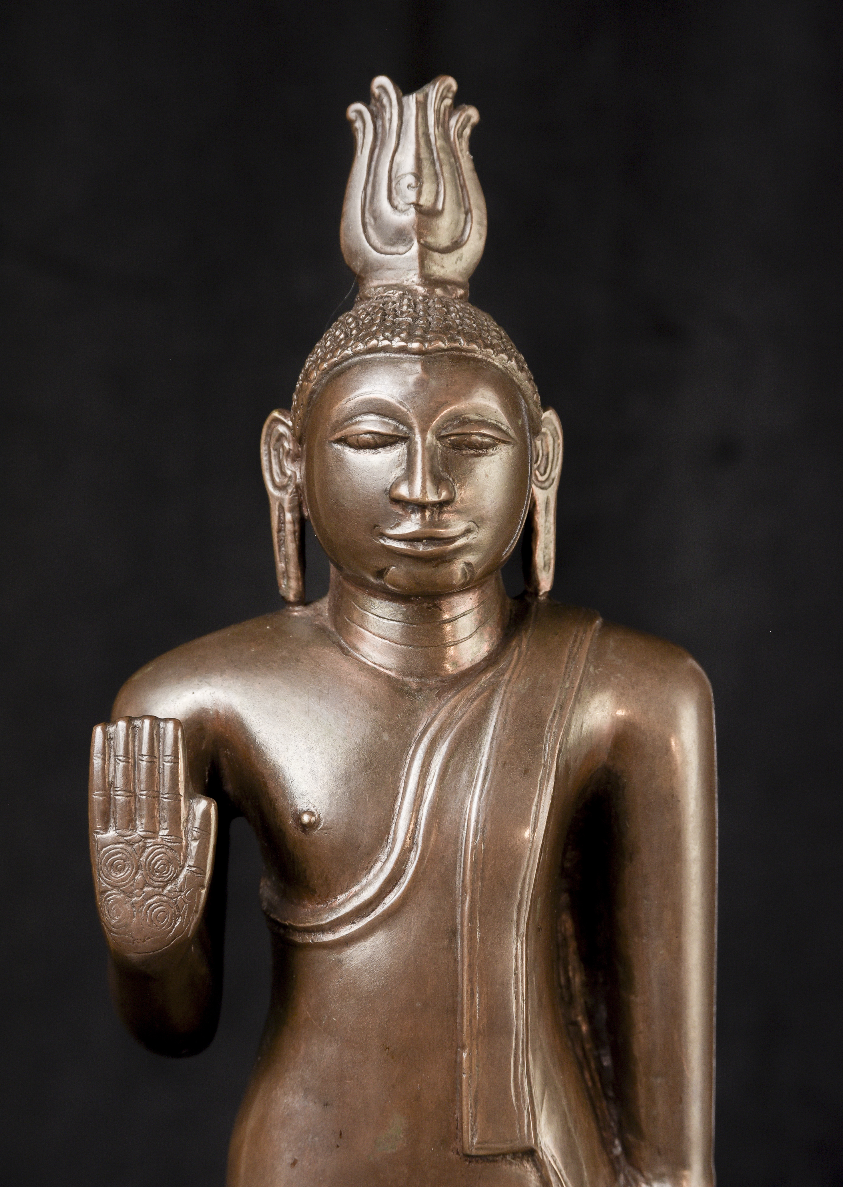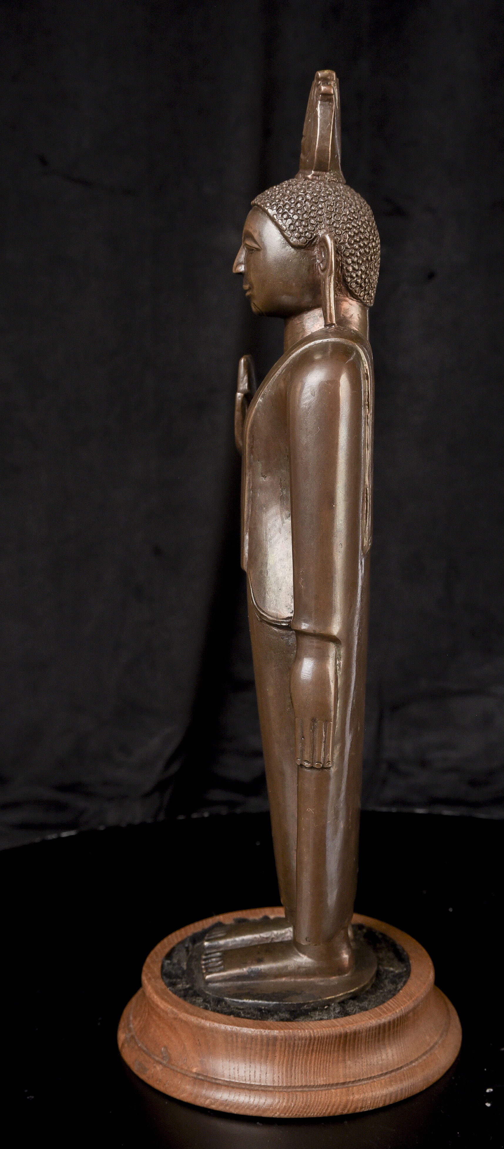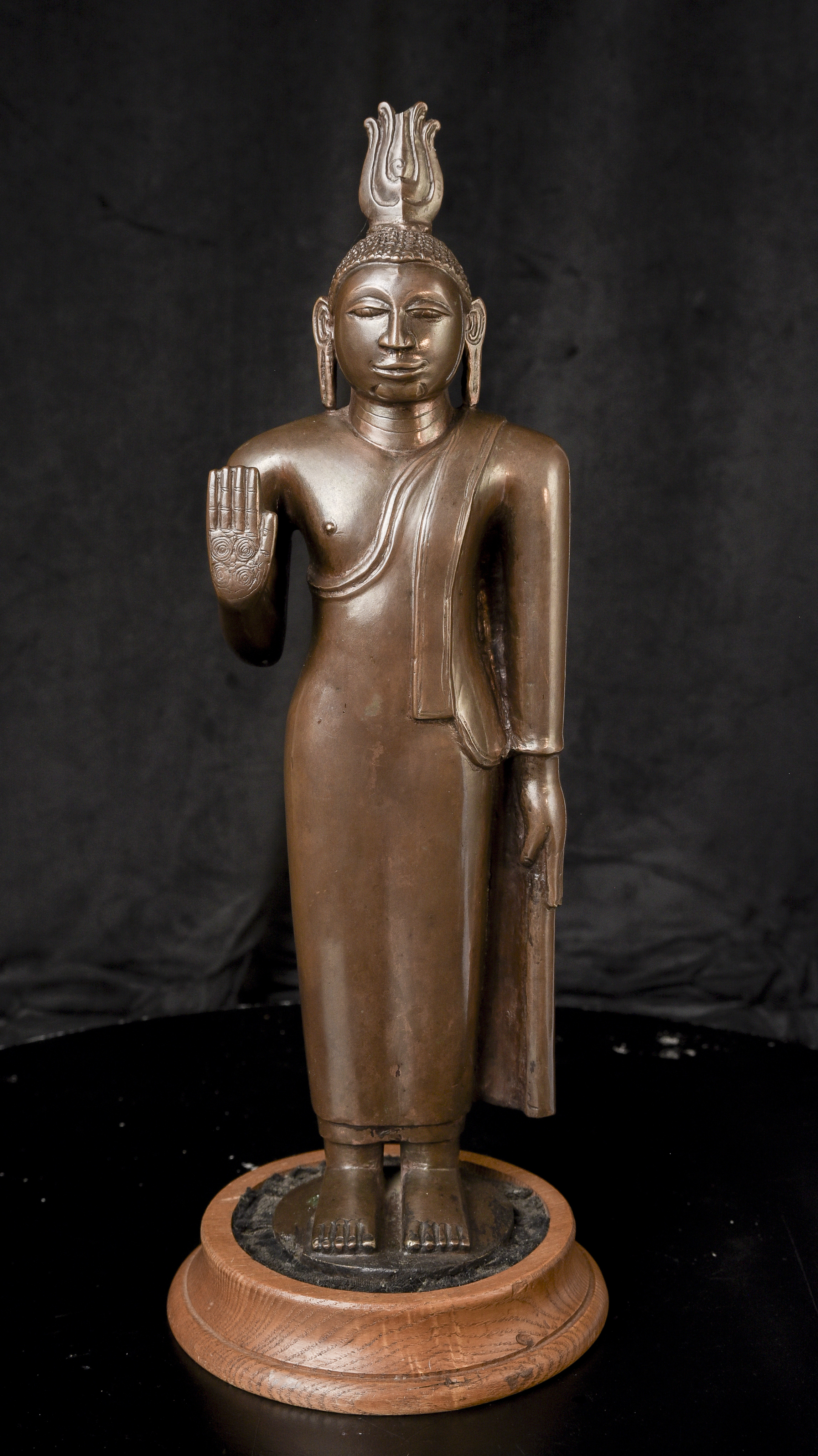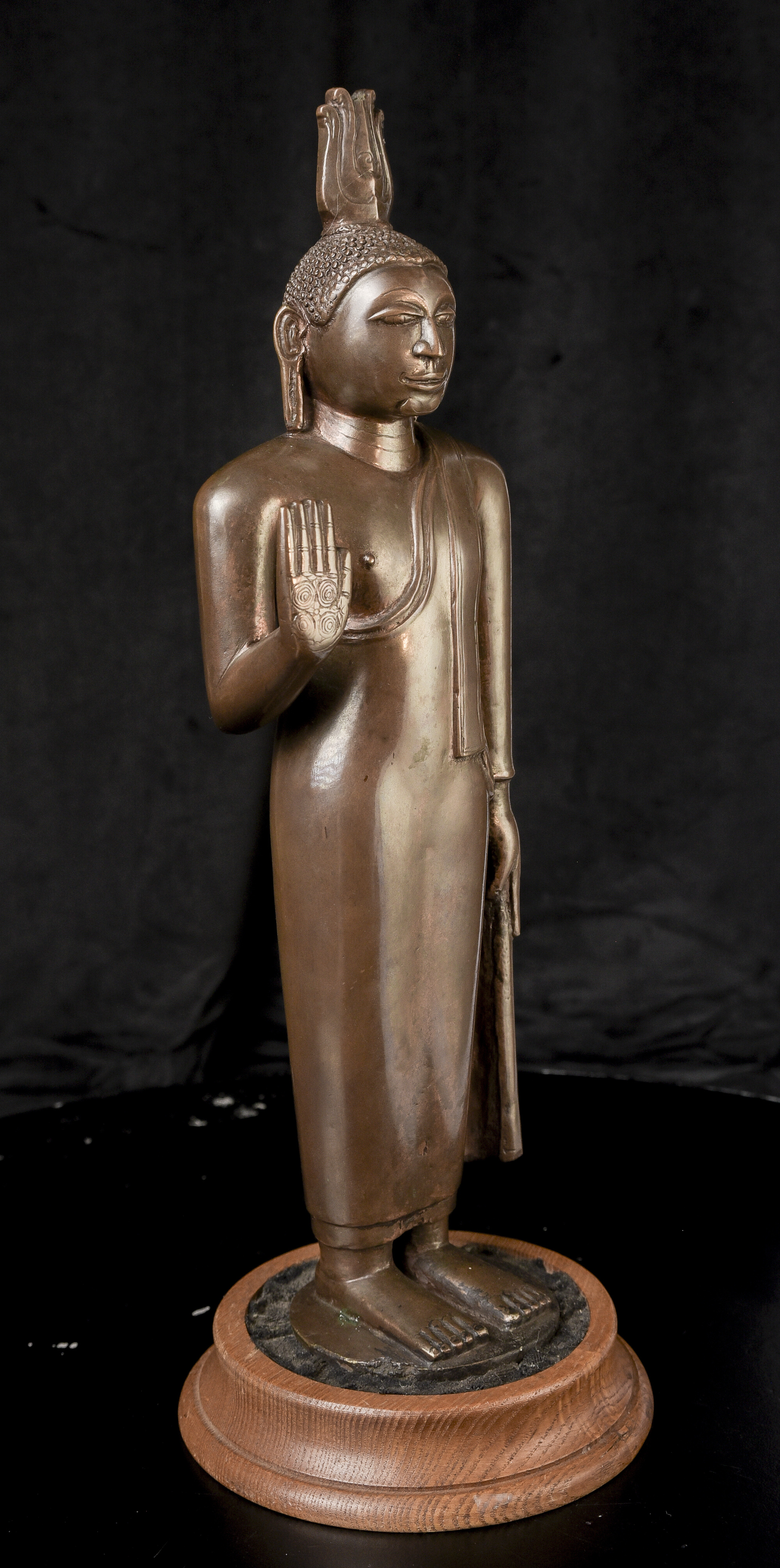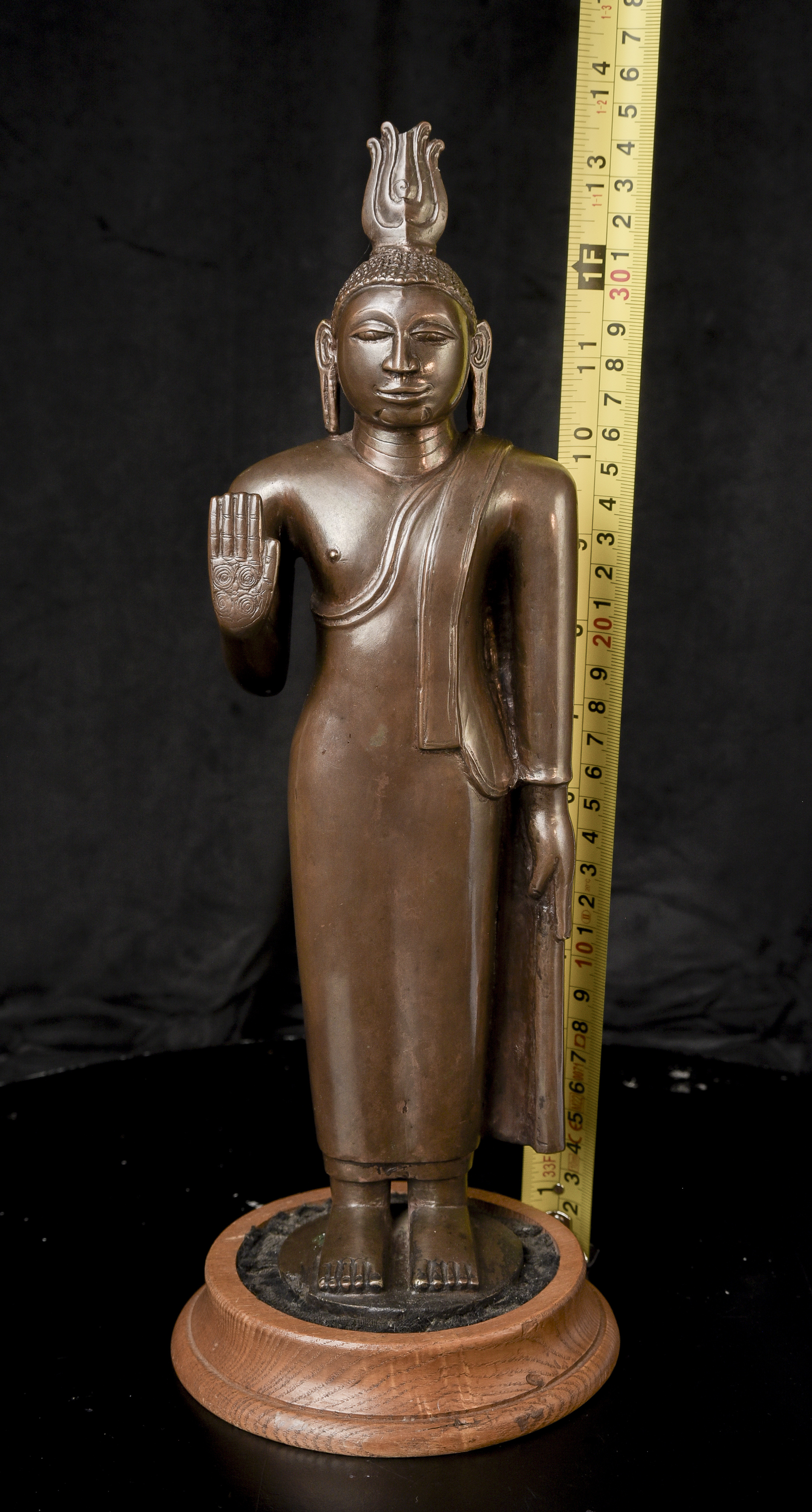 15thC Sri Lankan Divided Kingdom Period Standing Bronze Buddha. Beautiful glow and softness to the surface. Quite rare to find a figure from this period in this large size and high quality--the vast majority are the later Kandy style, which look similar but have rounder faces and distinctive ripples covering the robes. If you search the internet you will find very few of this type outside of museums or high end auction houses that are not just a few inches tall and quite provincial in casting. It is extremely heavy for its size. Many Lankan Buddhas can be stiff and remote--this one displays great personality and friendliness. I am posting many of my most cherished and valuable pieces as I near retirement. They are not inexpensive, but they are each special, very uncommon, authentic pieces, the equivalent of which you are unlikely to find again( 13"H x 5"W x 5"D ) - 10.32lbs