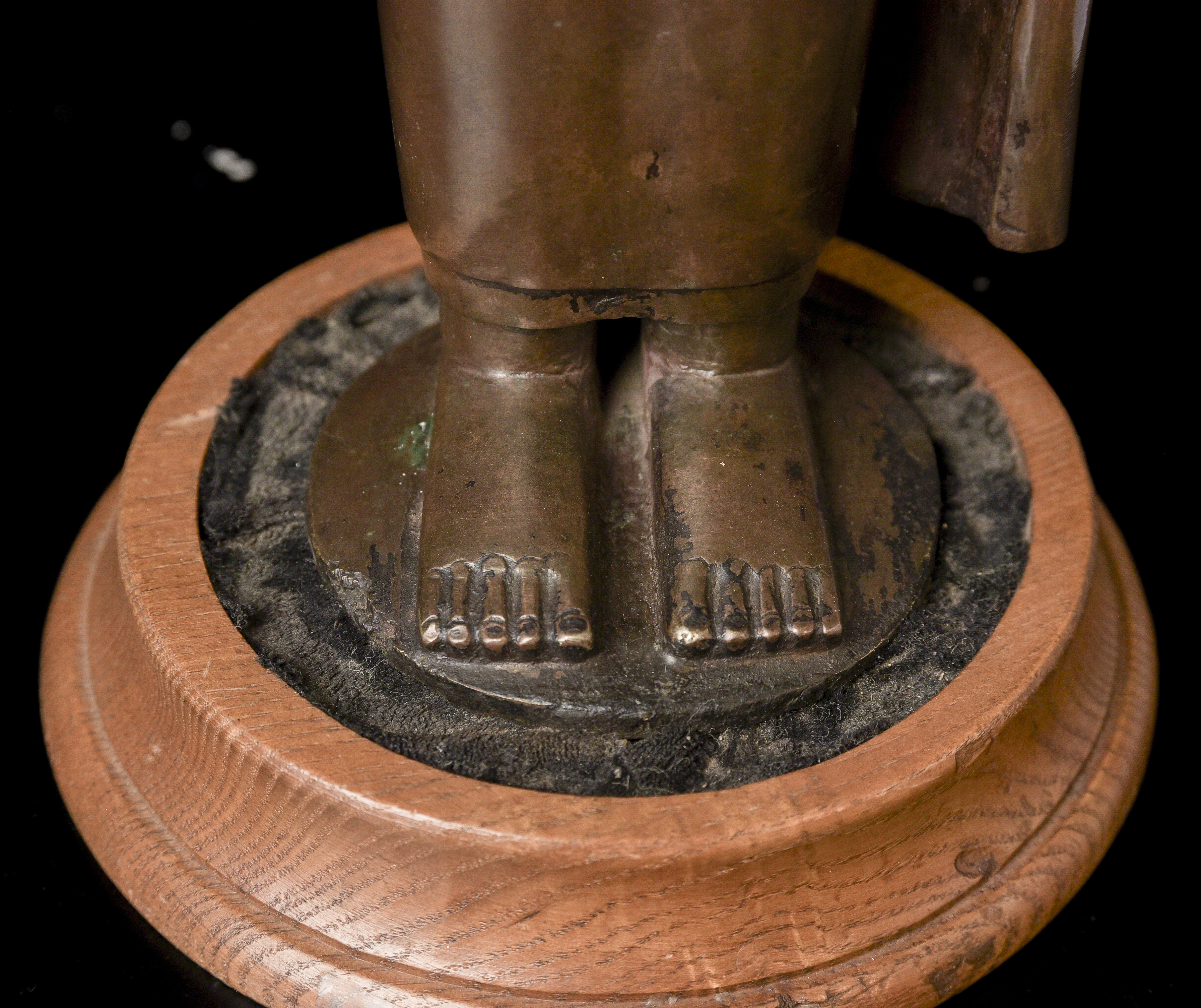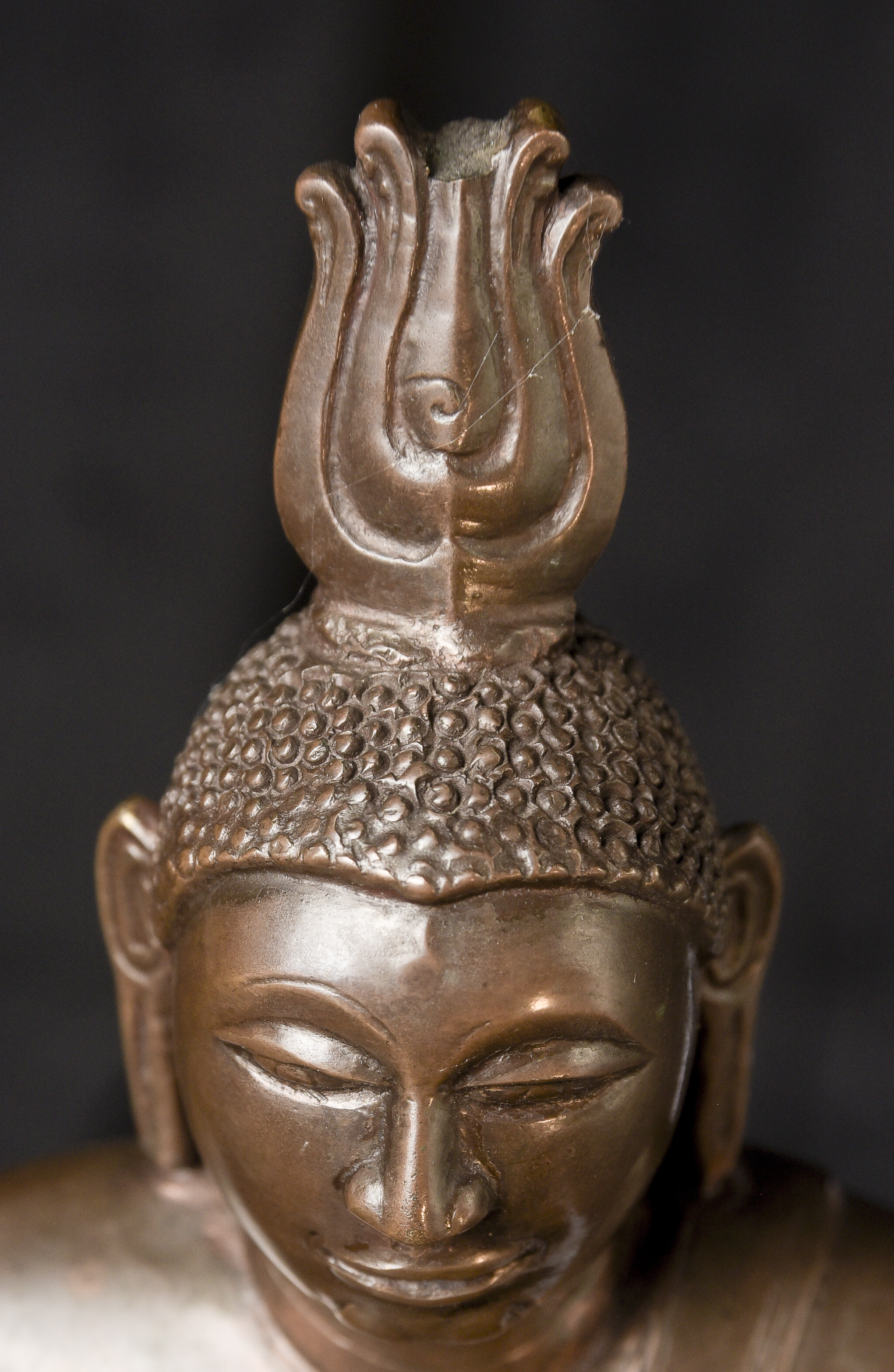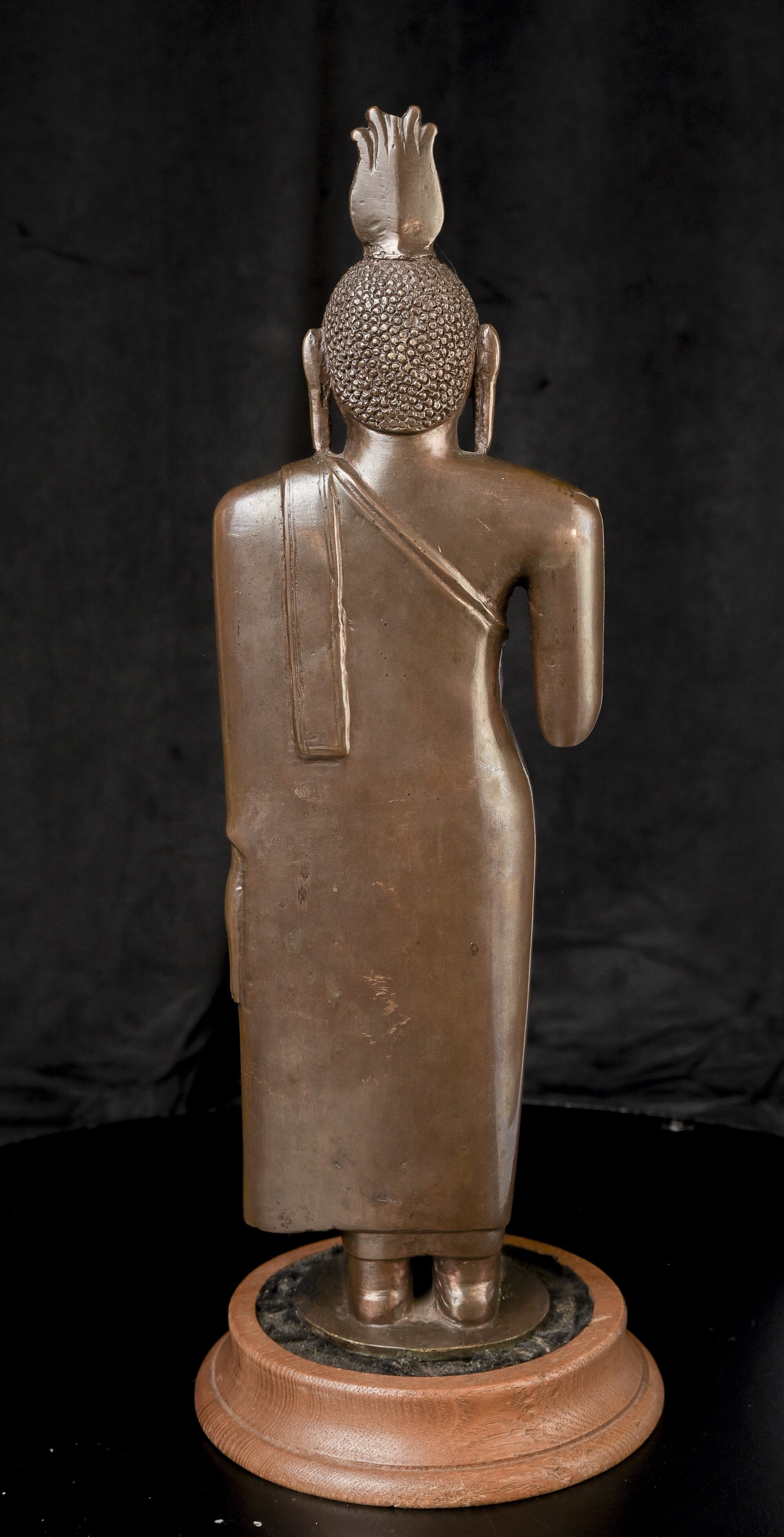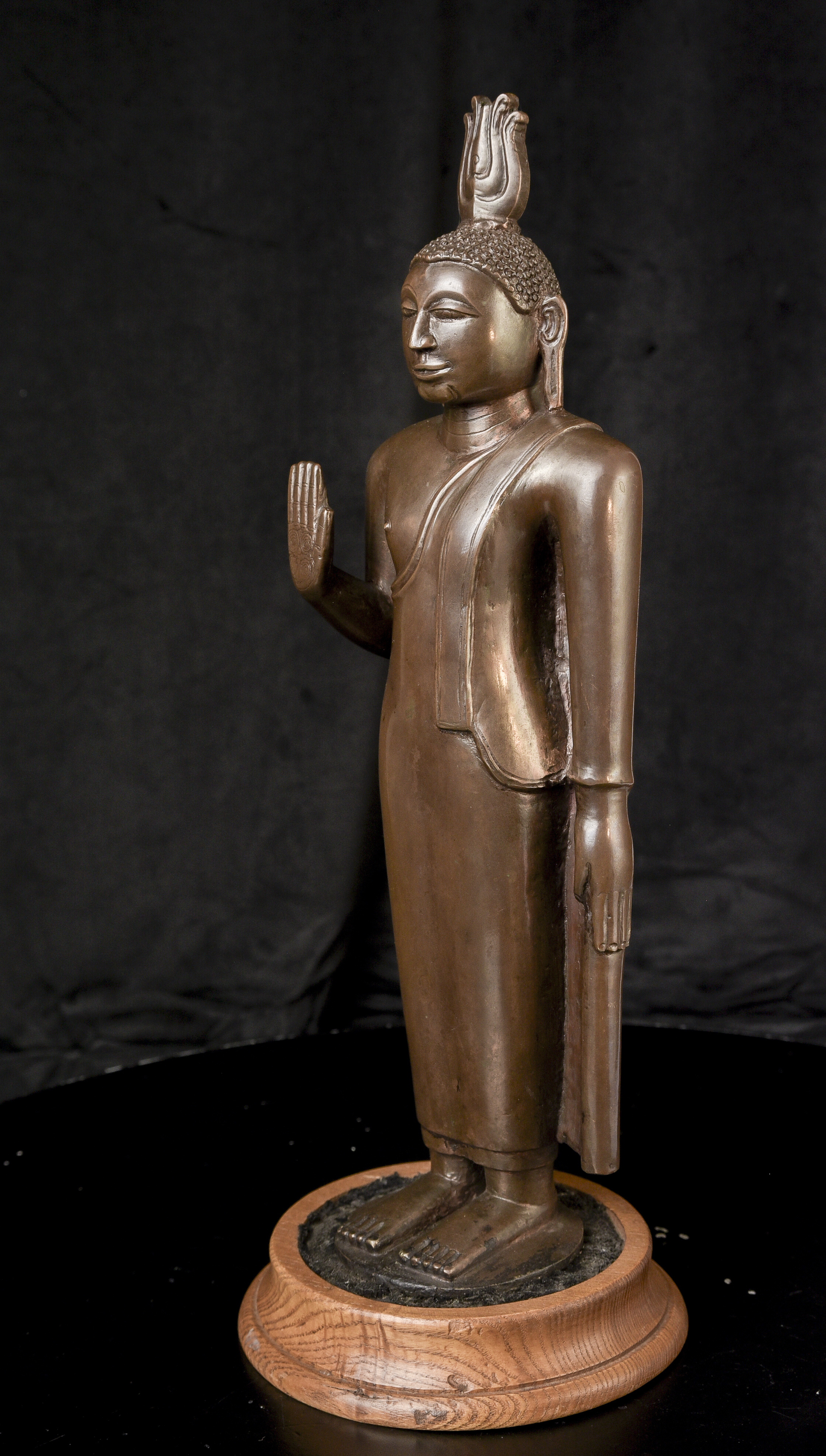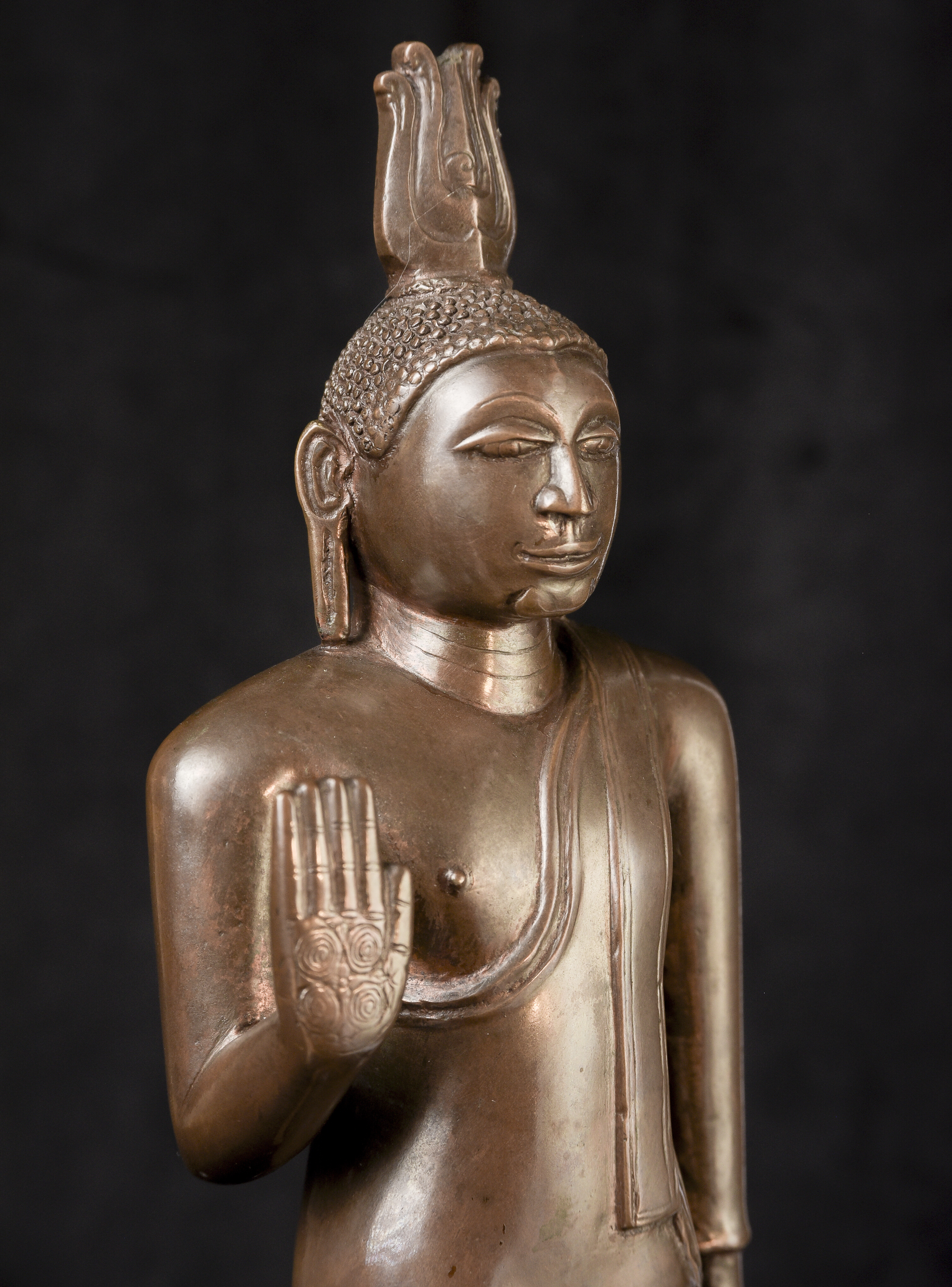 15thC Sri Lankan Divided Kingdom Period Standing Bronze Buddha. Beautiful glow and softness to the surface. Quite rare to find a figure from this period in this large size and high quality--the vast majority are the later Kandy style, which look similar but have rounder faces and distinctive ripples covering the robes. If you search the internet you will find very few of this type outside of museums or high end auction houses that are not just a few inches tall and quite provincial in casting. It is extremely heavy for its size. Many Lankan Buddhas can be stiff and remote--this one displays great personality and friendliness. I am posting many of my most cherished and valuable pieces as I near retirement. They are not inexpensive, but they are each special, very uncommon, authentic pieces, the equivalent of which you are unlikely to find again( 13"H x 5"W x 5"D ) - 10.32lbs