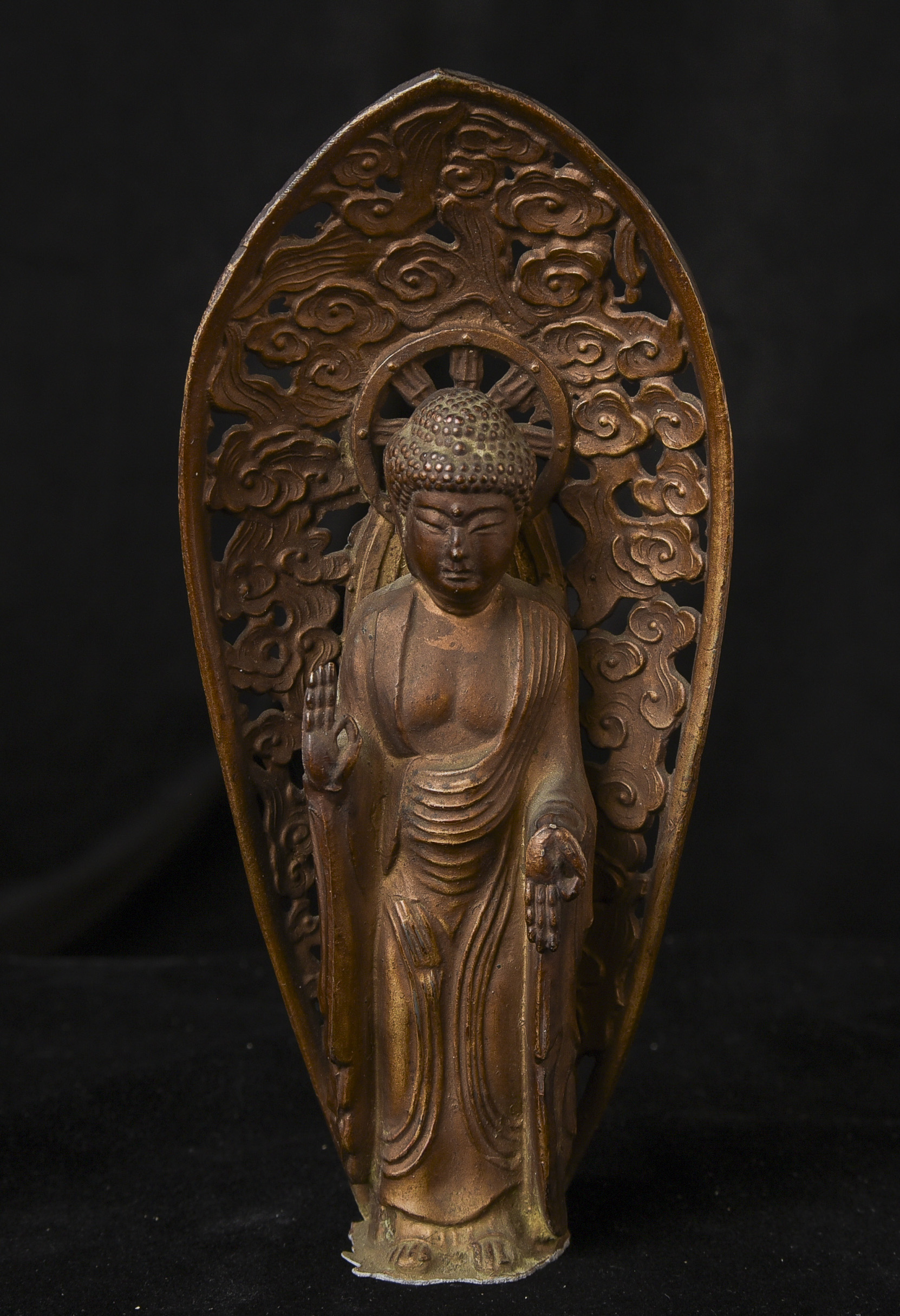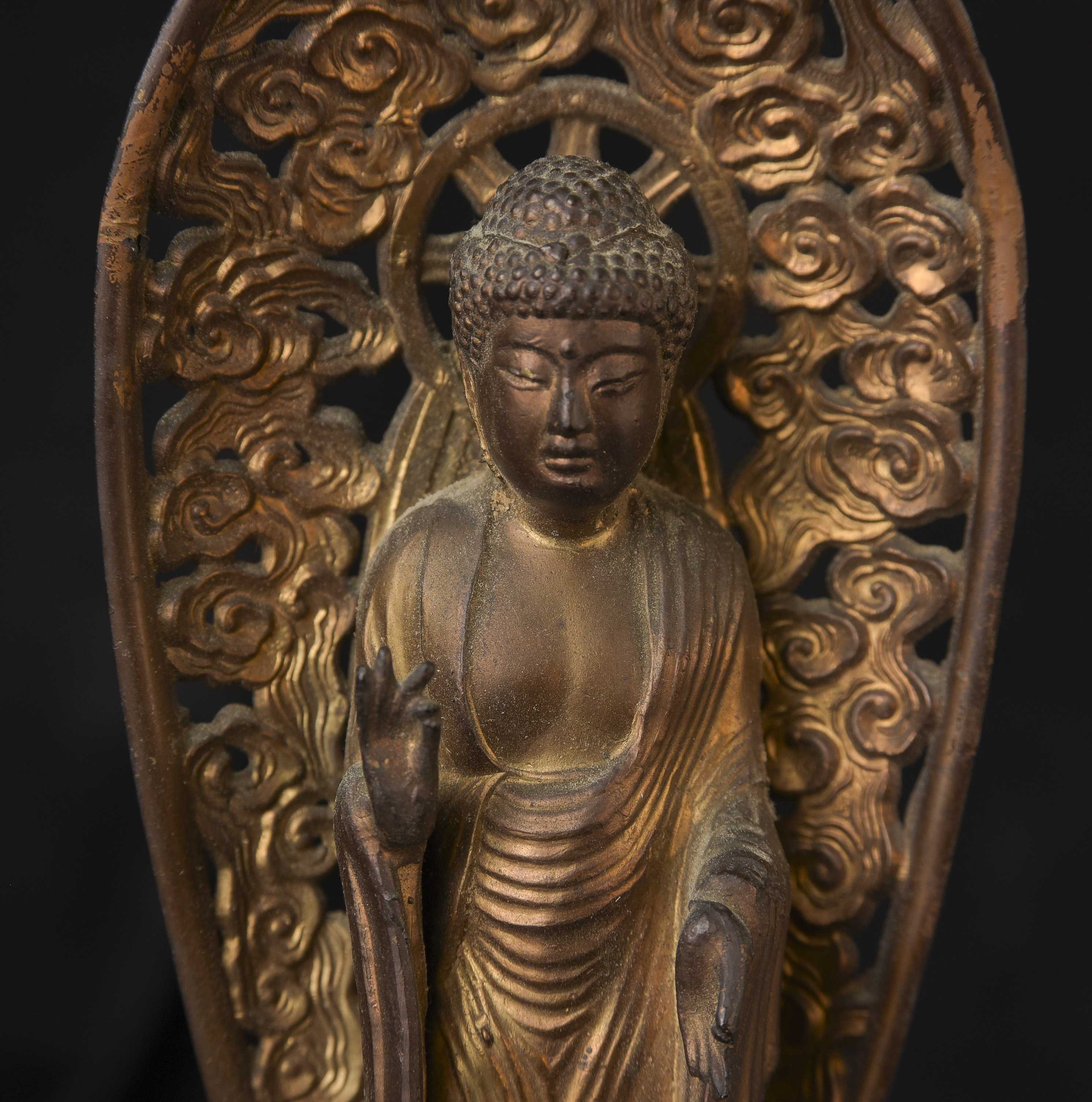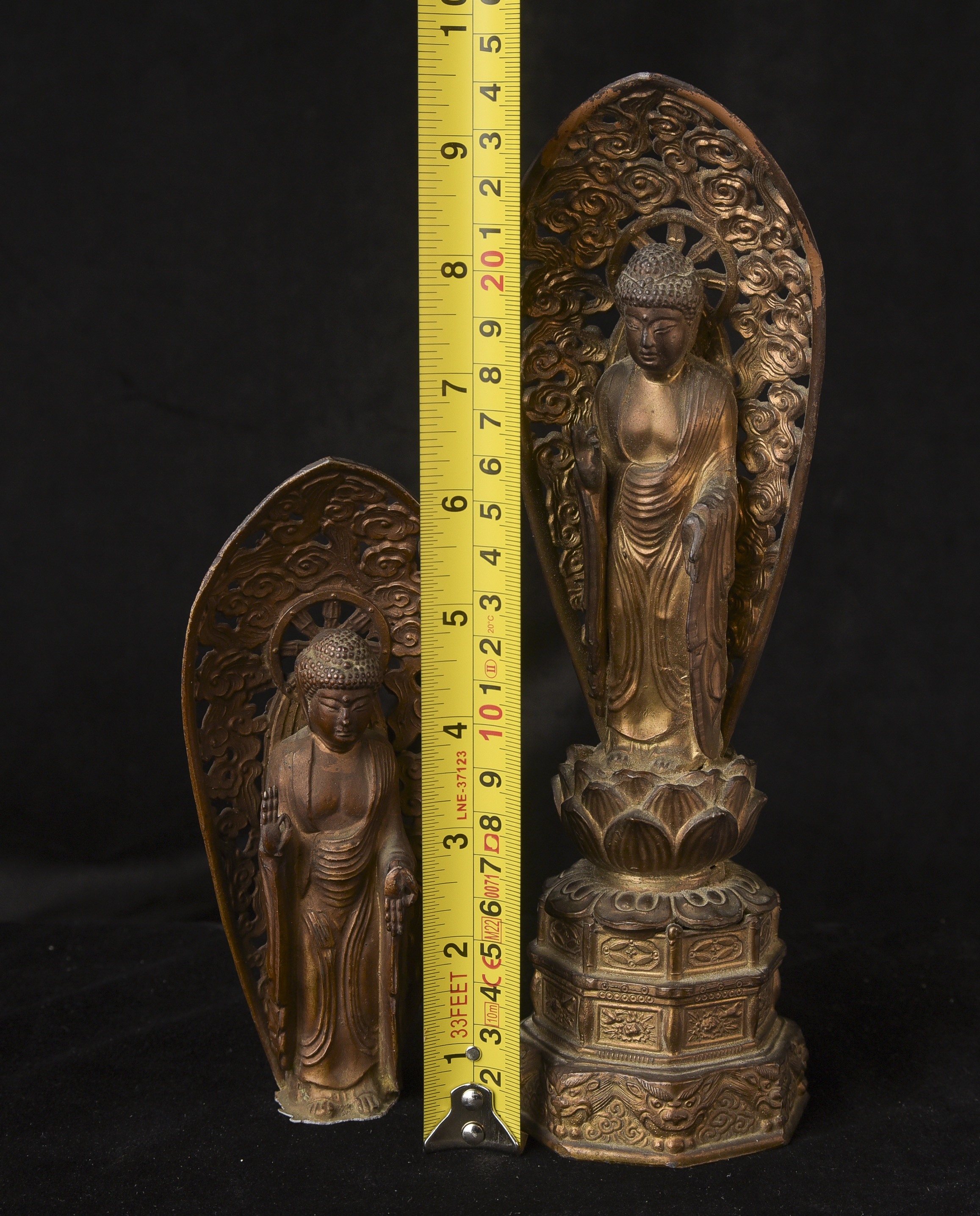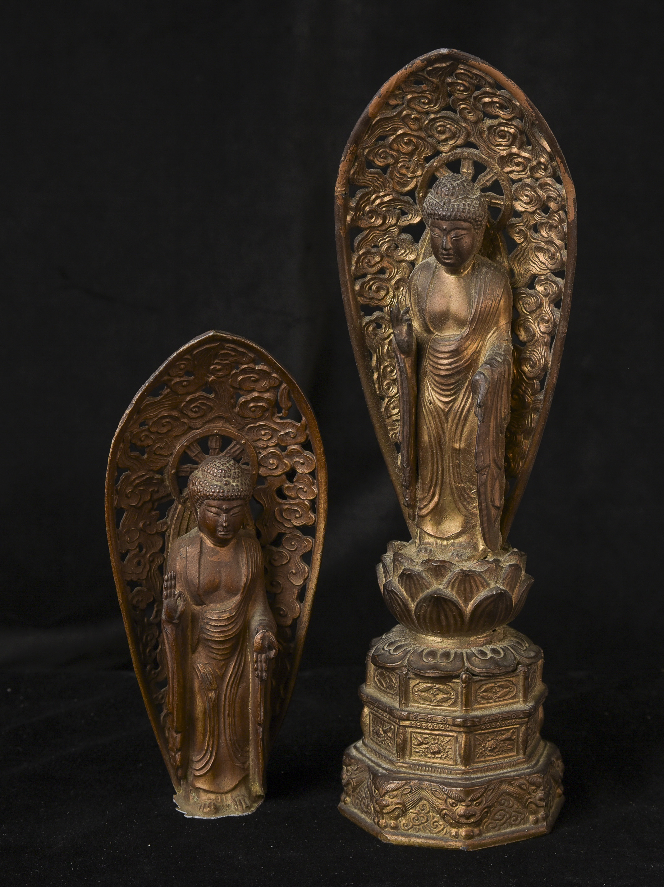 Two 19th/early 20th C Japanese Buddhas. Both are well cast out of a metal I am unfamiliar with, but it is not bronze brass or copper. I believe that both of these were inside shrine boxes for their entire lives up until recently. This is the reason that the applied gold patination is in such good condition. It is emulating gilding, though it is not true gold. I am unfamiliar with this type, but I came across a group of them that all had beautiful faces and really fine detail and I couldn’t resist. The second one originally had a base very similar to the one that has a base, but it must have broken/gotten damage and one of the previous owners decided to remove it. It does stand reasonably well on its own, and if it wasn’t with the other one, you wouldn’t know that it was missing anything. My feeling is that they are late 19th early 20th century. Large ( 9.5"W x 3"W x 3"D ) - 490g. // Small ( 6.25"H x 2.75"W x 1"D ) - 210g.