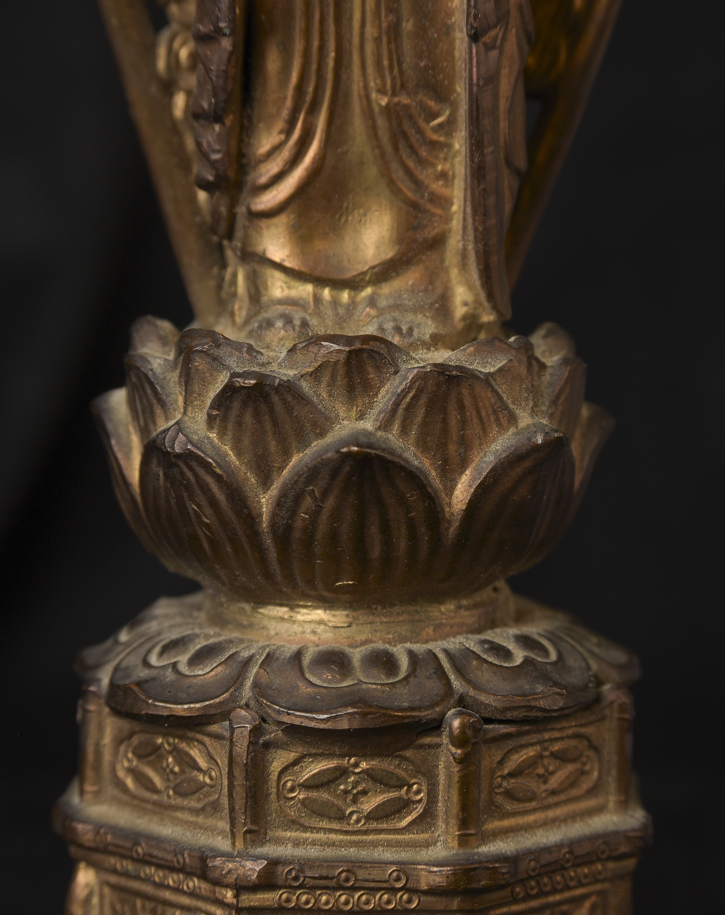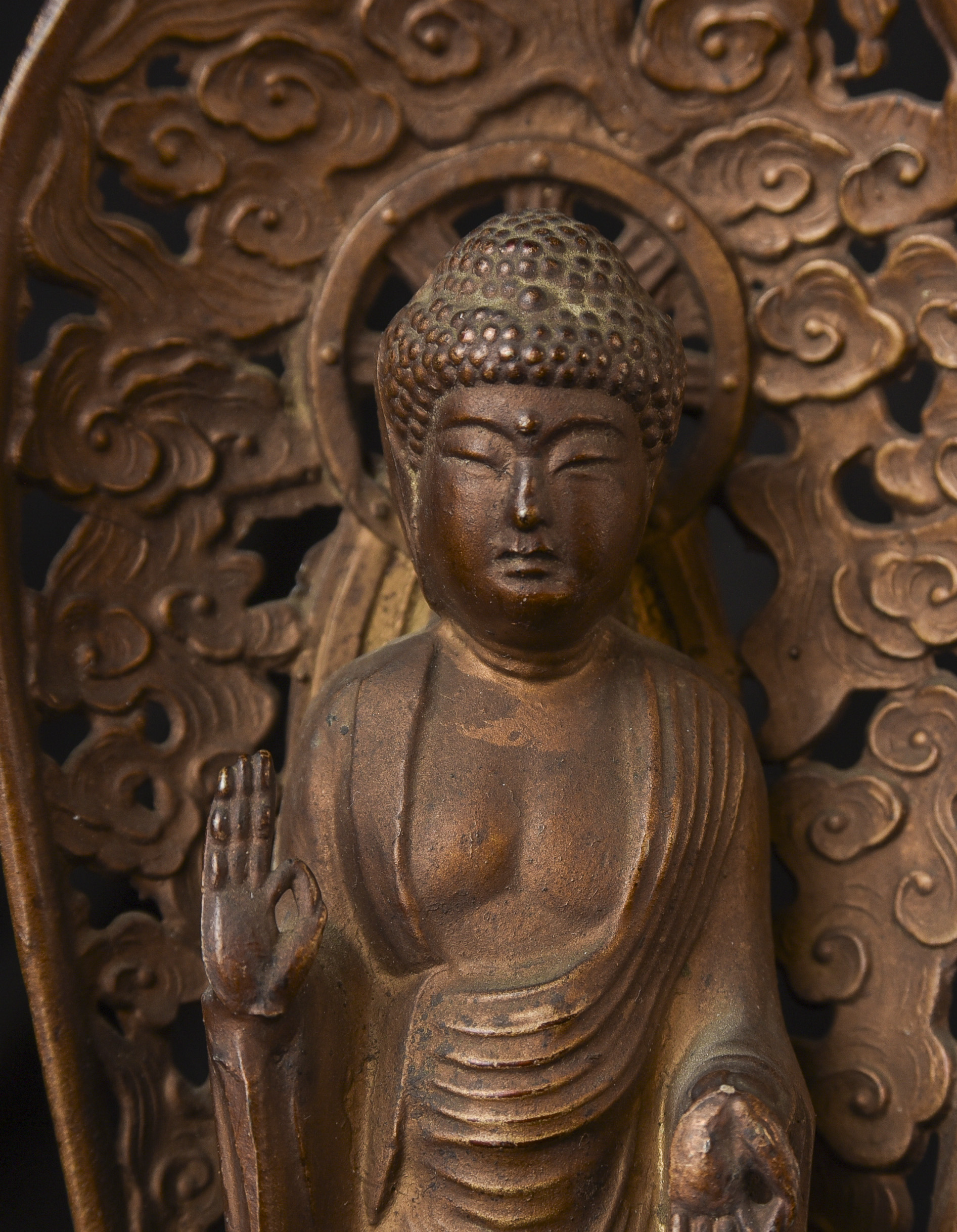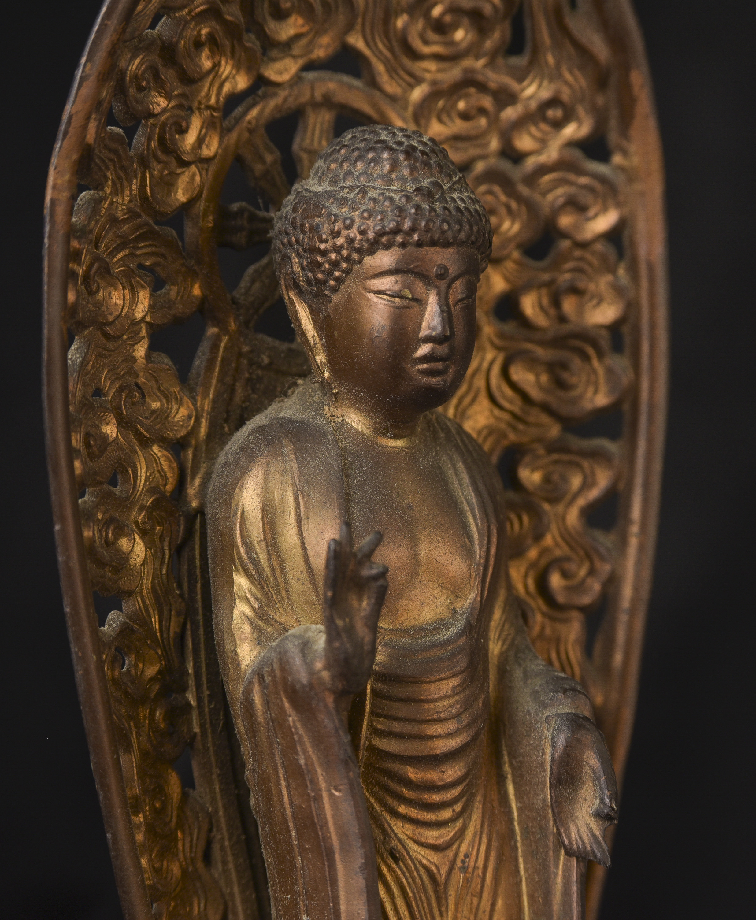 Two 19th/early 20th C Japanese Buddhas. Both are well cast out of a metal I am unfamiliar with, but it is not bronze brass or copper. I believe that both of these were inside shrine boxes for their entire lives up until recently. This is the reason that the applied gold patination is in such good condition. It is emulating gilding, though it is not true gold. I am unfamiliar with this type, but I came across a group of them that all had beautiful faces and really fine detail and I couldn’t resist. The second one originally had a base very similar to the one that has a base, but it must have broken/gotten damage and one of the previous owners decided to remove it. It does stand reasonably well on its own, and if it wasn’t with the other one, you wouldn’t know that it was missing anything. My feeling is that they are late 19th early 20th century. Large ( 9.5"W x 3"W x 3"D ) - 490g. // Small ( 6.25"H x 2.75"W x 1"D ) - 210g.