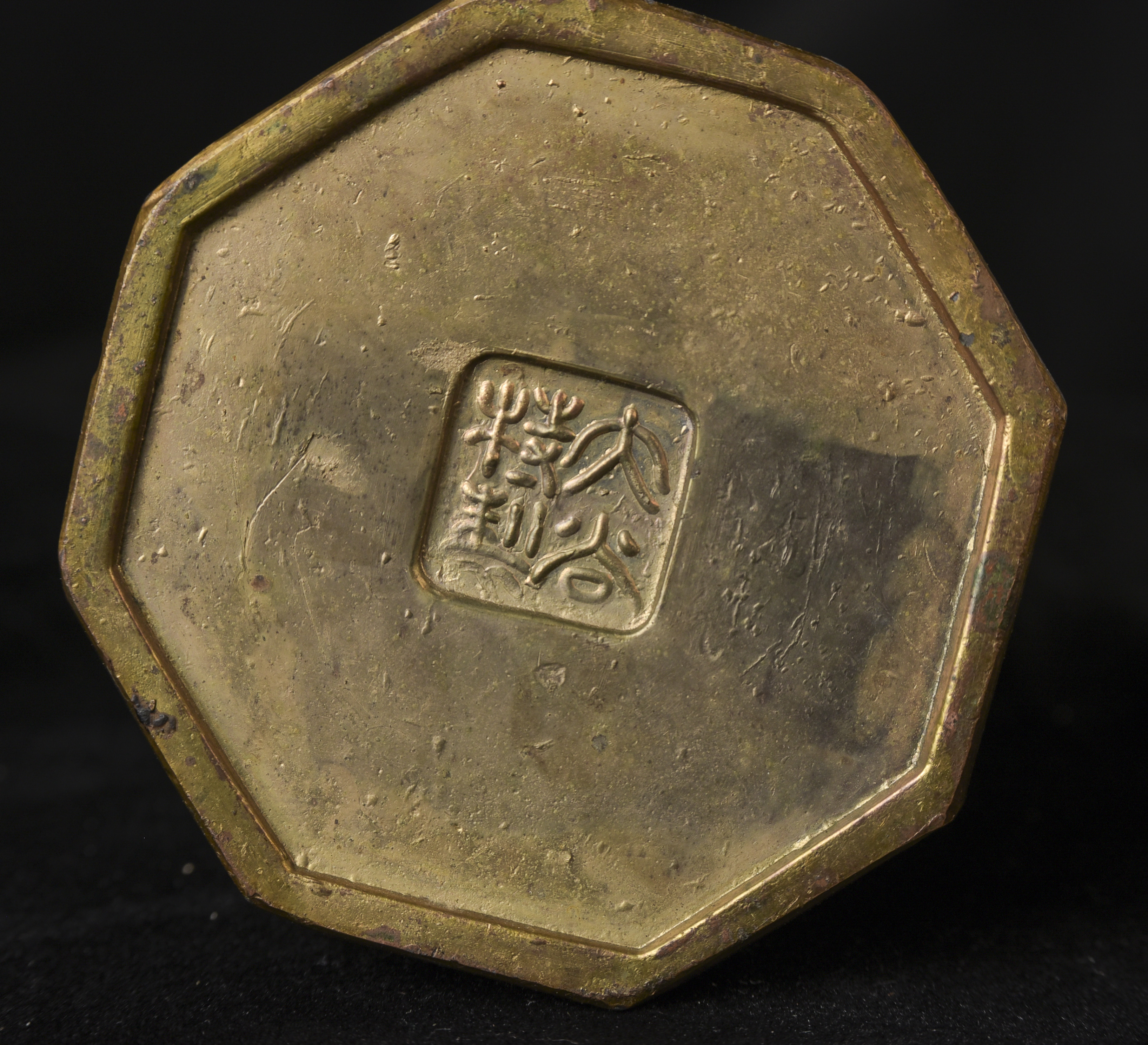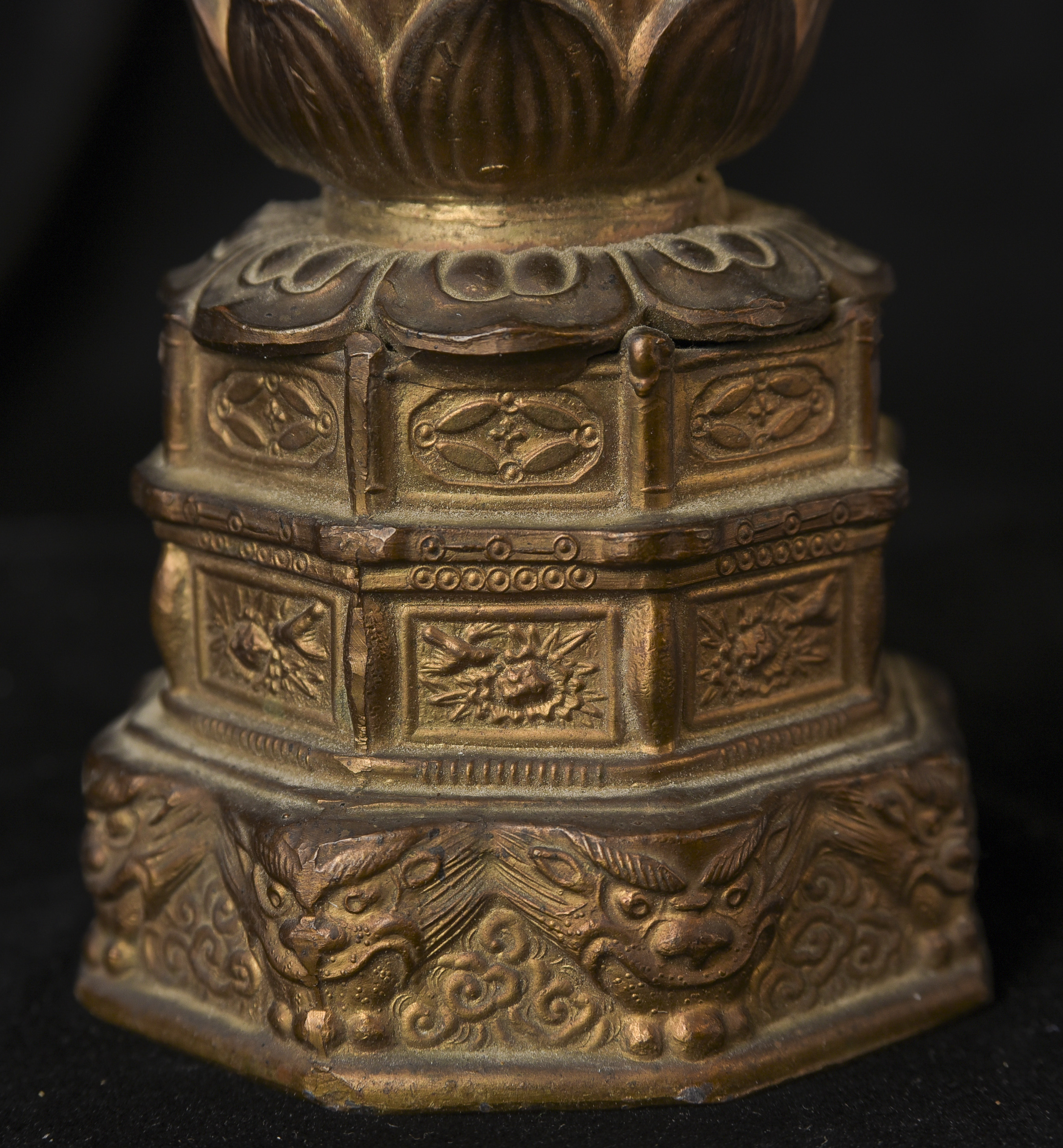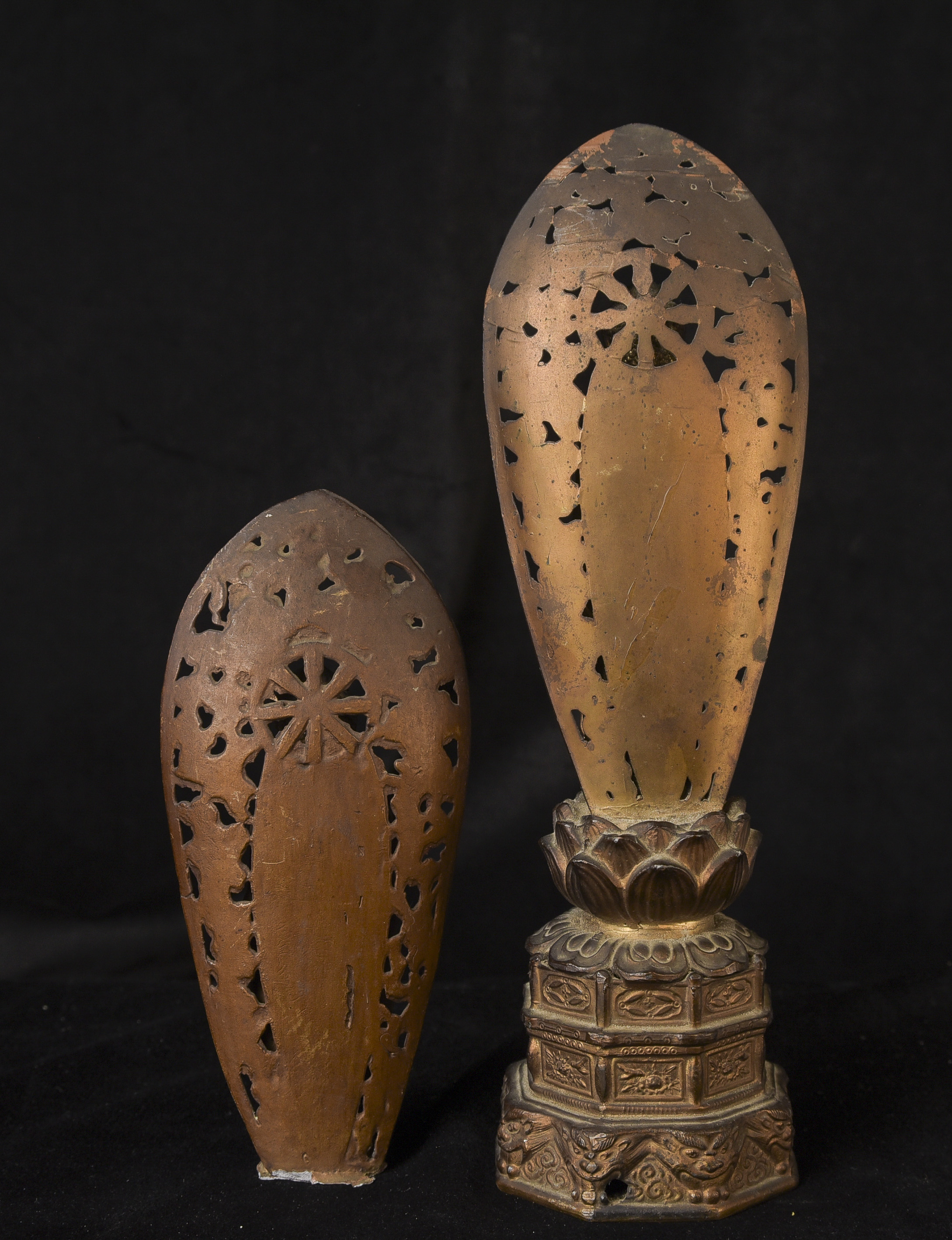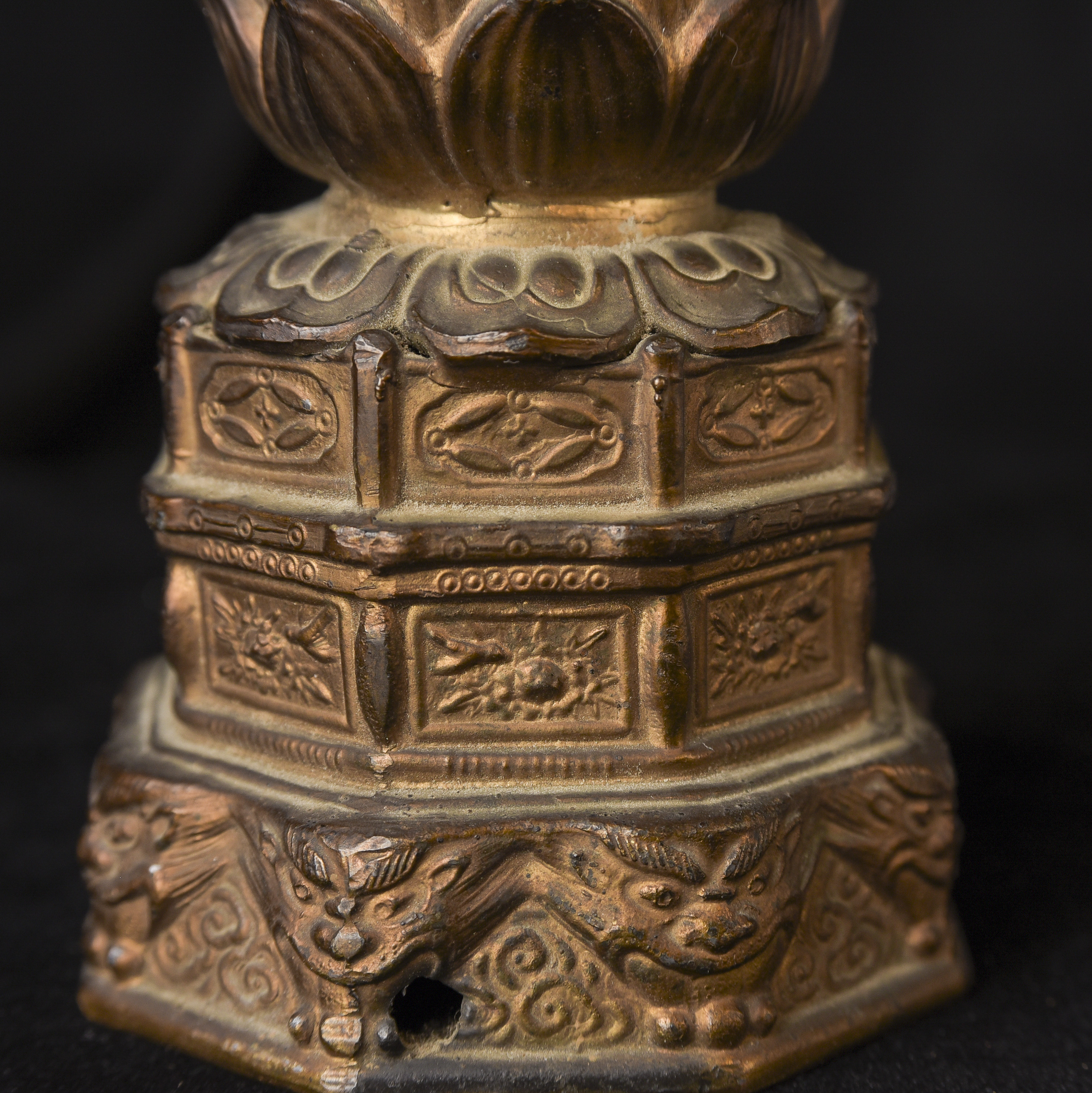 Two 19th/early 20th C Japanese Buddhas. Both are well cast out of a metal I am unfamiliar with, but it is not bronze brass or copper. I believe that both of these were inside shrine boxes for their entire lives up until recently. This is the reason that the applied gold patination is in such good condition. It is emulating gilding, though it is not true gold. I am unfamiliar with this type, but I came across a group of them that all had beautiful faces and really fine detail and I couldn’t resist. The second one originally had a base very similar to the one that has a base, but it must have broken/gotten damage and one of the previous owners decided to remove it. It does stand reasonably well on its own, and if it wasn’t with the other one, you wouldn’t know that it was missing anything. My feeling is that they are late 19th early 20th century. Large ( 9.5"W x 3"W x 3"D ) - 490g. // Small ( 6.25"H x 2.75"W x 1"D ) - 210g.