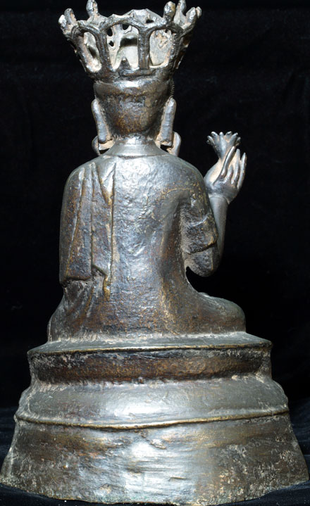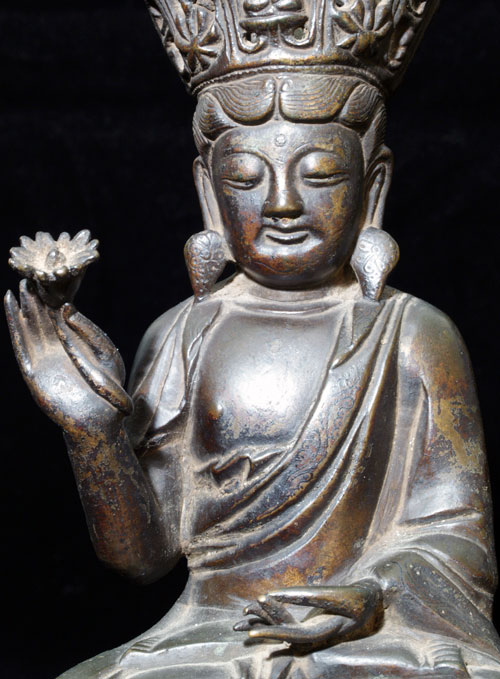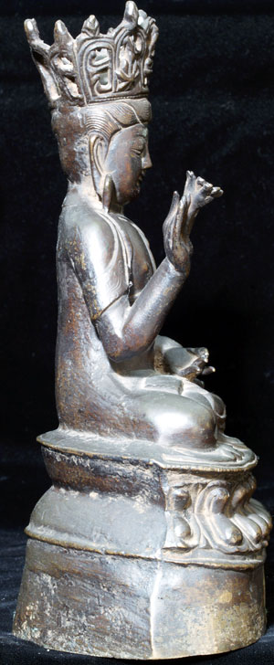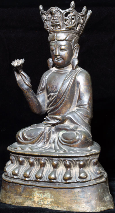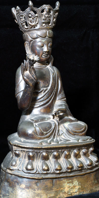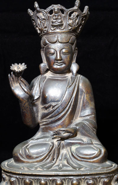 Finely cast 18thC Buddha of Compaasion. Notice the fine detail in the flower, the scroll work in the robe and earings, and in the small Buddha in the crown. Superb face and delicate hands. Excellent condition- some loss to the tips of the cown, and wear to the lacquer and patina on the base, as can be seen in the photos-otherwise perfect. An outstanding example of its type. Sits 8.5 inches tall by 5.35 inches wide. Special item.
