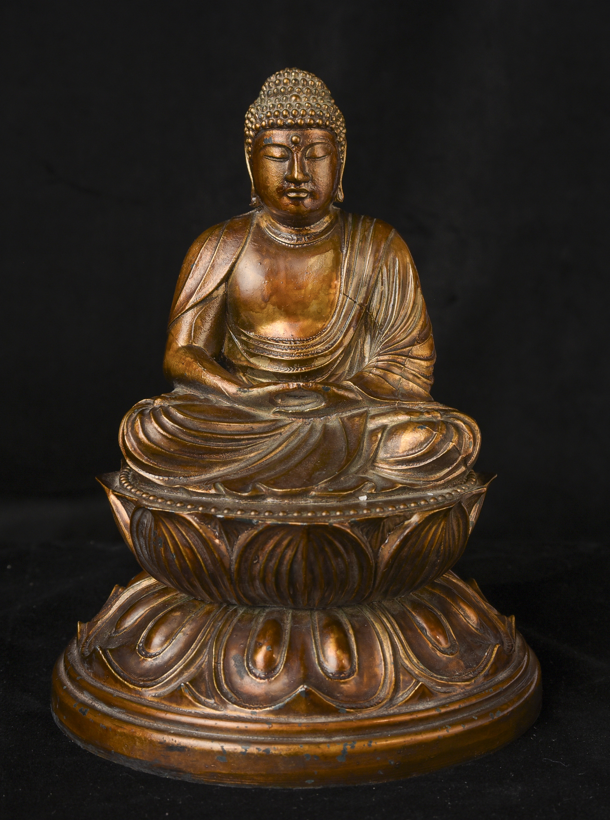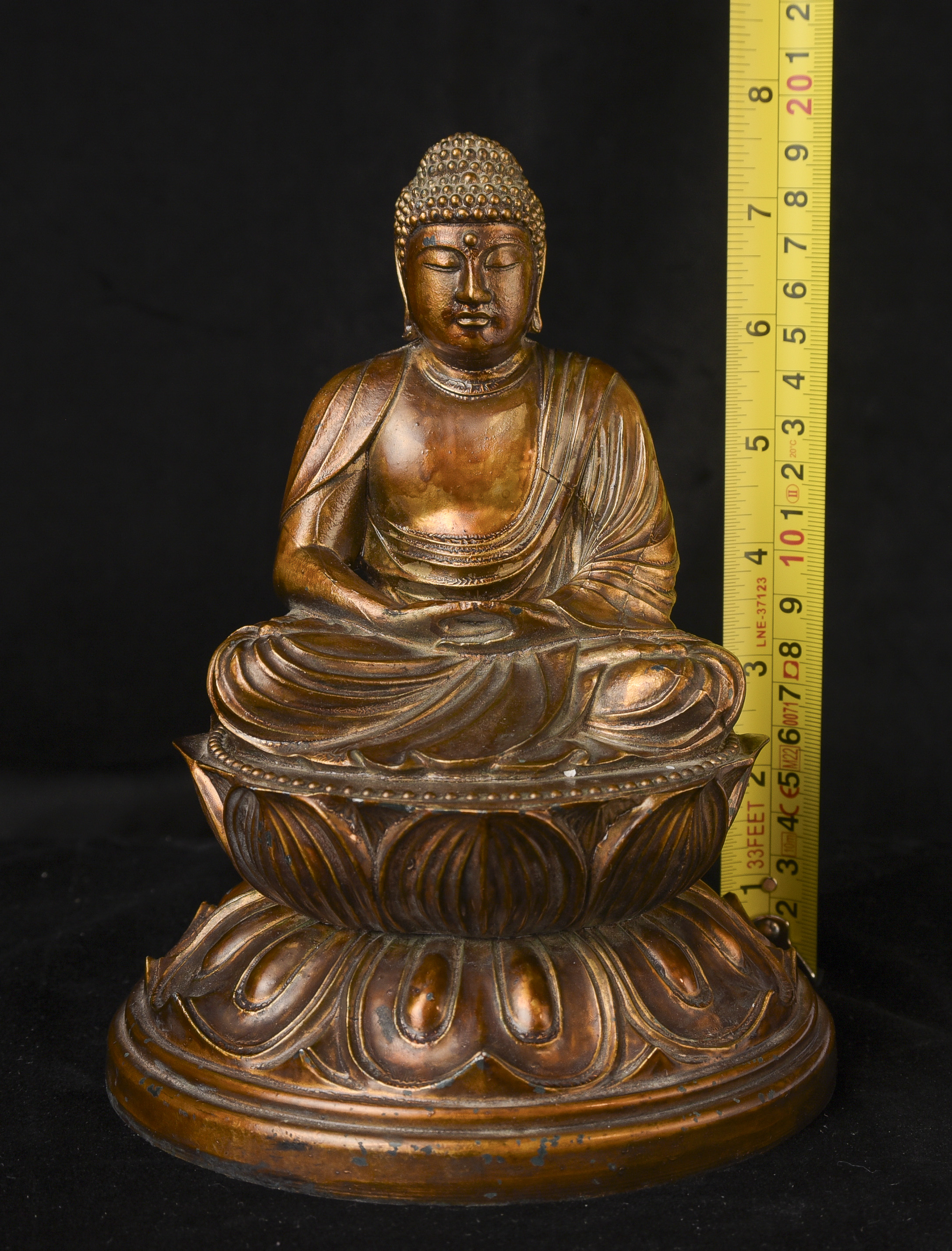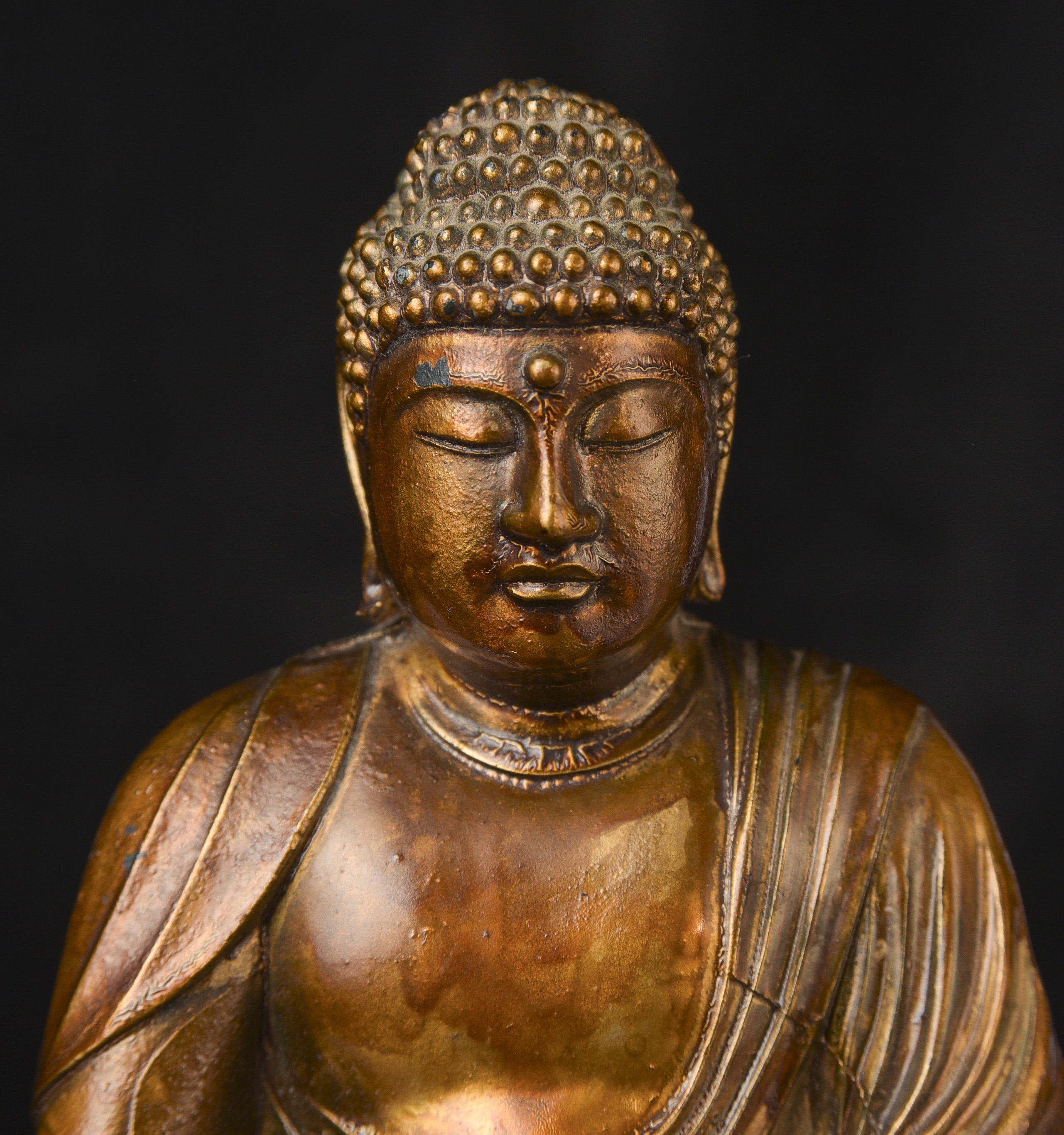 The Japanese Meiji or Taisho Buddha is finely cast and patinated. I am uncertain of the metal it is made of, as it is completely covered with a type of lacquer and gilding that makes it impossible to see the underlying alloy. Based on the weight and sound when you tap on it, it is not bronze. The level of detail the sculptor managed to create is impressive. Check out the photos, and you'll see what I mean. It may have lived much of its life in a shrine box to be in such good condition. Looks to be between 100 and 150 years old. ( 7.75"H x 6"W x 6"D ) - 2.95 lbs. uncommonly, beautiful and remarkably precise and it’s rendering.