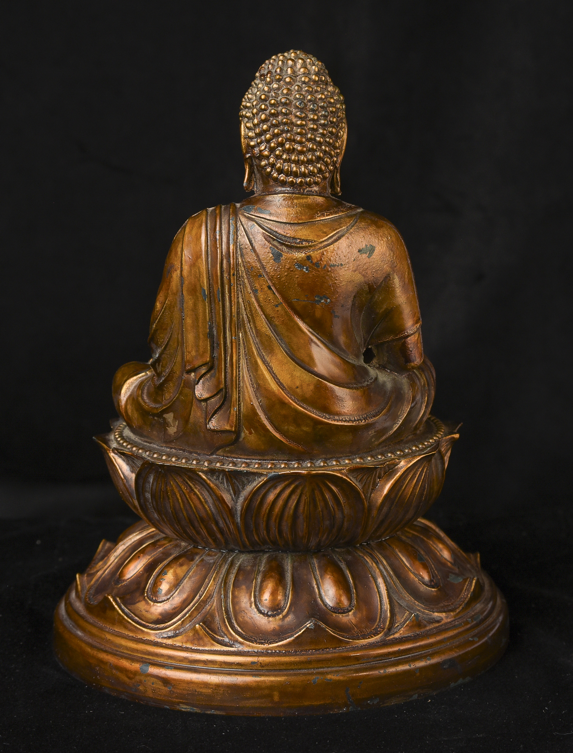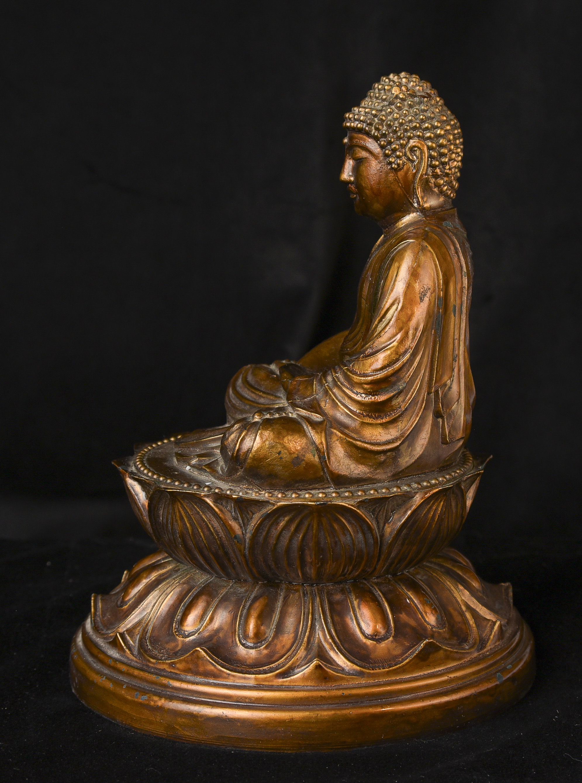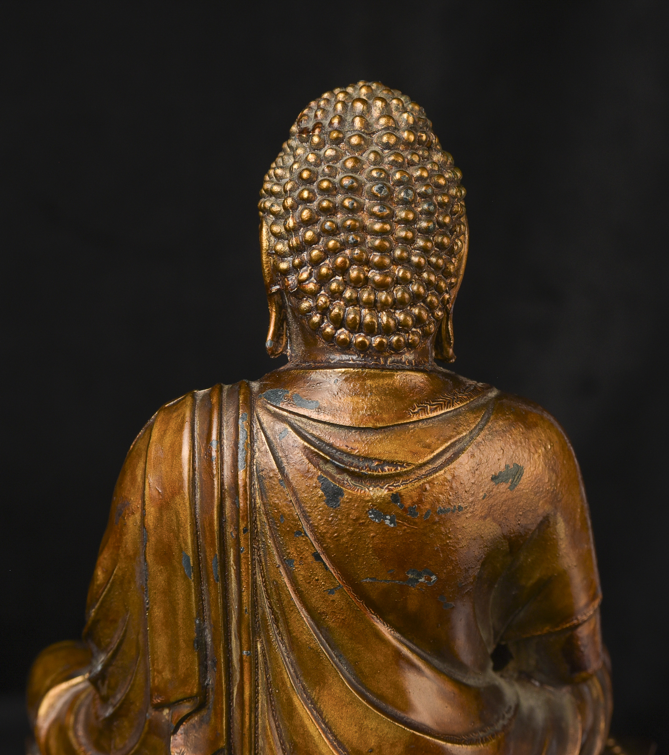 The Japanese Meiji or Taisho Buddha is finely cast and patinated. I am uncertain of the metal it is made of, as it is completely covered with a type of lacquer and gilding that makes it impossible to see the underlying alloy. Based on the weight and sound when you tap on it, it is not bronze. The level of detail the sculptor managed to create is impressive. Check out the photos, and you'll see what I mean. It may have lived much of its life in a shrine box to be in such good condition. Looks to be between 100 and 150 years old. ( 7.75"H x 6"W x 6"D ) - 2.95 lbs. uncommonly, beautiful and remarkably precise and it’s rendering.