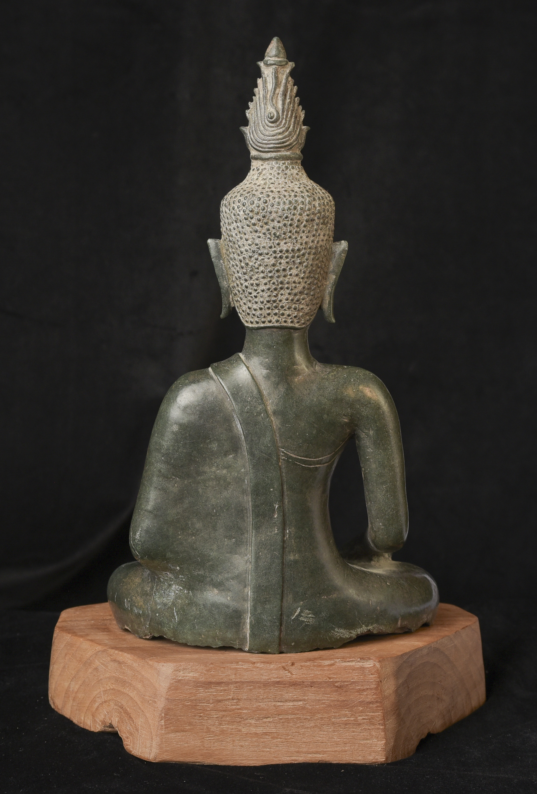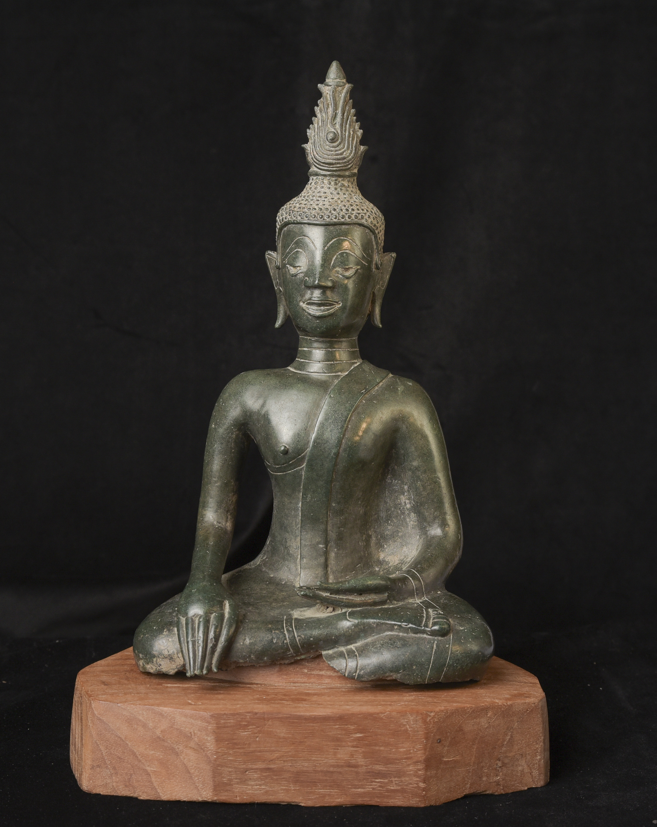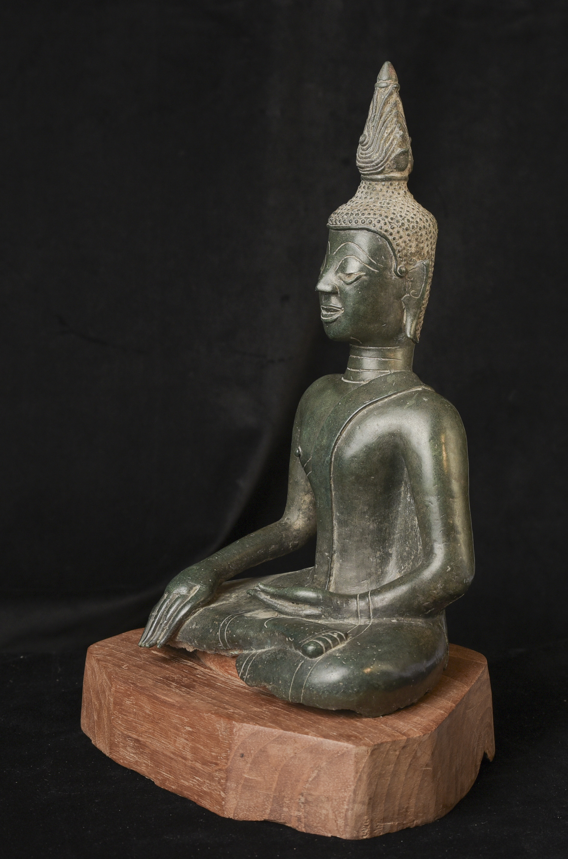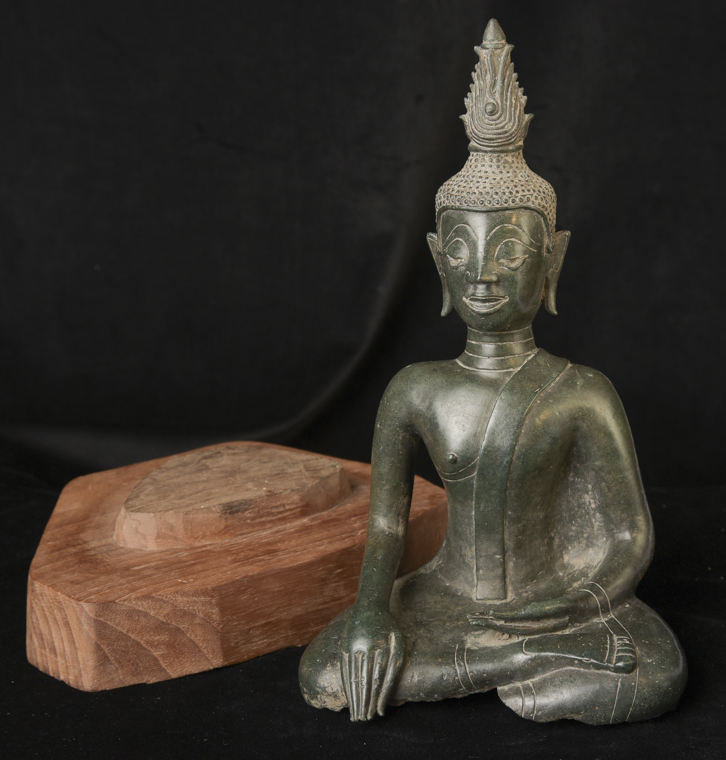 15/16thC Thai Bronze Buddha with "Jade Skin" Patina- the most desirable patina of all -like pure green stone made over hundreds of years as the minerals leach out of the metal and create a stone-like surface. Impossible to fake. Rare-found almost exclusively in Northern Thailand. Fine casting and sculpting. Loss of base and part of one leg (often bases were removed from revered Buddhas during times of shortage and used to make other Buddhas) ( 9.5"H x 5.5"W x 3.75"D ) - 3.78 lbs. // Base: ( 7.25"W x 1.5"H ) - 1 lbs.