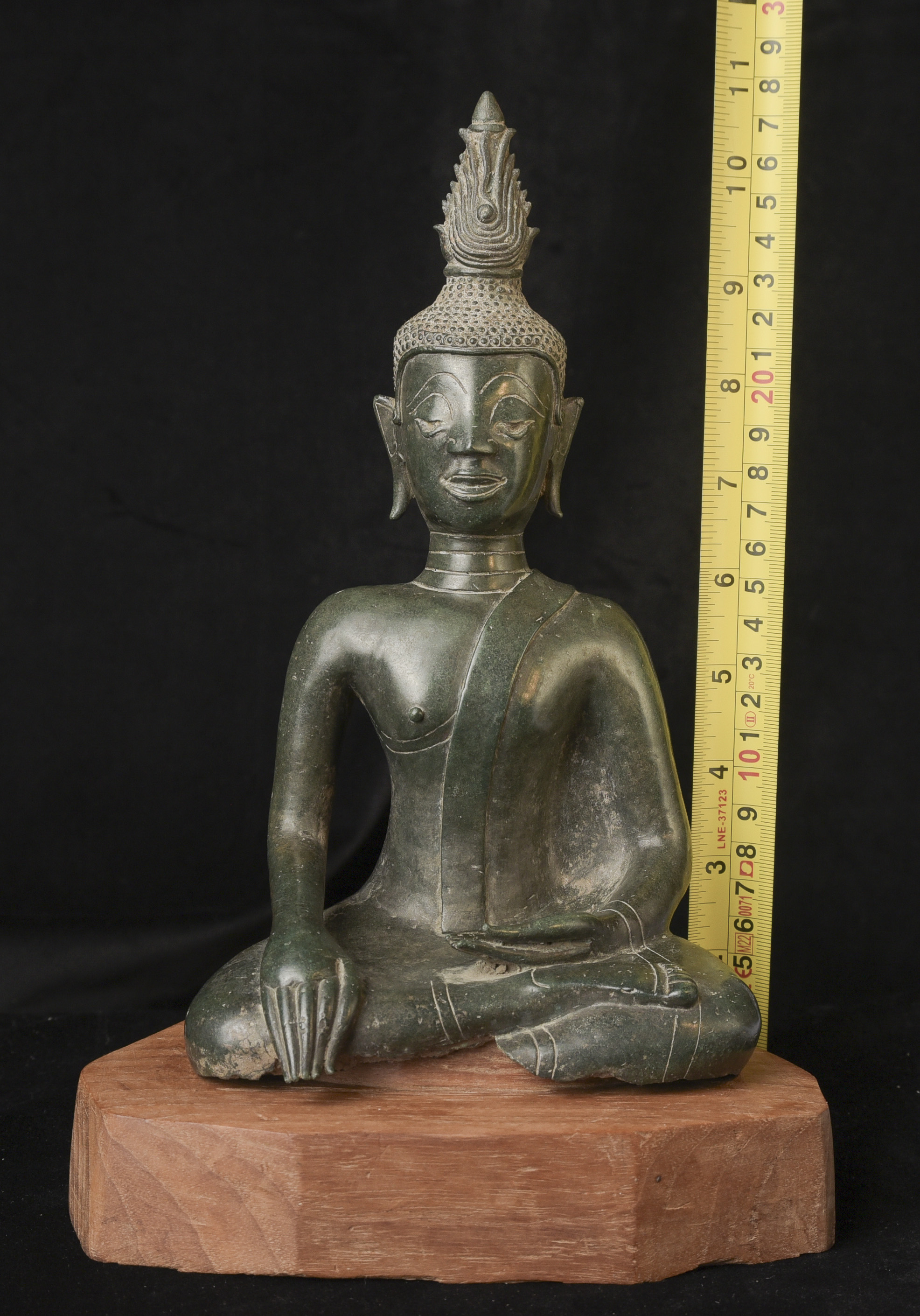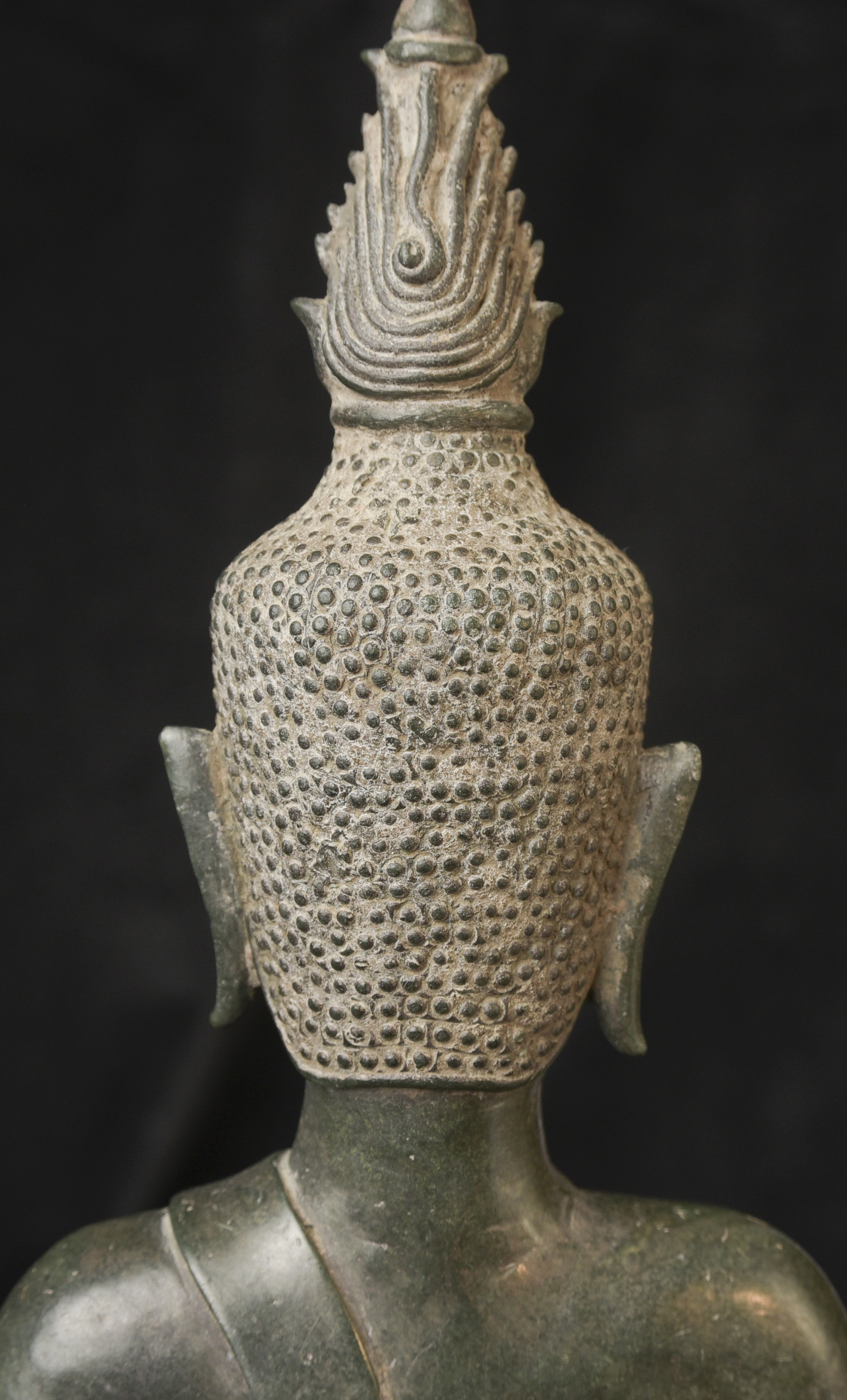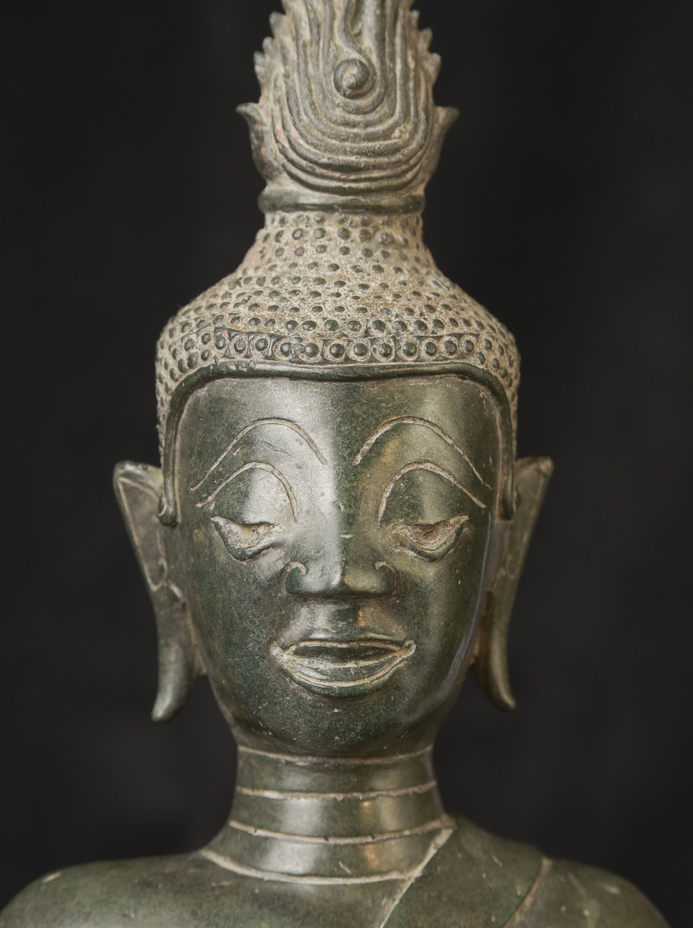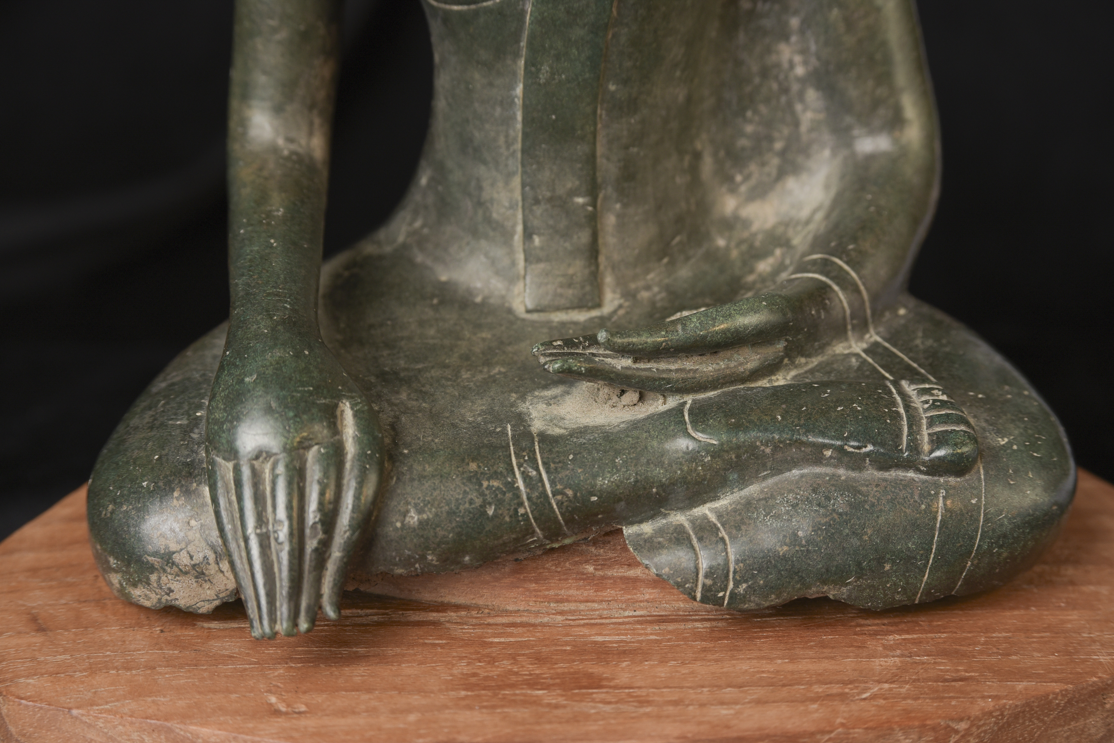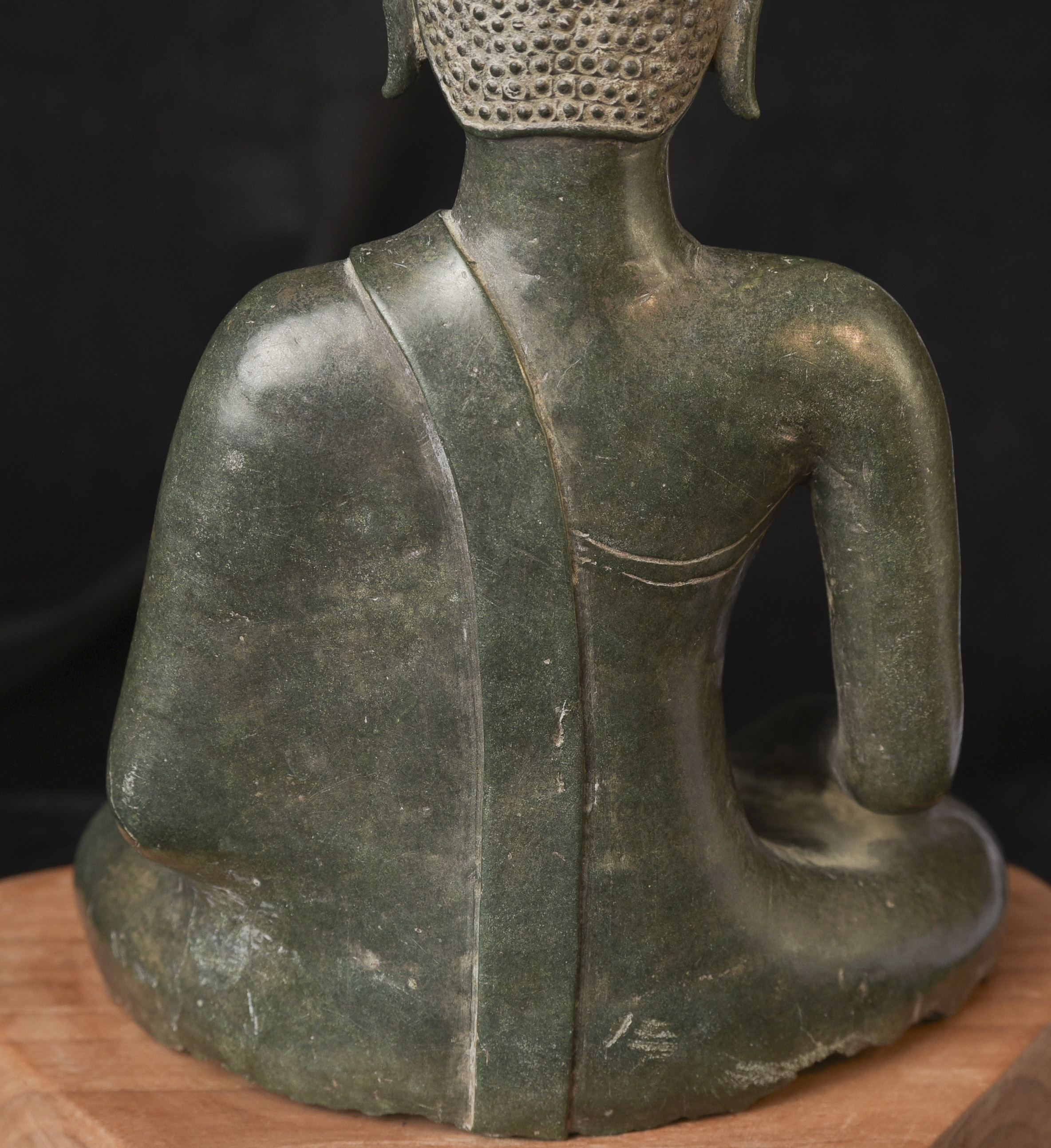 15/16thC Thai Bronze Buddha with "Jade Skin" Patina- the most desirable patina of all -like pure green stone made over hundreds of years as the minerals leach out of the metal and create a stone-like surface. Impossible to fake. Rare-found almost exclusively in Northern Thailand. Fine casting and sculpting. Loss of base and part of one leg (often bases were removed from revered Buddhas during times of shortage and used to make other Buddhas) ( 9.5"H x 5.5"W x 3.75"D ) - 3.78 lbs. // Base: ( 7.25"W x 1.5"H ) - 1 lbs.