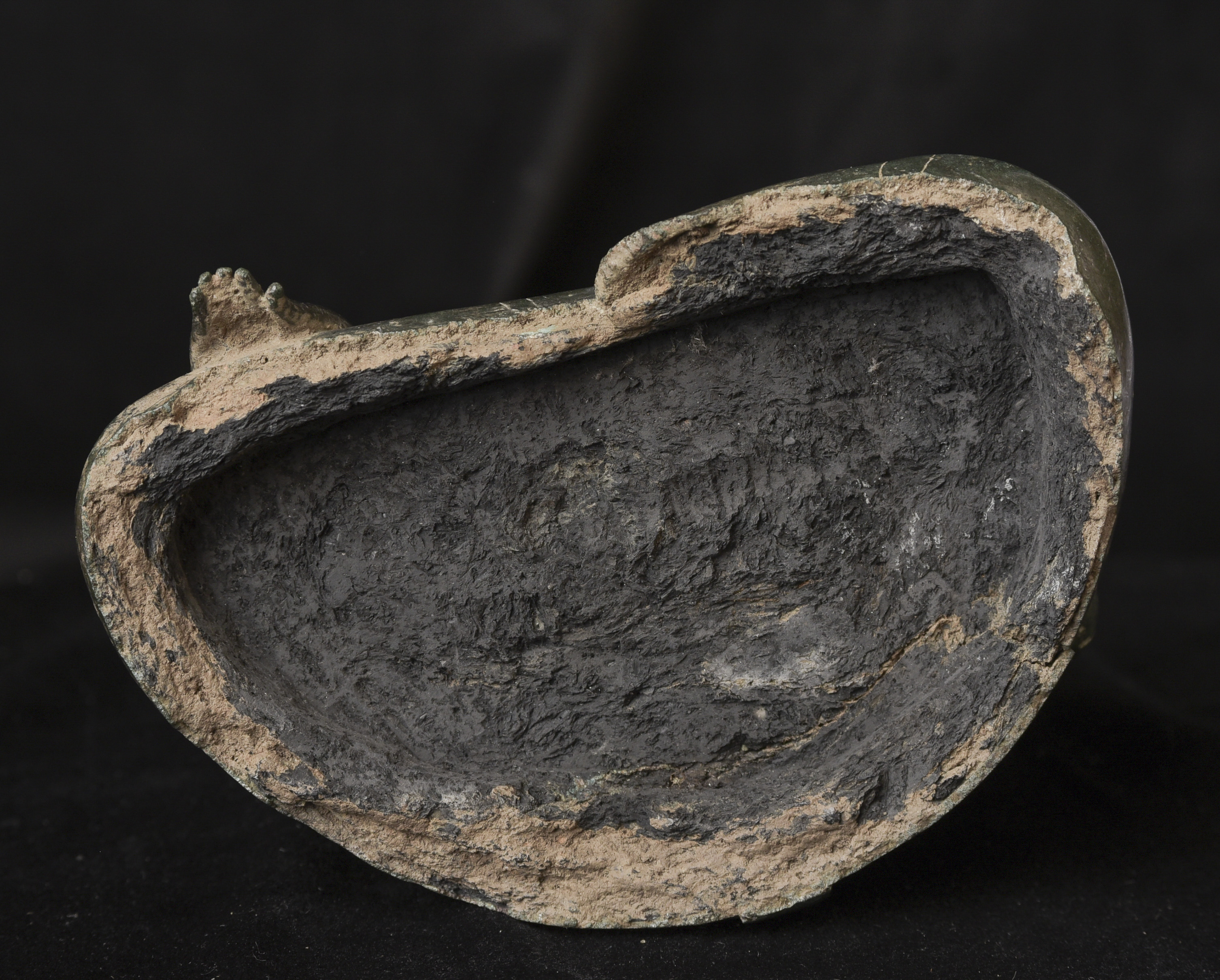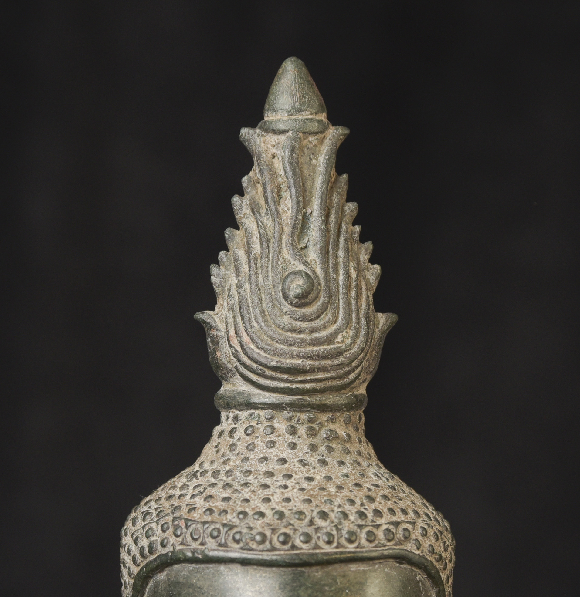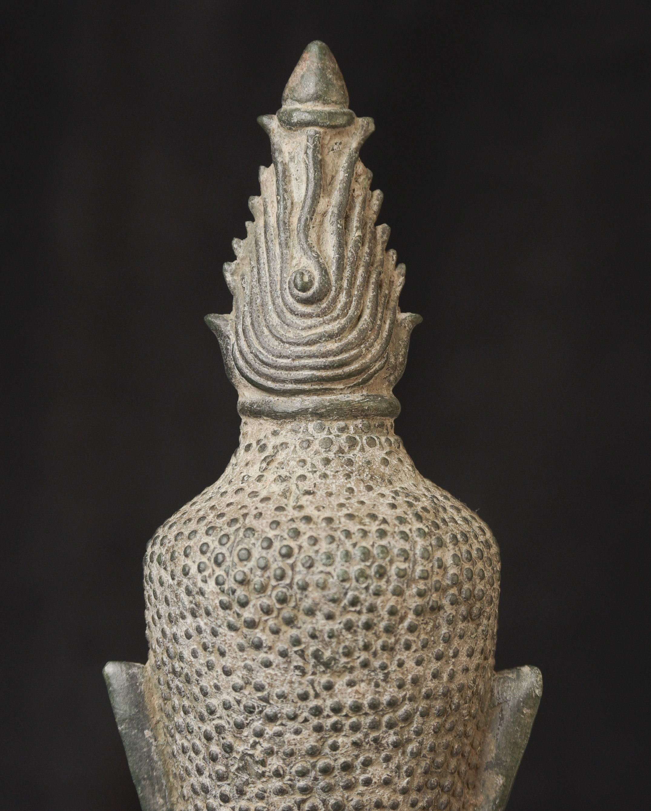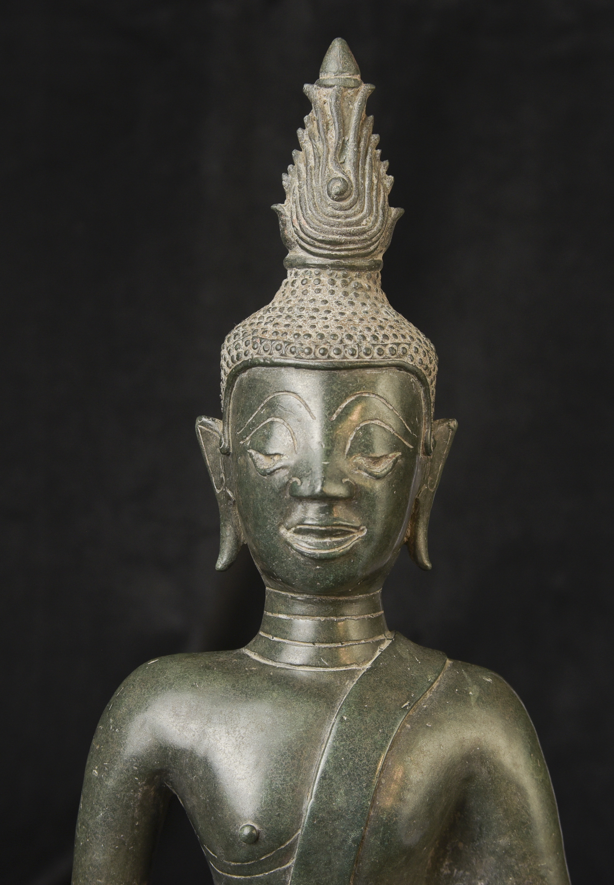 15/16thC Thai Bronze Buddha with "Jade Skin" Patina- the most desirable patina of all -like pure green stone made over hundreds of years as the minerals leach out of the metal and create a stone-like surface. Impossible to fake. Rare-found almost exclusively in Northern Thailand. Fine casting and sculpting. Loss of base and part of one leg (often bases were removed from revered Buddhas during times of shortage and used to make other Buddhas) ( 9.5"H x 5.5"W x 3.75"D ) - 3.78 lbs. // Base: ( 7.25"W x 1.5"H ) - 1 lbs.
