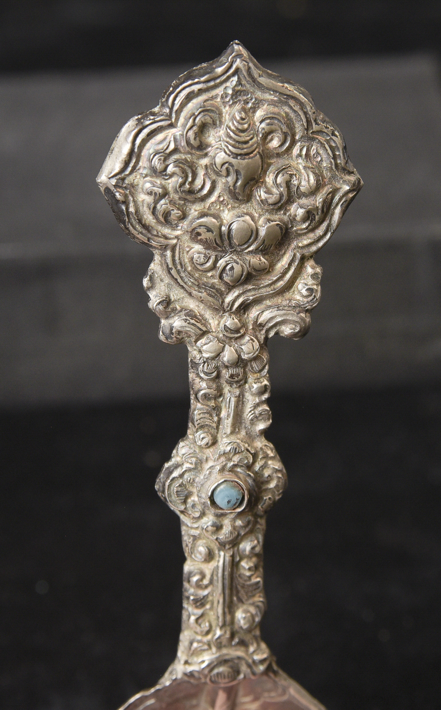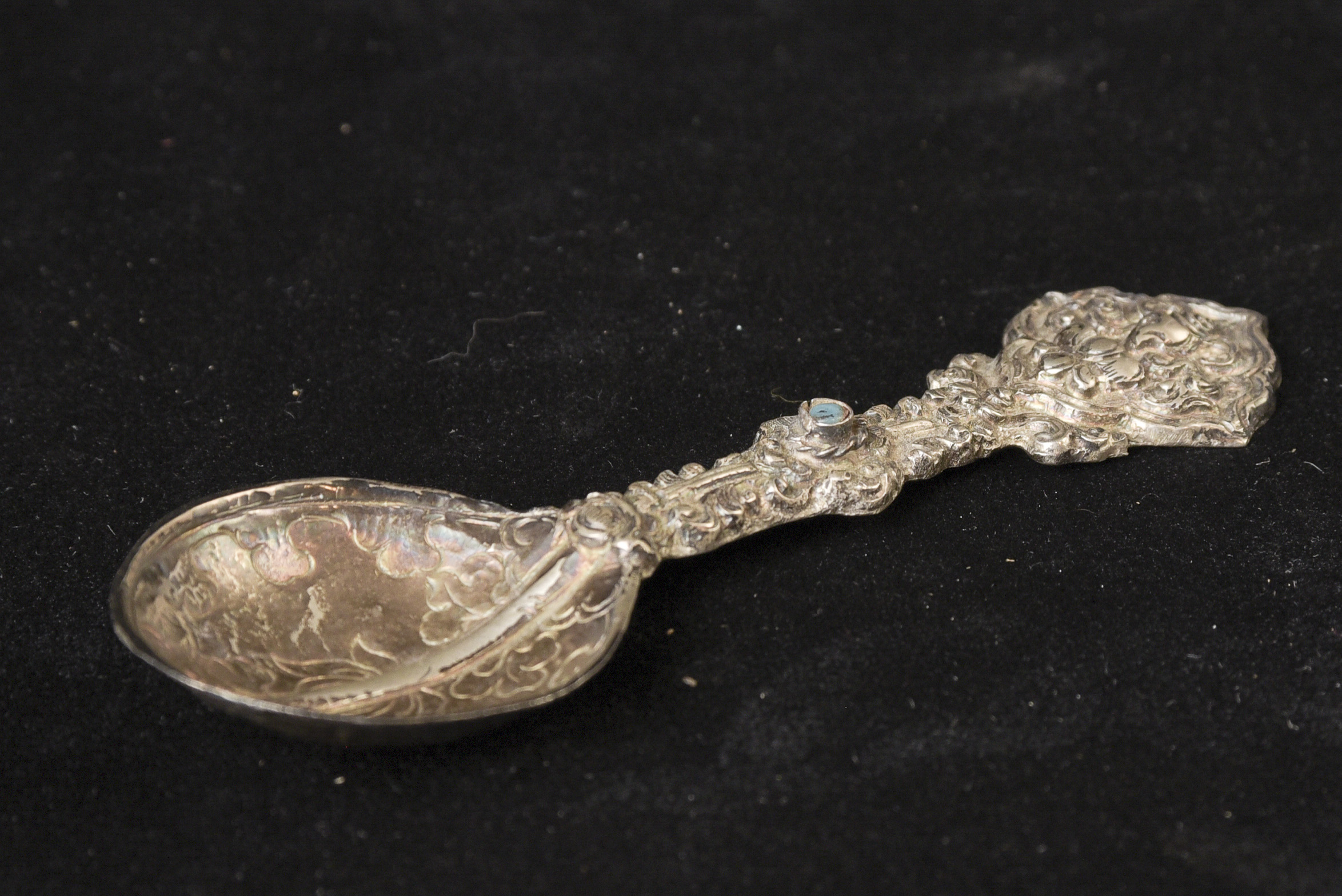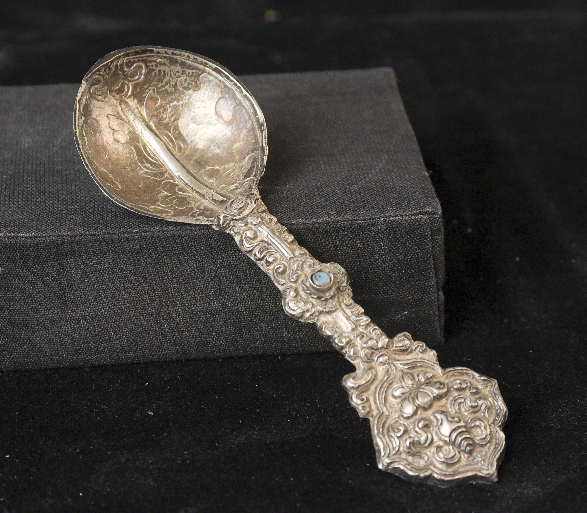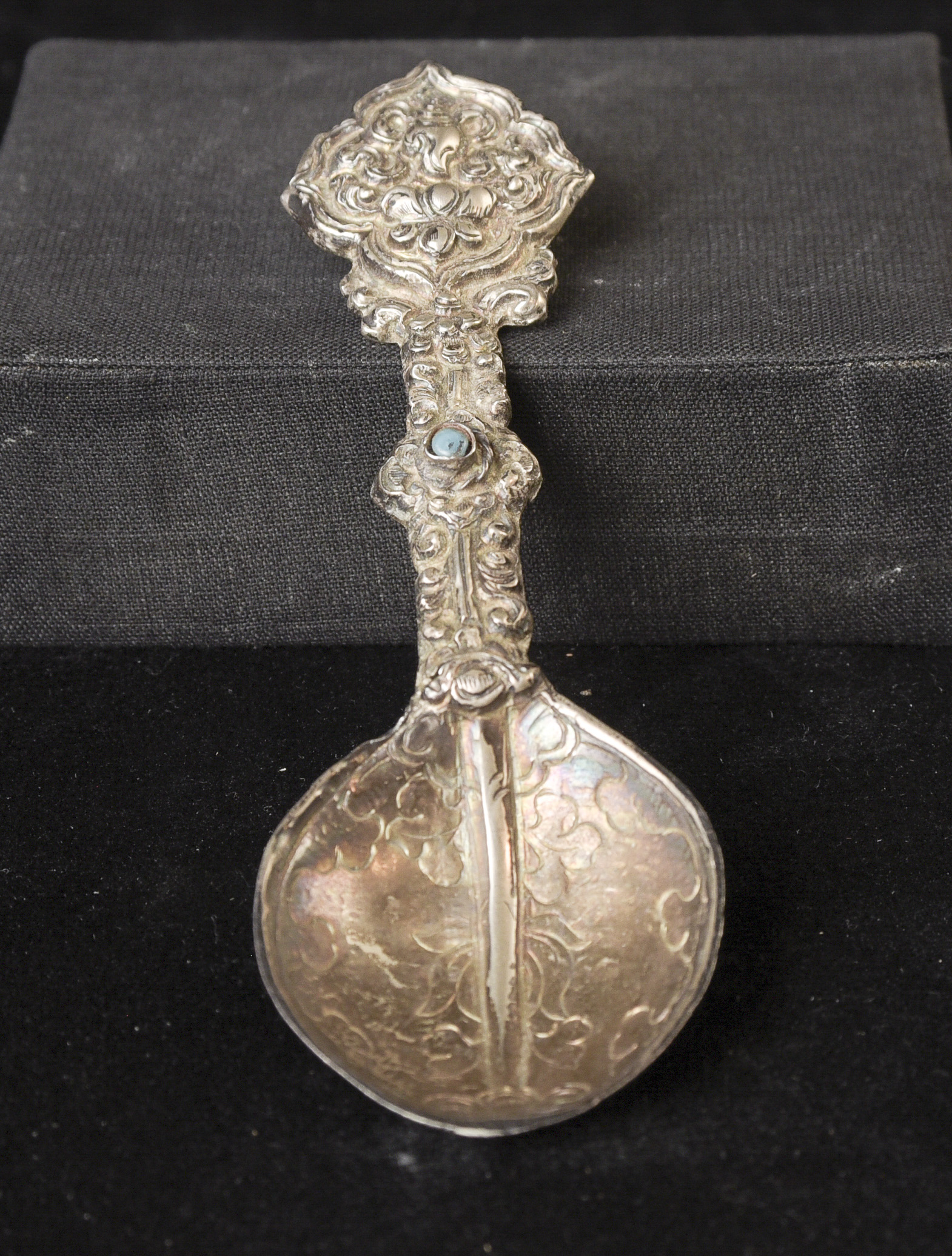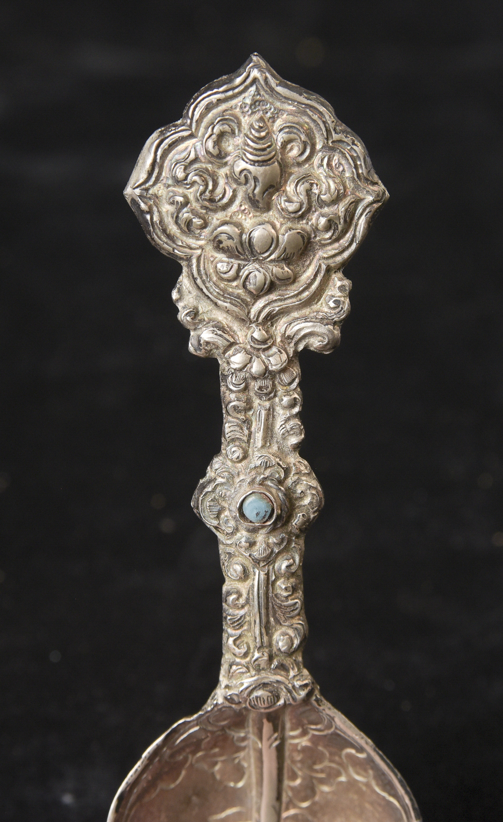Indian handcrafted silver anointing spoon with in laid stone. Nice example.( 4.75"H x 1.5"W ) - 20.