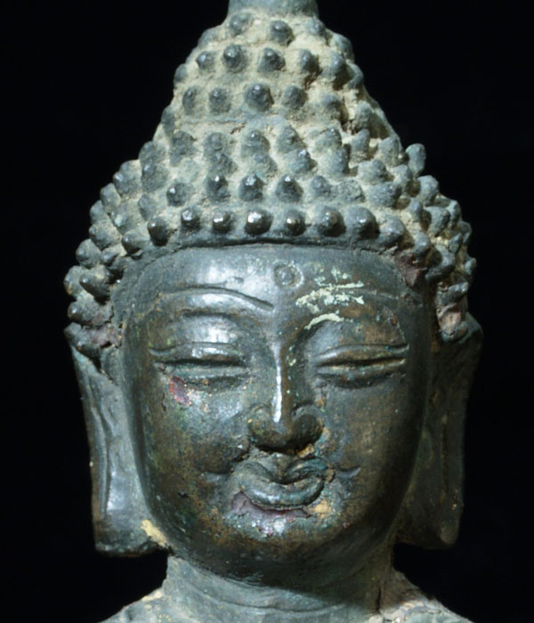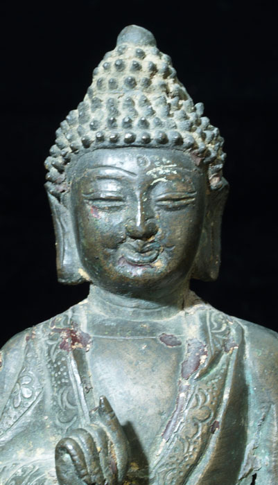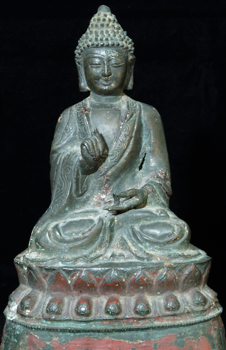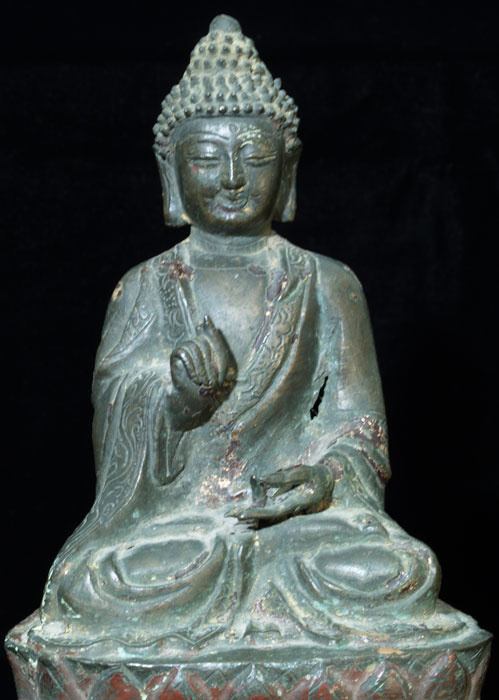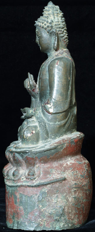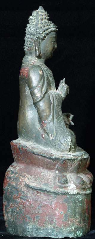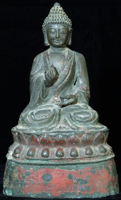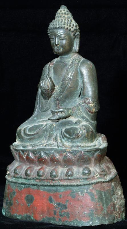 Nice 18thC Chinese bronze Buddha with unusual base and nice robes. Remains of red lacquer and gilding. There are lots of fakes out there- this one is easy to identify as the real thing! Sits 8.5 inches tall by 5.5 inches wide at the base.