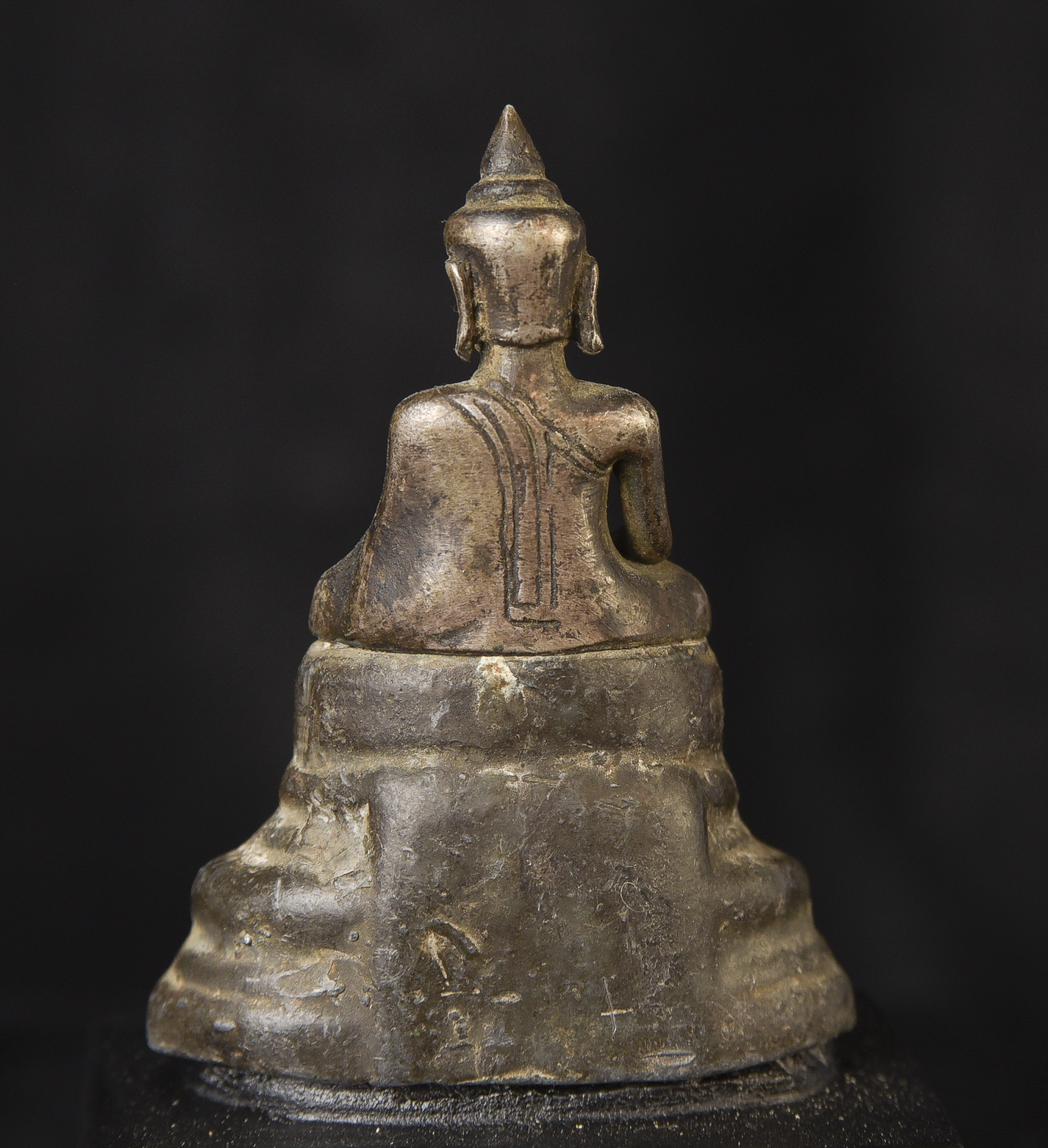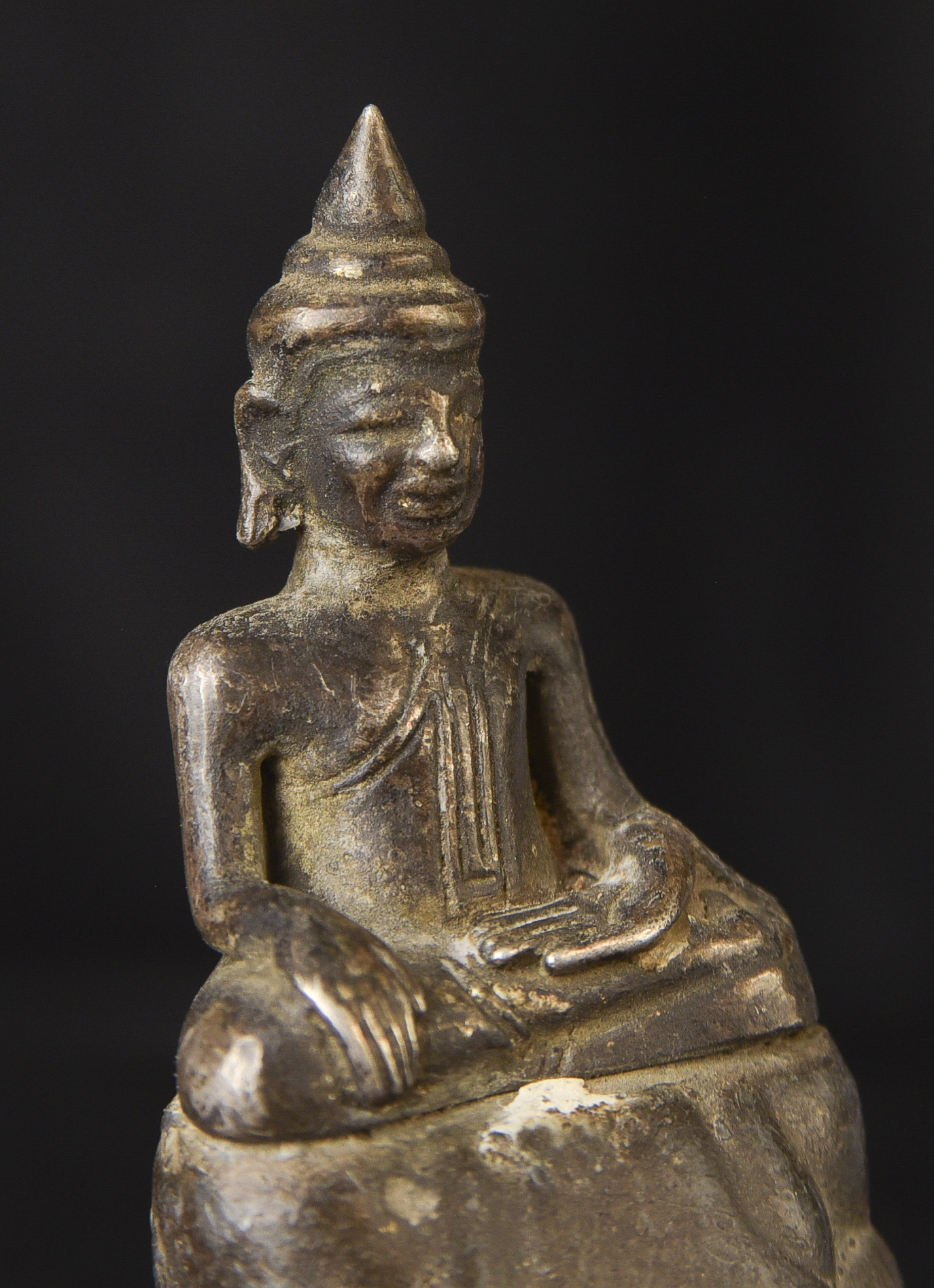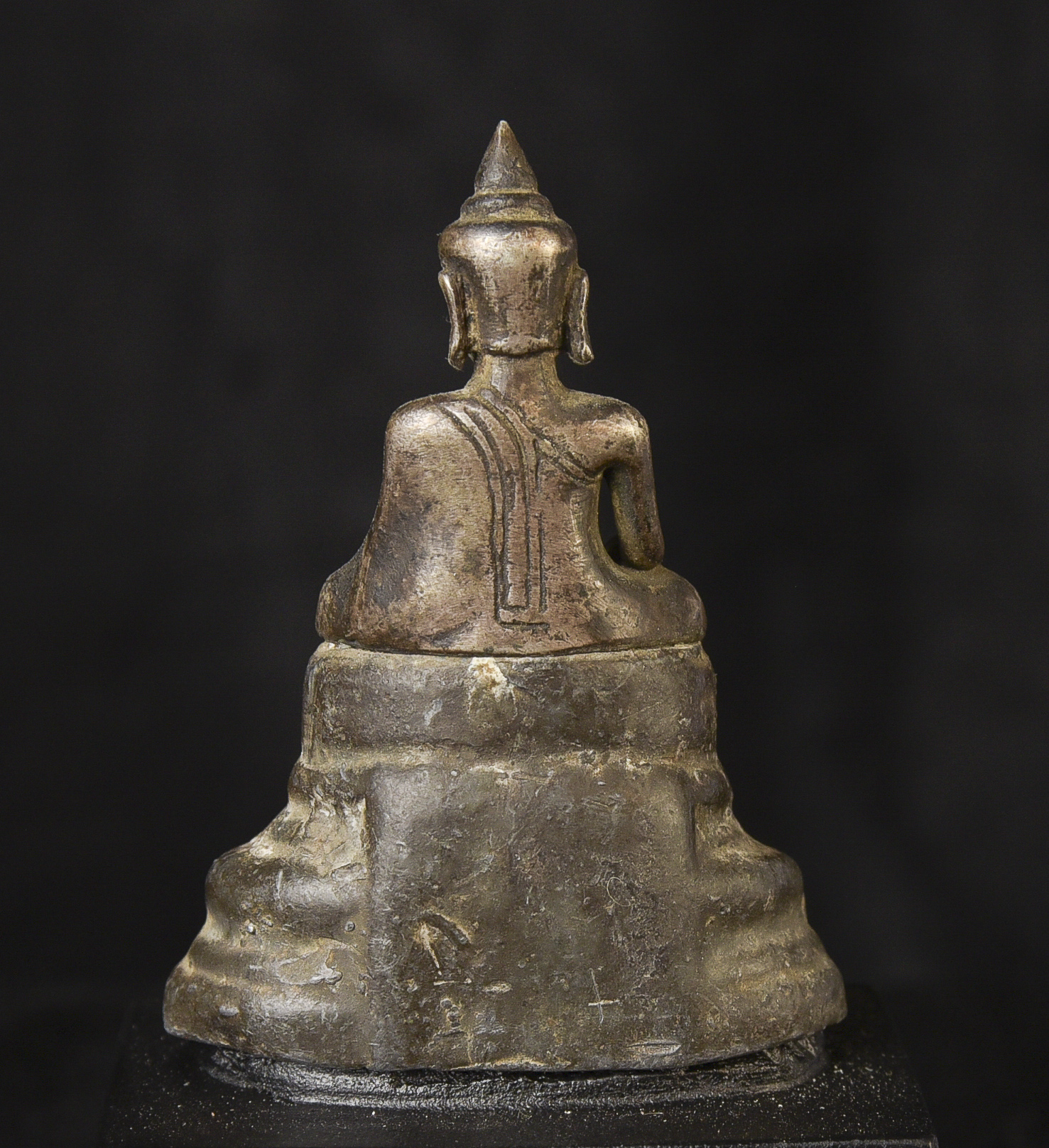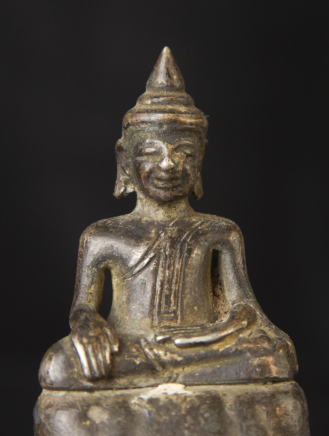 Solid silver 17/18thC Cambodian Silver Buddha on a lead alloy (?) base. Measures 2.5 inches tall x 1.75 inches wide x 1 inch deep not including the newly made custom museum-style base. An excellent example of its type--often the base is missing or the face is worn. Hard to find. Rare to find with an untouched patina. The starting price was reduced significantly.