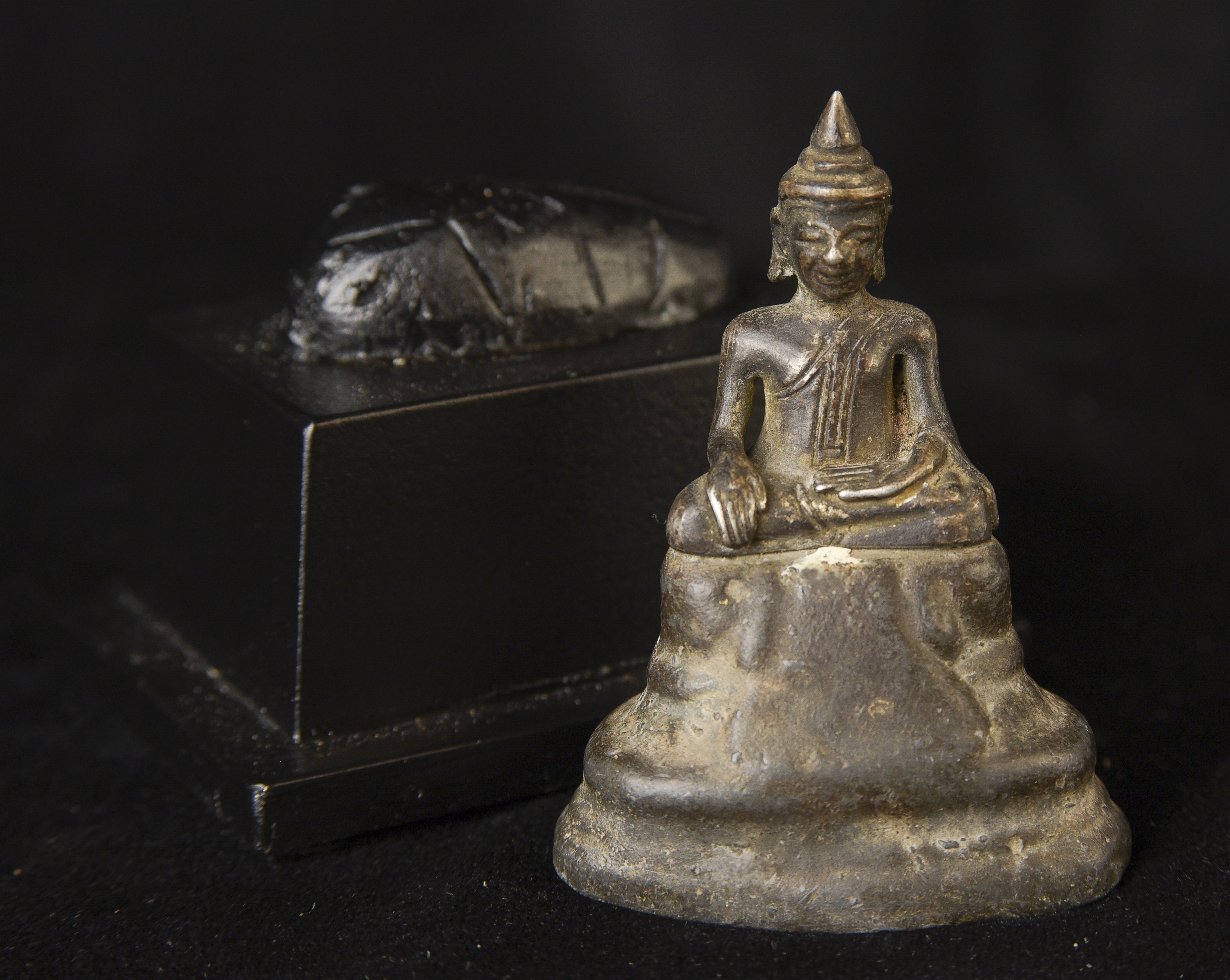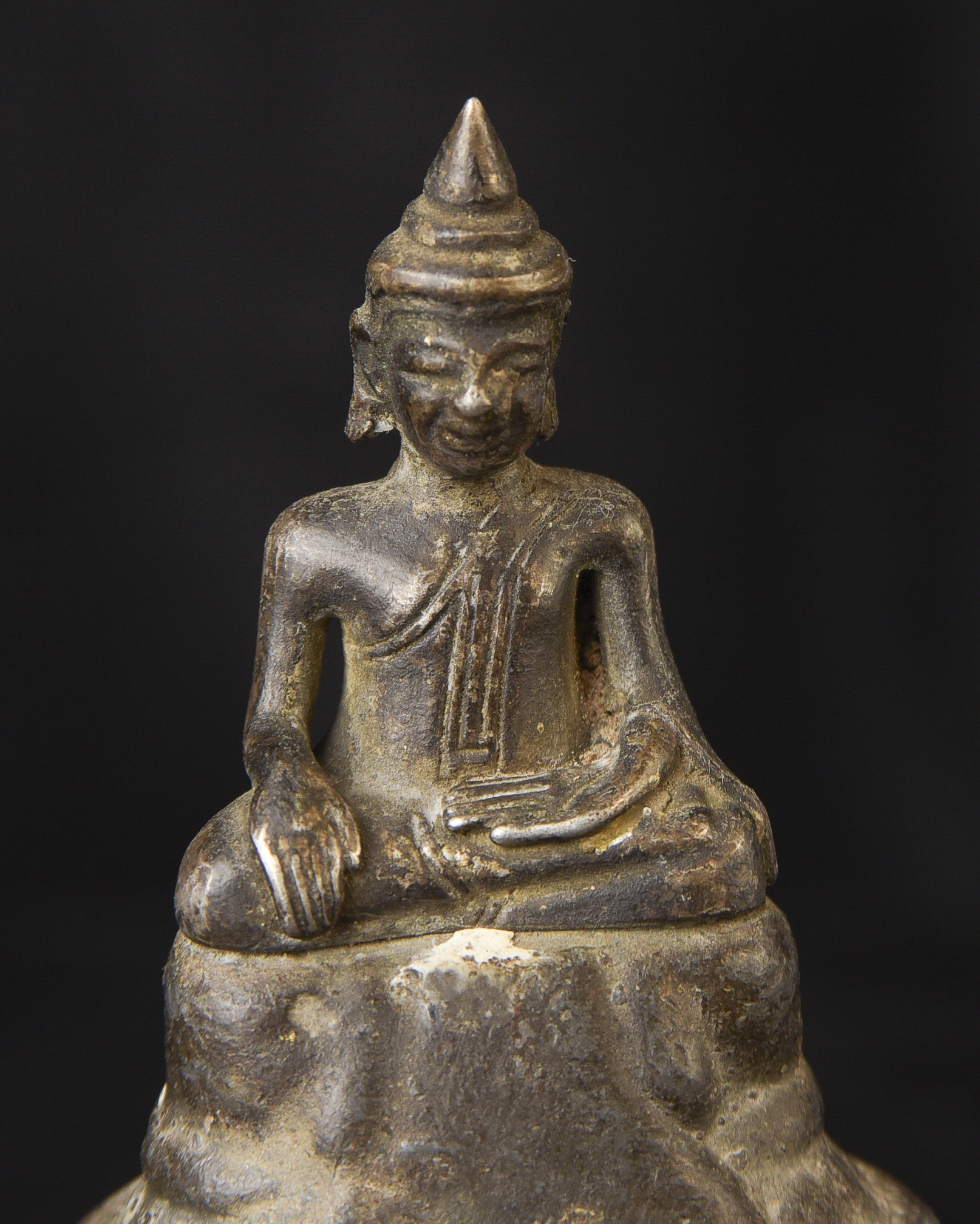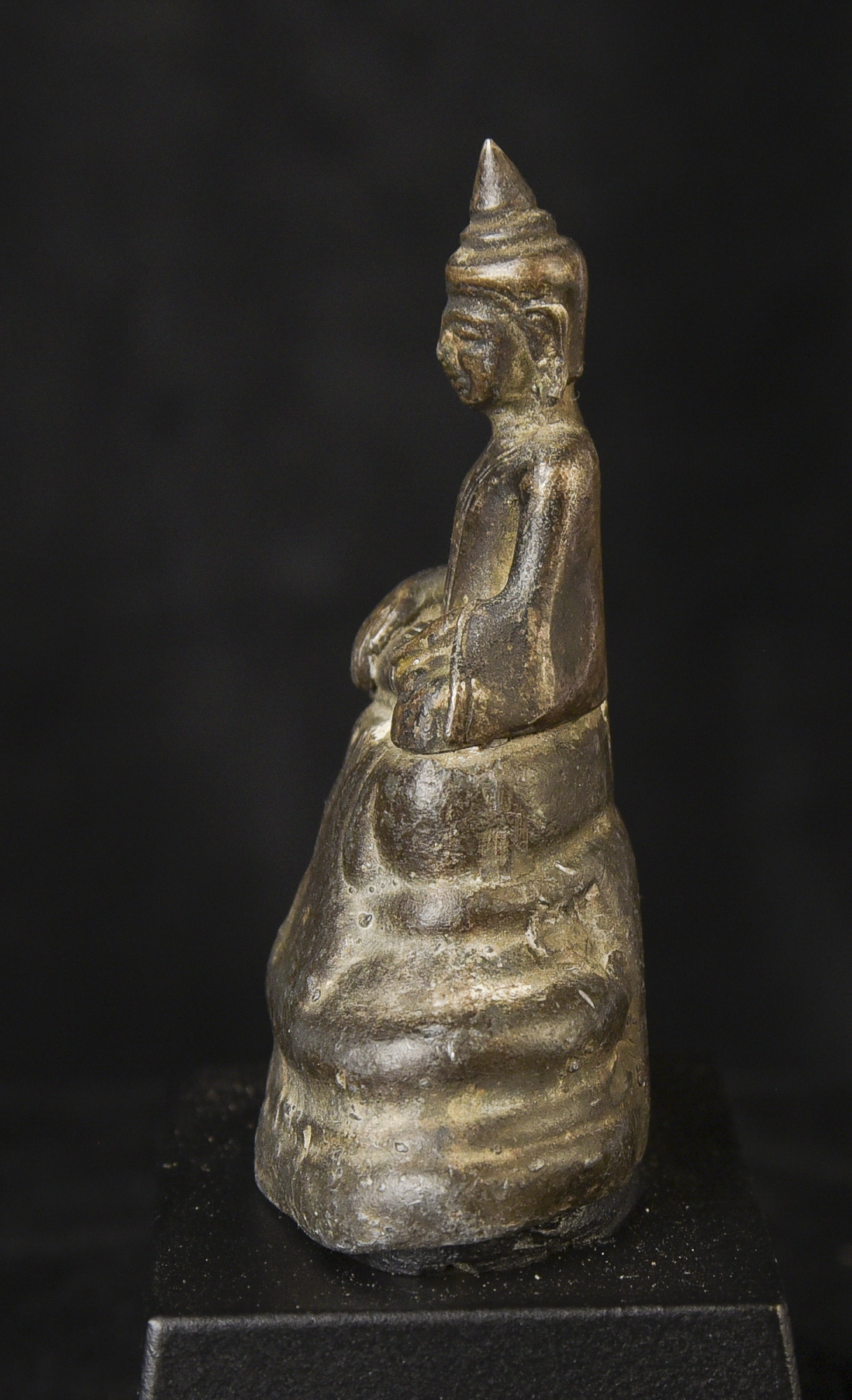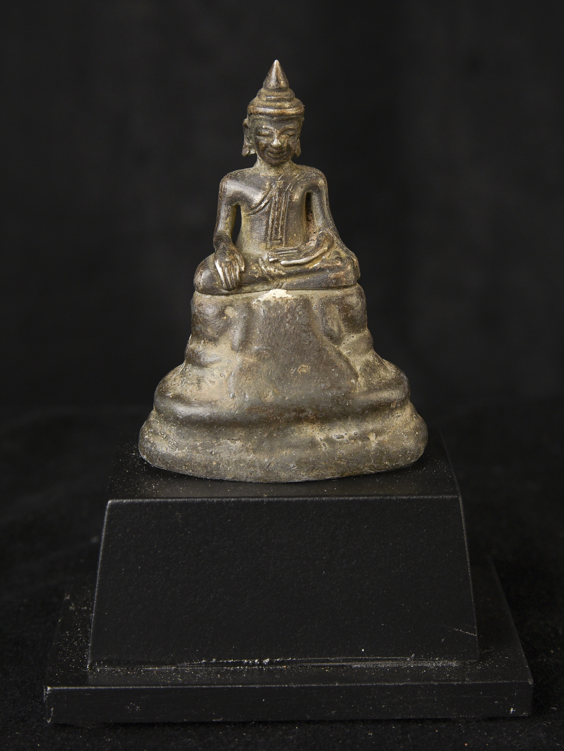 Solid silver 17/18thC Cambodian Silver Buddha on a lead alloy (?) base. Measures 2.5 inches tall x 1.75 inches wide x 1 inch deep not including the newly made custom museum-style base. An excellent example of its type--often the base is missing or the face is worn. Hard to find. Rare to find with an untouched patina. The starting price was reduced significantly.