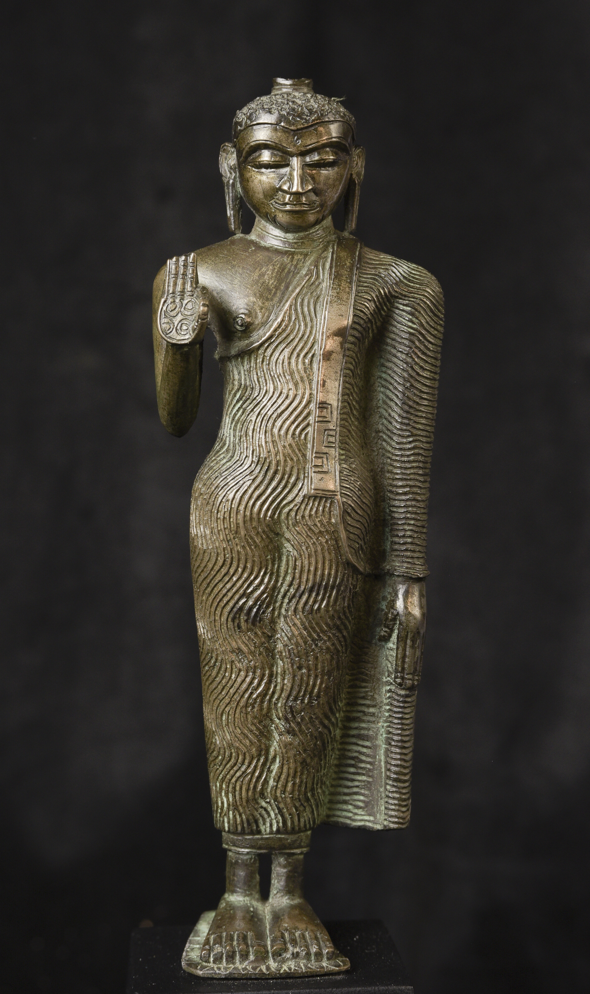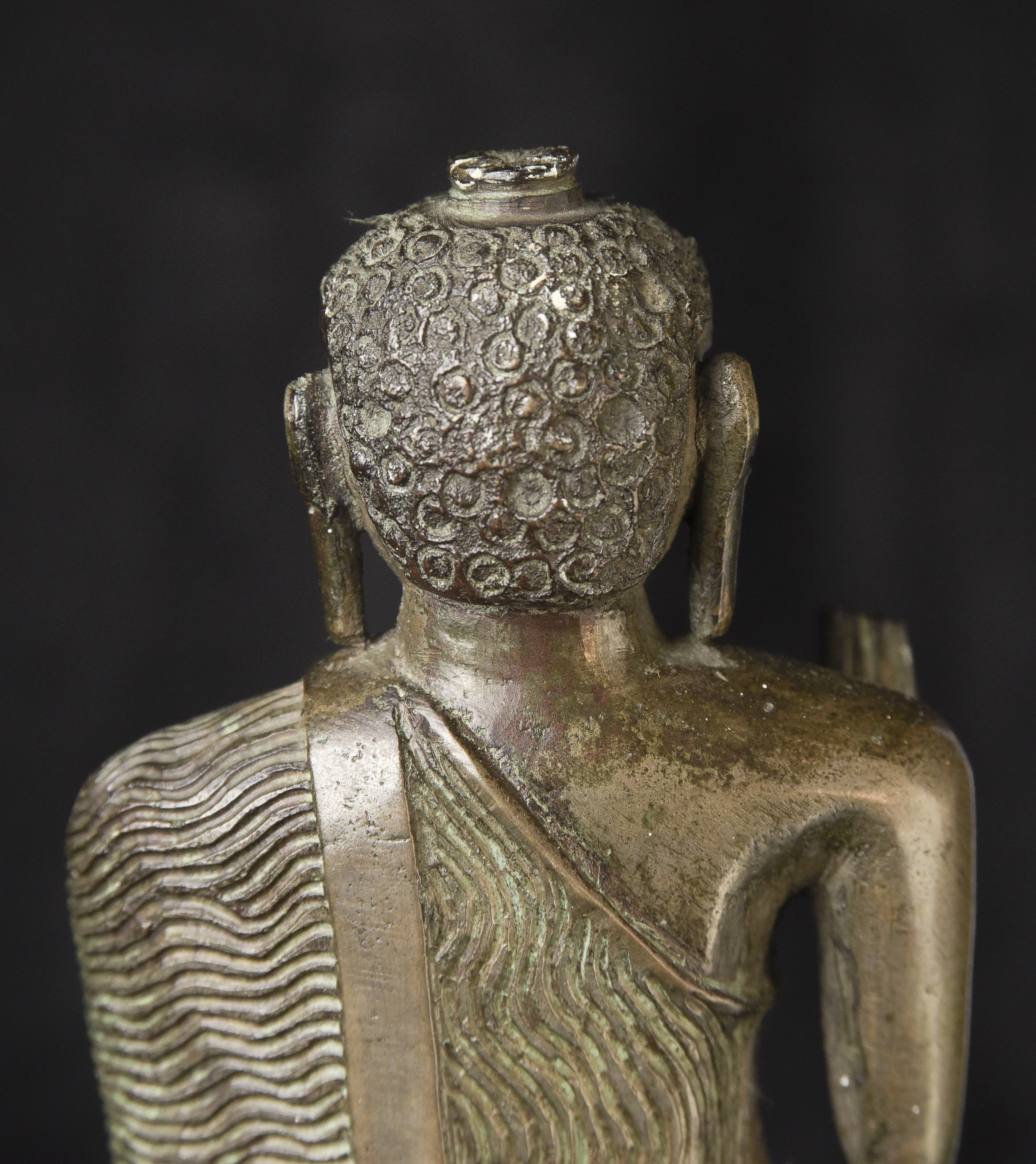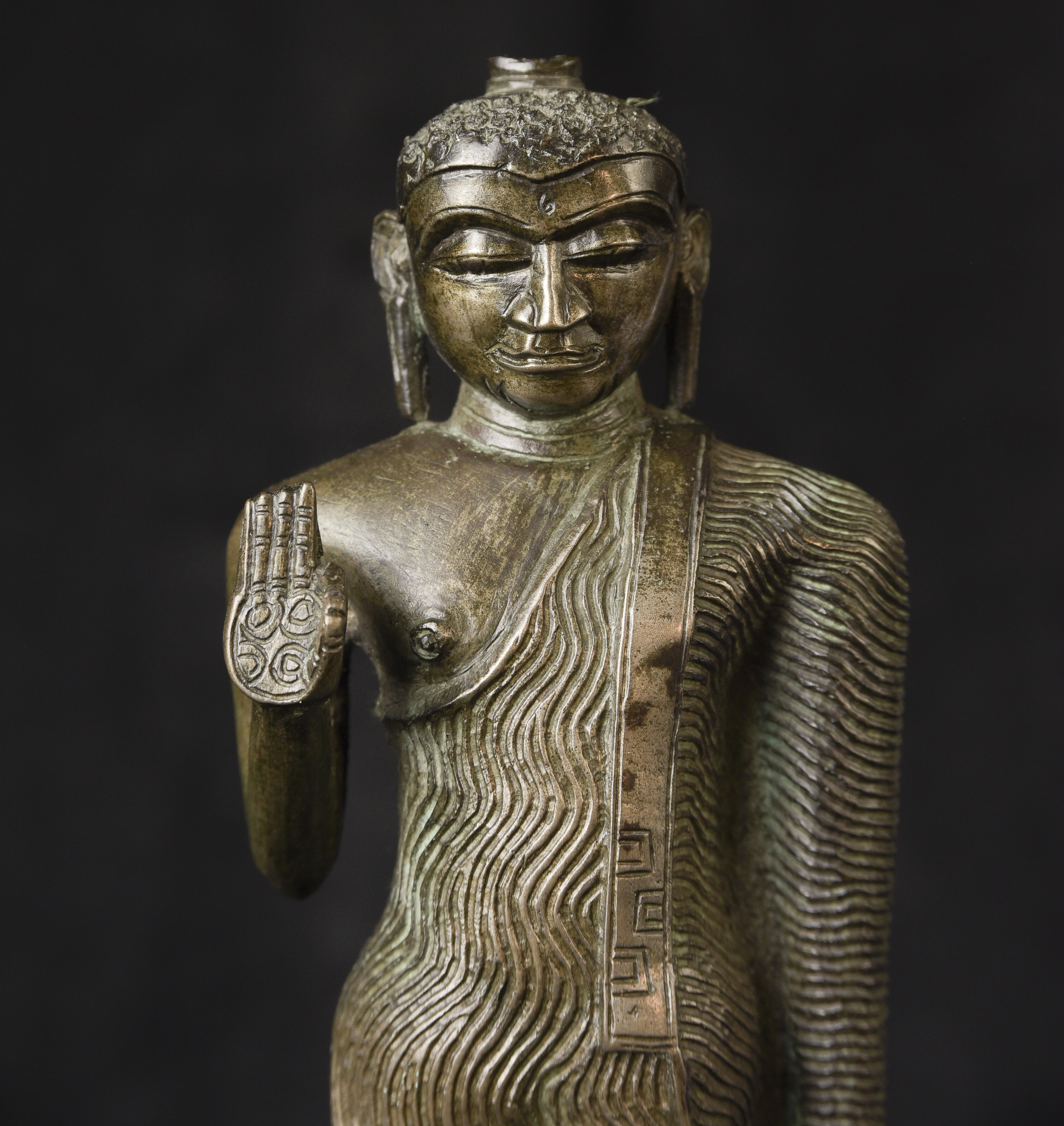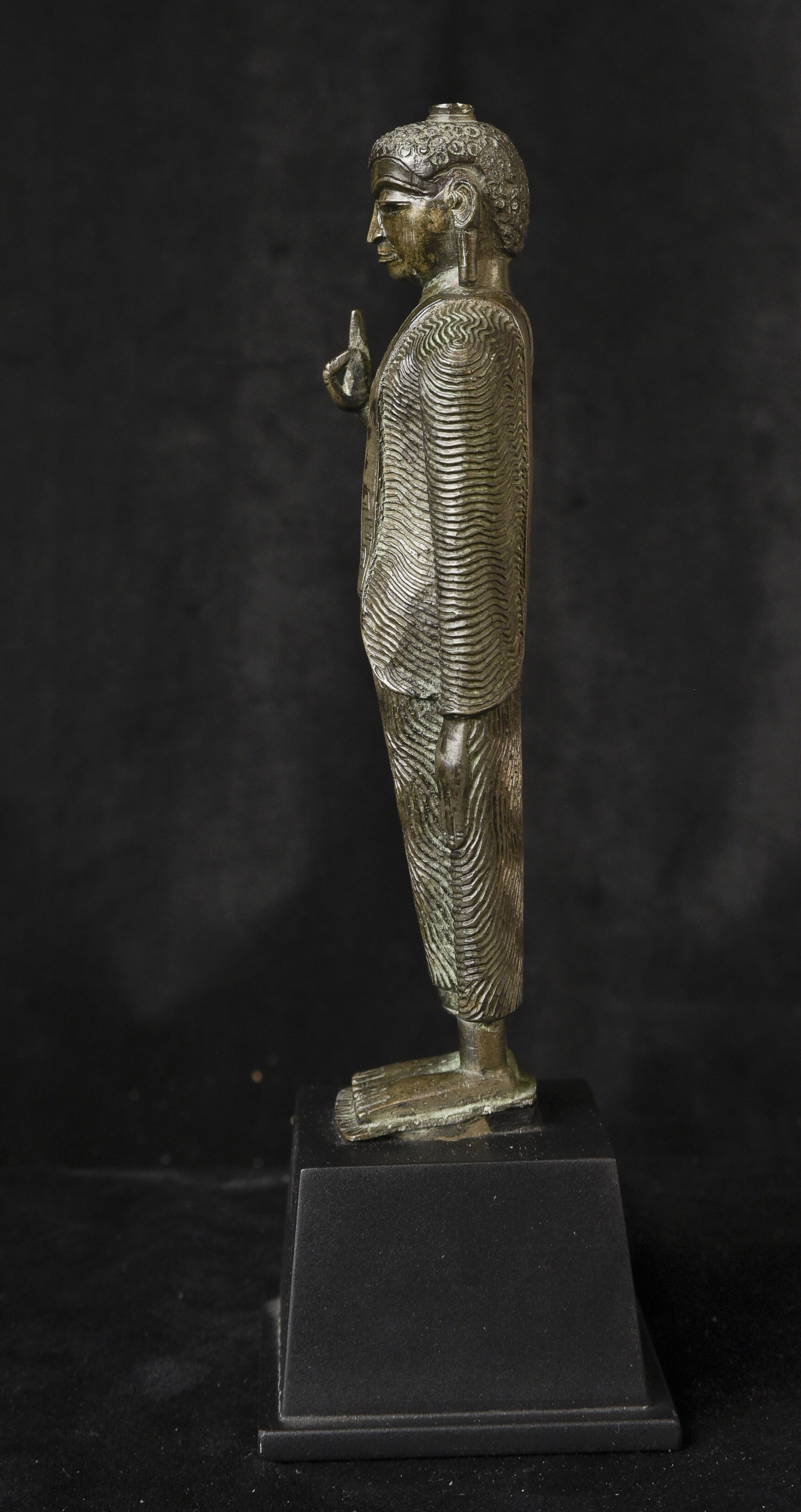 18thC Sri Lanka Solid-cast bronze Buddha. On its custom base. Lankan Buddhas are very hard to find this well modeled, cast, and finished. The Buddha fits into the base and can be jiggled to stand evenly, but could use a piece of cloth or something else wrapped around the part that goes into the base to make it snug and to stand evenly. Excellent shape, except the missing finial and original base. . The face is outstanding, look at the photos . (8"H x 2.5"W x 1.5"D ) - 3.16lbs. Base (3.25"W x 2"H ) - 1.06lbs
