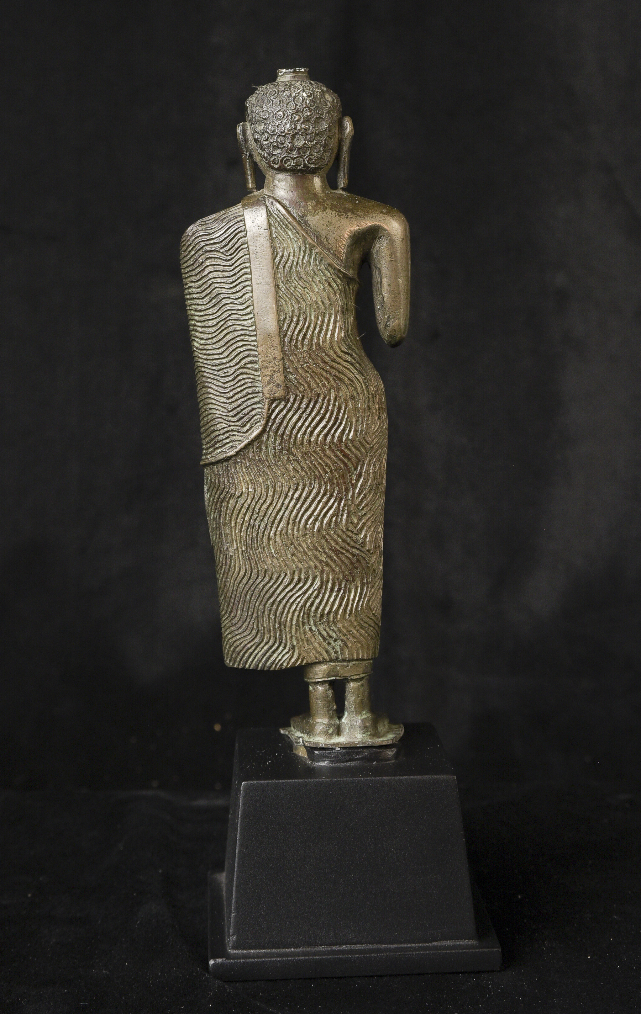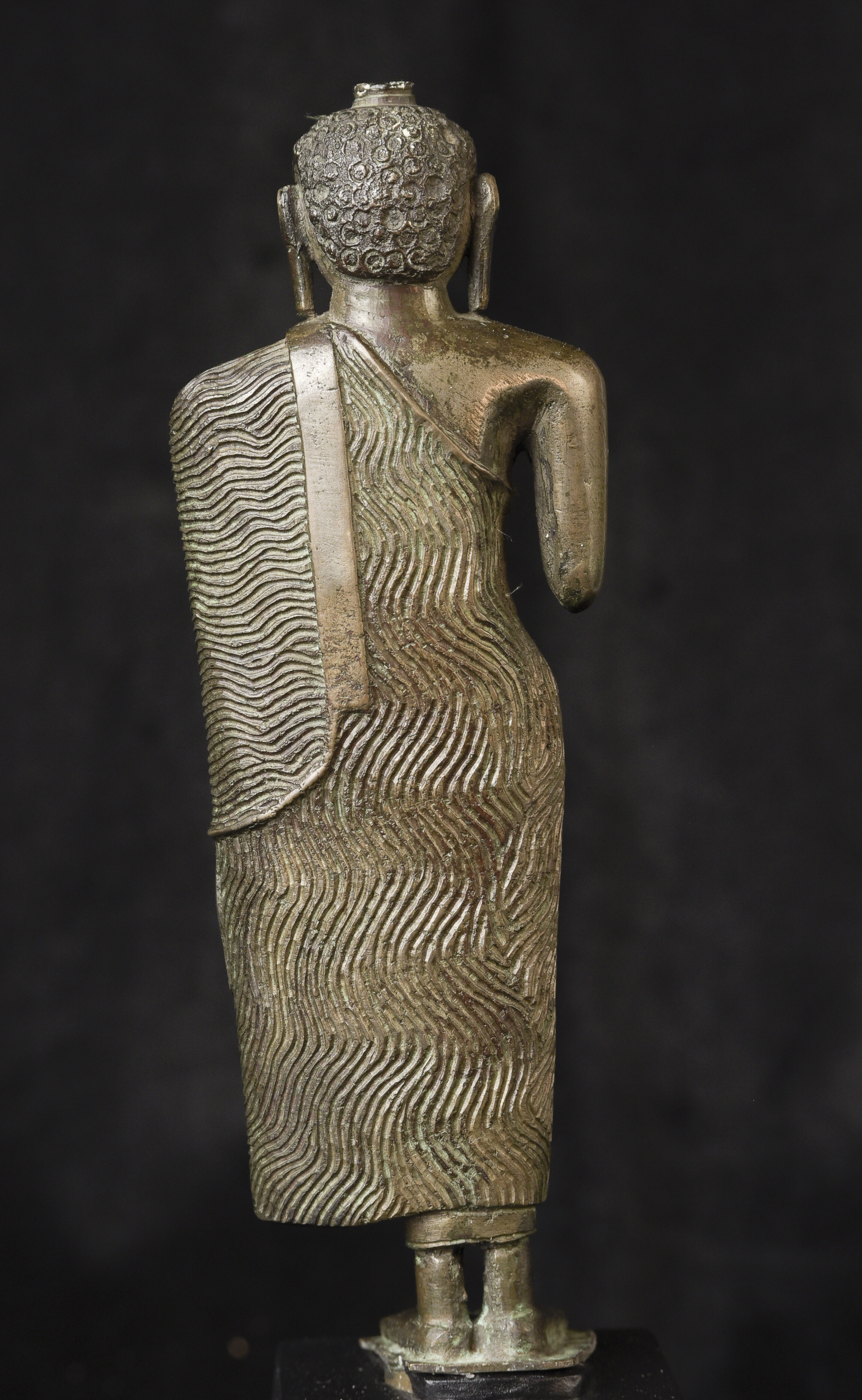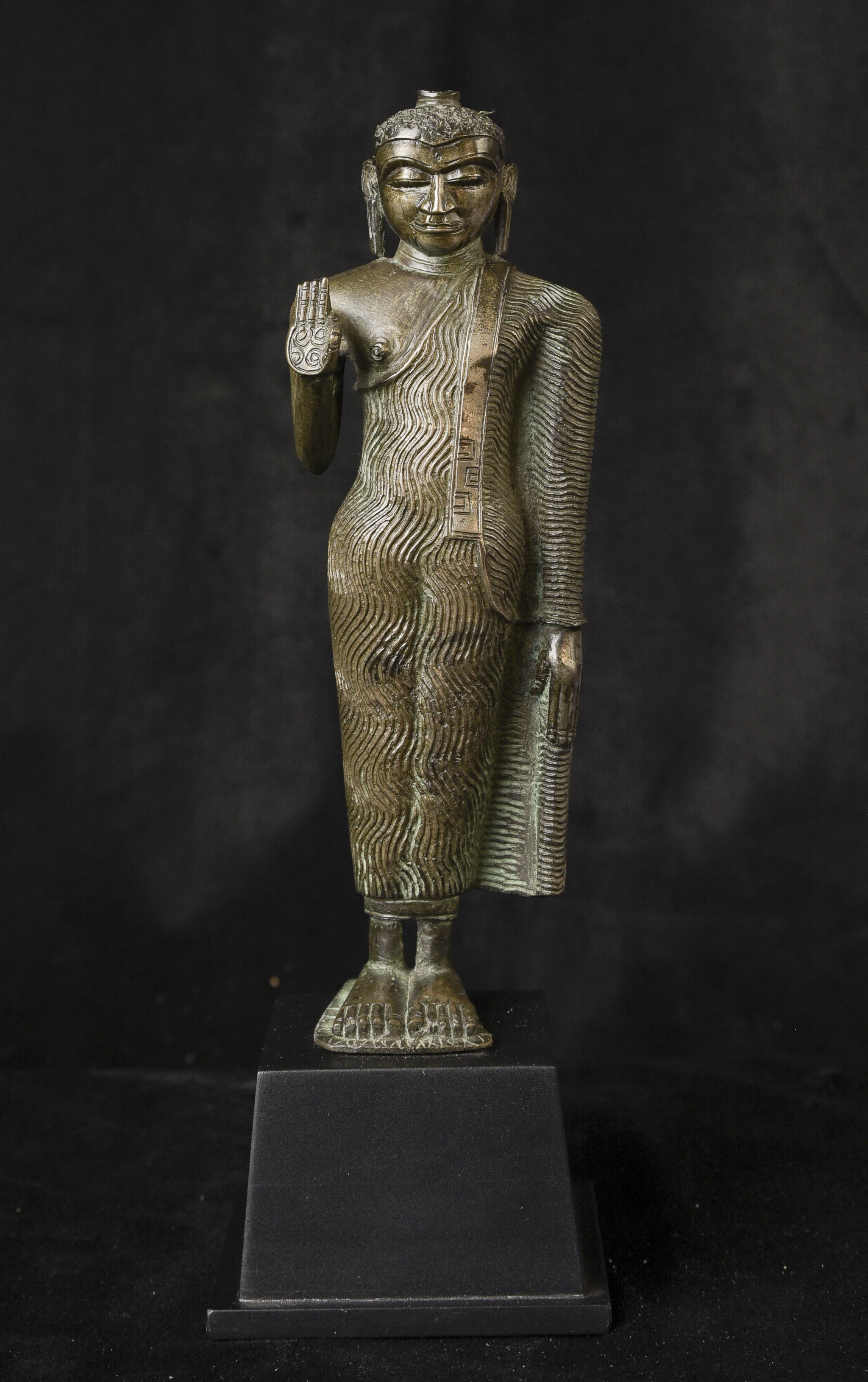 18thC Sri Lanka Solid-cast bronze Buddha. On its custom base. Lankan Buddhas are very hard to find this well modeled, cast, and finished. The Buddha fits into the base and can be jiggled to stand evenly, but could use a piece of cloth or something else wrapped around the part that goes into the base to make it snug and to stand evenly. Excellent shape, except the missing finial and original base. . The face is outstanding, look at the photos . (8"H x 2.5"W x 1.5"D ) - 3.16lbs. Base (3.25"W x 2"H ) - 1.06lbs